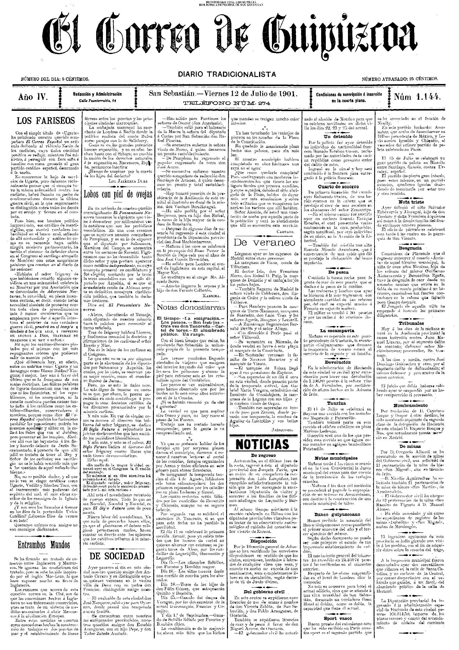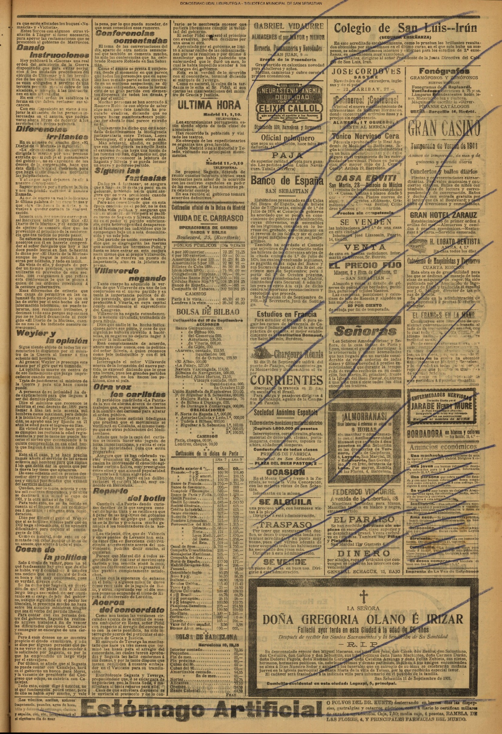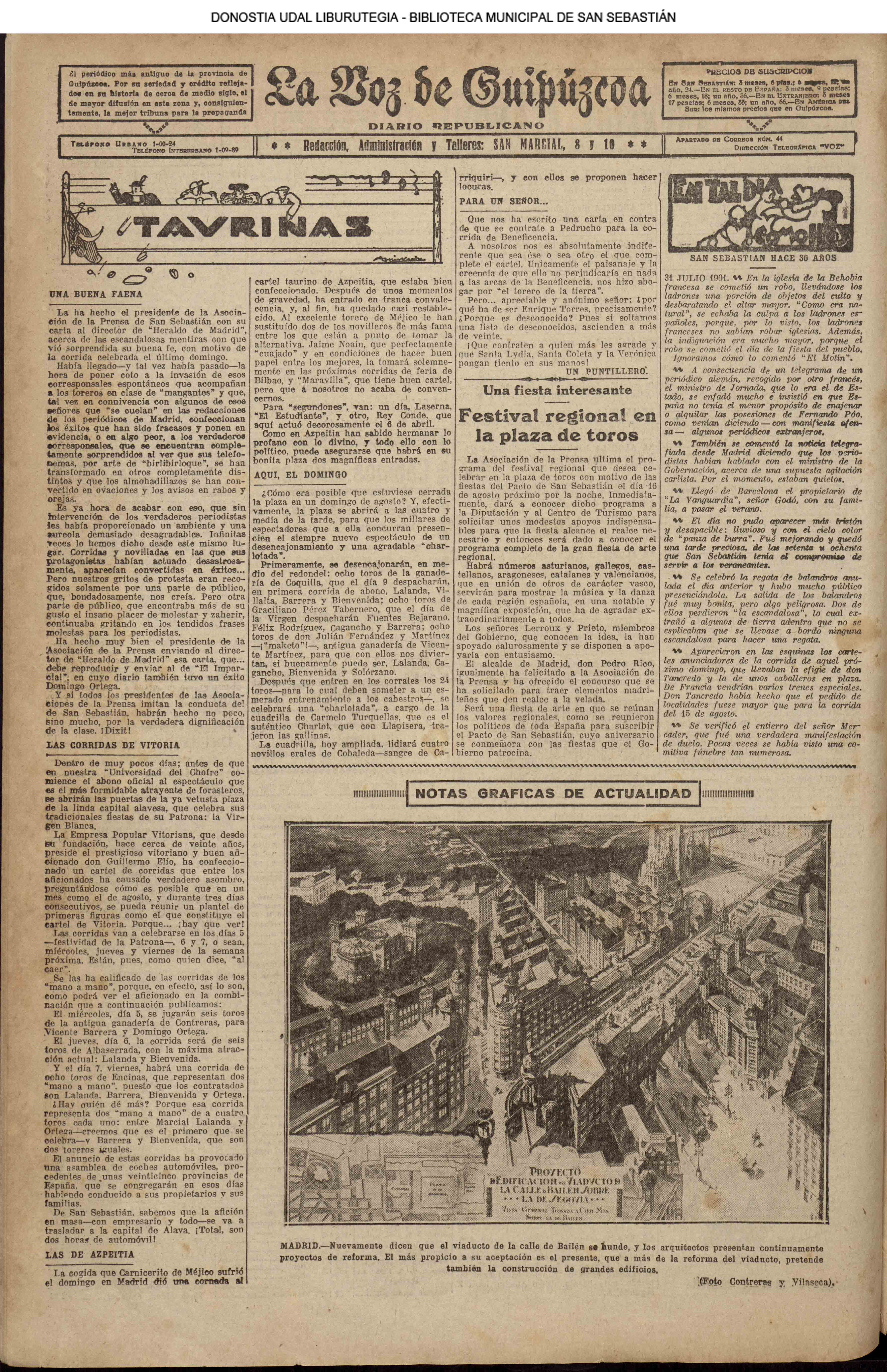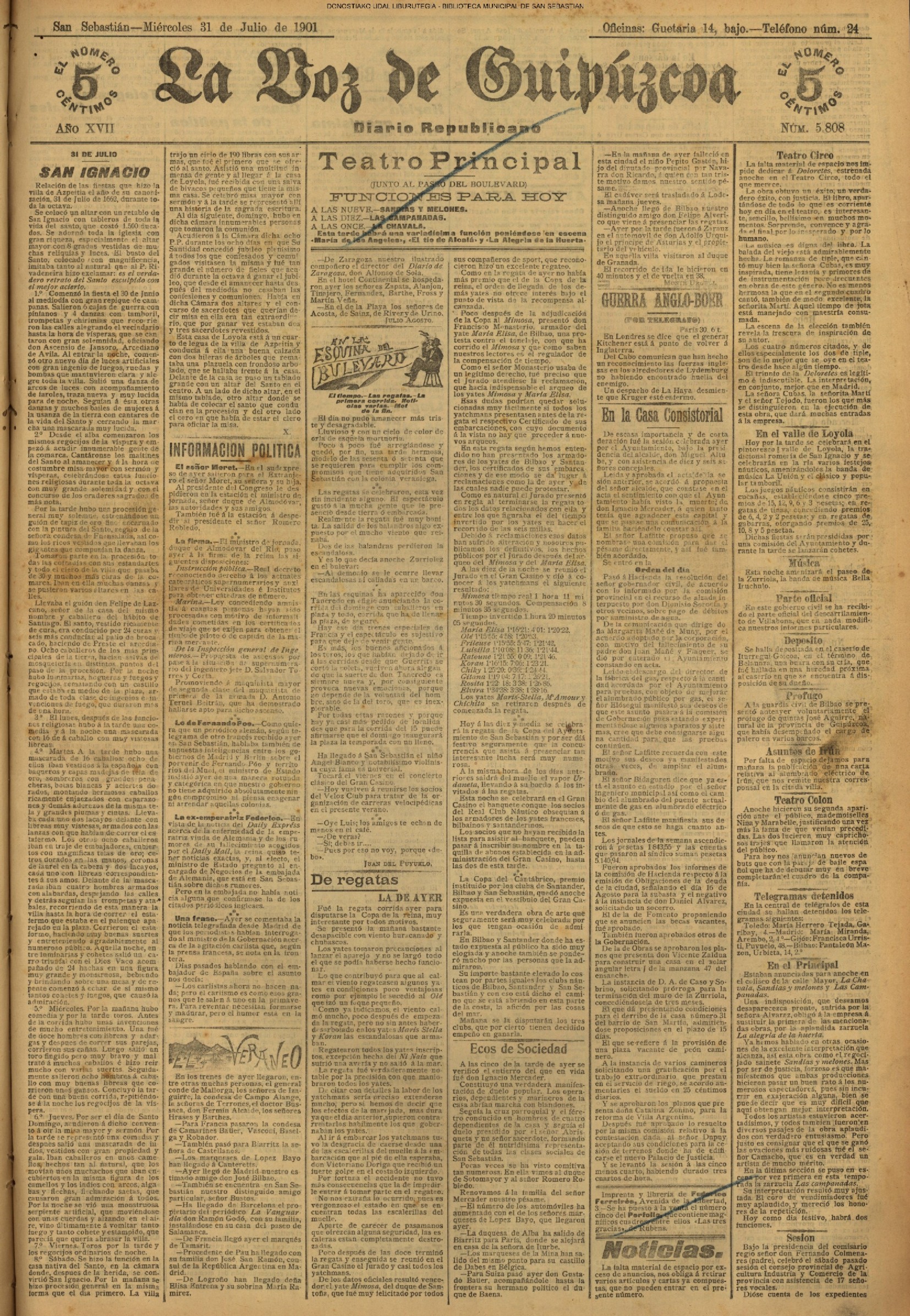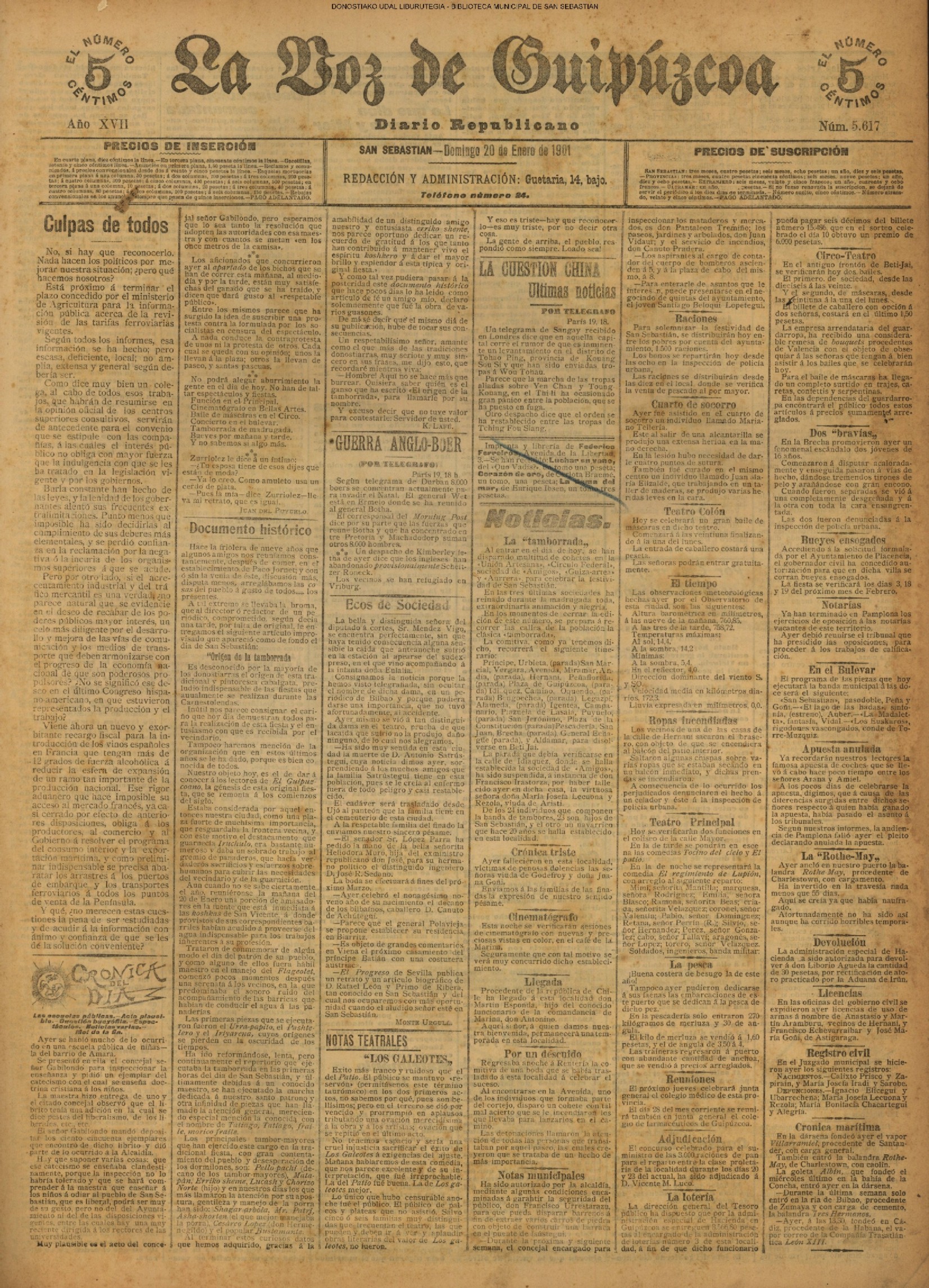 KOXKAS DONOSTIARRAS : "Curiosidades" El primer anuncio de la próxima llegada de las Navidades aparecía en los escaparates. Junto a otrsas golosinas, allí estaba en cajón o en barras el turrón, teniendo a su lado las olorosas aceitunas, las encendidas granadas, las peladillas bien envueltas en su capa de azúcar, los anises confitados, la garrapiñada, todo ese mundo de delicias. Al turrón le siguen el ejército de botellas y capones, de fiembres y pavos, de frutas sabrosísimas, de manjares incontables. Si en los días de Navidad sabe mejor el turrón, ¡qué deseado es siempre!¡Qué dulce es gustar siempre un cachito del azucarado postre!. La llegada del turrón era saludada en los periódicos de hace un siglo, que daban cuenta de que establecimiento había sido el primero en ponerlo en sus escaparates, como aviso urgente de que las Navidades estaban llegando. El cine llegó a nuestra ciudad hace un siglo. Entonces se llamaba Cinebiógrafo y las sesiones que daban eran cortas pero variadísimas. Vea el lector el programa que anunciaba el Cinebiógrafo Lumiére para el domingo 8 de diciembre de 1901. Primera sesión, a las 4 de la tarde : escenas cómicas. Magia moderna. Gabinete encantado. En la ratonera. El diablo en el convento. Regalo: rifa de una carabina Eureka. Segunda sesión, a las 5 de la tarde: Escenas marítimas. Seis retratos una peseta. Los apuros de don Cleto. Pirámides humanas. La luna, a un metro. Regalo: rifa de un servicio de porcelana para su muñeca. Tercera sesión, a las 6 de la tarde: Desfiles militares. Baile en el Olimpia. Entierro de la reina Victoria. Llegada de un tren. La Cenicienta. Regalo: rifa de un tren. Cuarta sesión, a las 7 de la tarde : Escenas infantiles. Danza de fuego. La portera burlada. Episodios del Fausto. Corrida de toros. Regalo: rifa de una preciosa muñeca. El cinebiógrafo de Bellas Artes, aquellos primeros días de diciembre de 1901, proyectaba Noel y anunciaba La caperuza roja, el popular cuento que todos los niños conocían, para los próximos días. Antes había proyectado la Cenicienta y Juana de Arco. Por aquellos días, en un par de escenarios hacían sus galas y su modo de retorcerse siete u ocho chiquillas "de esas que van de bellas". Con la cabeza coquetonamente cubierta por un sombrero, con la vistosa falta de colorines "previamente recogida como si estuviera pasando a pie un río, y el pañolón de Manila rodeado al cuerpo", comienza la suerte del tirabuzón, o sea, la del sacacorchos. Aquellas chicas se retuercen, hacen cosas raras con los pies, con las manos, con todo el cuerpo, volviendo locos a los espectadores. |
