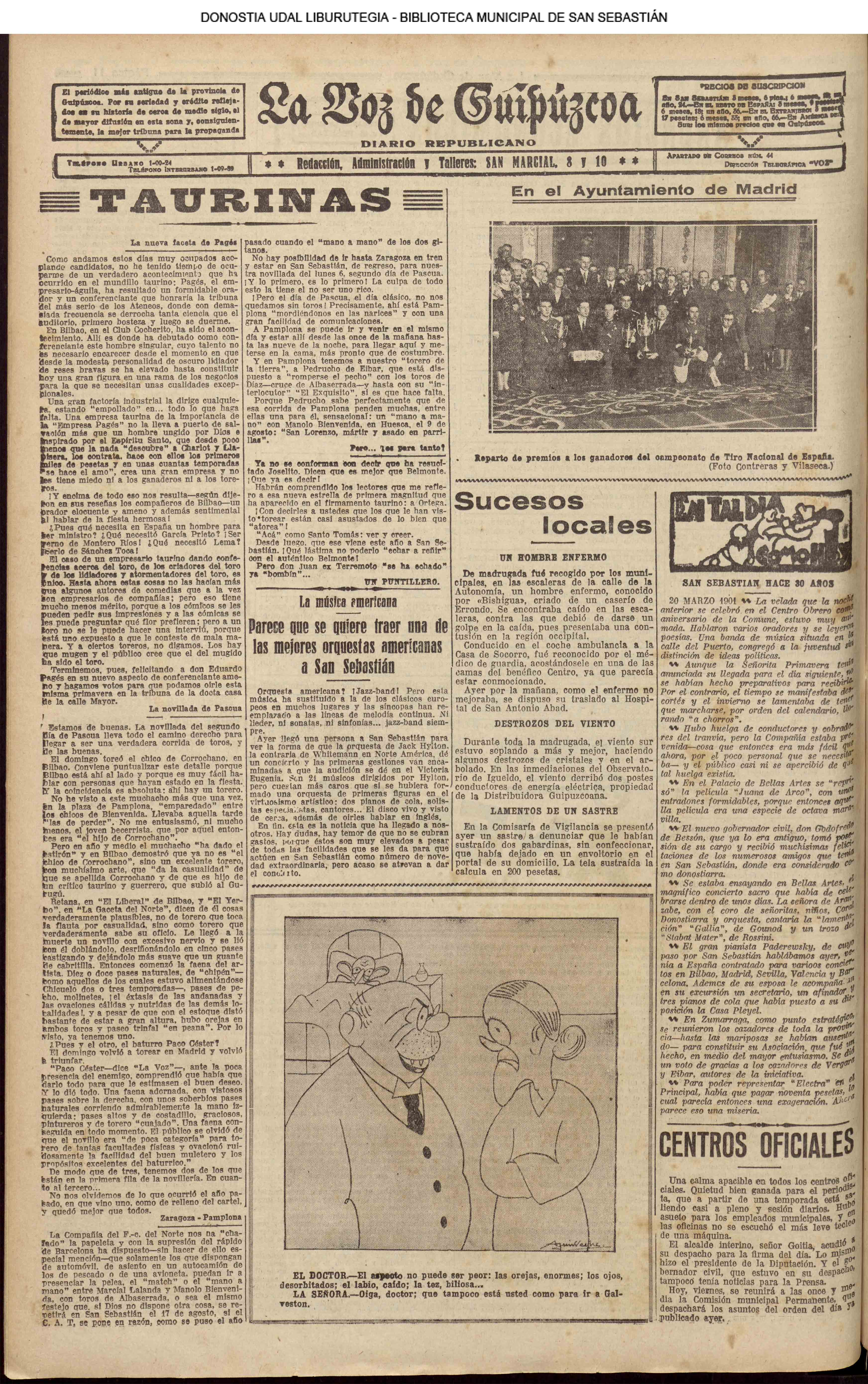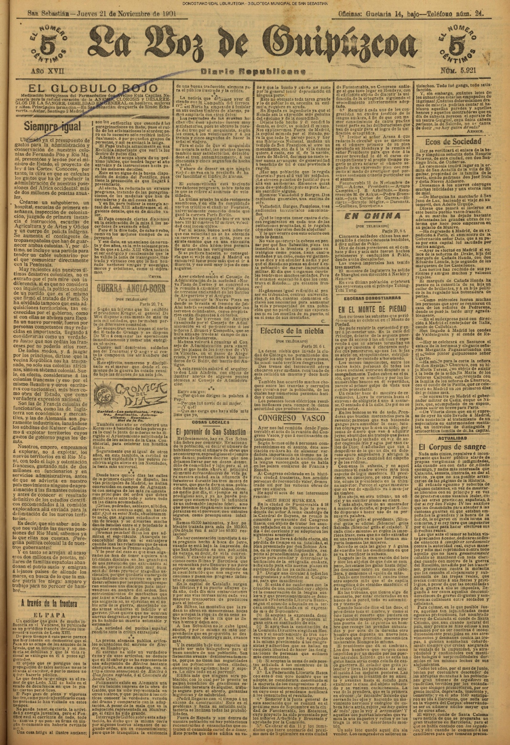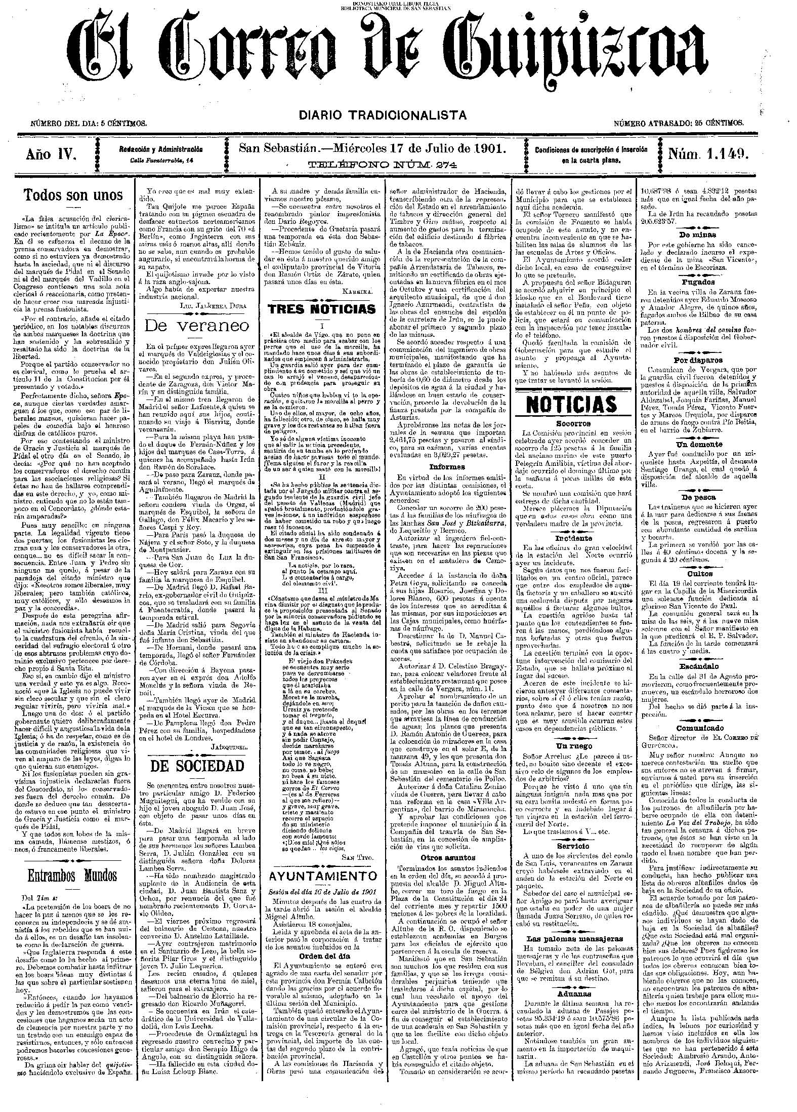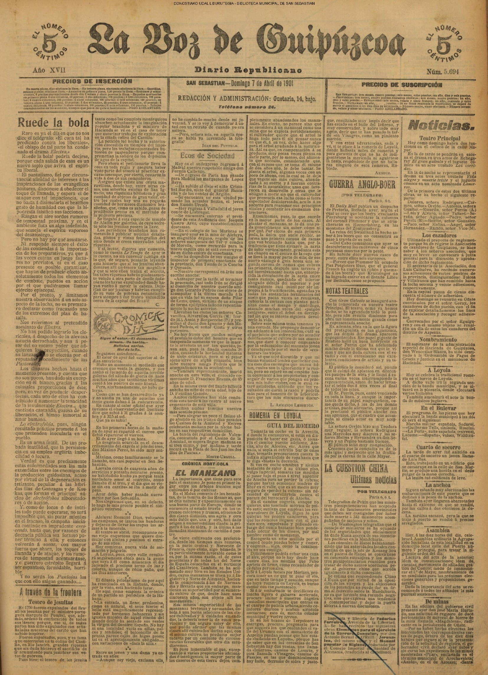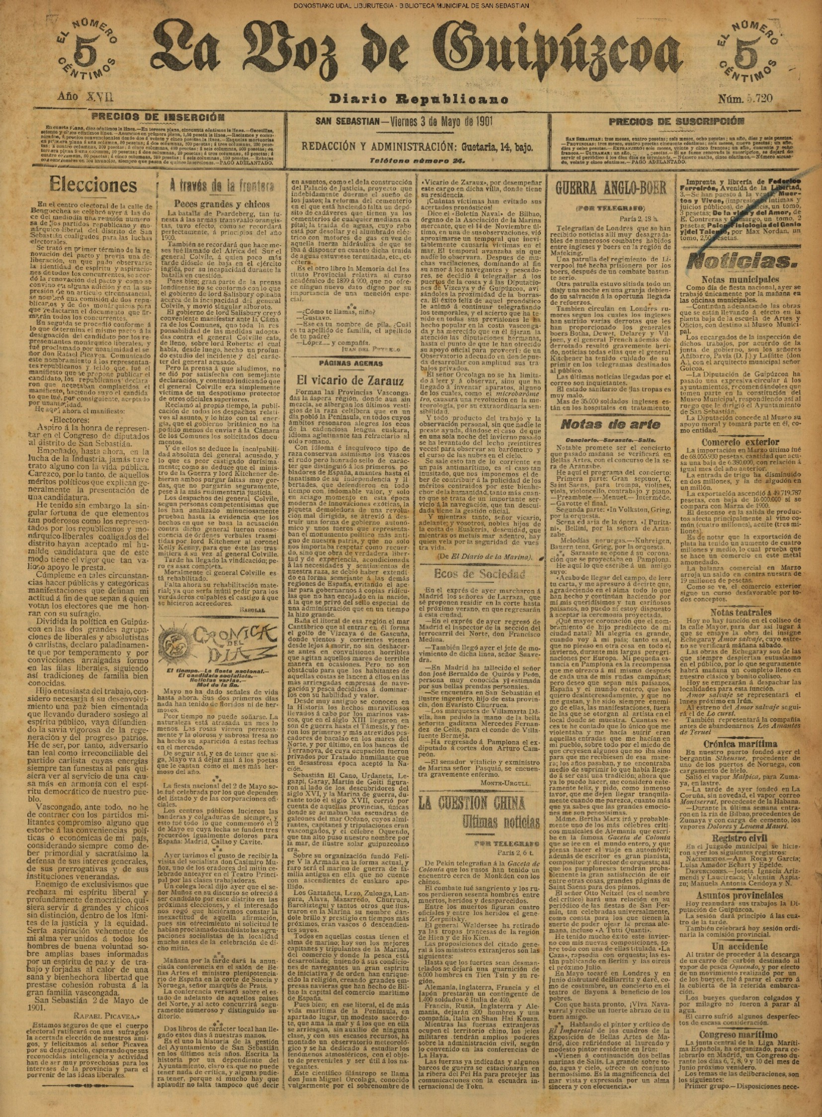 KOXKAS DONOSTIARRAS : "Curiosidades" El primer anuncio de la próxima llegada de las Navidades aparecía en los escaparates. Junto a otrsas golosinas, allí estaba en cajón o en barras el turrón, teniendo a su lado las olorosas aceitunas, las encendidas granadas, las peladillas bien envueltas en su capa de azúcar, los anises confitados, la garrapiñada, todo ese mundo de delicias. Al turrón le siguen el ejército de botellas y capones, de fiembres y pavos, de frutas sabrosísimas, de manjares incontables. Si en los días de Navidad sabe mejor el turrón, ¡qué deseado es siempre!¡Qué dulce es gustar siempre un cachito del azucarado postre!. La llegada del turrón era saludada en los periódicos de hace un siglo, que daban cuenta de que establecimiento había sido el primero en ponerlo en sus escaparates, como aviso urgente de que las Navidades estaban llegando. El cine llegó a nuestra ciudad hace un siglo. Entonces se llamaba Cinebiógrafo y las sesiones que daban eran cortas pero variadísimas. Vea el lector el programa que anunciaba el Cinebiógrafo Lumiére para el domingo 8 de diciembre de 1901. Primera sesión, a las 4 de la tarde : escenas cómicas. Magia moderna. Gabinete encantado. En la ratonera. El diablo en el convento. Regalo: rifa de una carabina Eureka. Segunda sesión, a las 5 de la tarde: Escenas marítimas. Seis retratos una peseta. Los apuros de don Cleto. Pirámides humanas. La luna, a un metro. Regalo: rifa de un servicio de porcelana para su muñeca. Tercera sesión, a las 6 de la tarde: Desfiles militares. Baile en el Olimpia. Entierro de la reina Victoria. Llegada de un tren. La Cenicienta. Regalo: rifa de un tren. Cuarta sesión, a las 7 de la tarde : Escenas infantiles. Danza de fuego. La portera burlada. Episodios del Fausto. Corrida de toros. Regalo: rifa de una preciosa muñeca. El cinebiógrafo de Bellas Artes, aquellos primeros días de diciembre de 1901, proyectaba Noel y anunciaba La caperuza roja, el popular cuento que todos los niños conocían, para los próximos días. Antes había proyectado la Cenicienta y Juana de Arco. Por aquellos días, en un par de escenarios hacían sus galas y su modo de retorcerse siete u ocho chiquillas "de esas que van de bellas". Con la cabeza coquetonamente cubierta por un sombrero, con la vistosa falta de colorines "previamente recogida como si estuviera pasando a pie un río, y el pañolón de Manila rodeado al cuerpo", comienza la suerte del tirabuzón, o sea, la del sacacorchos. Aquellas chicas se retuercen, hacen cosas raras con los pies, con las manos, con todo el cuerpo, volviendo locos a los espectadores. |