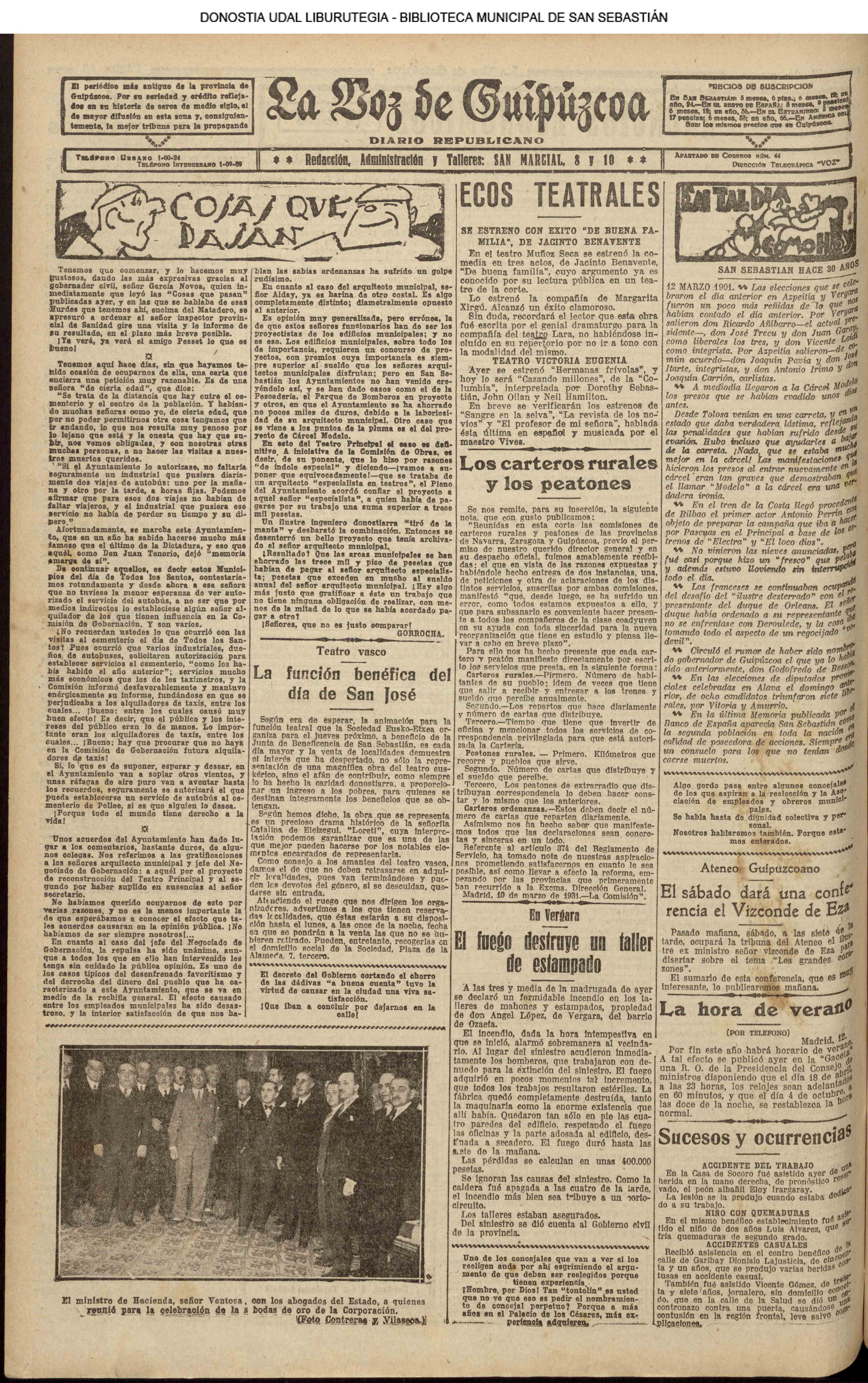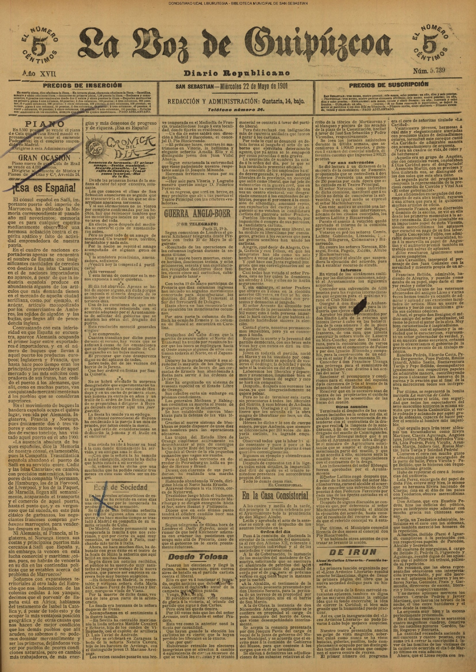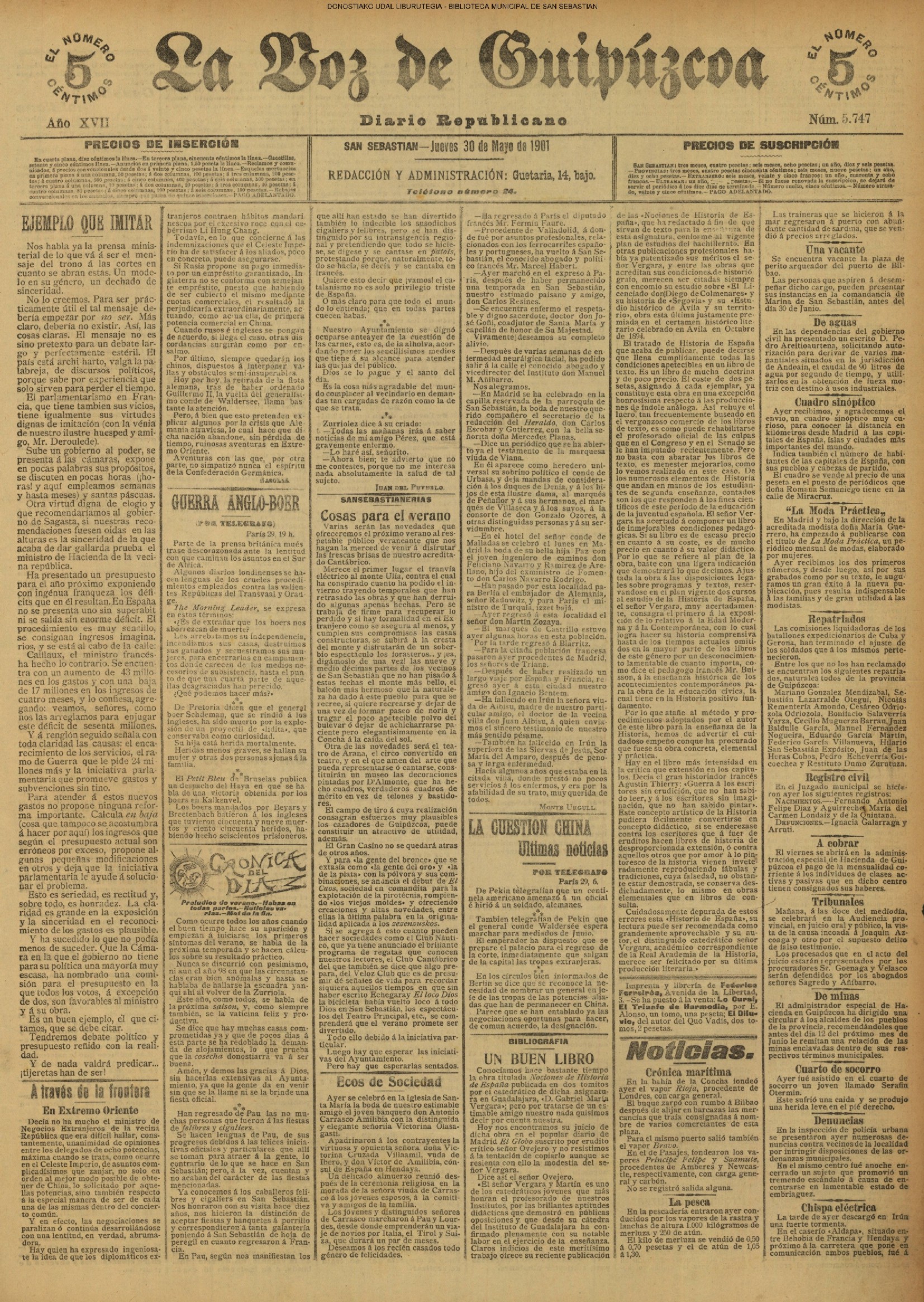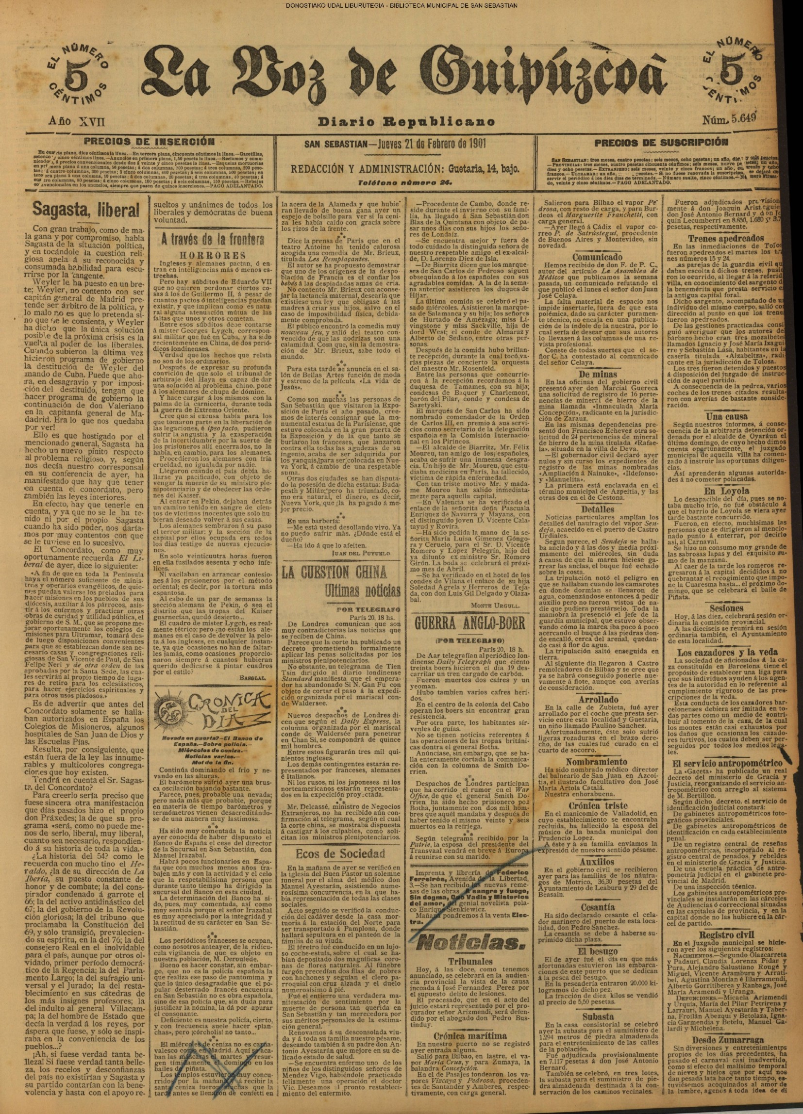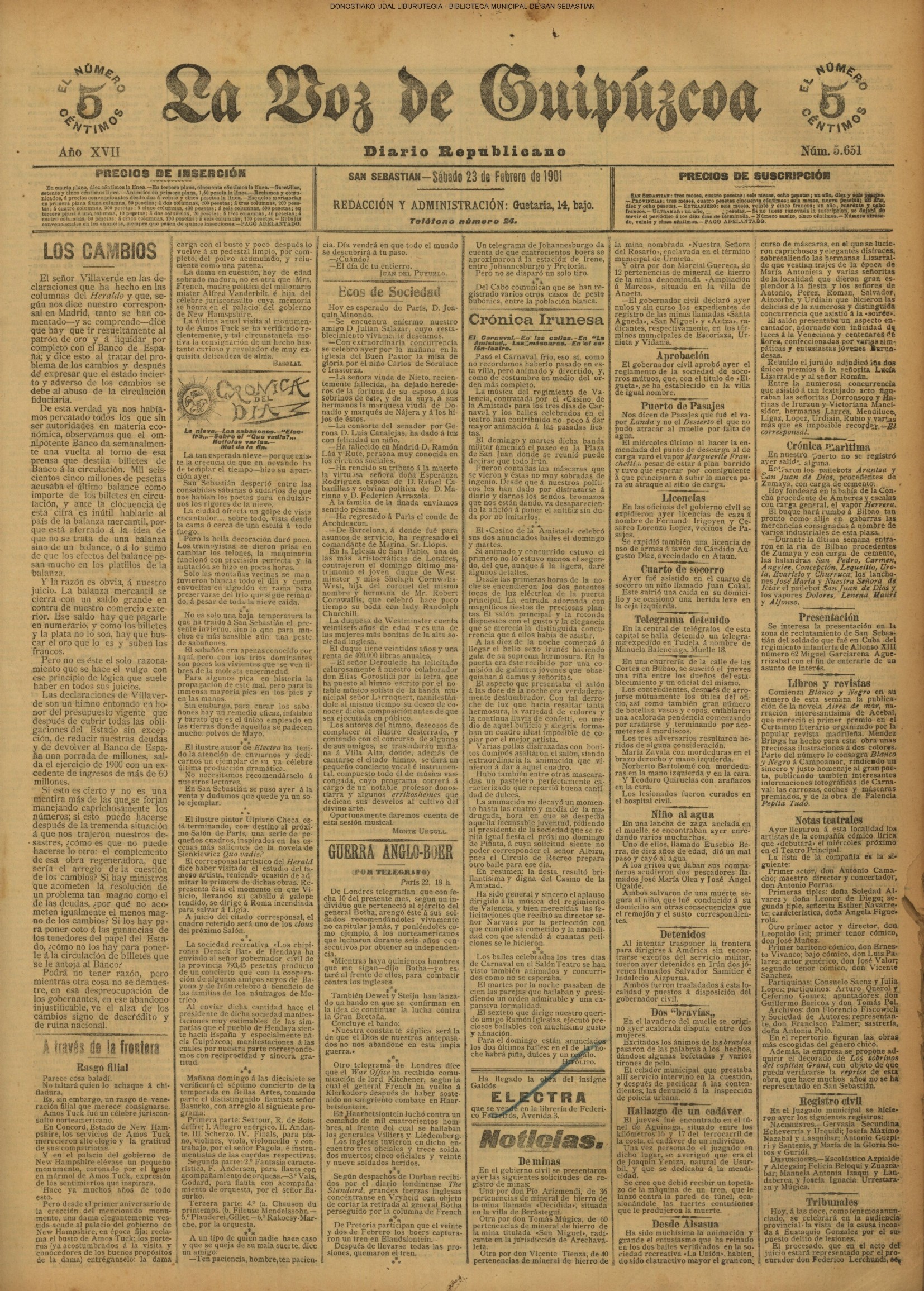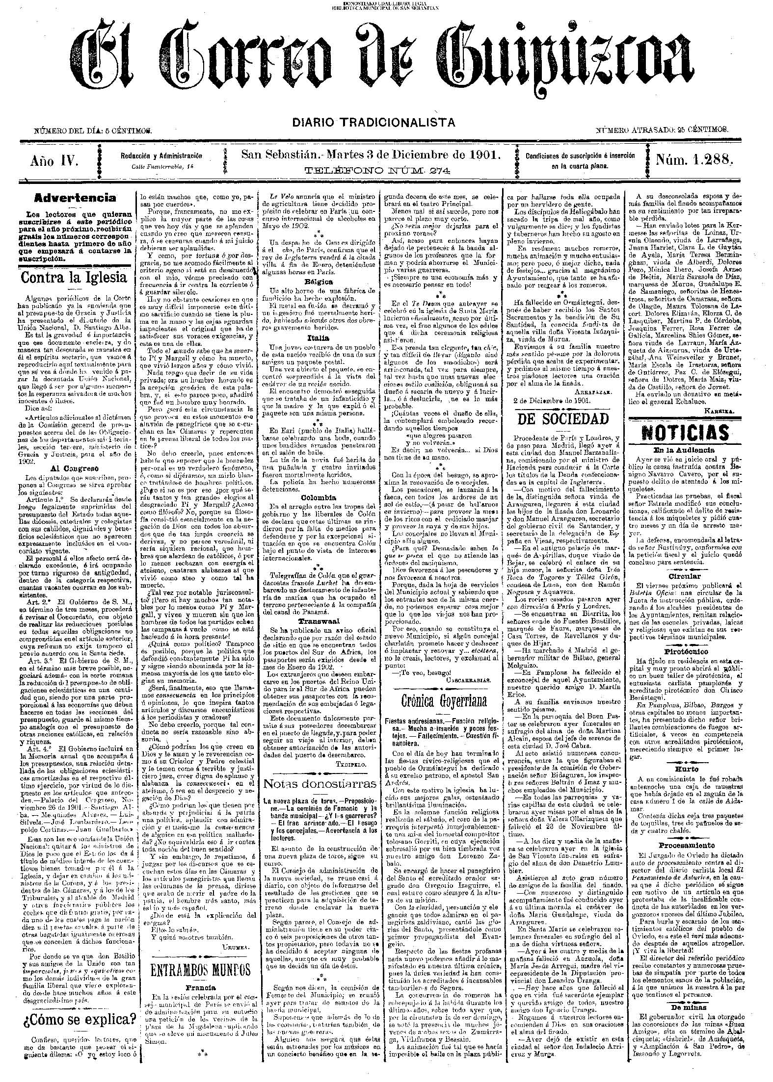 KOXKAS DONOSTIARRAS : "Curiosidades" El primer anuncio de la próxima llegada de las Navidades aparecía en los escaparates. Junto a otrsas golosinas, allí estaba en cajón o en barras el turrón, teniendo a su lado las olorosas aceitunas, las encendidas granadas, las peladillas bien envueltas en su capa de azúcar, los anises confitados, la garrapiñada, todo ese mundo de delicias. Al turrón le siguen el ejército de botellas y capones, de fiembres y pavos, de frutas sabrosísimas, de manjares incontables. Si en los días de Navidad sabe mejor el turrón, ¡qué deseado es siempre!¡Qué dulce es gustar siempre un cachito del azucarado postre!. La llegada del turrón era saludada en los periódicos de hace un siglo, que daban cuenta de que establecimiento había sido el primero en ponerlo en sus escaparates, como aviso urgente de que las Navidades estaban llegando. El cine llegó a nuestra ciudad hace un siglo. Entonces se llamaba Cinebiógrafo y las sesiones que daban eran cortas pero variadísimas. Vea el lector el programa que anunciaba el Cinebiógrafo Lumiére para el domingo 8 de diciembre de 1901. Primera sesión, a las 4 de la tarde : escenas cómicas. Magia moderna. Gabinete encantado. En la ratonera. El diablo en el convento. Regalo: rifa de una carabina Eureka. Segunda sesión, a las 5 de la tarde: Escenas marítimas. Seis retratos una peseta. Los apuros de don Cleto. Pirámides humanas. La luna, a un metro. Regalo: rifa de un servicio de porcelana para su muñeca. Tercera sesión, a las 6 de la tarde: Desfiles militares. Baile en el Olimpia. Entierro de la reina Victoria. Llegada de un tren. La Cenicienta. Regalo: rifa de un tren. Cuarta sesión, a las 7 de la tarde : Escenas infantiles. Danza de fuego. La portera burlada. Episodios del Fausto. Corrida de toros. Regalo: rifa de una preciosa muñeca. El cinebiógrafo de Bellas Artes, aquellos primeros días de diciembre de 1901, proyectaba Noel y anunciaba La caperuza roja, el popular cuento que todos los niños conocían, para los próximos días. Antes había proyectado la Cenicienta y Juana de Arco. Por aquellos días, en un par de escenarios hacían sus galas y su modo de retorcerse siete u ocho chiquillas "de esas que van de bellas". Con la cabeza coquetonamente cubierta por un sombrero, con la vistosa falta de colorines "previamente recogida como si estuviera pasando a pie un río, y el pañolón de Manila rodeado al cuerpo", comienza la suerte del tirabuzón, o sea, la del sacacorchos. Aquellas chicas se retuercen, hacen cosas raras con los pies, con las manos, con todo el cuerpo, volviendo locos a los espectadores. |