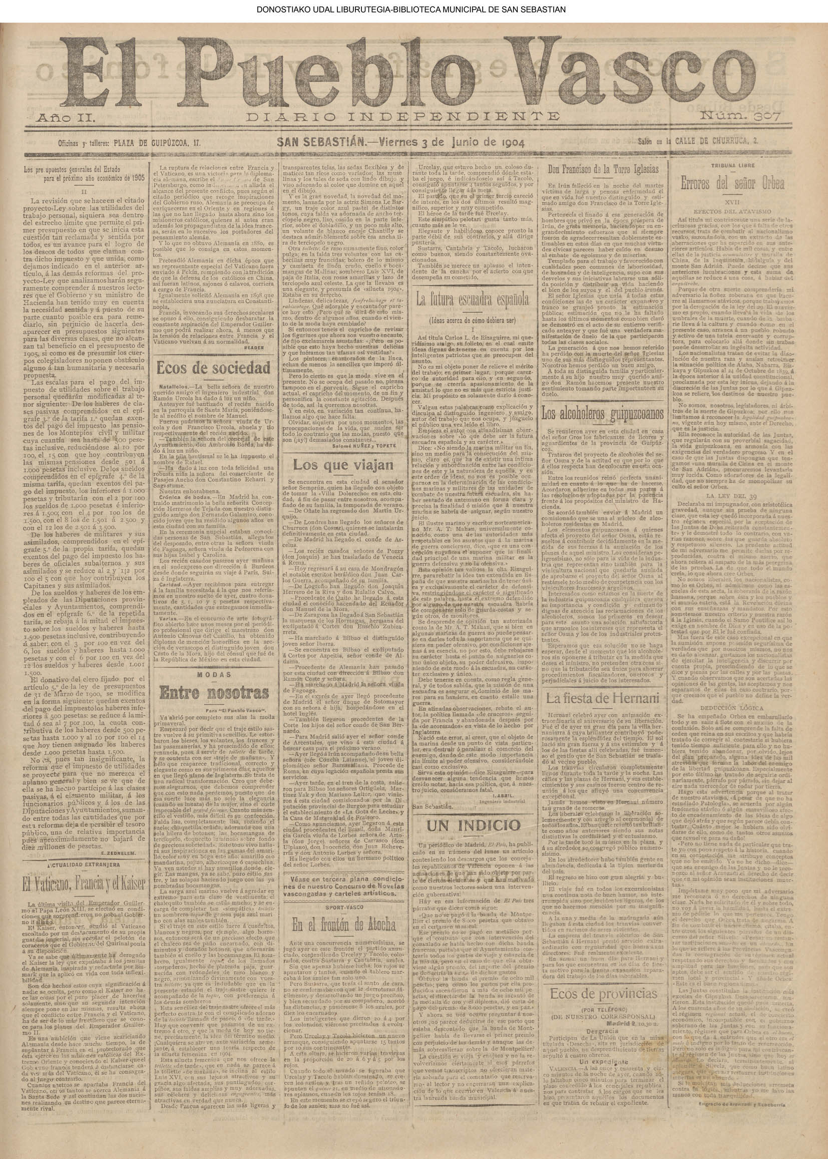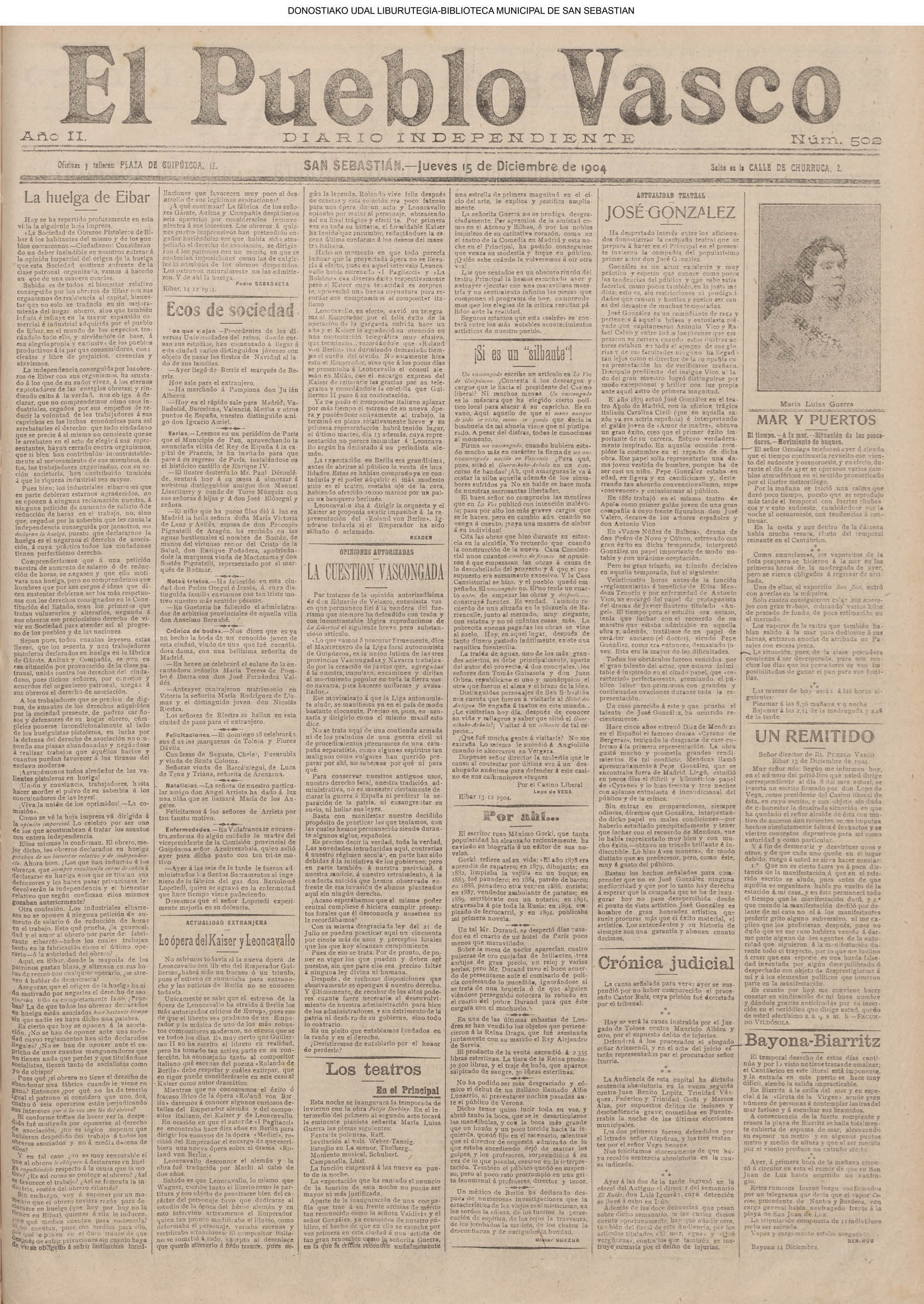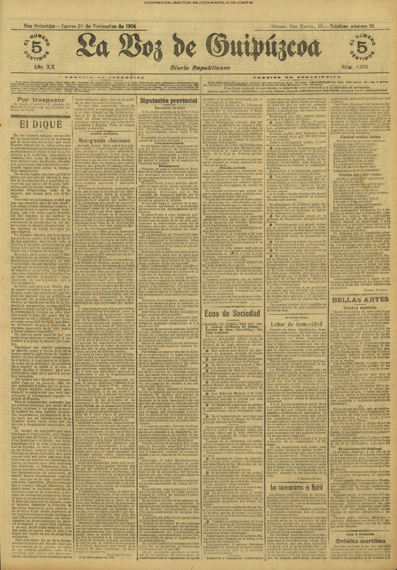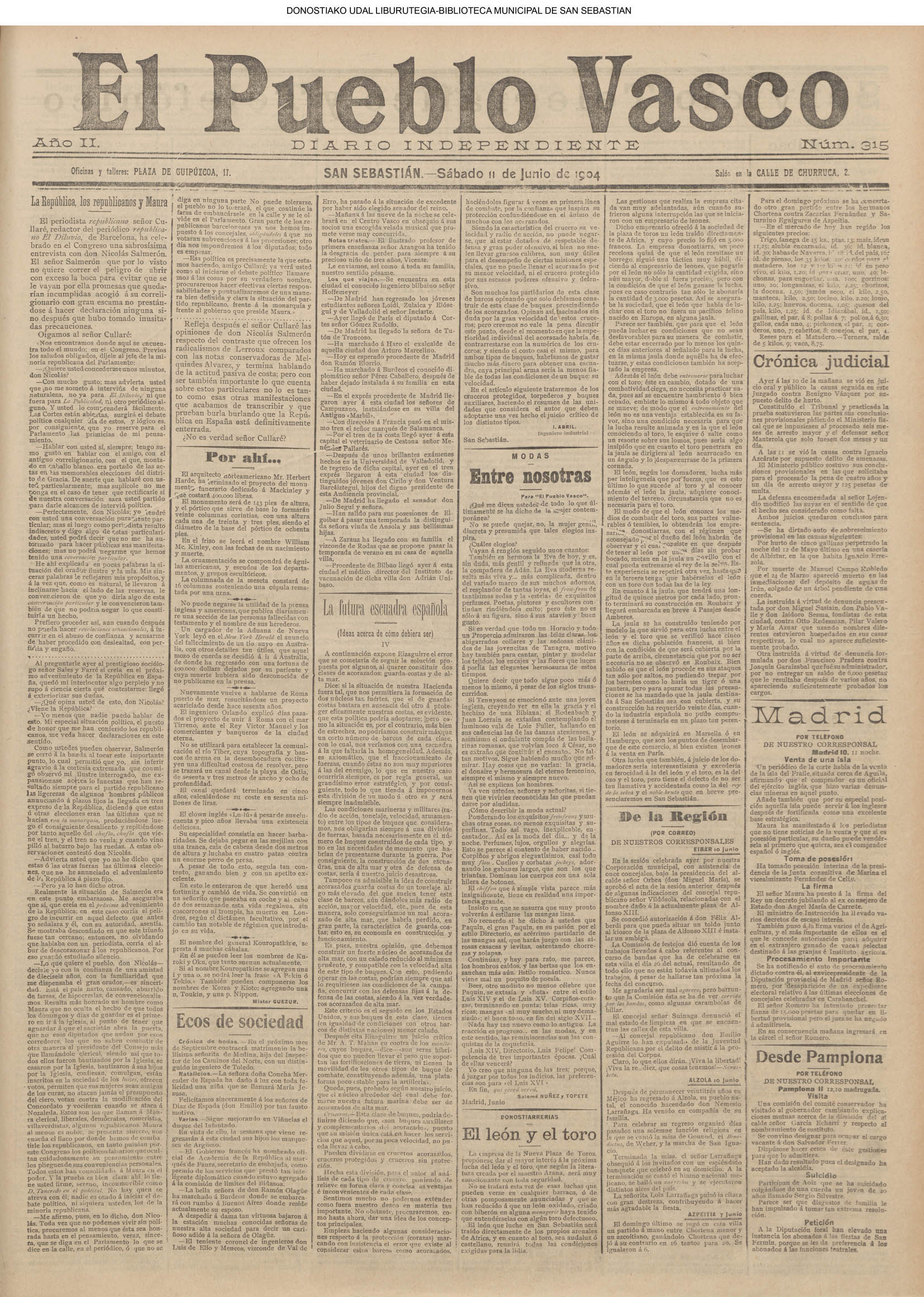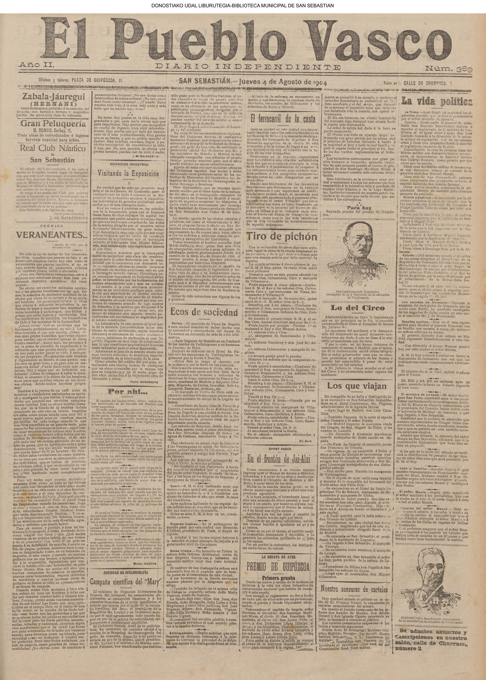 Construcción de un puente.—D. Ramón Cendoya, vecino de Hernani, ha solicitado licencia para construir un puente de fábrica sobre el río Urola, en el término de Cestona, para poner en comunicación la carretera de este pueblo á Azpeitia con la casa de máquinas que en la margen izquierda del río se va á edificar por cuenta de don Gracián Alberdi. (La Construcción moderna. 30/7/1904, n.º 14)(22)