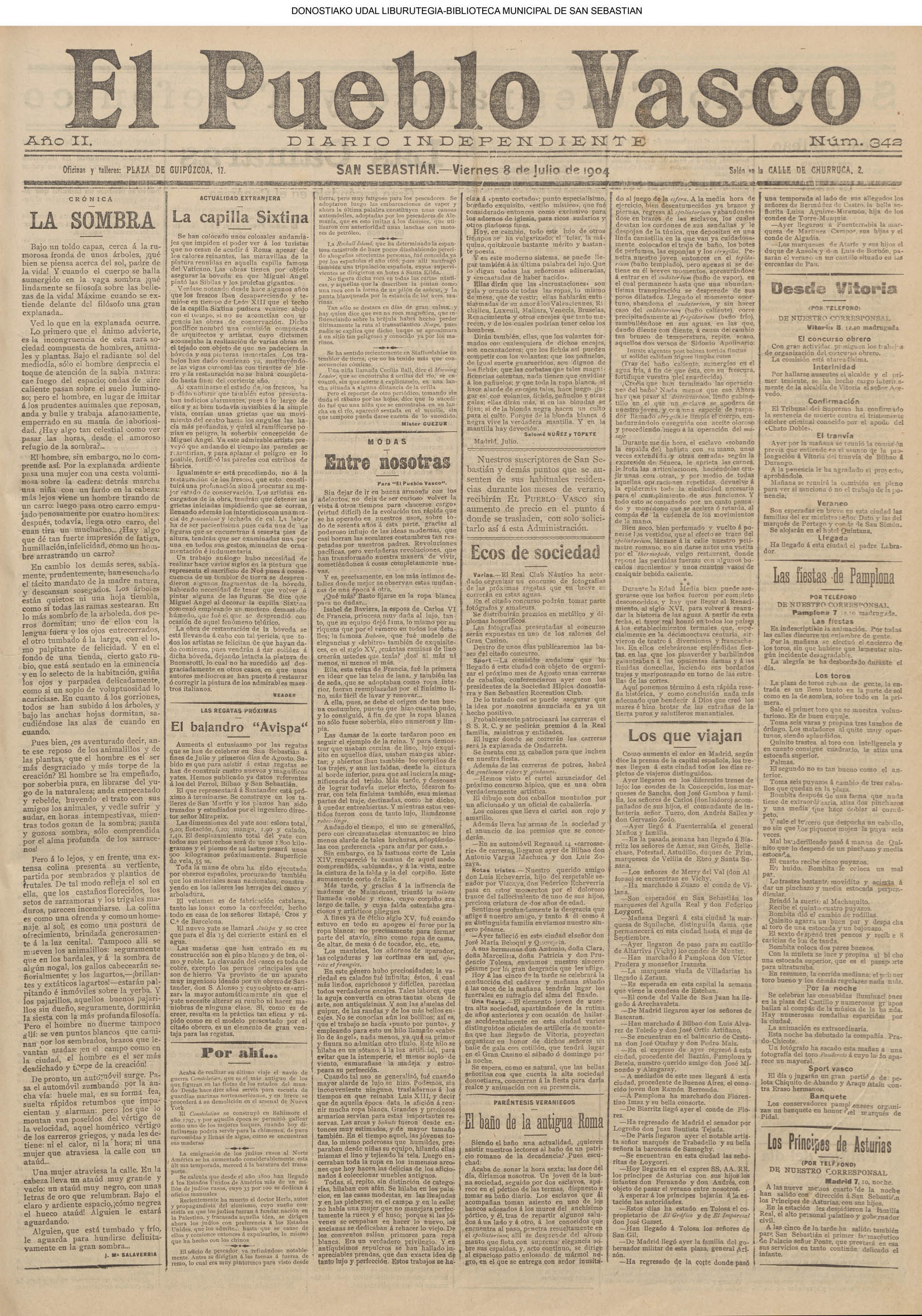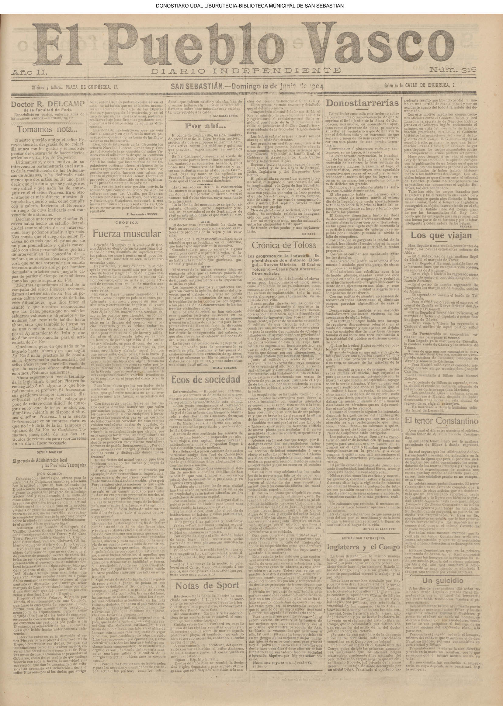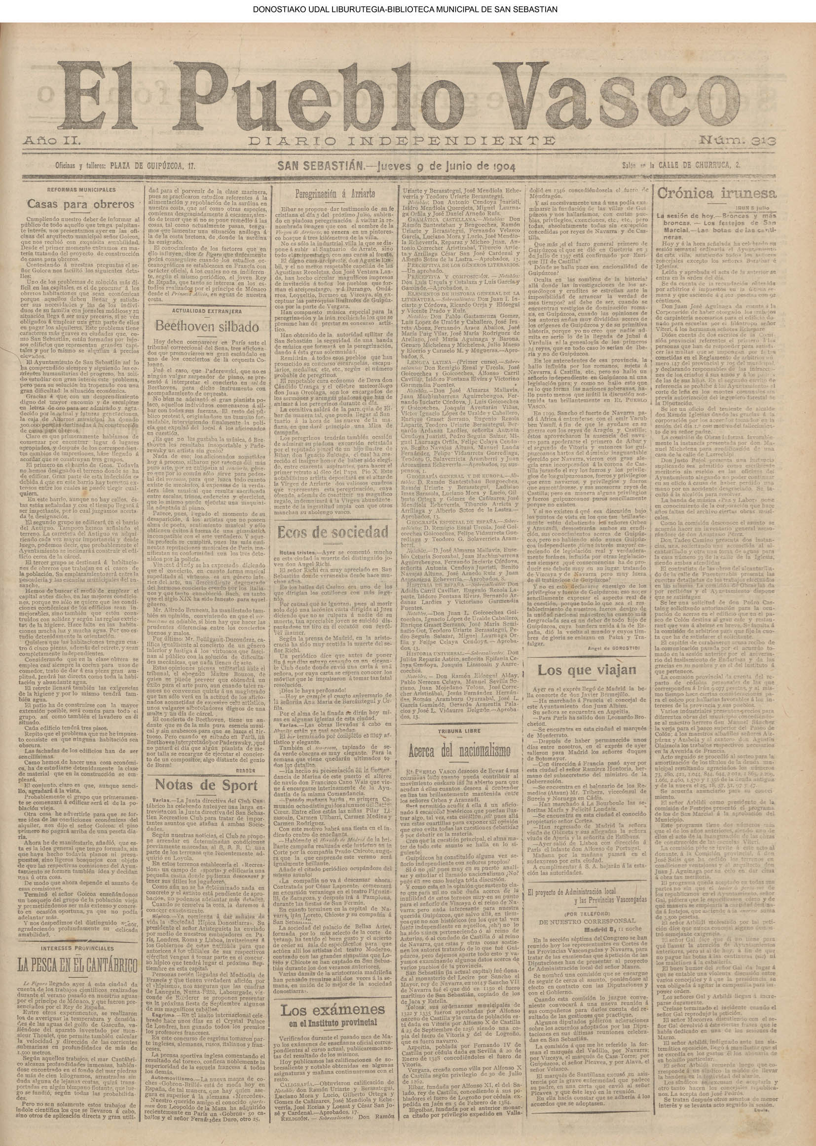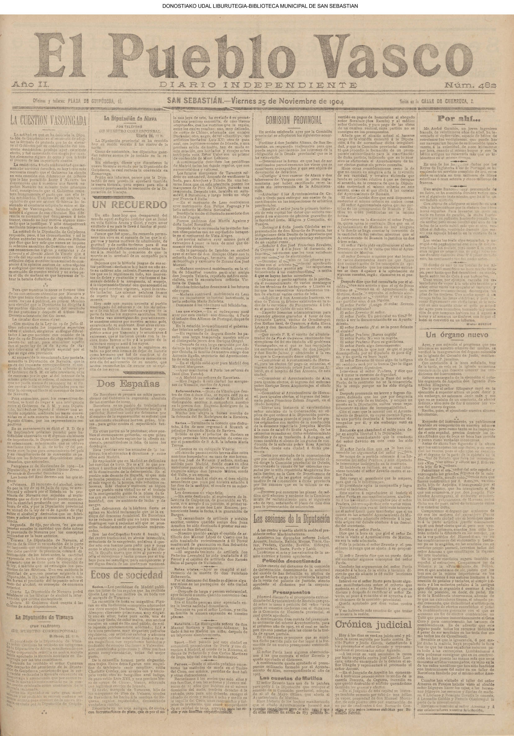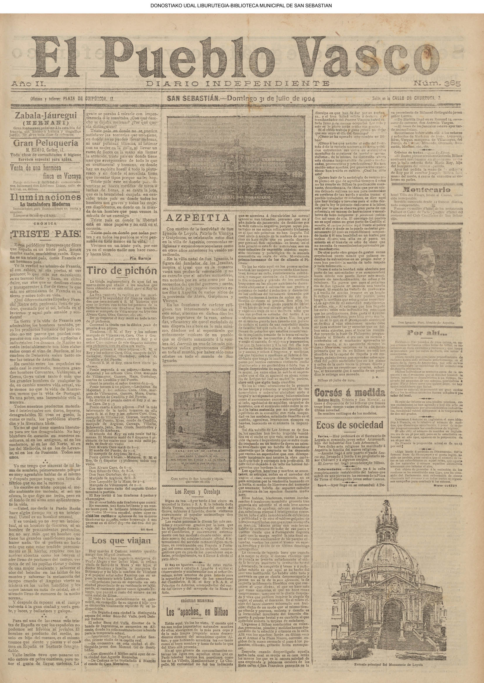 Construcción de un puente.—D. Ramón Cendoya, vecino de Hernani, ha solicitado licencia para construir un puente de fábrica sobre el río Urola, en el término de Cestona, para poner en comunicación la carretera de este pueblo á Azpeitia con la casa de máquinas que en la margen izquierda del río se va á edificar por cuenta de don Gracián Alberdi. (La Construcción moderna. 30/7/1904, n.º 14)(22)