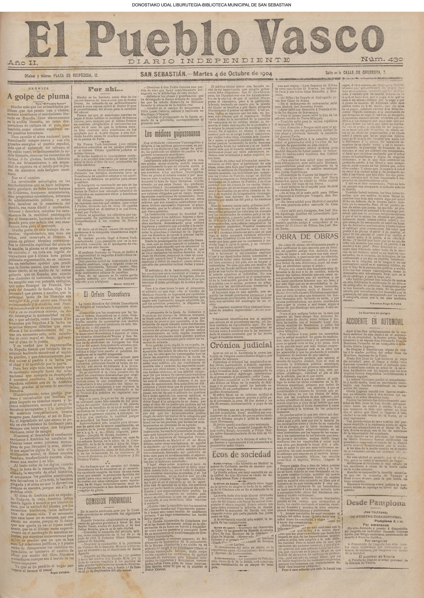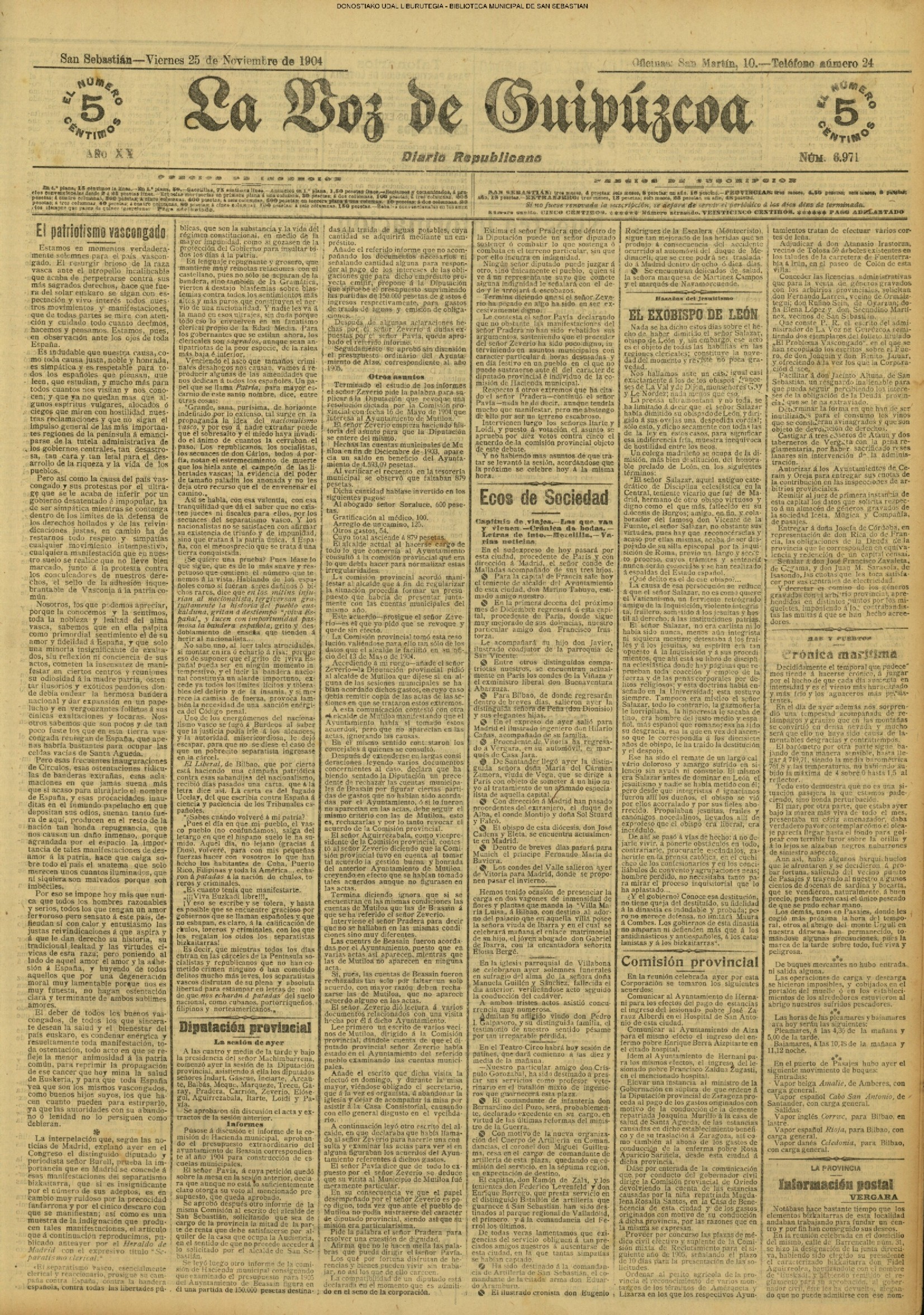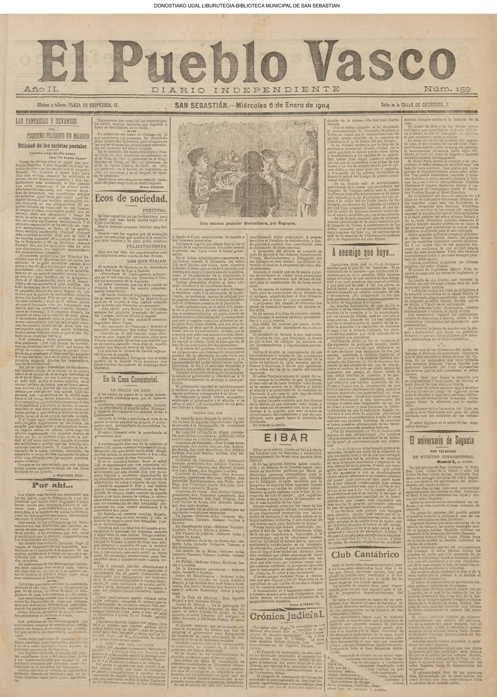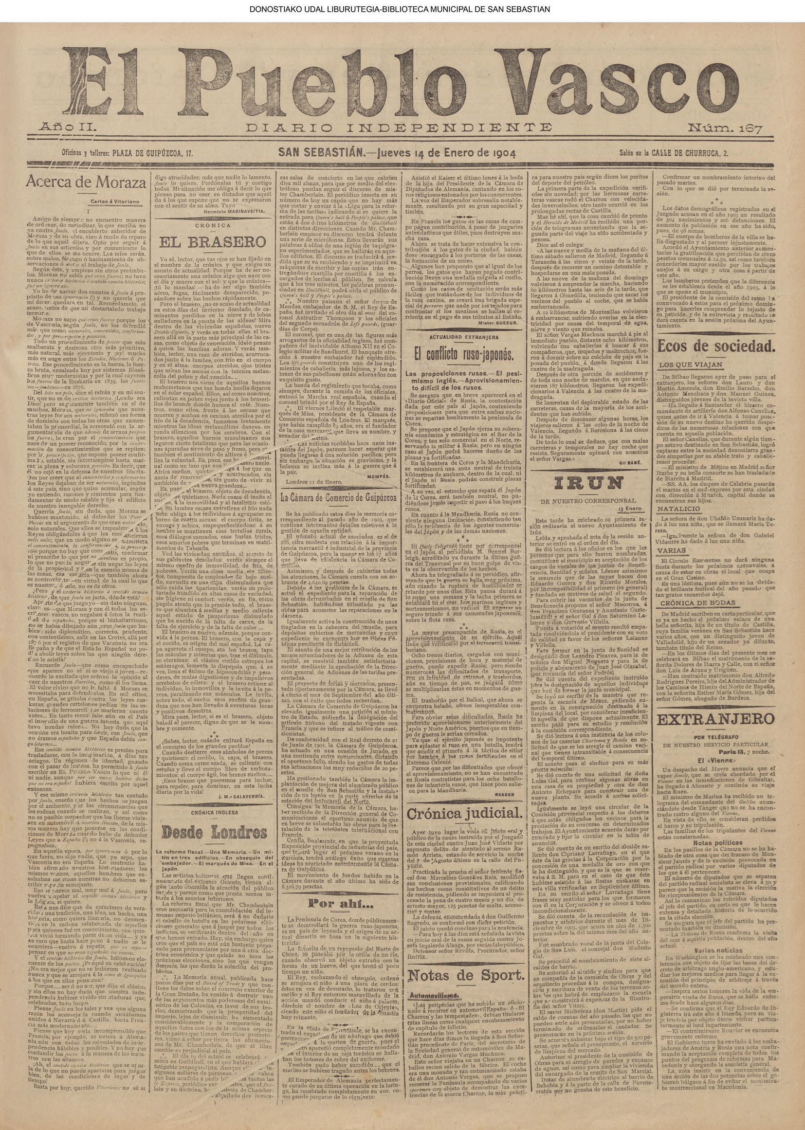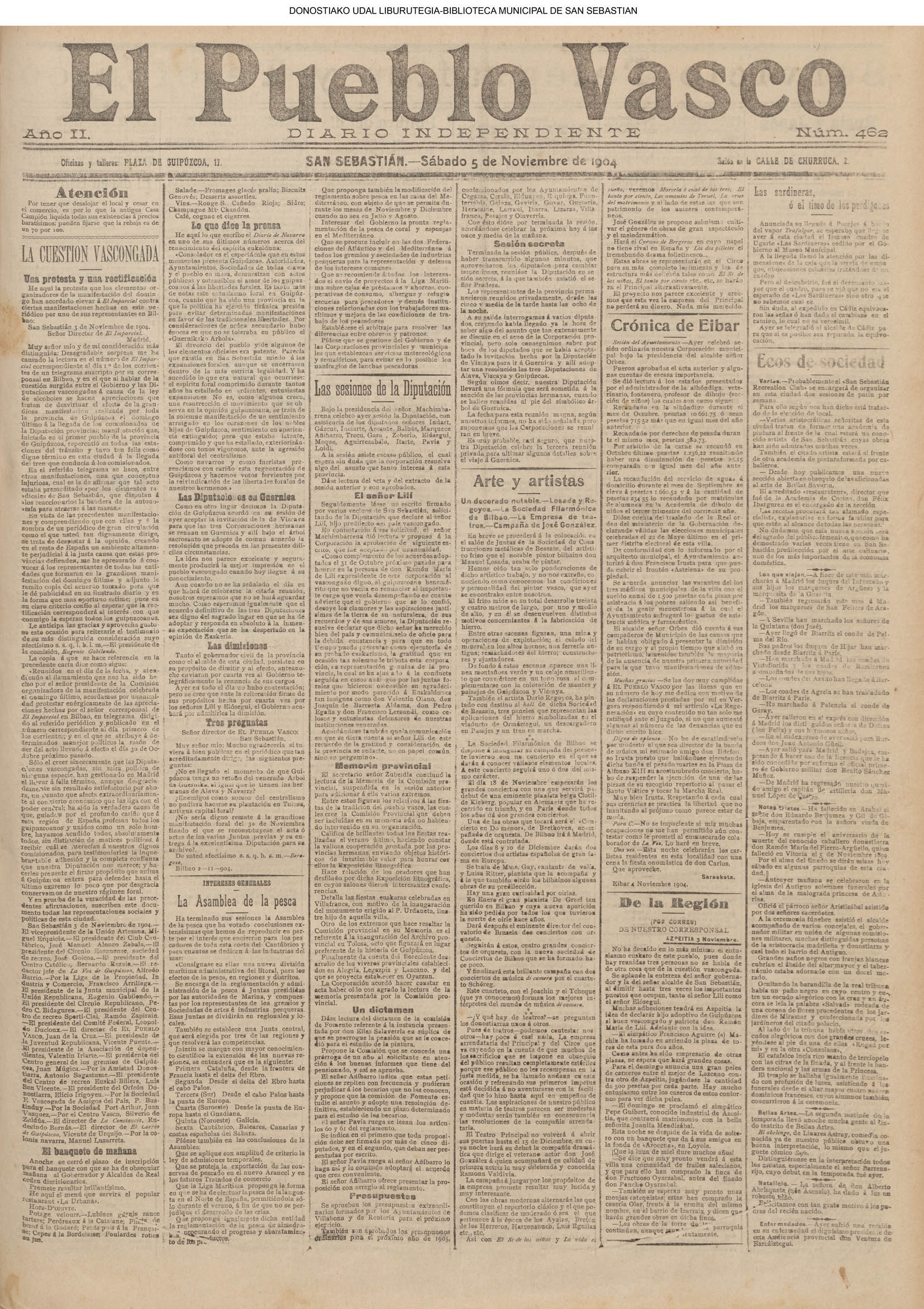 Construcción de un puente.—D. Ramón Cendoya, vecino de Hernani, ha solicitado licencia para construir un puente de fábrica sobre el río Urola, en el término de Cestona, para poner en comunicación la carretera de este pueblo á Azpeitia con la casa de máquinas que en la margen izquierda del río se va á edificar por cuenta de don Gracián Alberdi. (La Construcción moderna. 30/7/1904, n.º 14)(22)