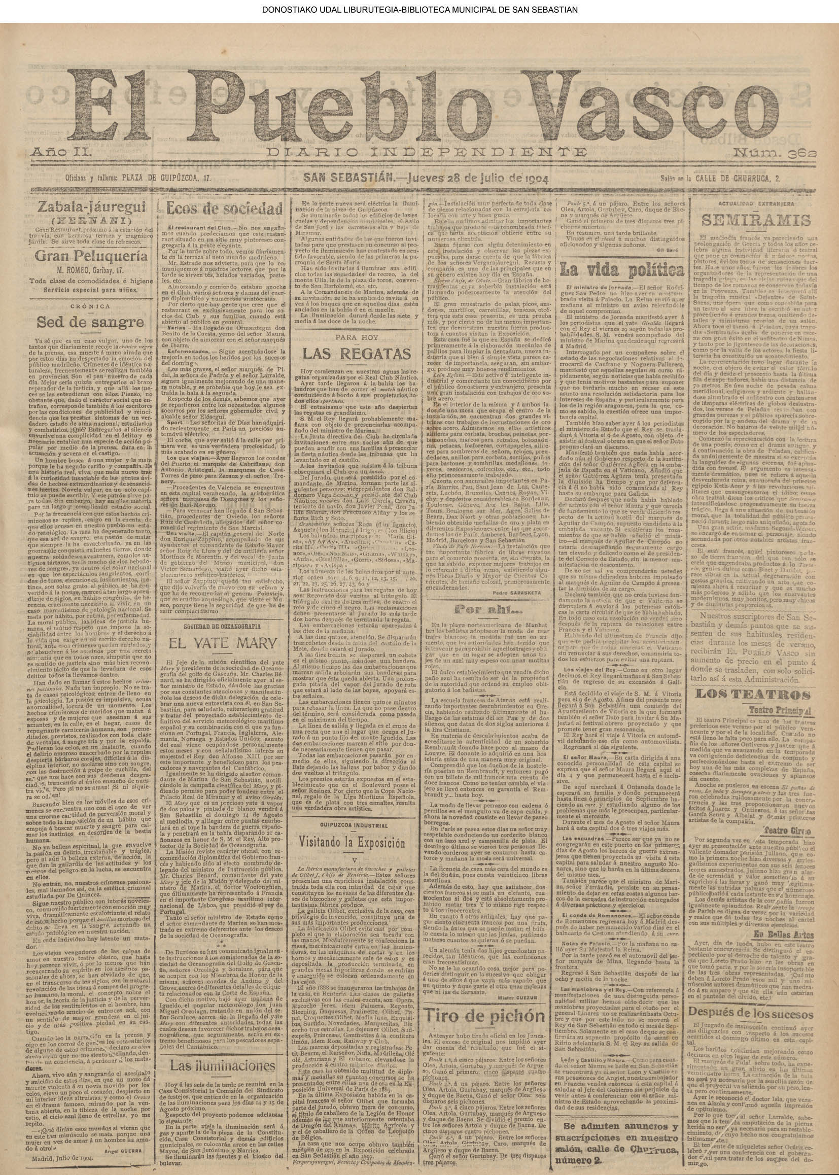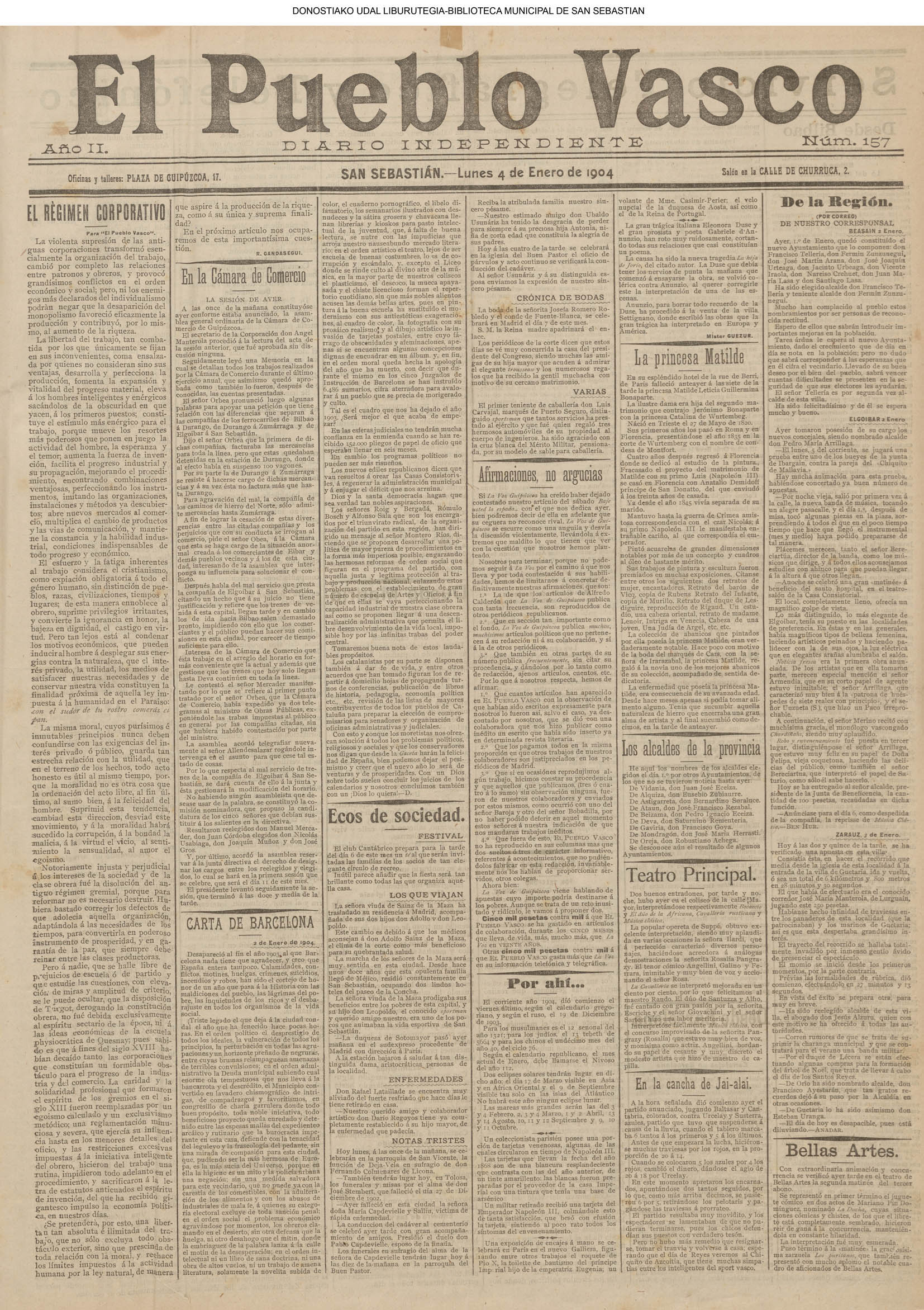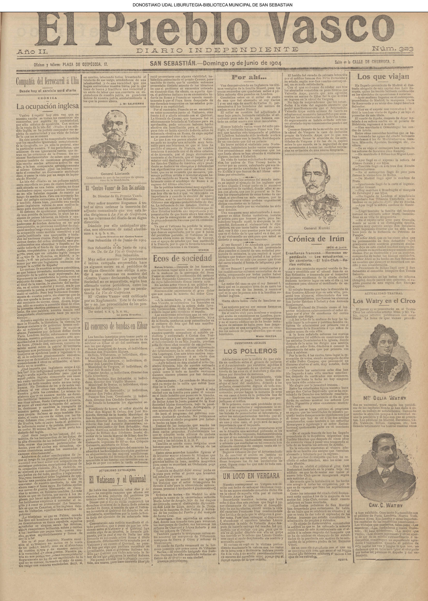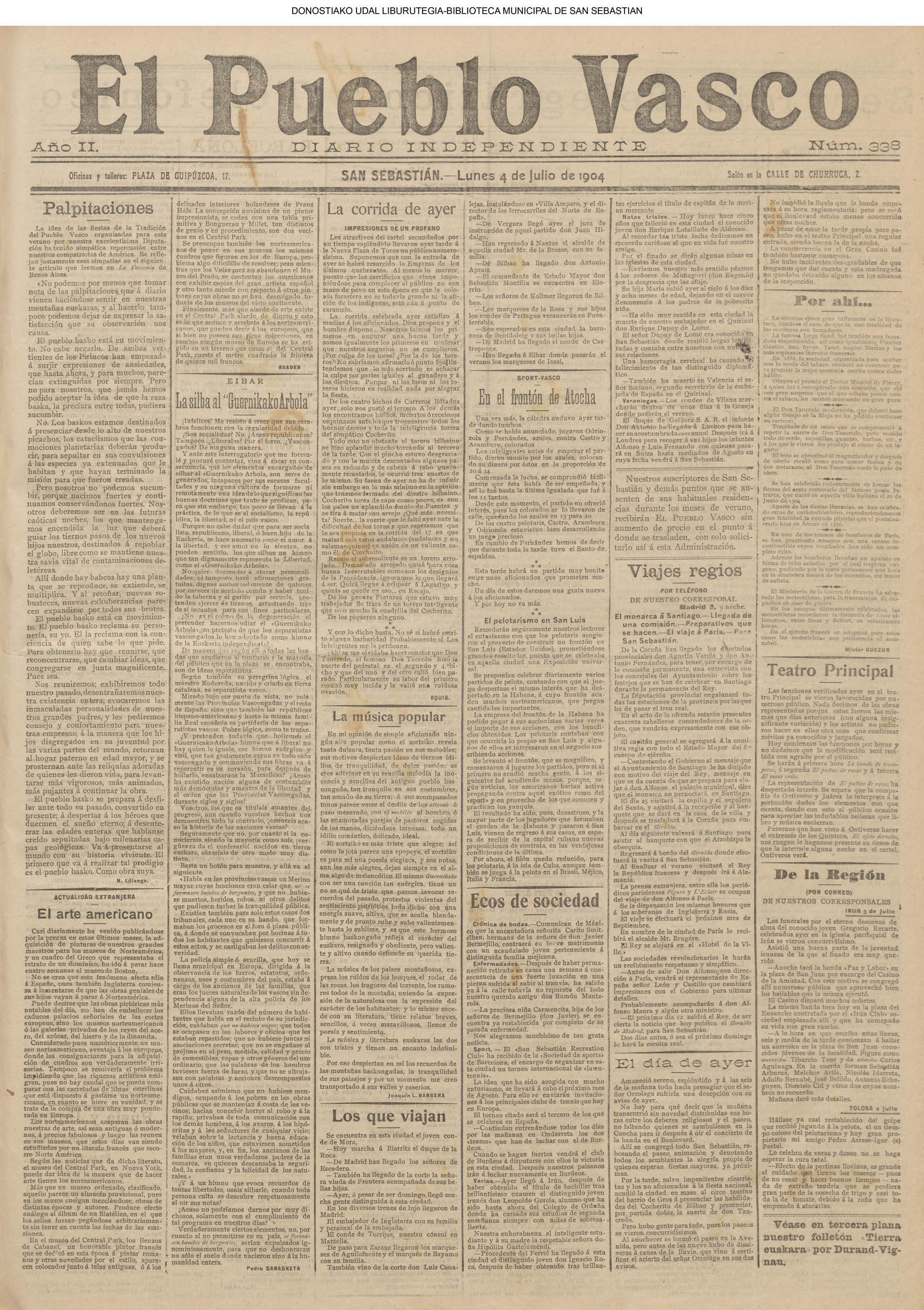 Construcción de un puente.—D. Ramón Cendoya, vecino de Hernani, ha solicitado licencia para construir un puente de fábrica sobre el río Urola, en el término de Cestona, para poner en comunicación la carretera de este pueblo á Azpeitia con la casa de máquinas que en la margen izquierda del río se va á edificar por cuenta de don Gracián Alberdi. (La Construcción moderna. 30/7/1904, n.º 14)(22)