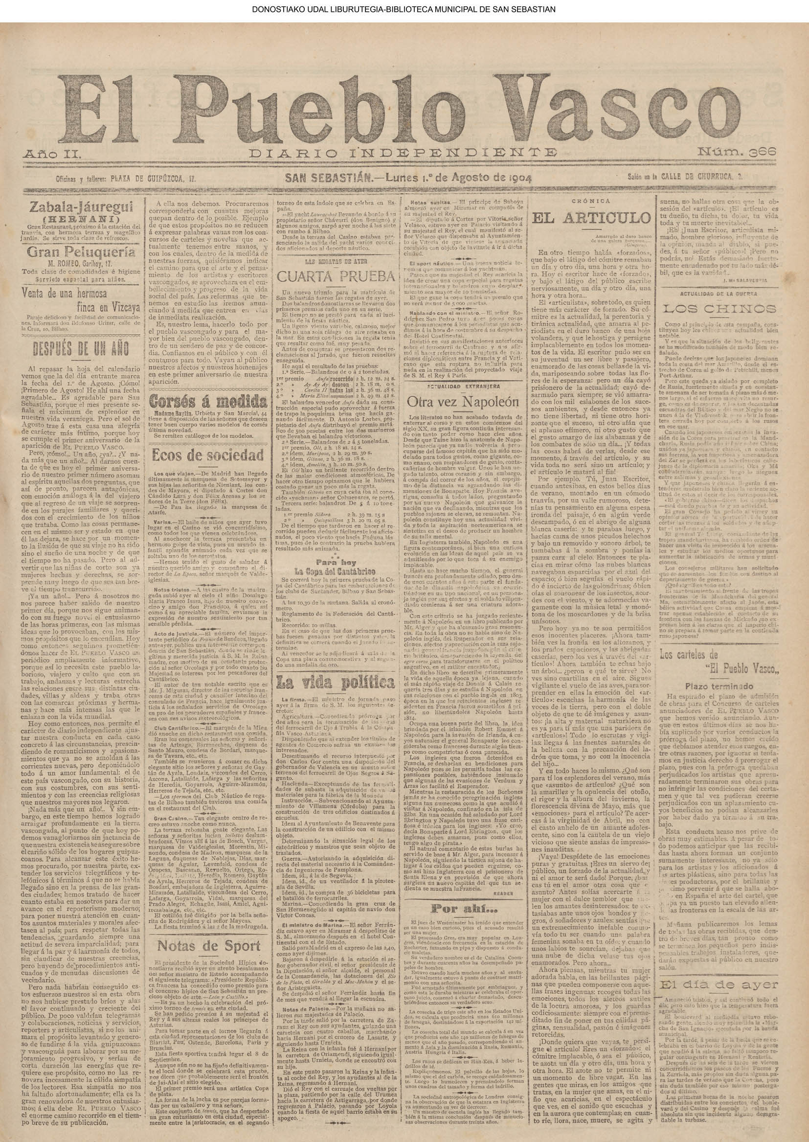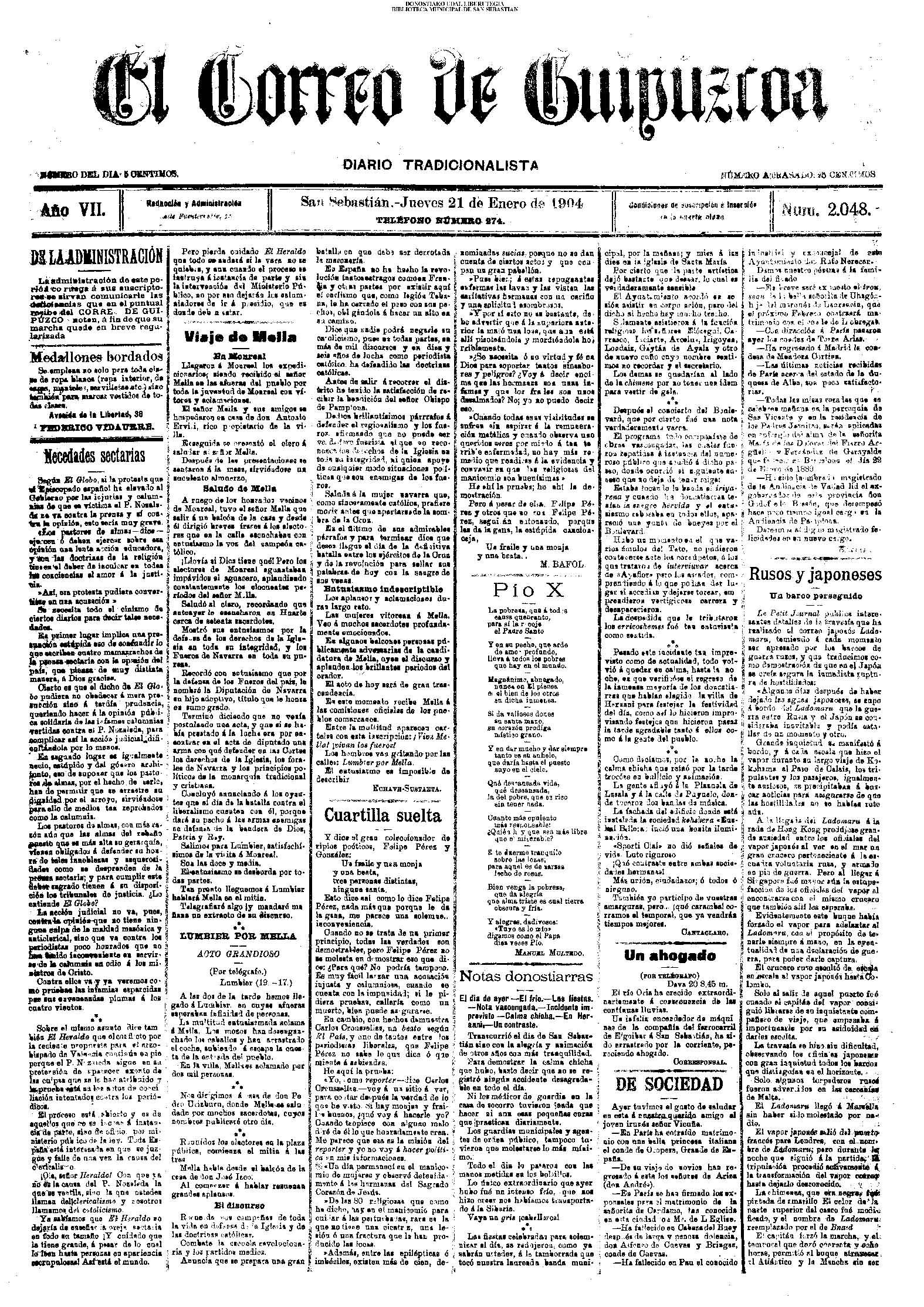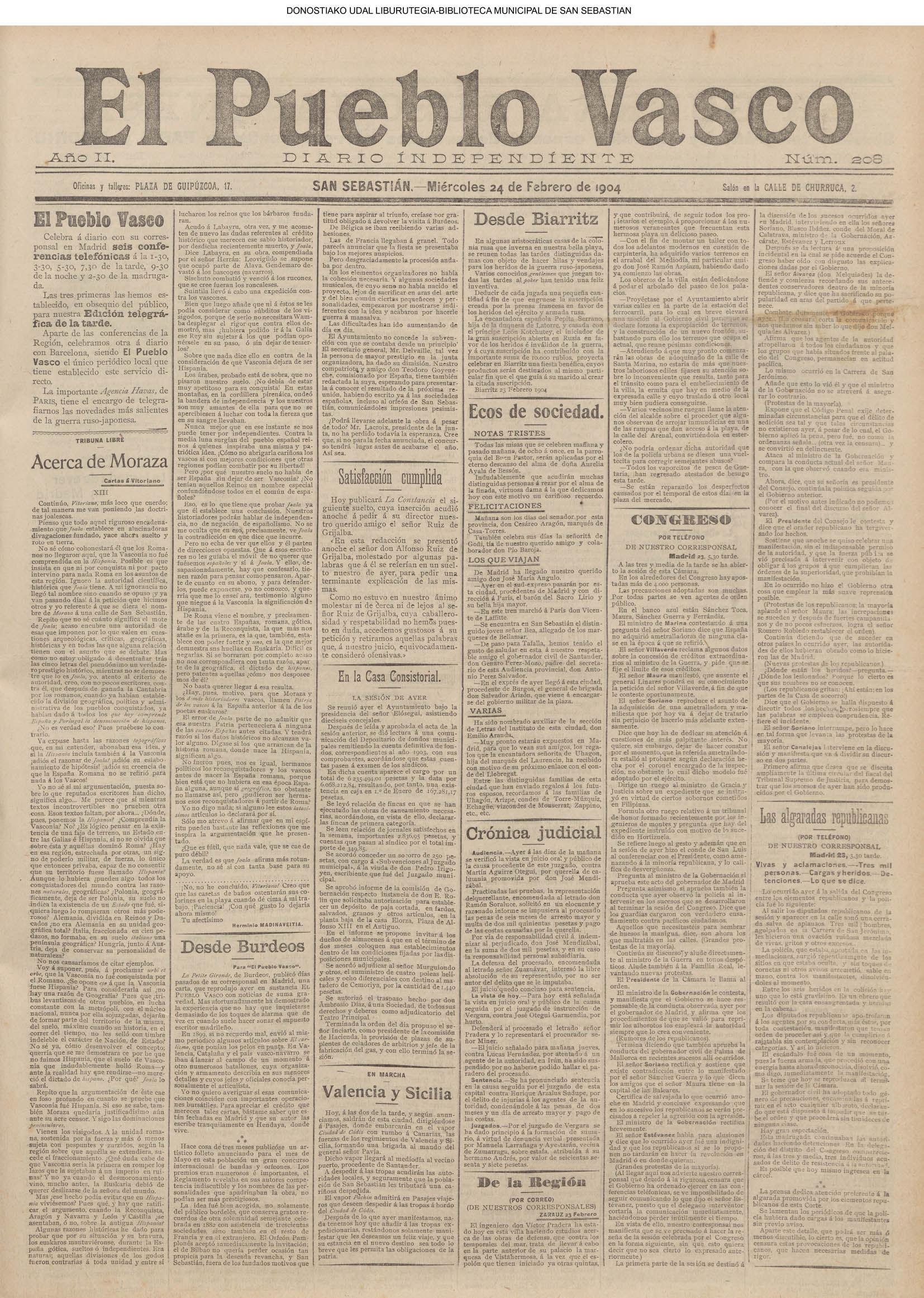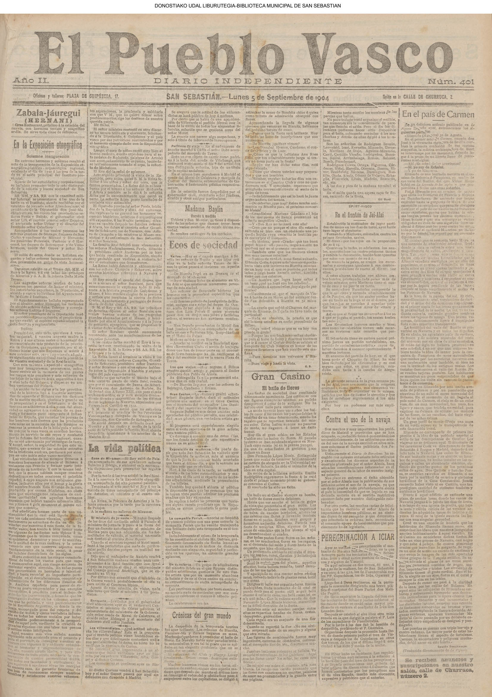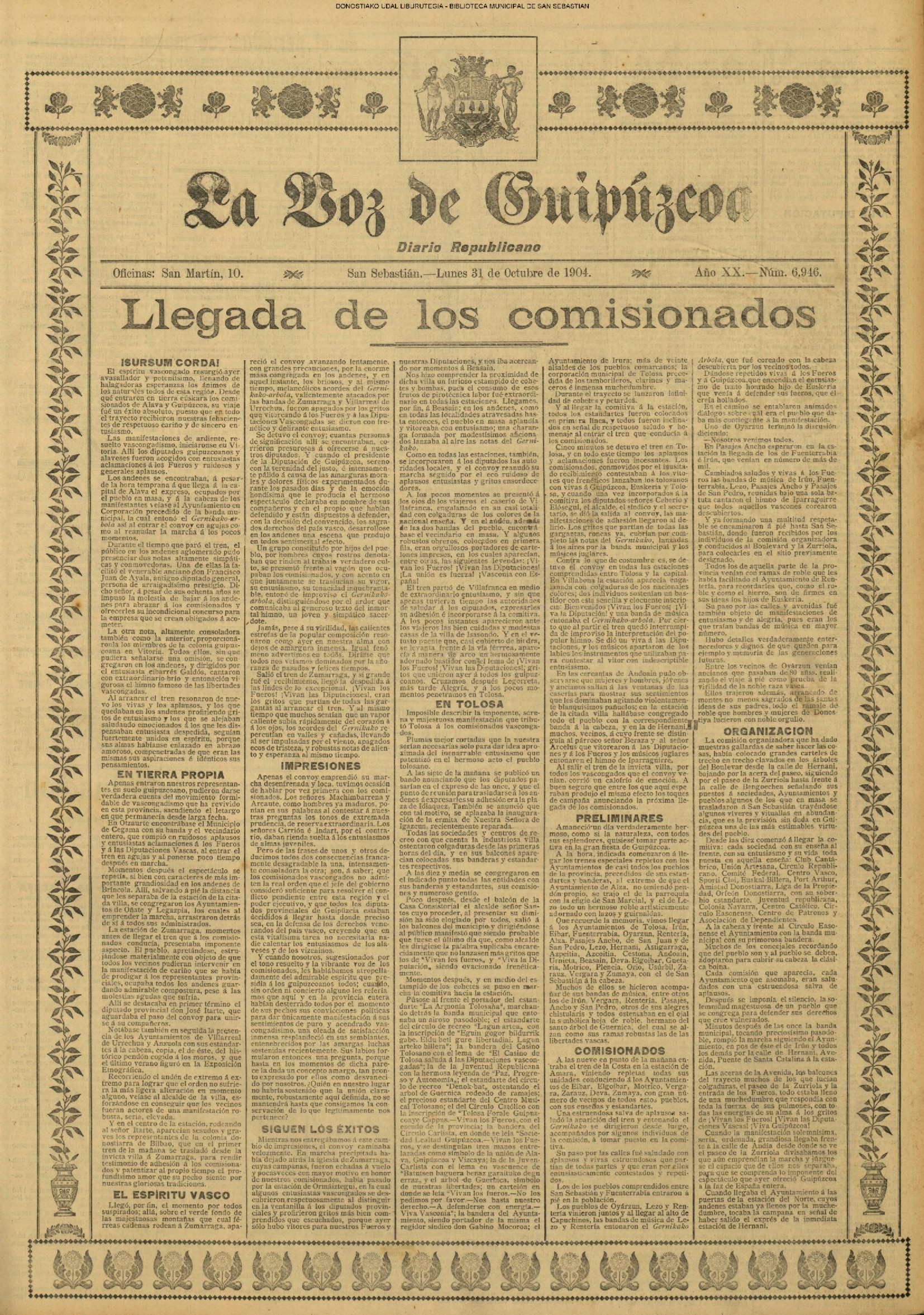 Construcción de un puente.—D. Ramón Cendoya, vecino de Hernani, ha solicitado licencia para construir un puente de fábrica sobre el río Urola, en el término de Cestona, para poner en comunicación la carretera de este pueblo á Azpeitia con la casa de máquinas que en la margen izquierda del río se va á edificar por cuenta de don Gracián Alberdi. (La Construcción moderna. 30/7/1904, n.º 14)(22)