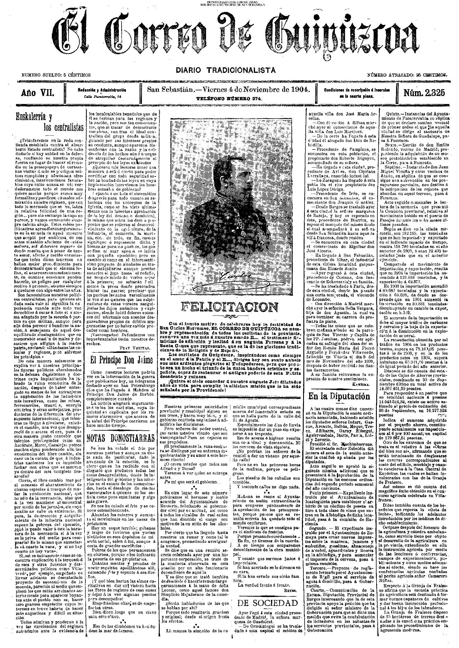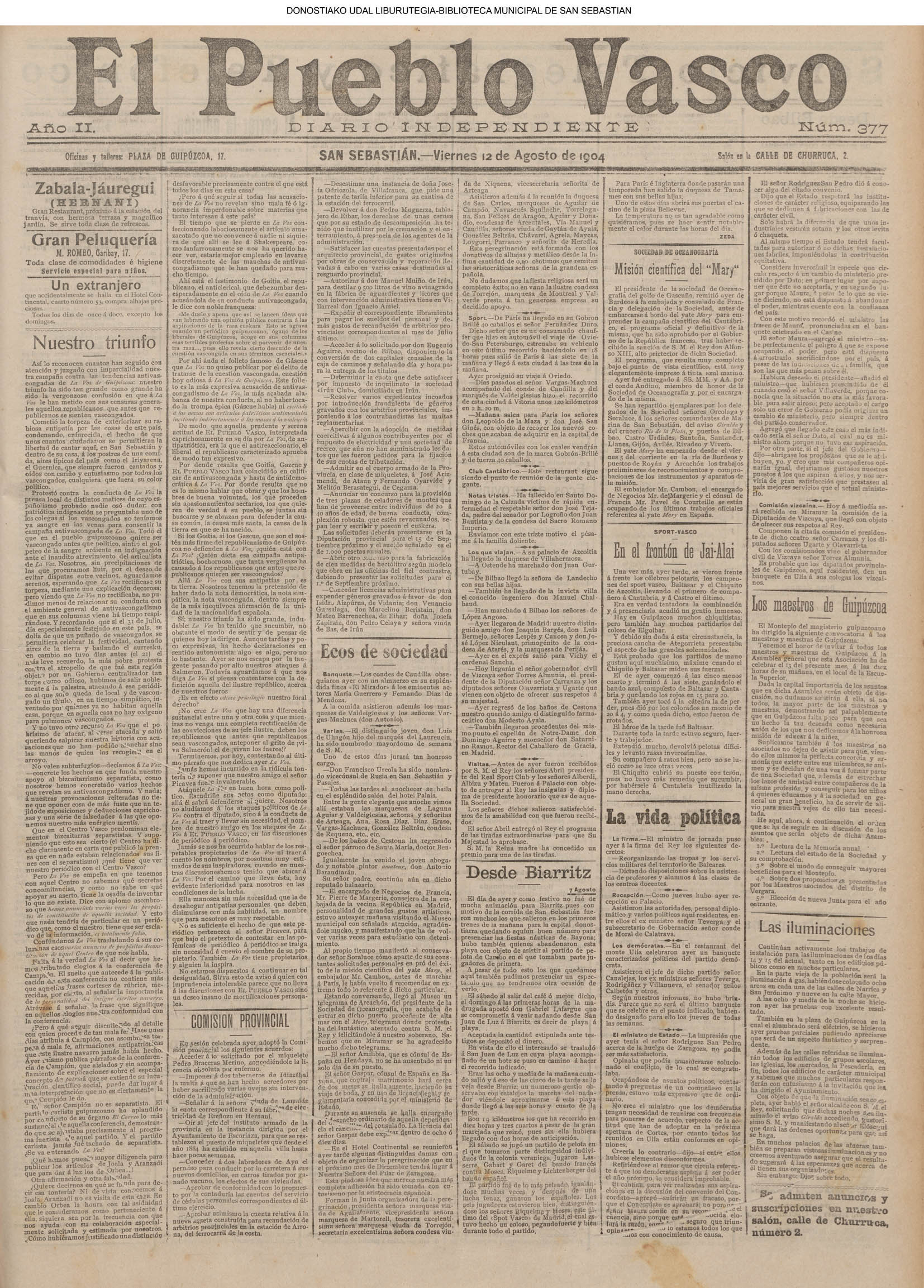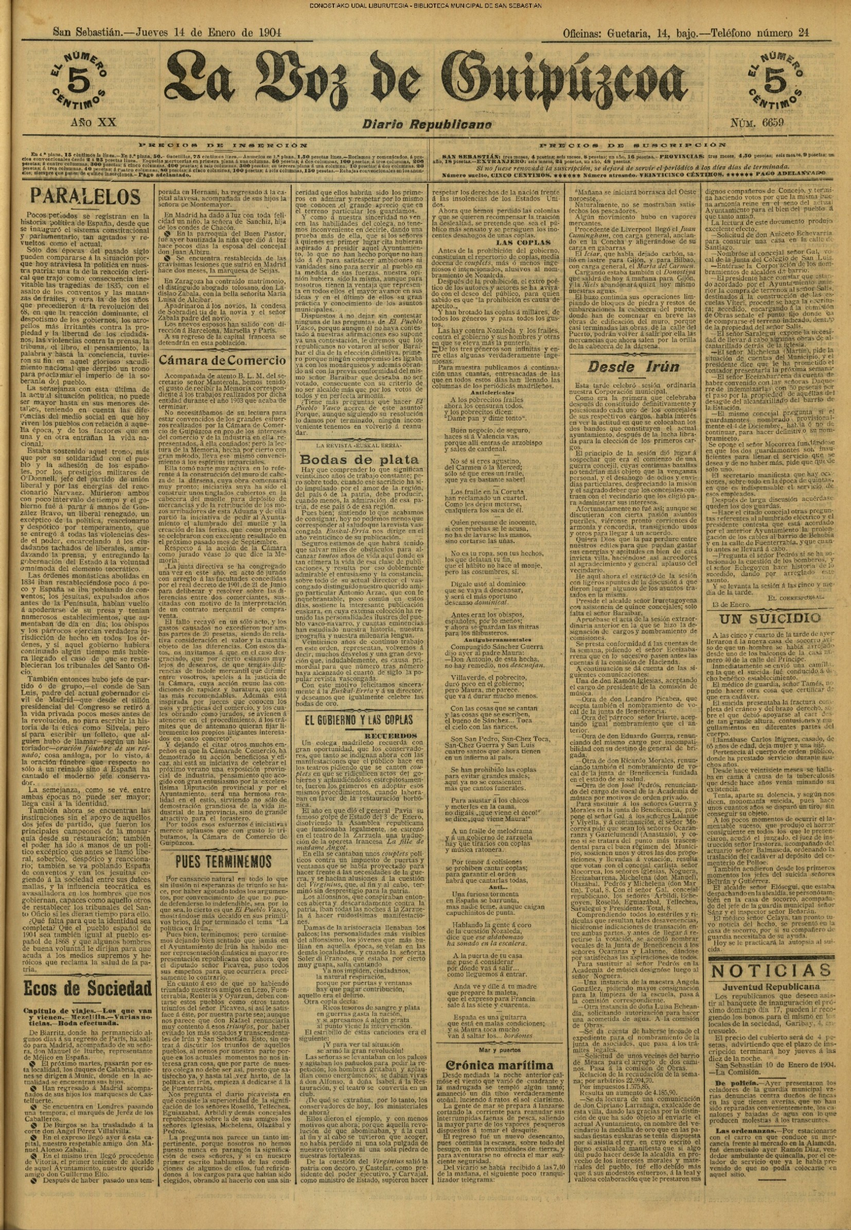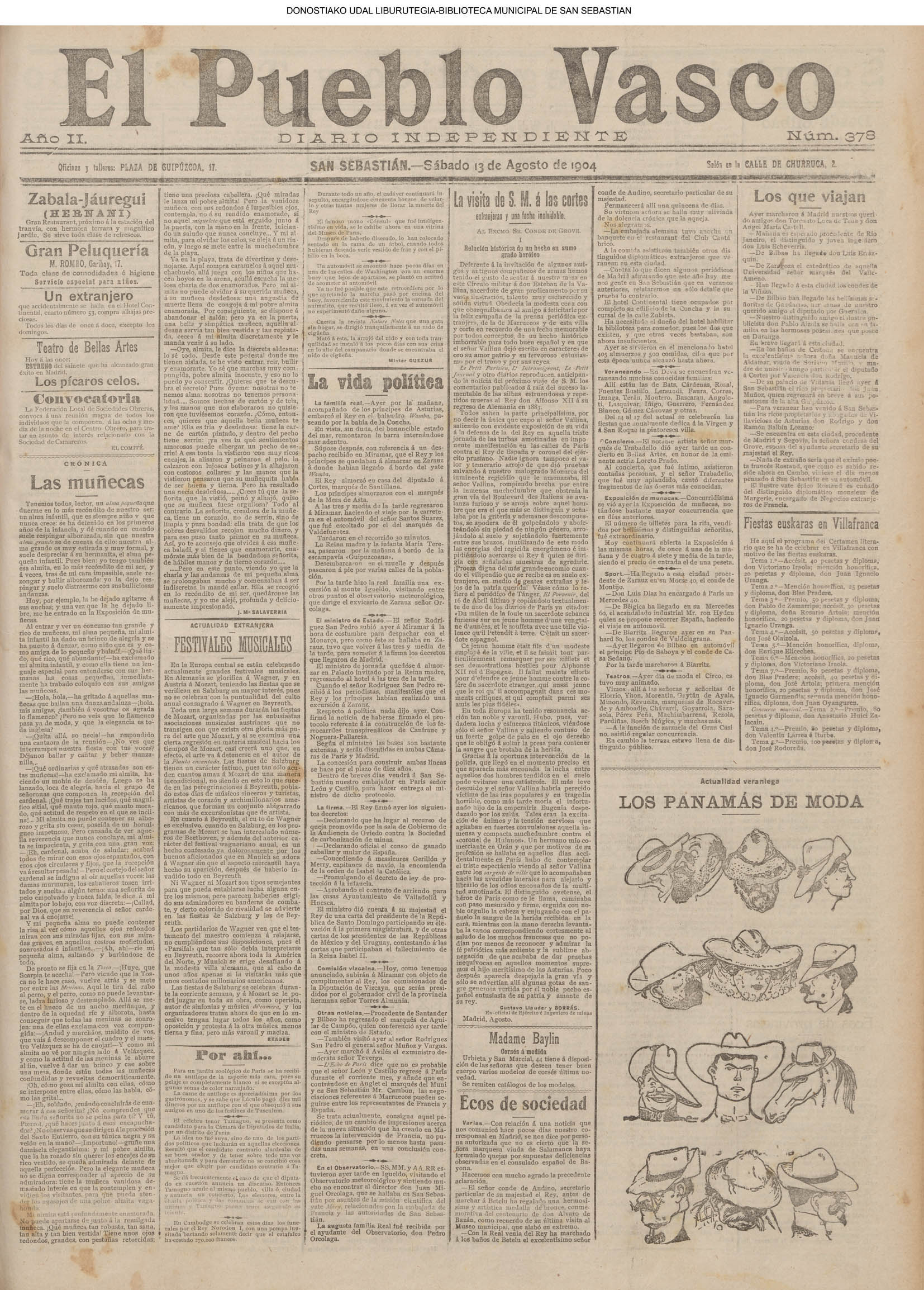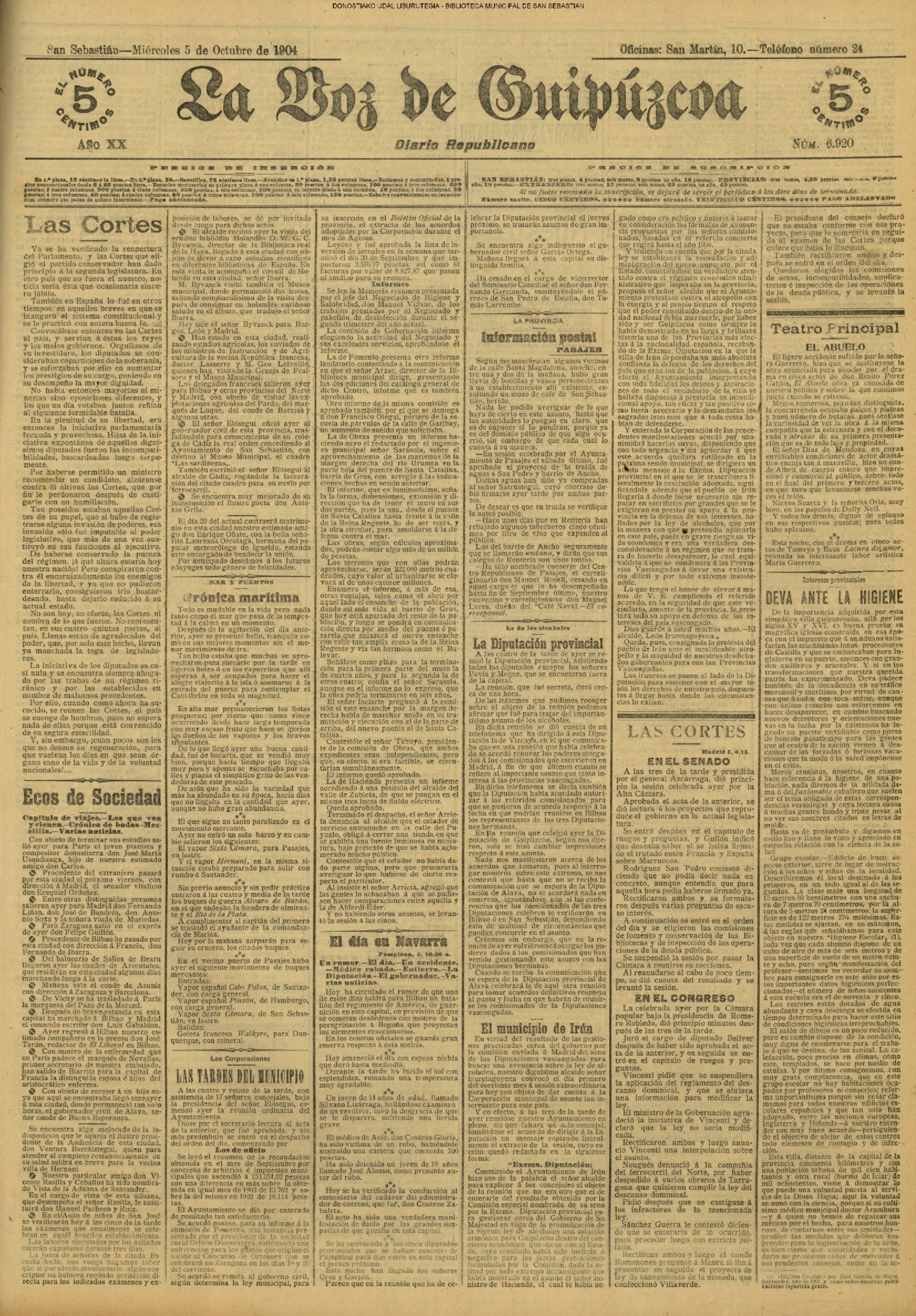 Construcción de un puente.—D. Ramón Cendoya, vecino de Hernani, ha solicitado licencia para construir un puente de fábrica sobre el río Urola, en el término de Cestona, para poner en comunicación la carretera de este pueblo á Azpeitia con la casa de máquinas que en la margen izquierda del río se va á edificar por cuenta de don Gracián Alberdi. (La Construcción moderna. 30/7/1904, n.º 14)(22)