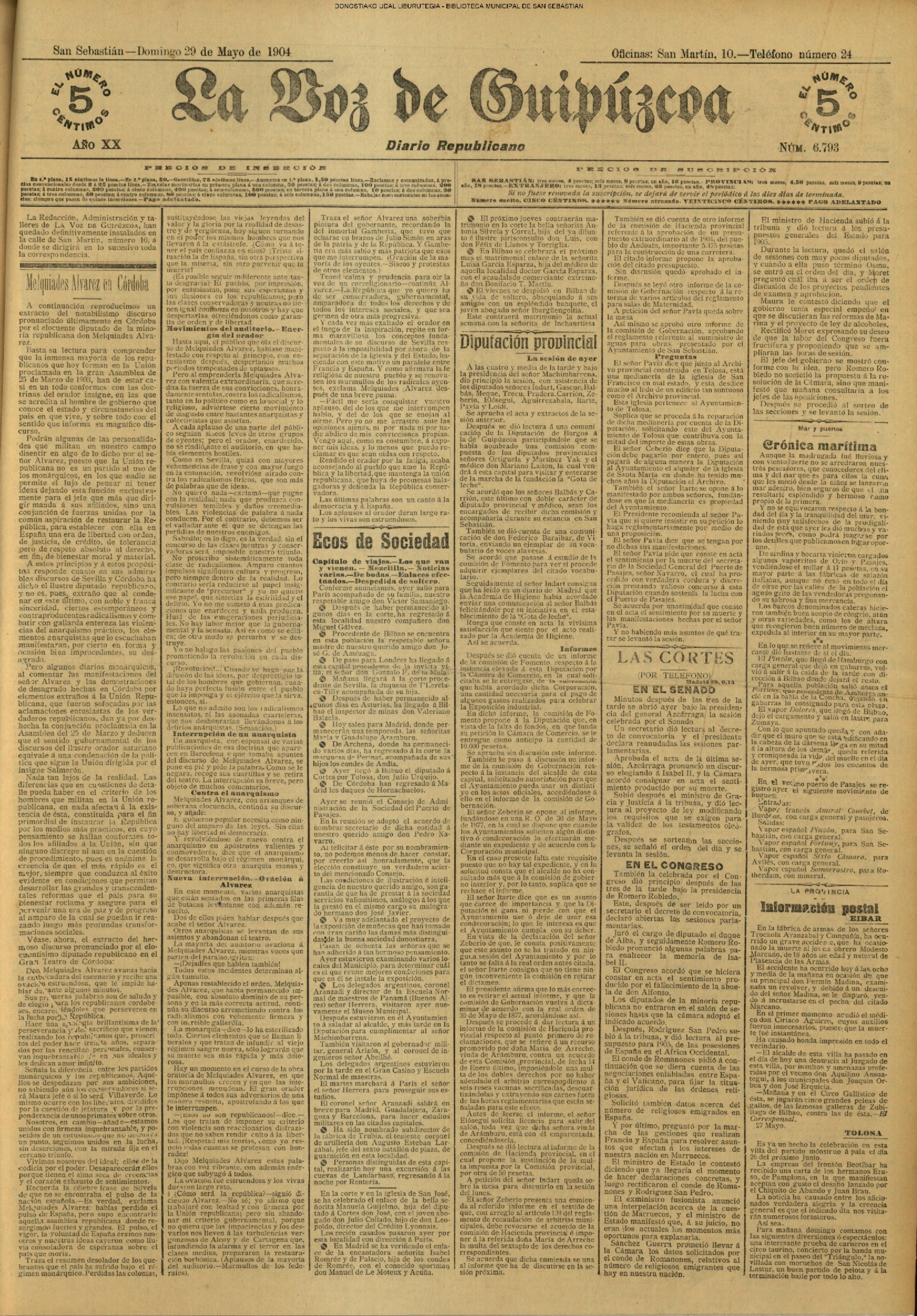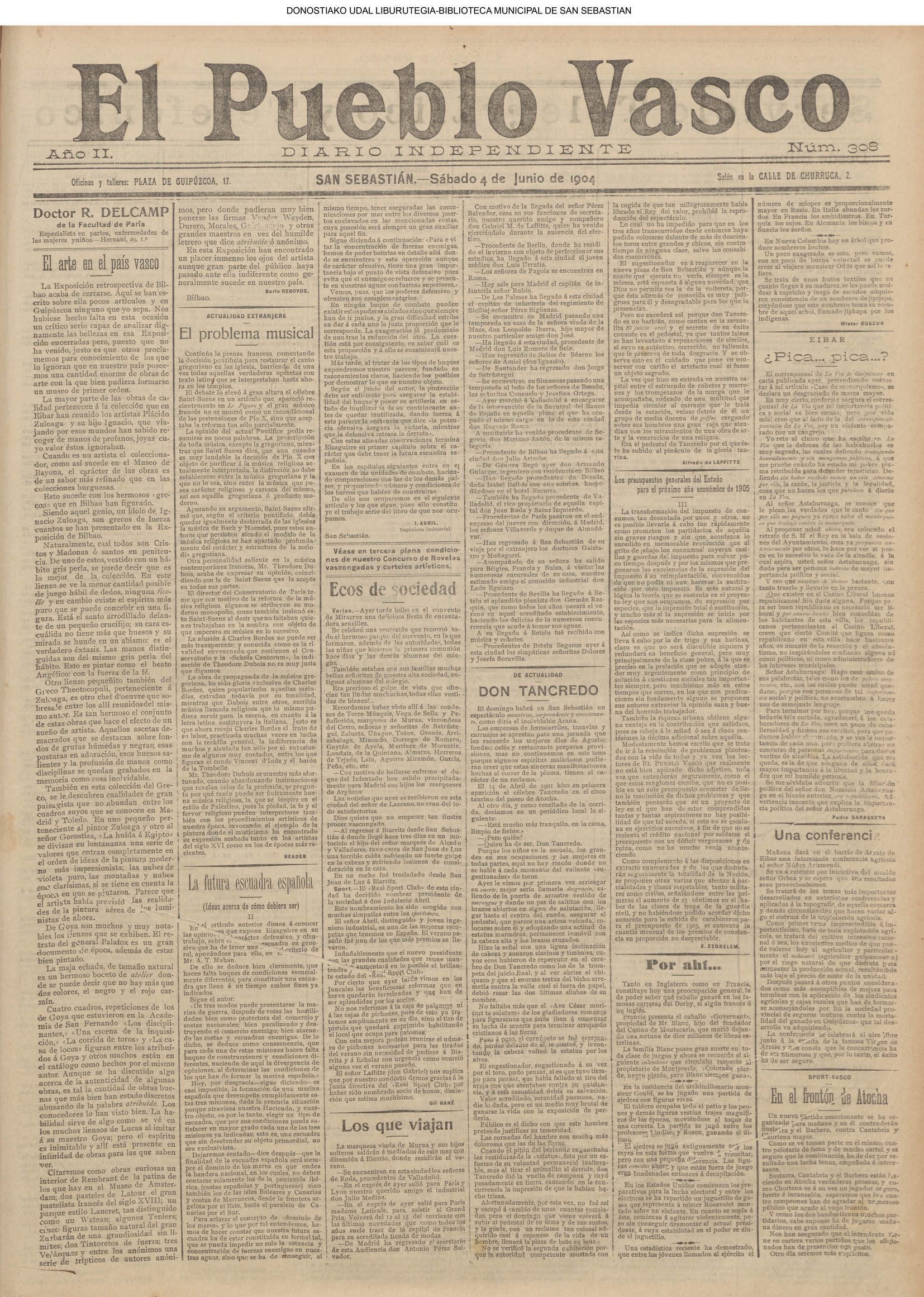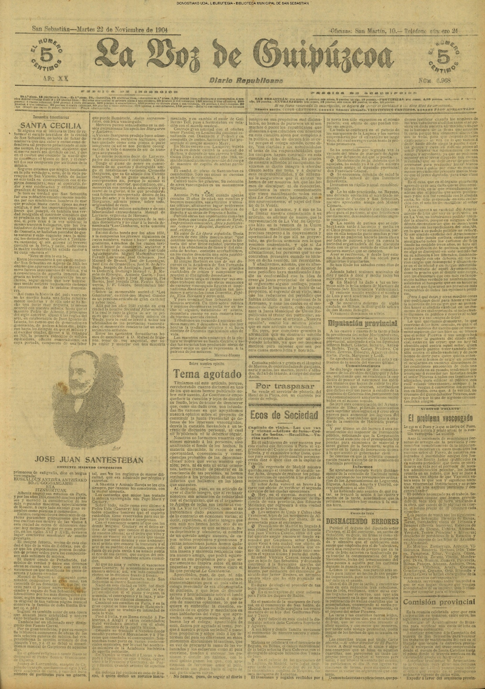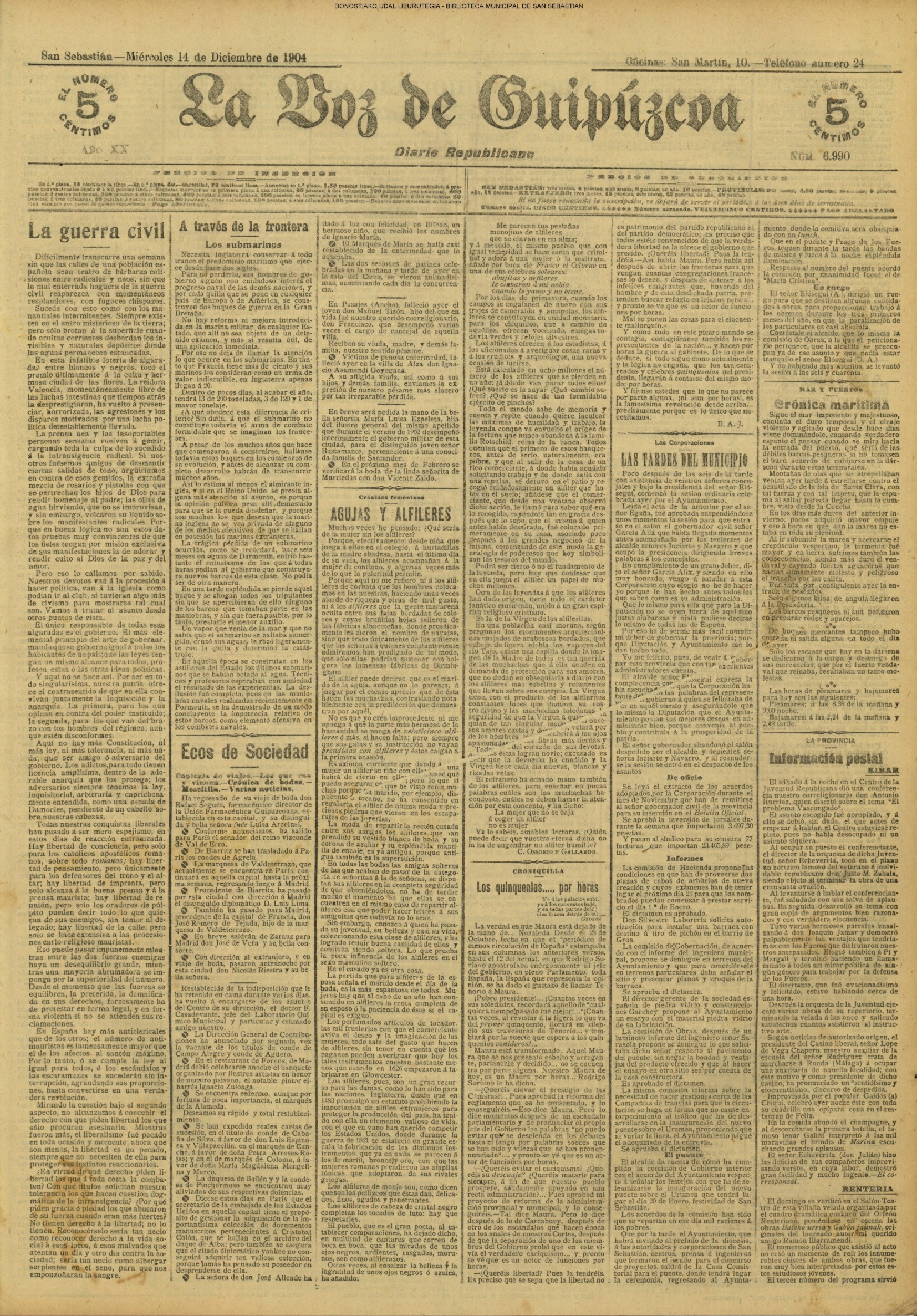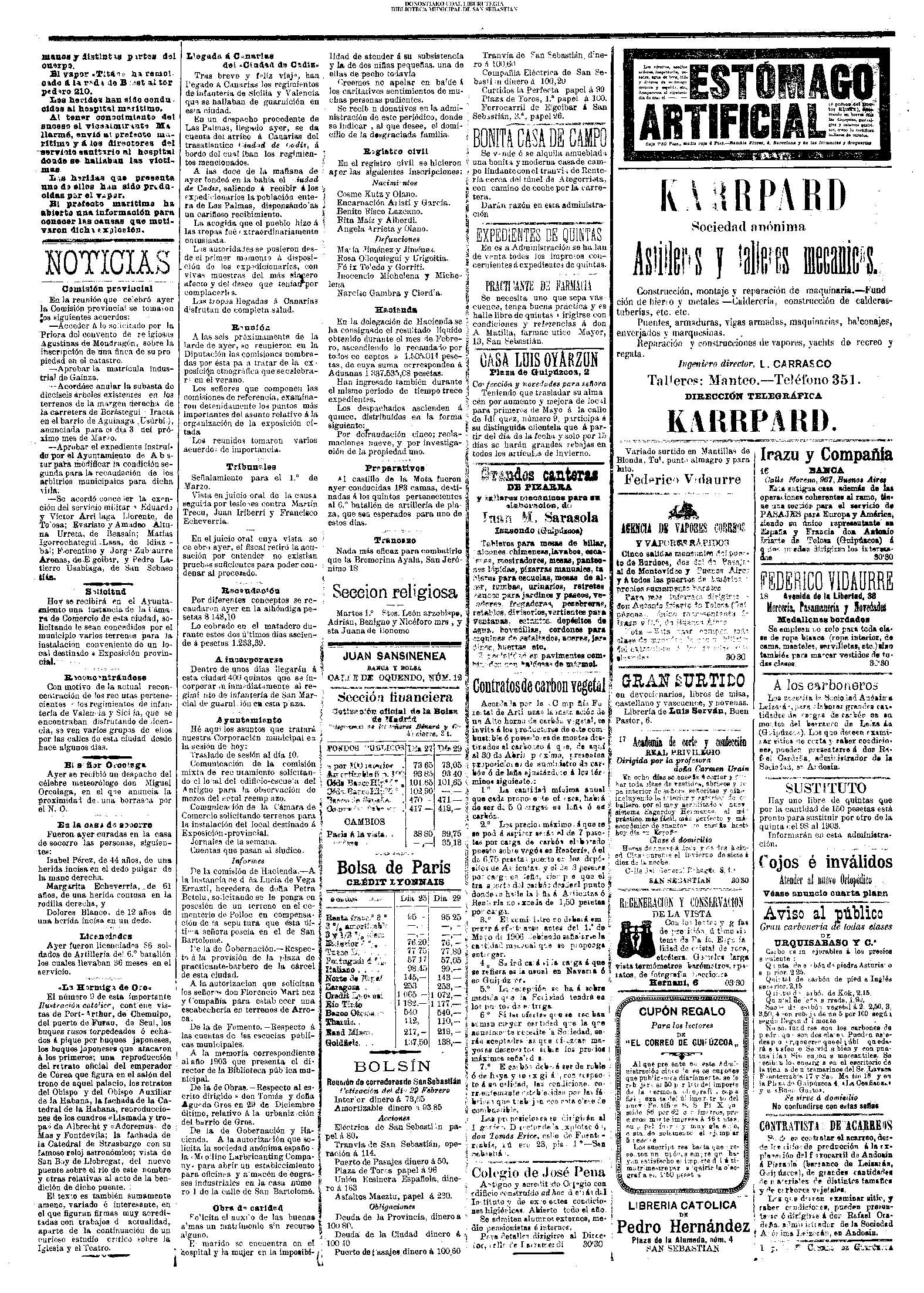 Construcción de un puente.—D. Ramón Cendoya, vecino de Hernani, ha solicitado licencia para construir un puente de fábrica sobre el río Urola, en el término de Cestona, para poner en comunicación la carretera de este pueblo á Azpeitia con la casa de máquinas que en la margen izquierda del río se va á edificar por cuenta de don Gracián Alberdi. (La Construcción moderna. 30/7/1904, n.º 14)(22)