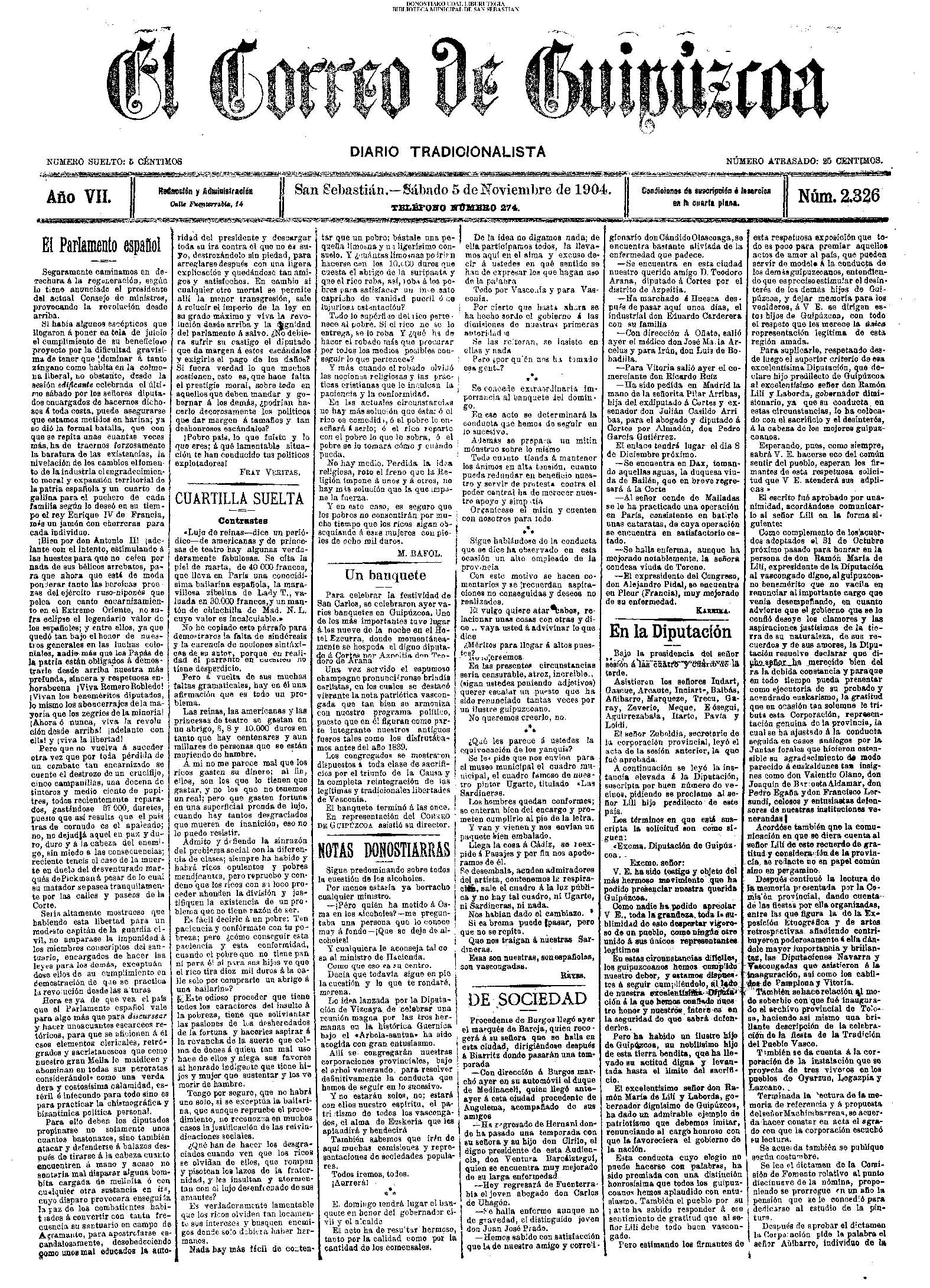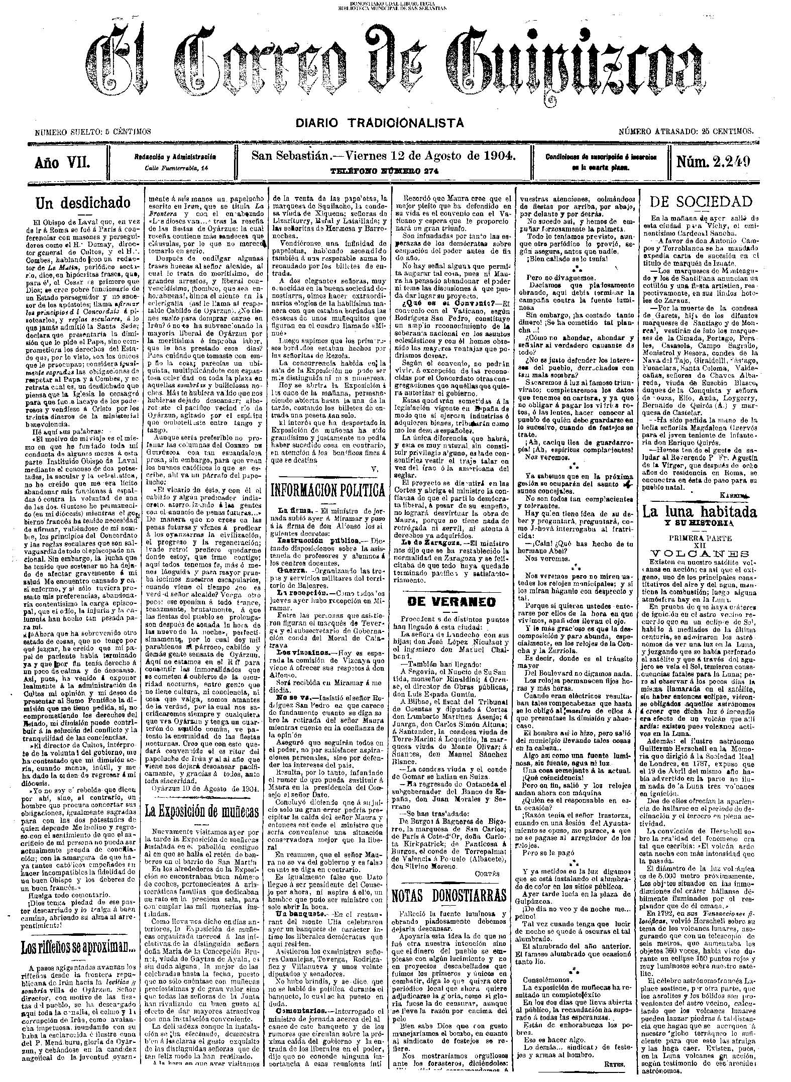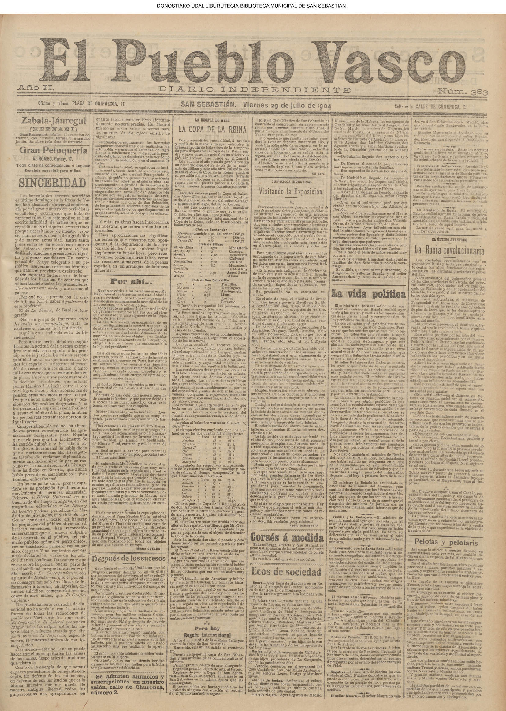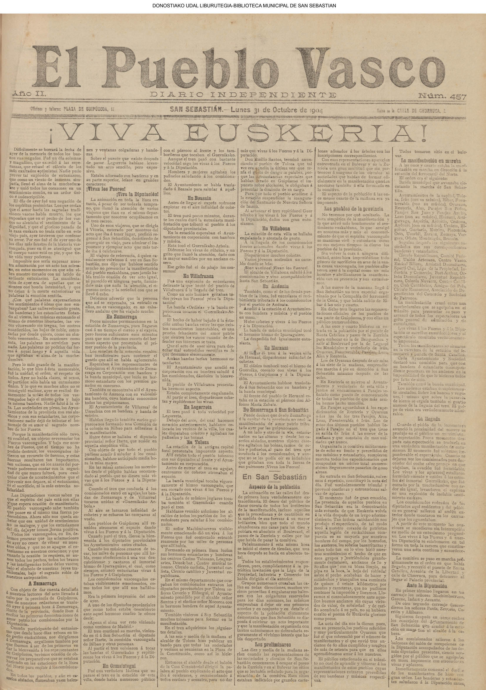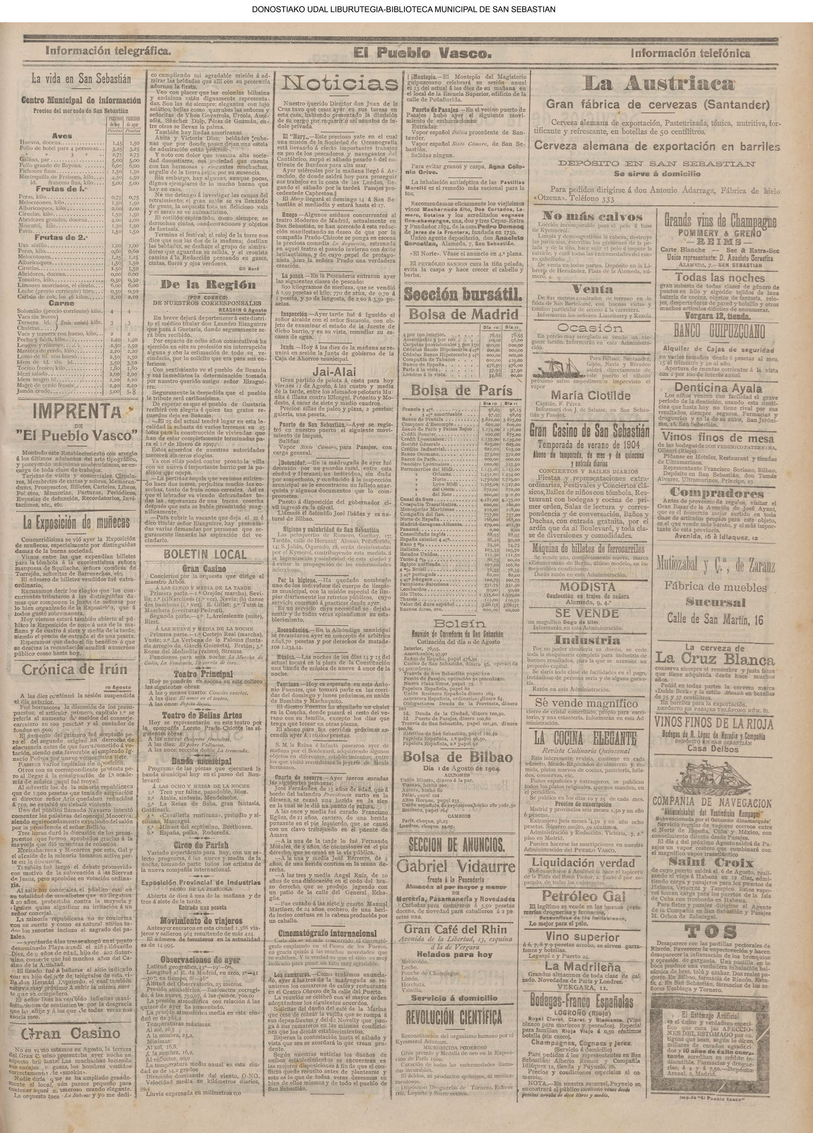 Construcción de un puente.—D. Ramón Cendoya, vecino de Hernani, ha solicitado licencia para construir un puente de fábrica sobre el río Urola, en el término de Cestona, para poner en comunicación la carretera de este pueblo á Azpeitia con la casa de máquinas que en la margen izquierda del río se va á edificar por cuenta de don Gracián Alberdi. (La Construcción moderna. 30/7/1904, n.º 14)(22)