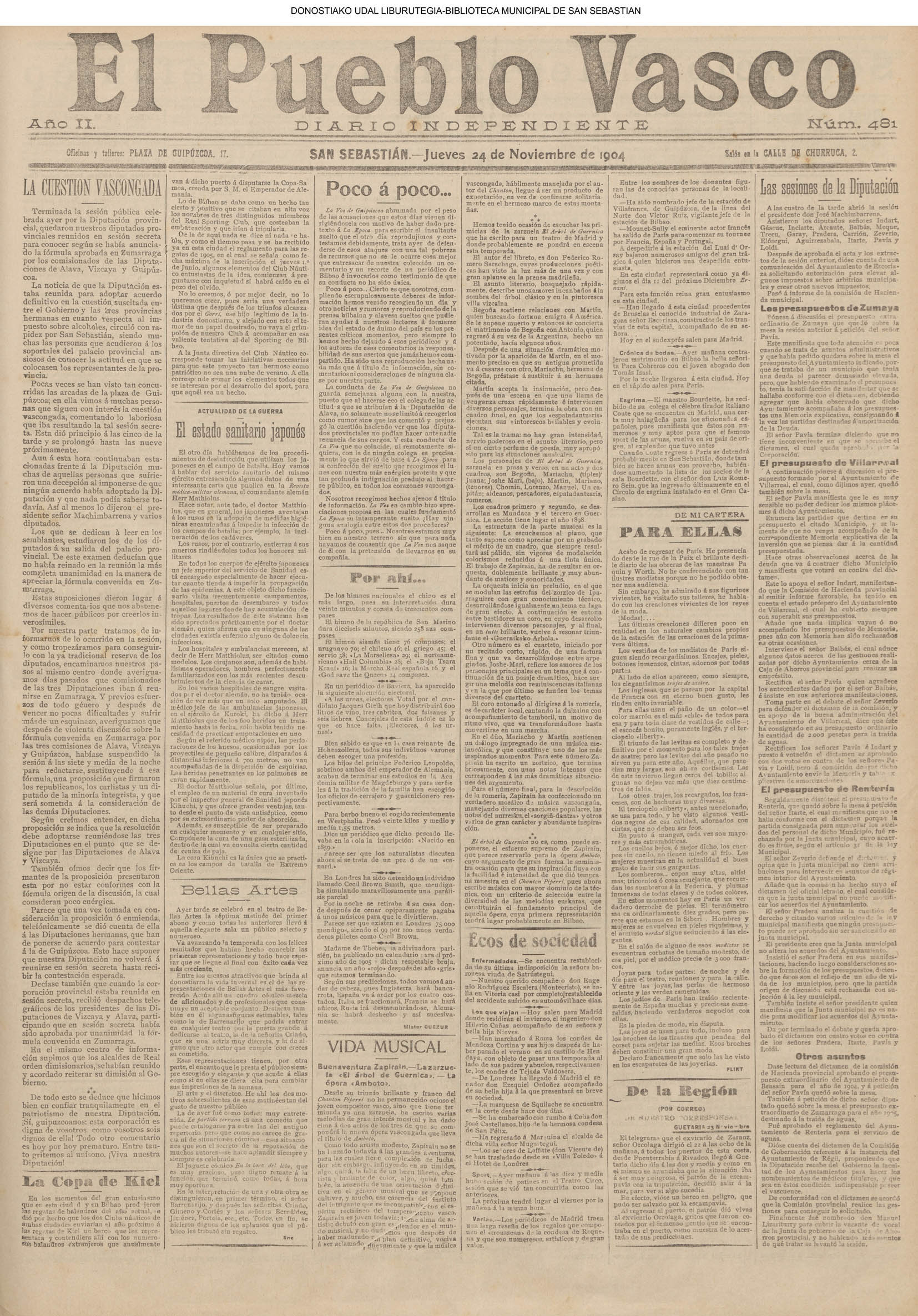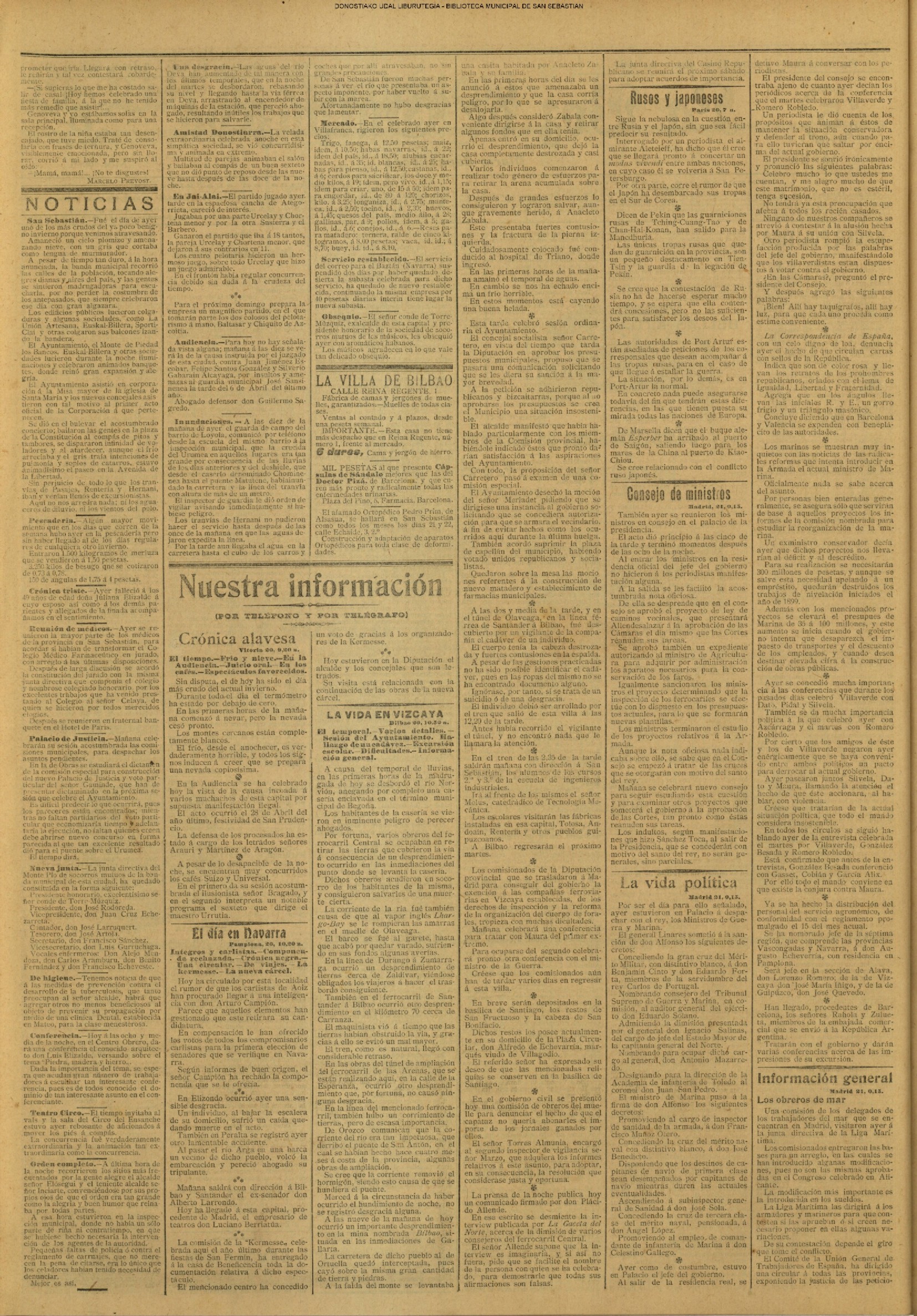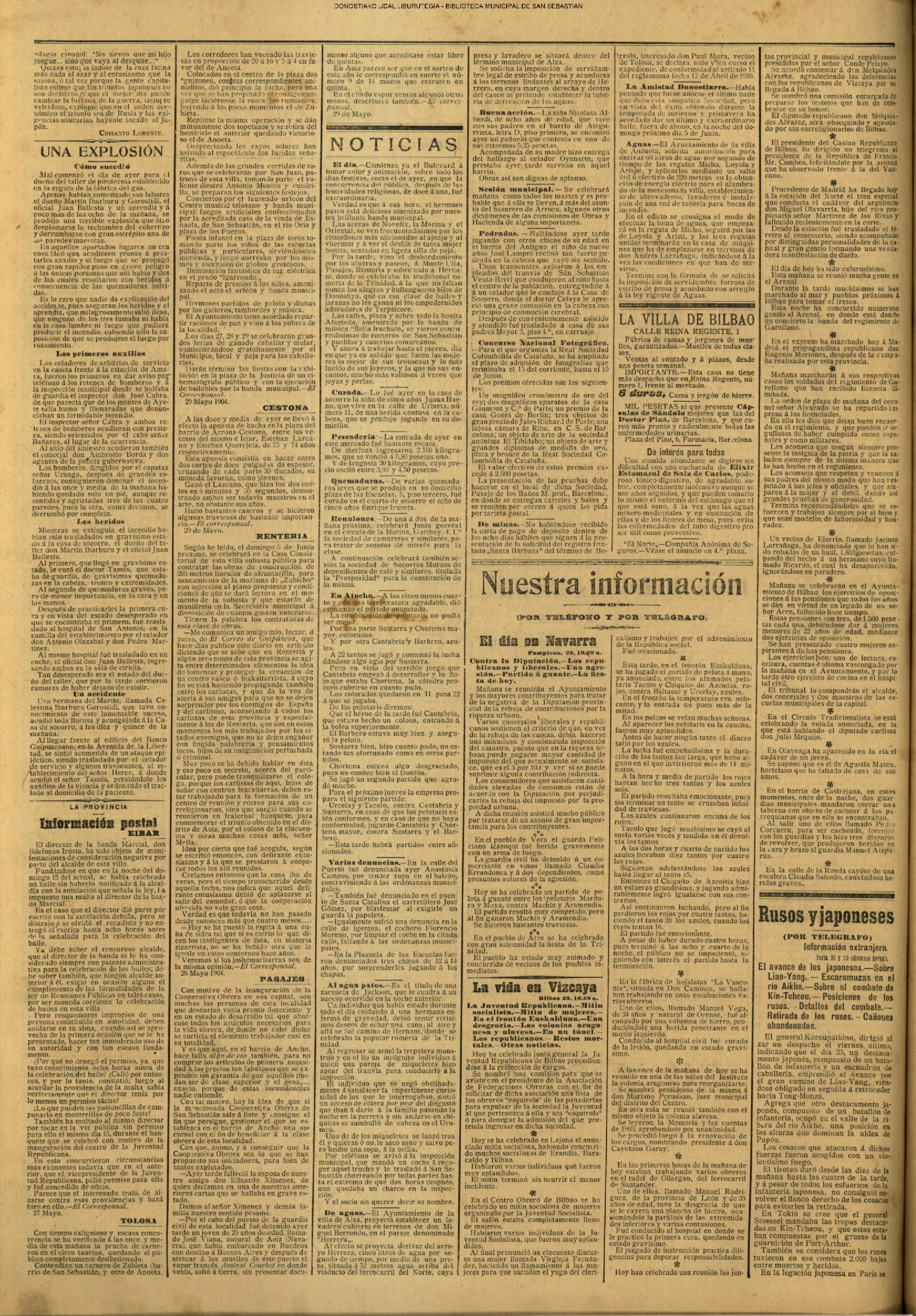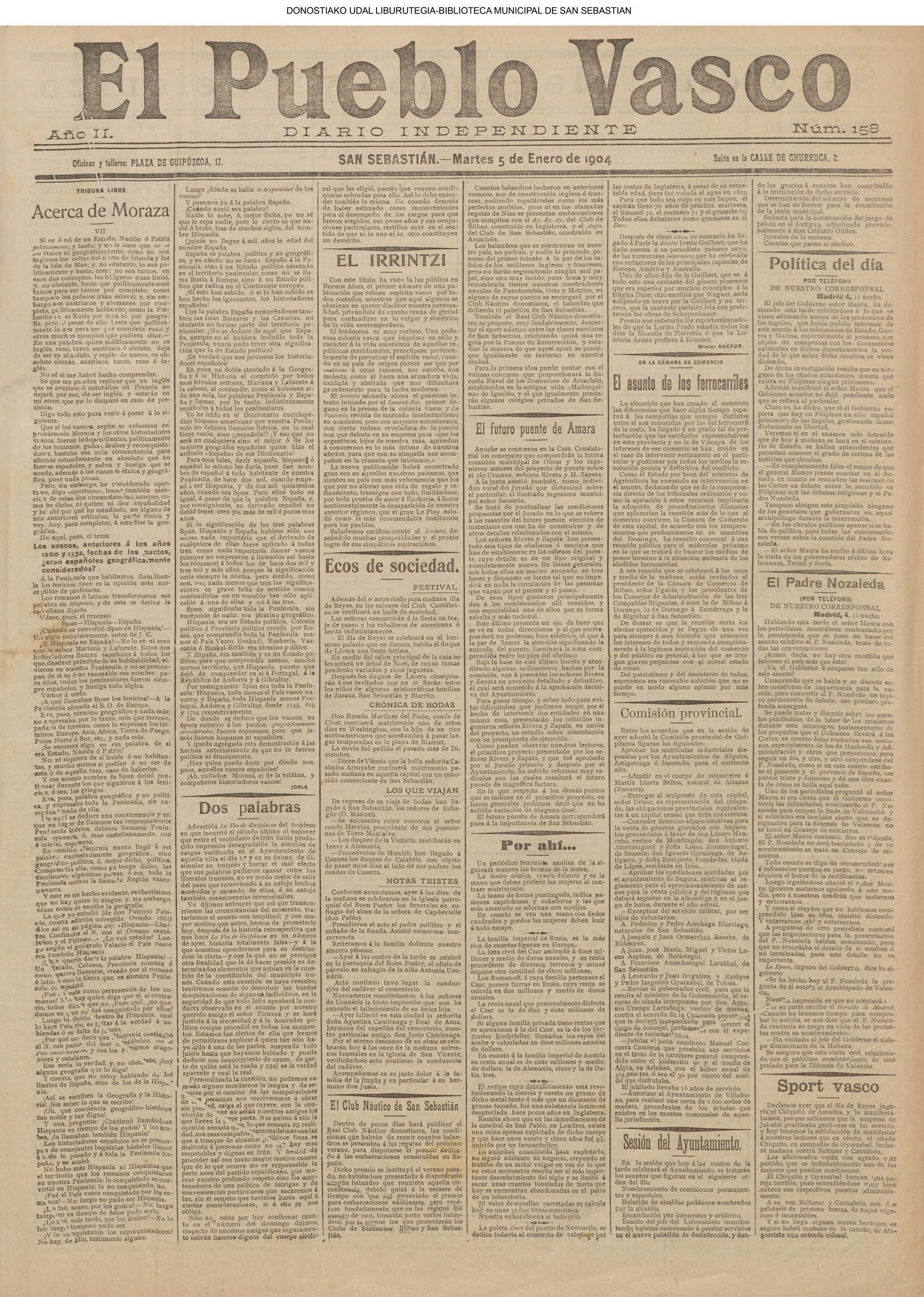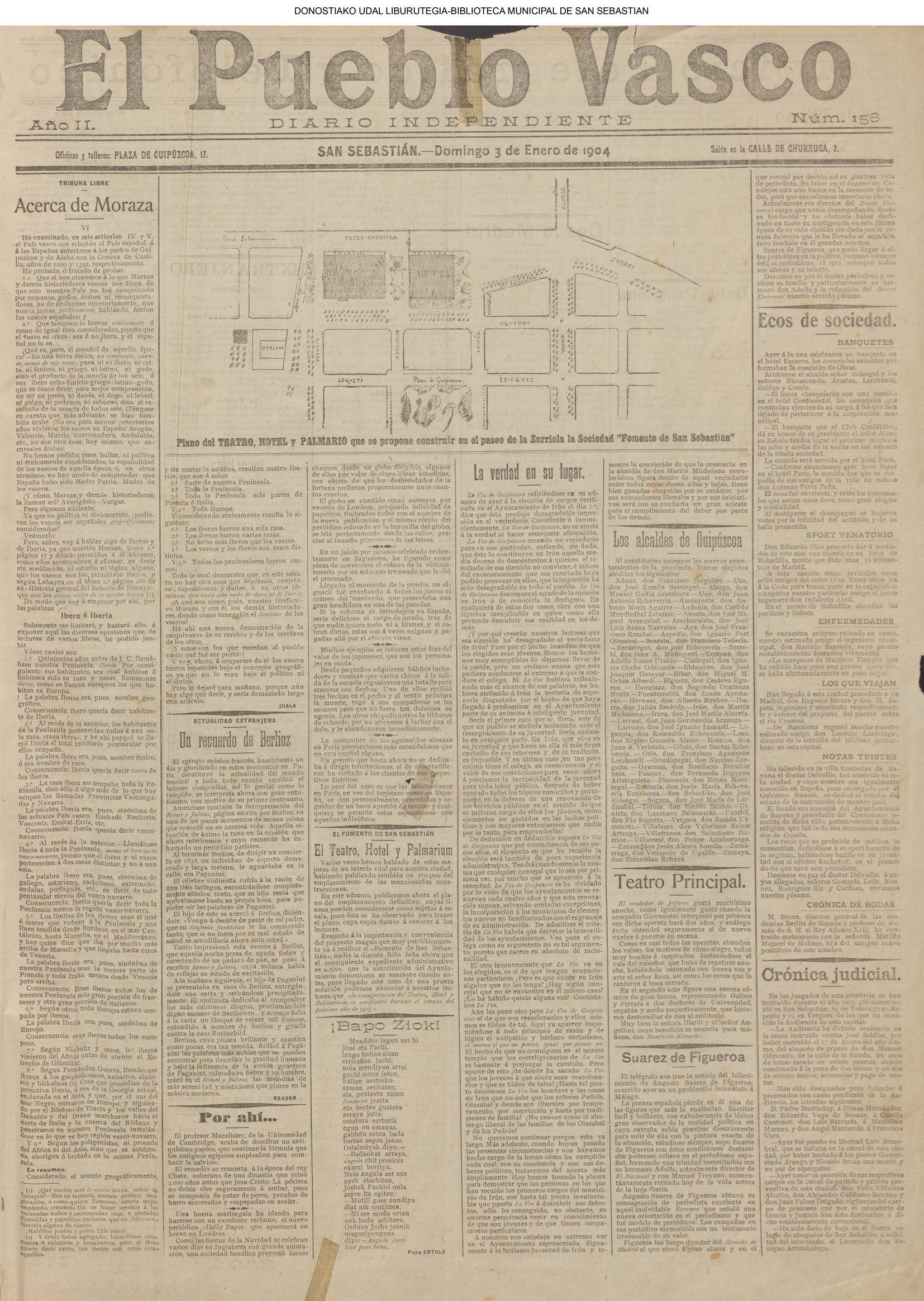 El puente sobre el Urumea en San Sebastián. —Según la prensa de la capital donostiarra, continúan rápidamente las obras del puente que je está construyendo sobre el río Urumea. Han terminado ya los cimientos de tres estribos, habiéndose empezado el cuarto. Se ha empezado también á construir un arco de los tres que ha de llevar. (La Construcción moderna. 30/7/1904, n.º 14)(22)