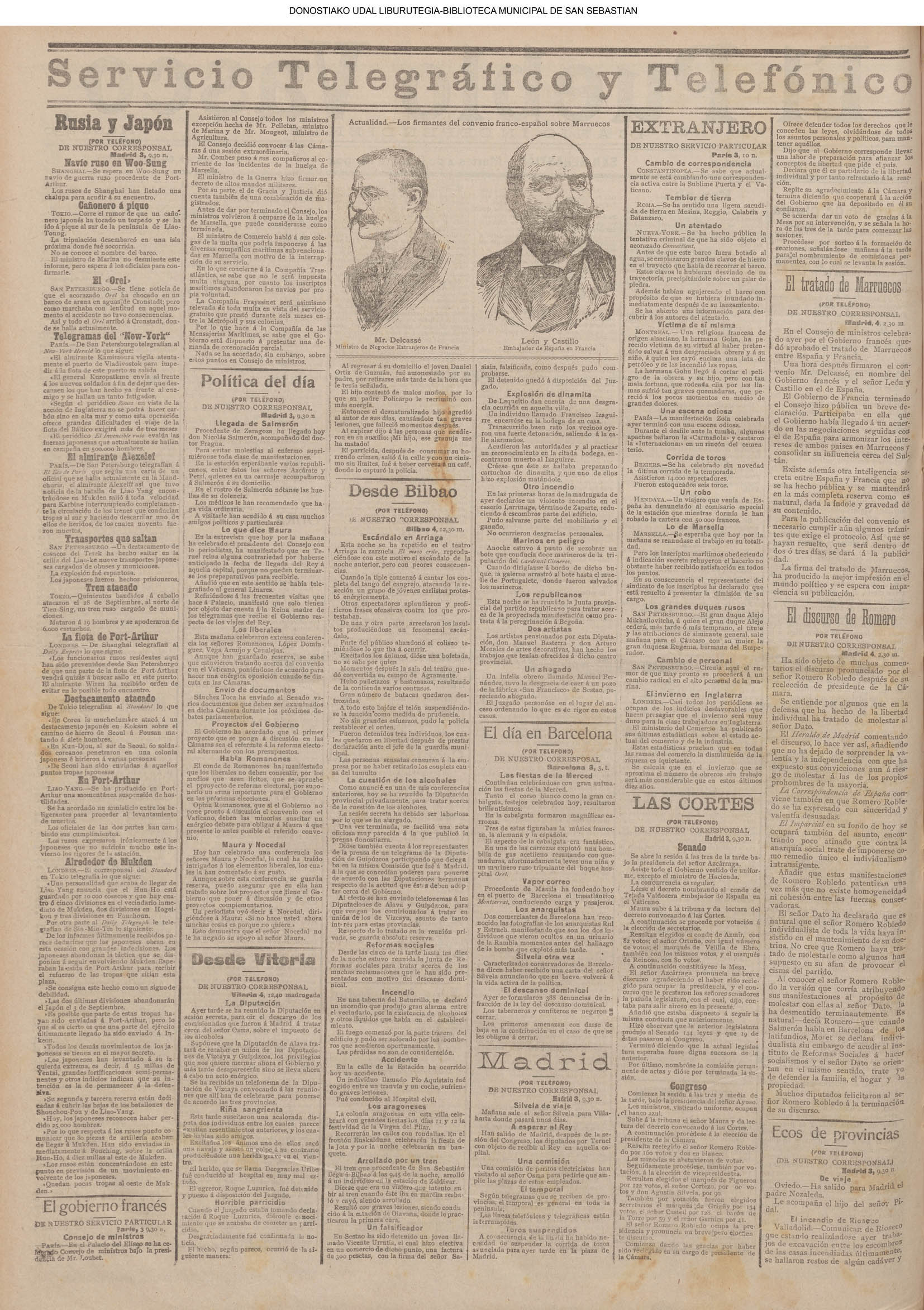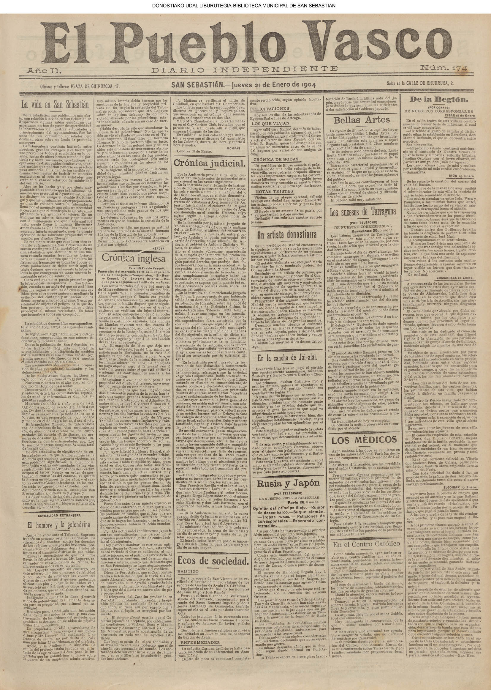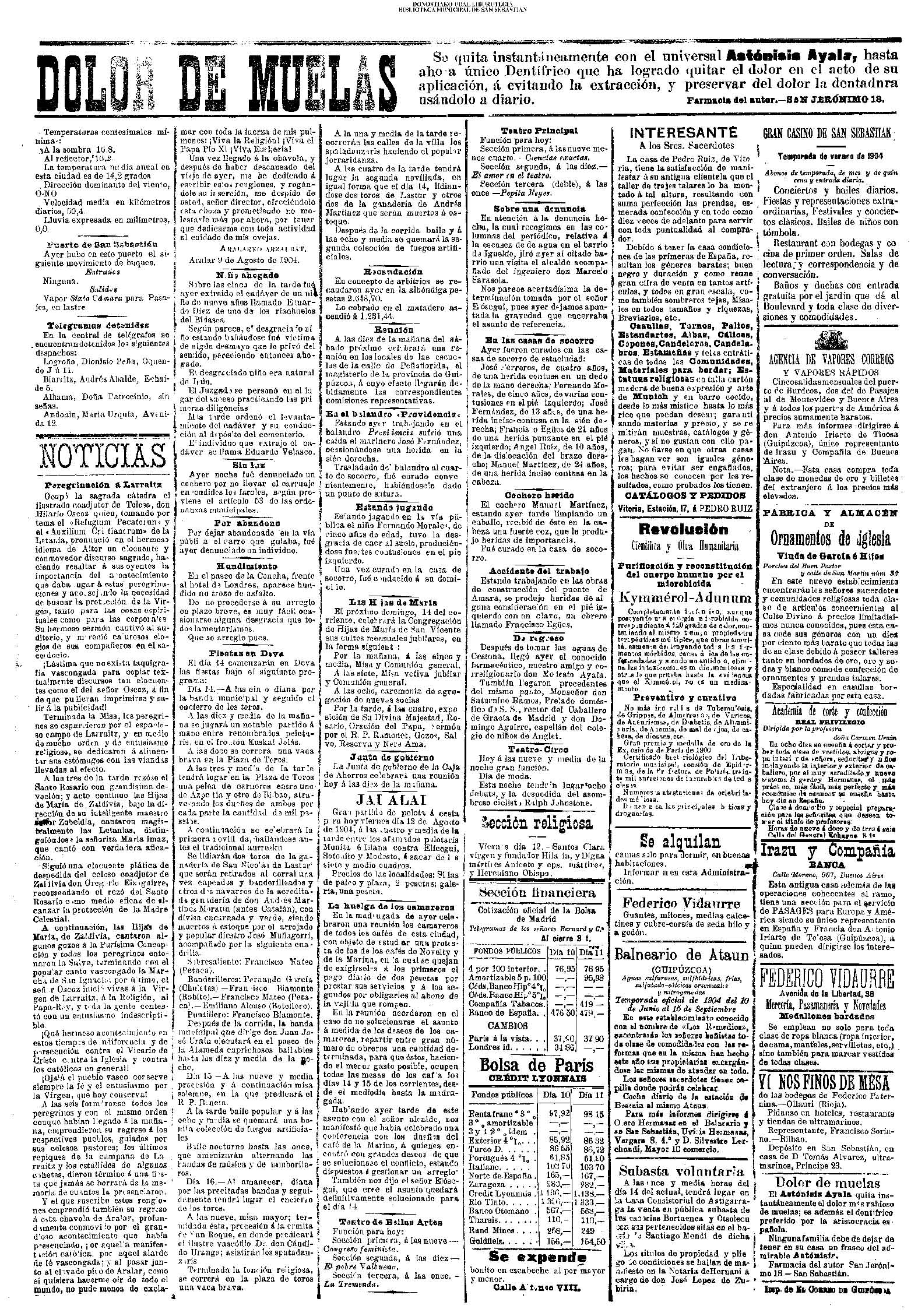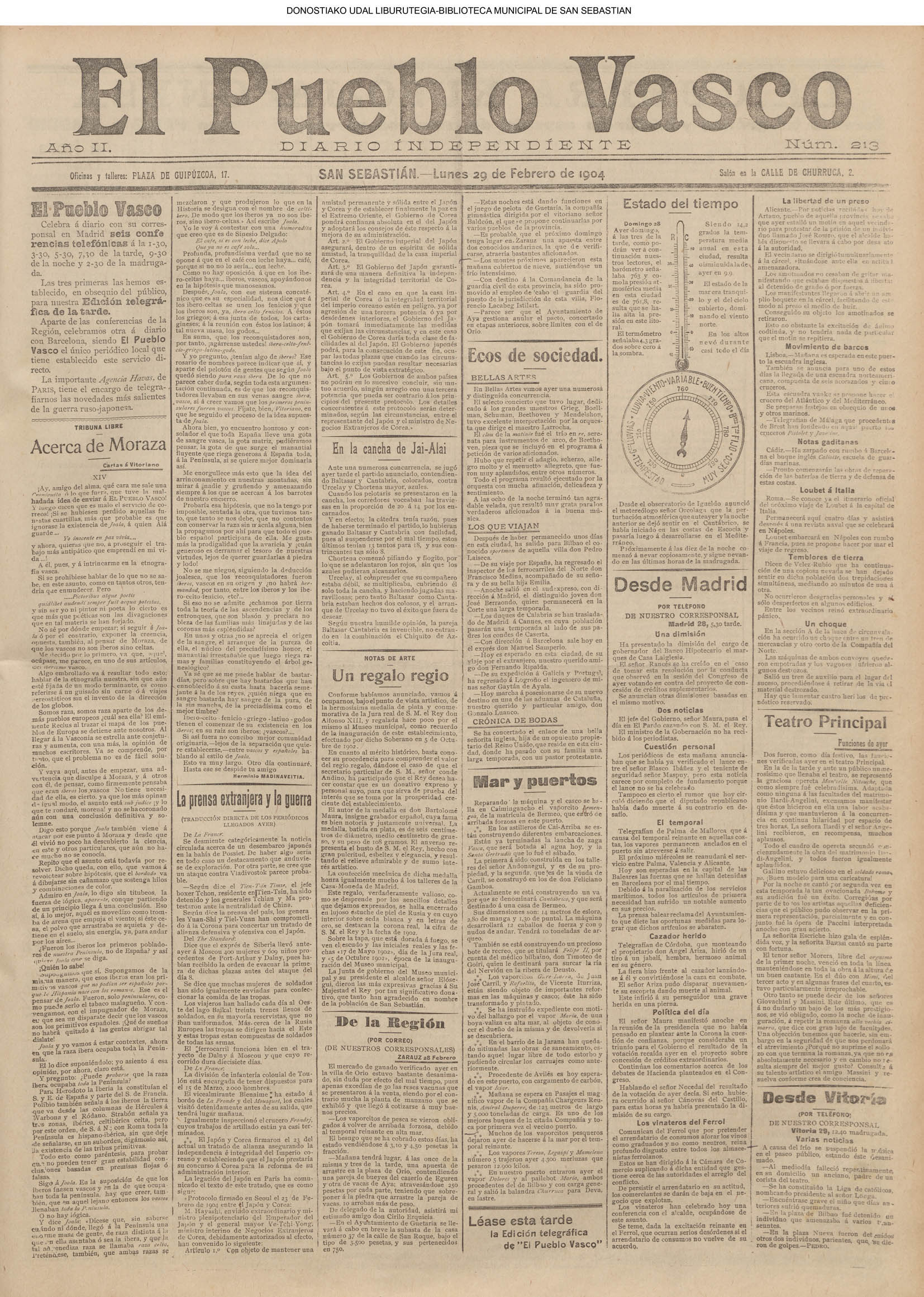 El puente sobre el Urumea en San Sebastián. —Según la prensa de la capital donostiarra, continúan rápidamente las obras del puente que je está construyendo sobre el río Urumea. Han terminado ya los cimientos de tres estribos, habiéndose empezado el cuarto. Se ha empezado también á construir un arco de los tres que ha de llevar. (La Construcción moderna. 30/7/1904, n.º 14)(22)