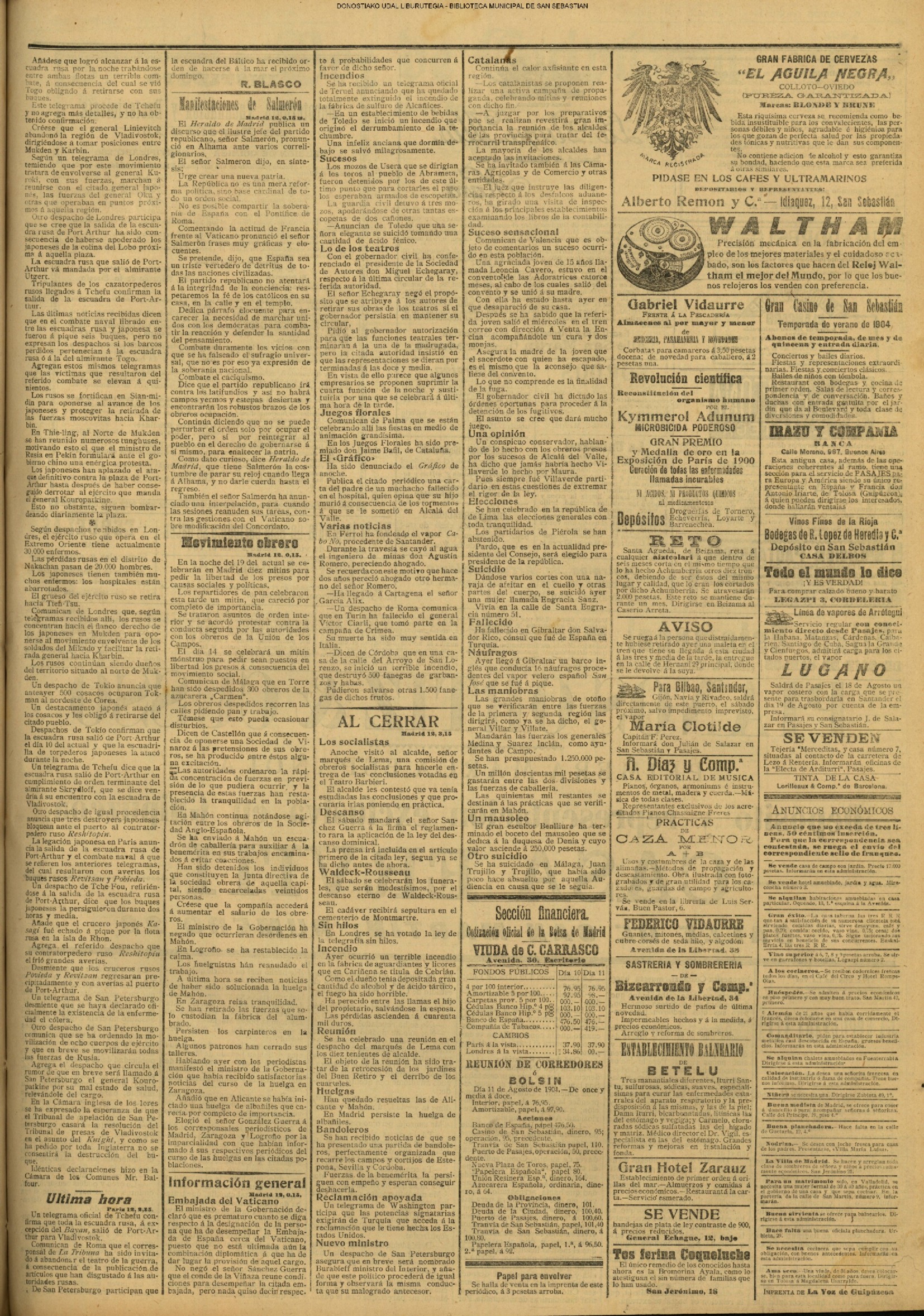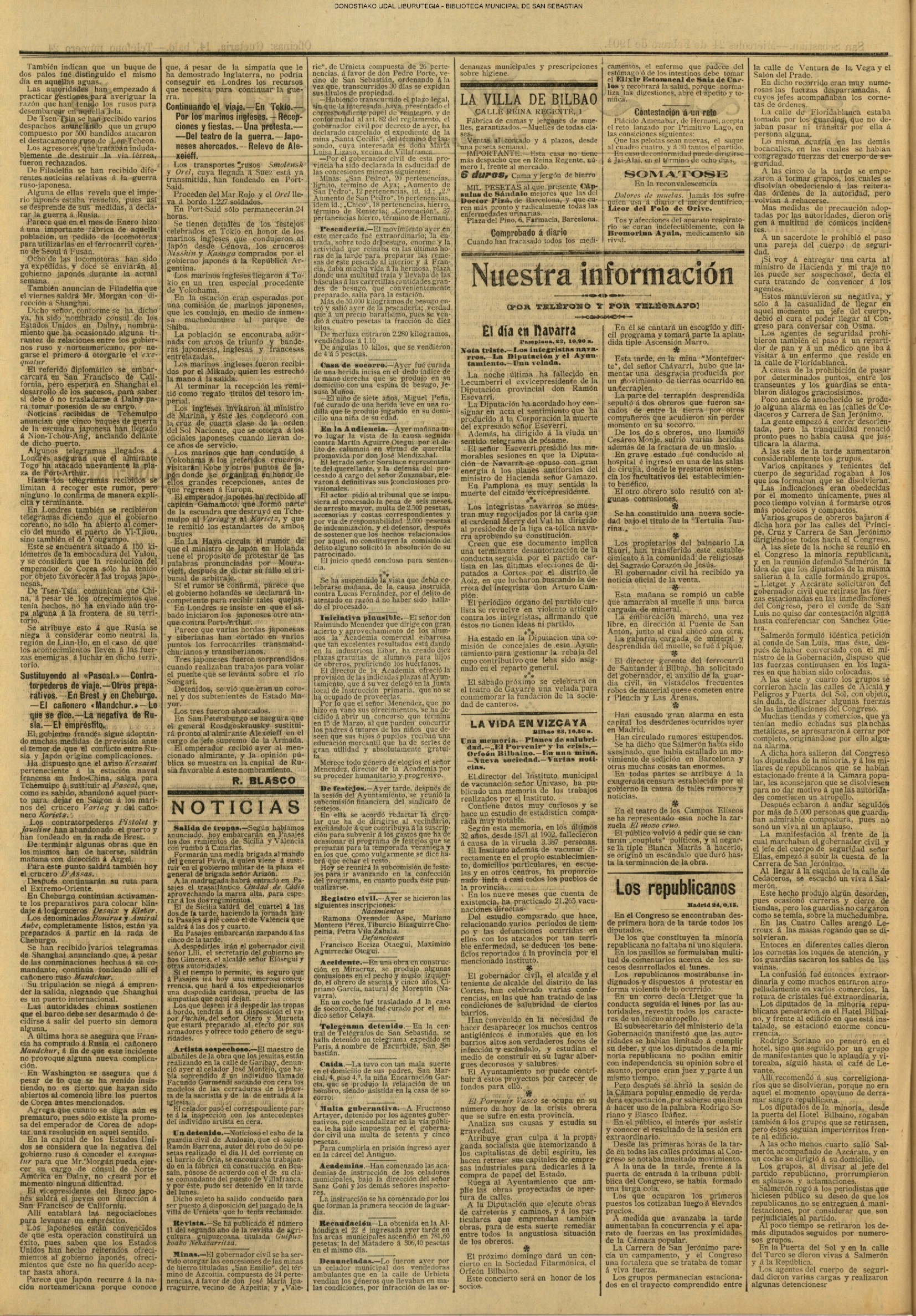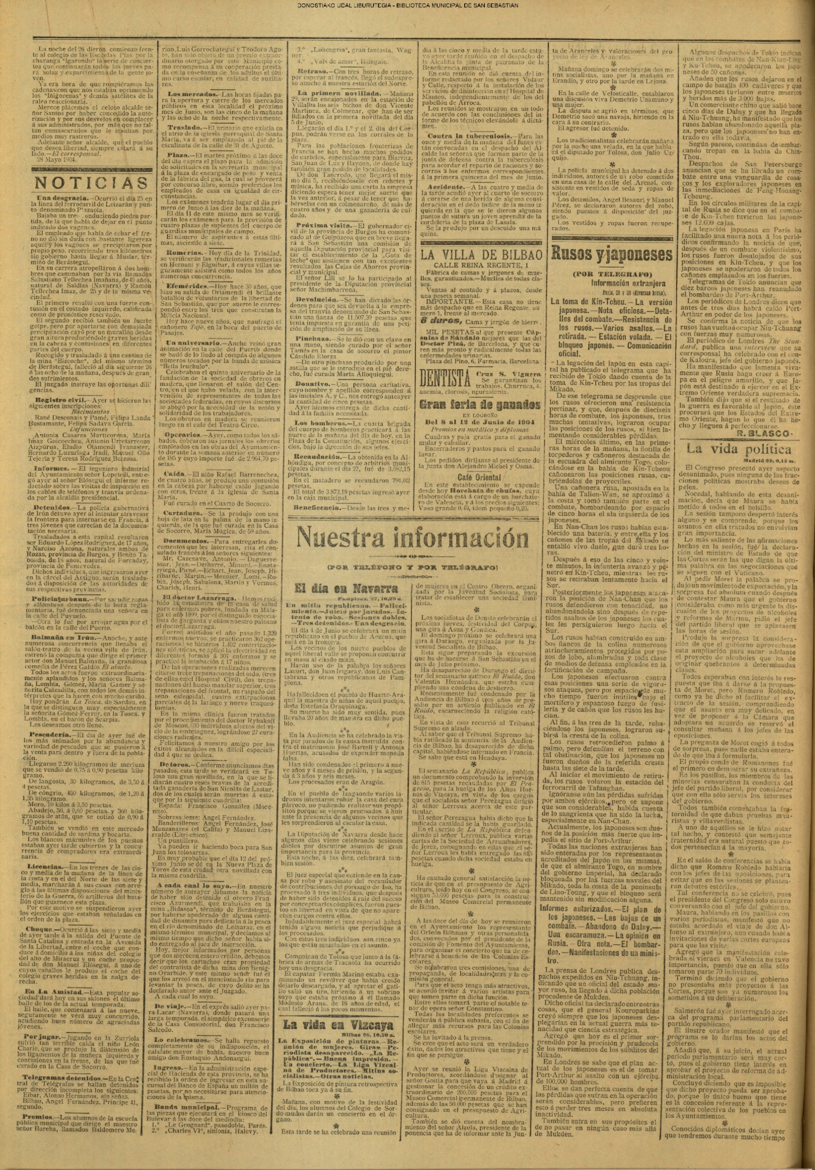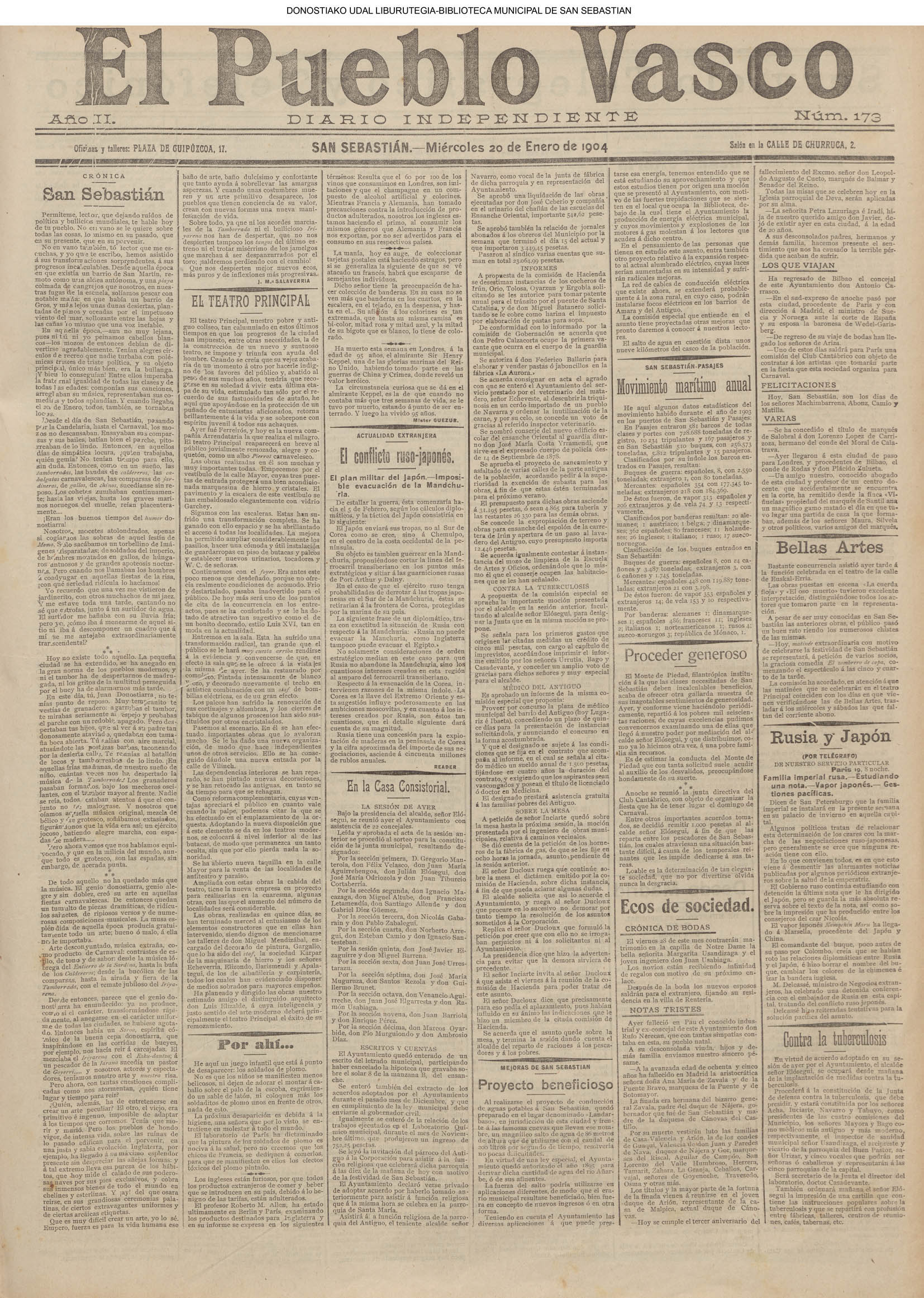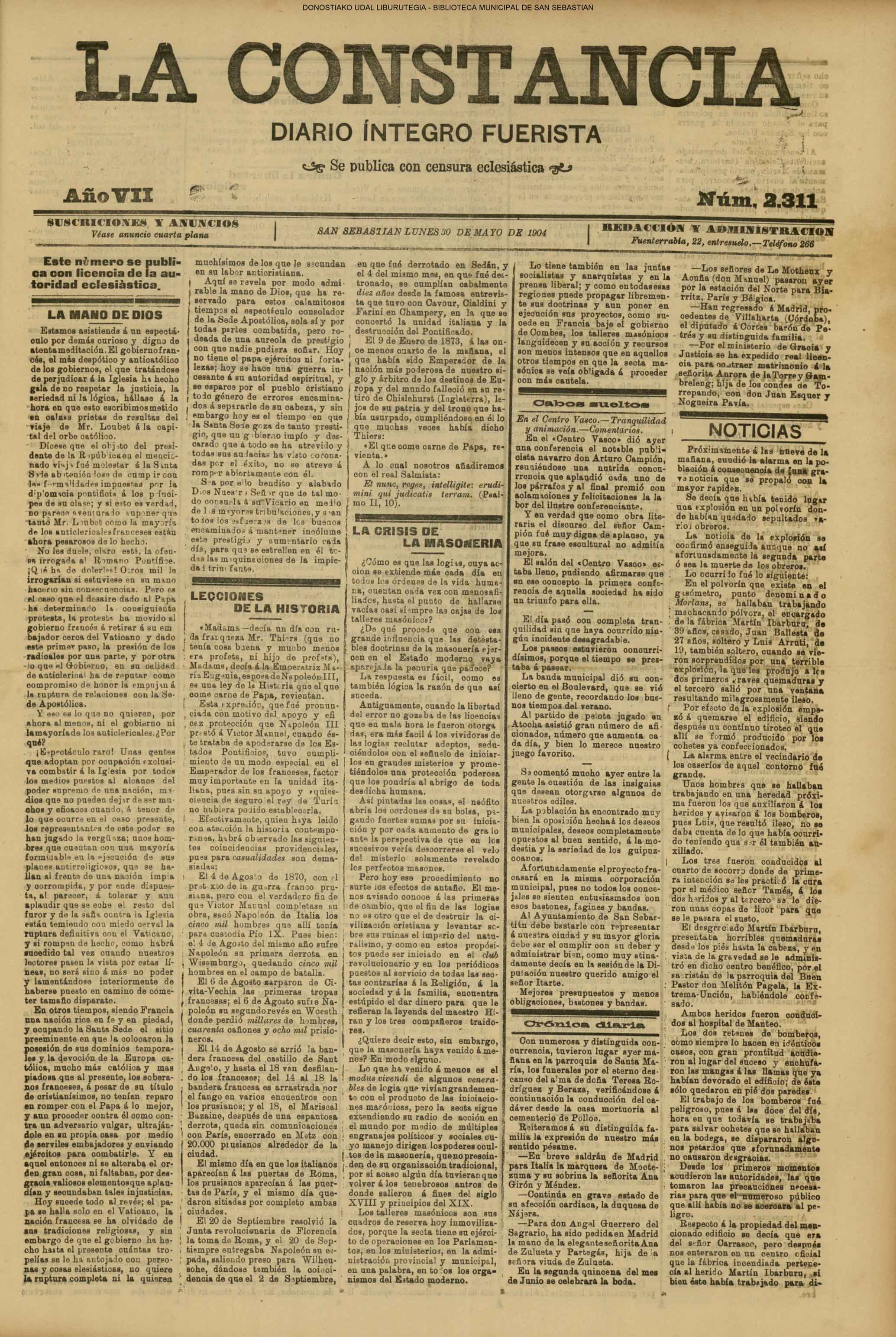 El puente sobre el Urumea en San Sebastián. —Según la prensa de la capital donostiarra, continúan rápidamente las obras del puente que je está construyendo sobre el río Urumea. Han terminado ya los cimientos de tres estribos, habiéndose empezado el cuarto. Se ha empezado también á construir un arco de los tres que ha de llevar. (La Construcción moderna. 30/7/1904, n.º 14)(22)