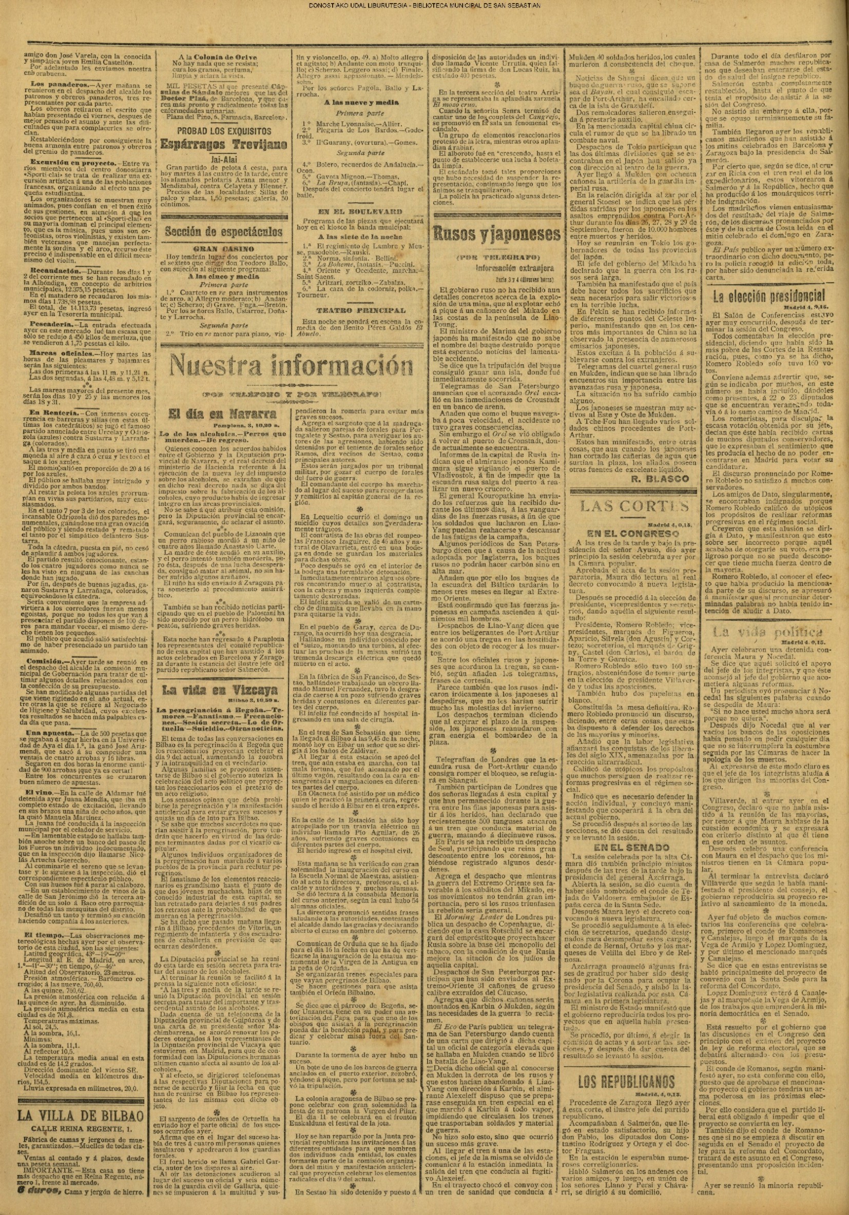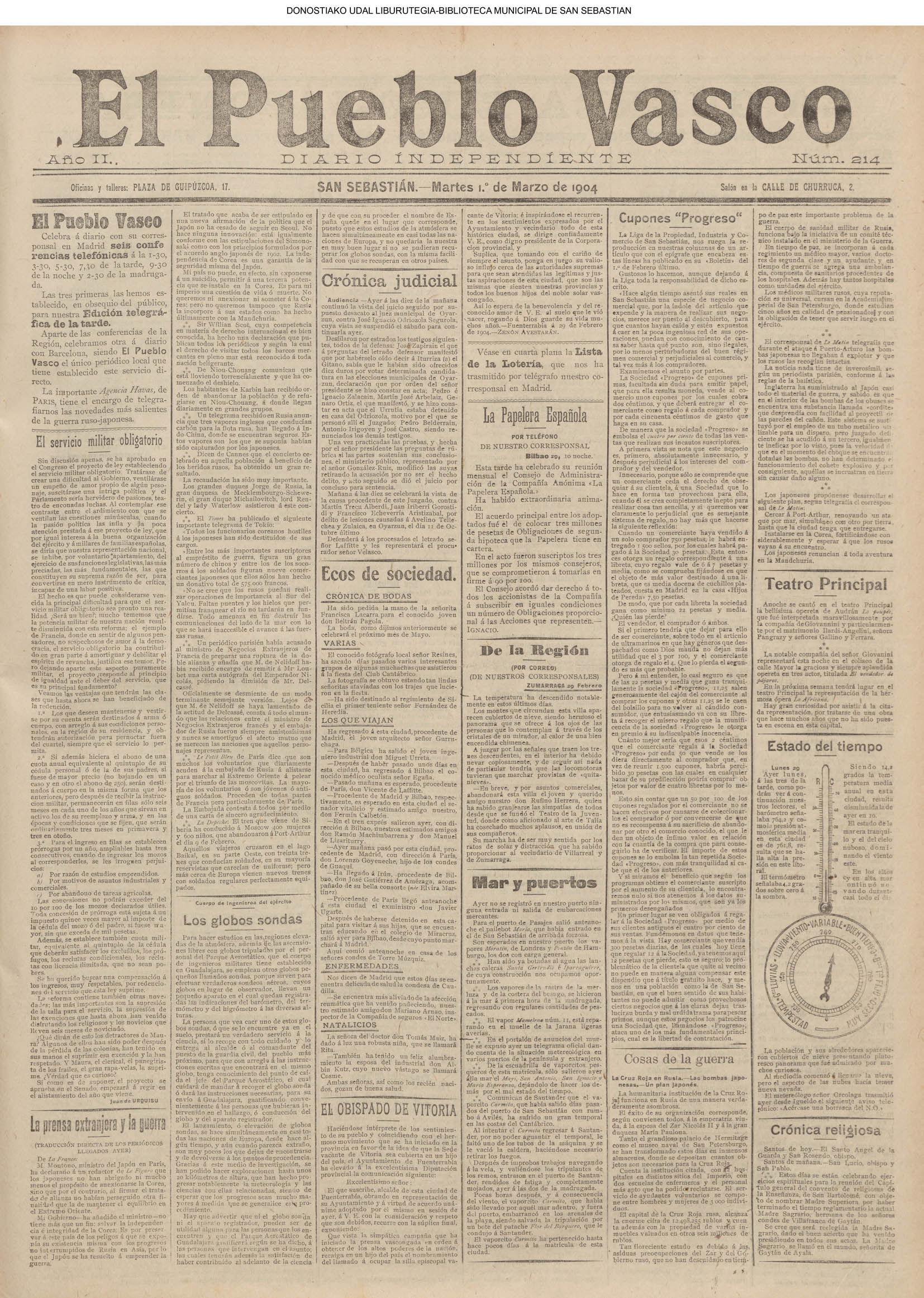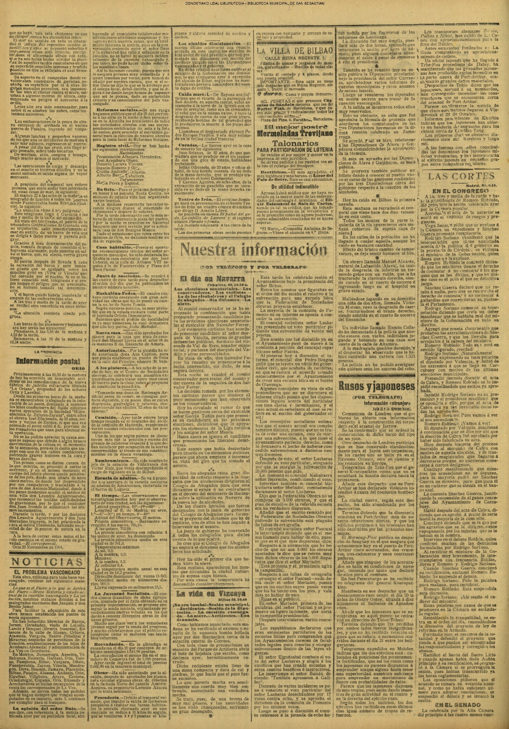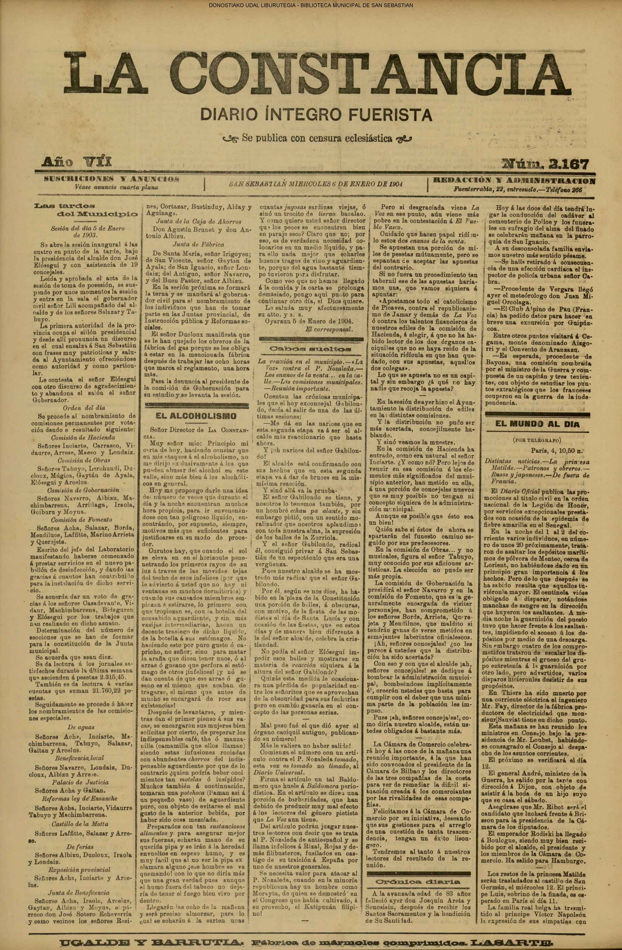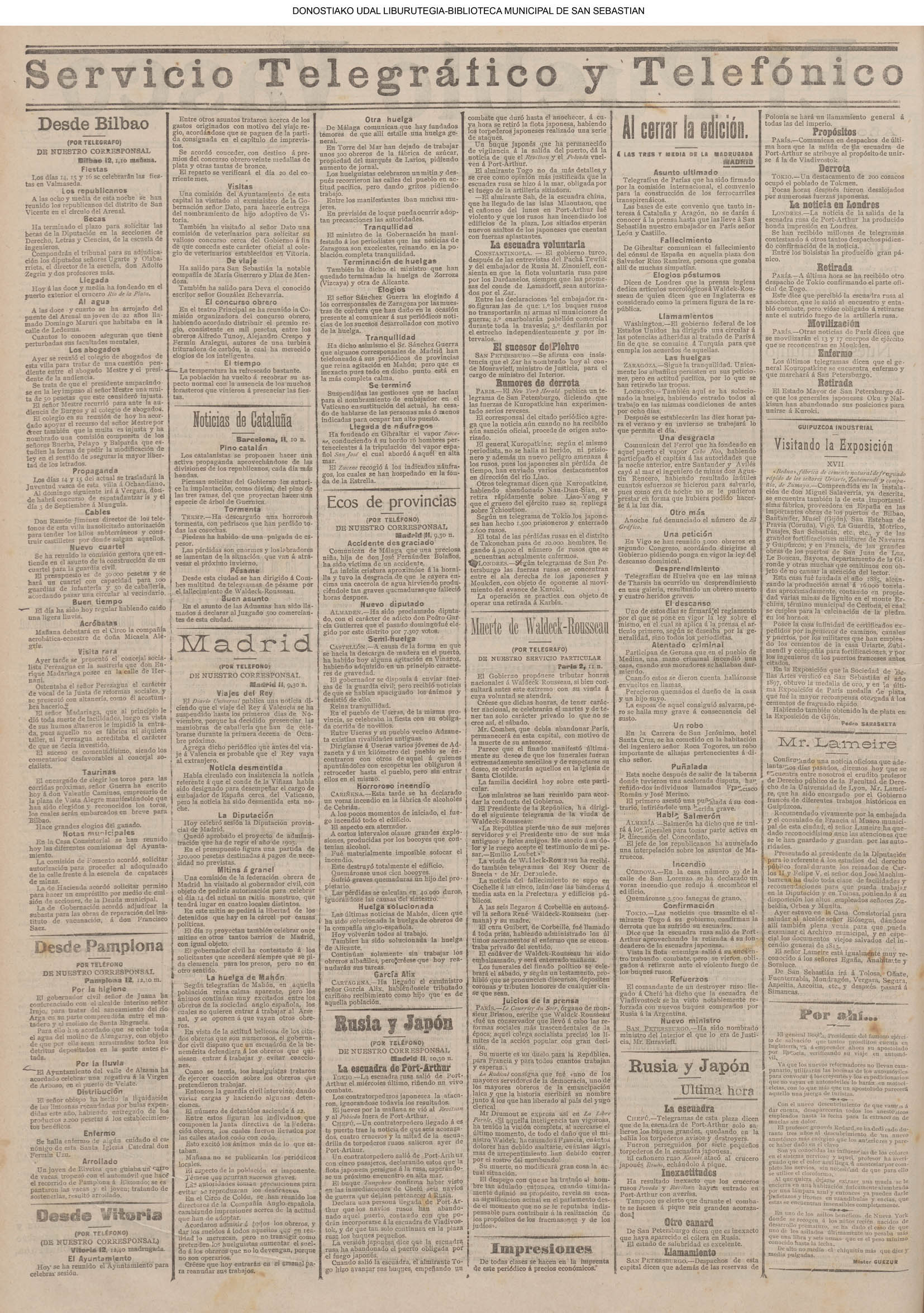 El puente sobre el Urumea en San Sebastián. —Según la prensa de la capital donostiarra, continúan rápidamente las obras del puente que je está construyendo sobre el río Urumea. Han terminado ya los cimientos de tres estribos, habiéndose empezado el cuarto. Se ha empezado también á construir un arco de los tres que ha de llevar. (La Construcción moderna. 30/7/1904, n.º 14)(22)