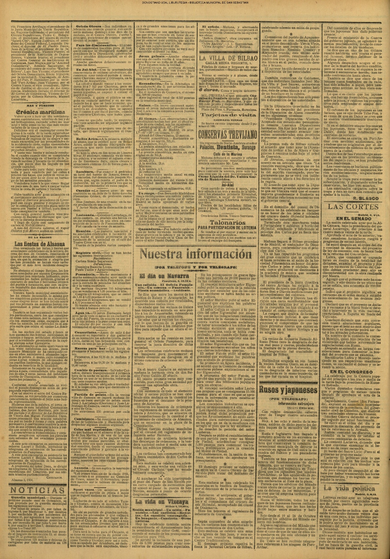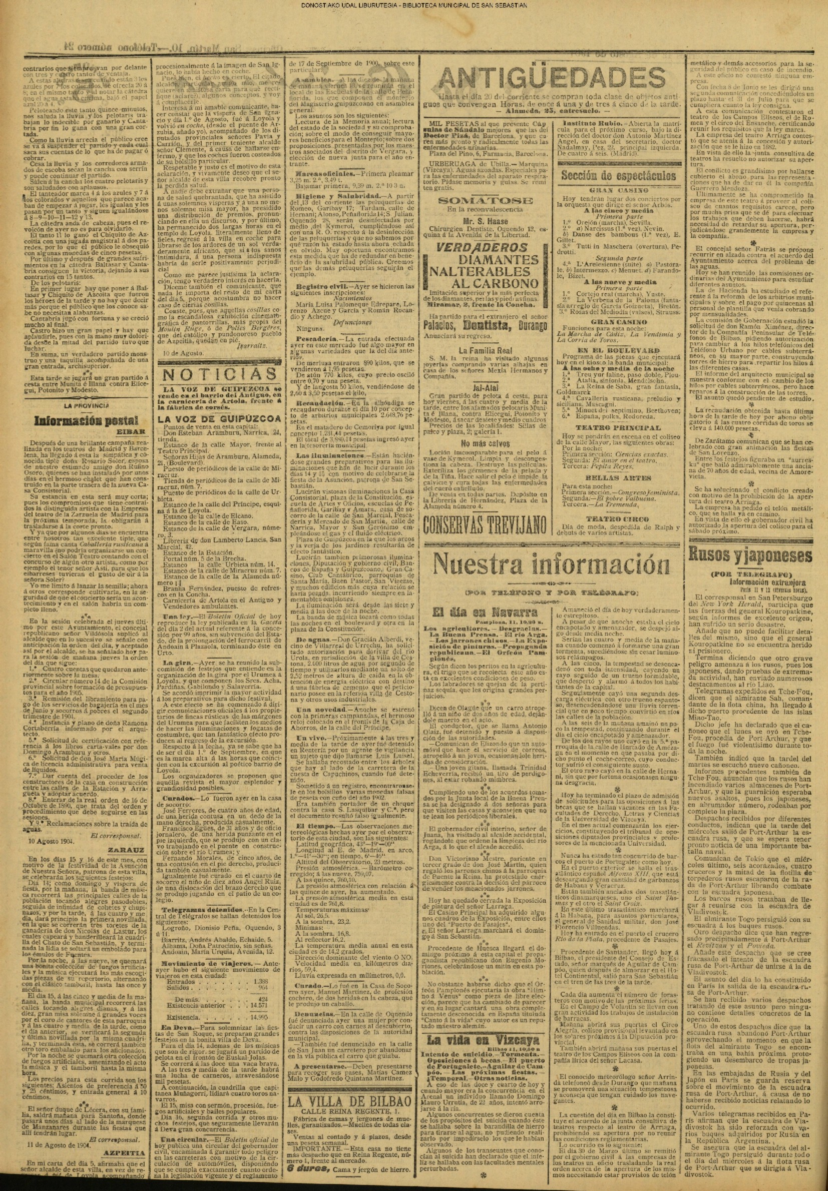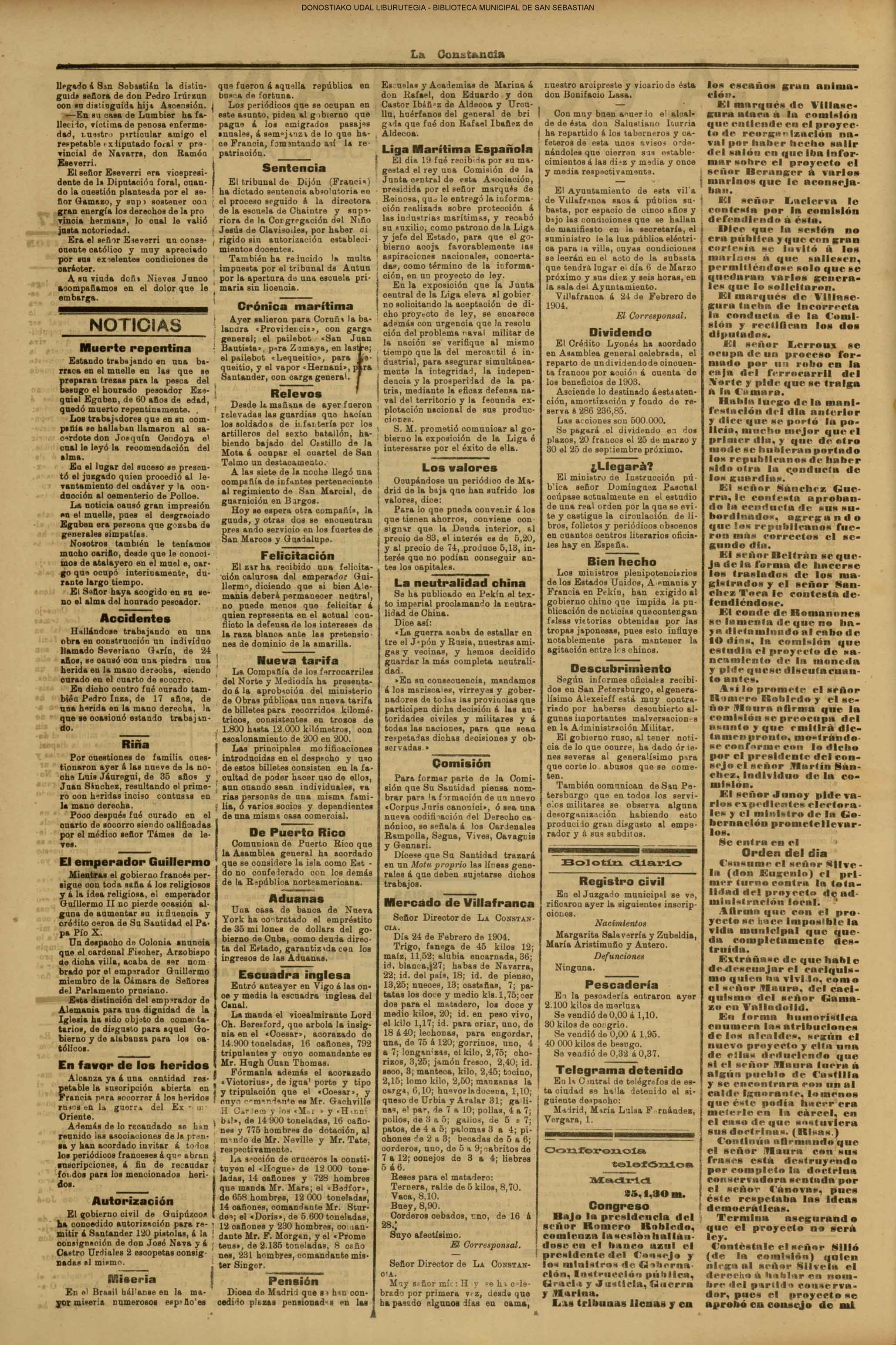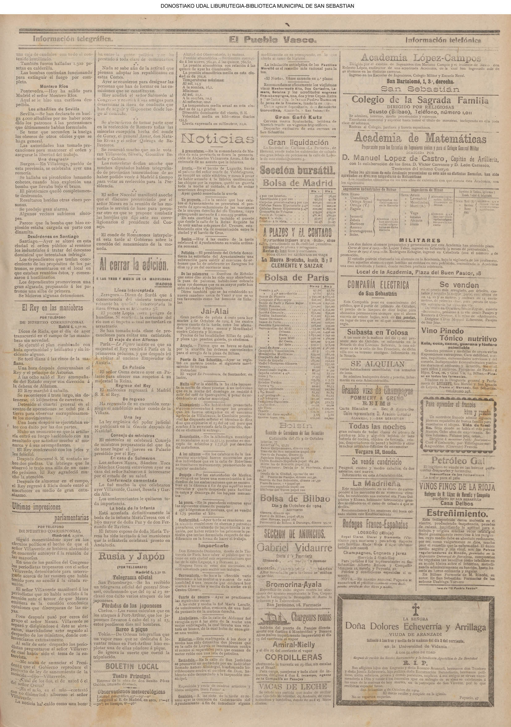 El puente sobre el Urumea en San Sebastián. —Según la prensa de la capital donostiarra, continúan rápidamente las obras del puente que je está construyendo sobre el río Urumea. Han terminado ya los cimientos de tres estribos, habiéndose empezado el cuarto. Se ha empezado también á construir un arco de los tres que ha de llevar. (La Construcción moderna. 30/7/1904, n.º 14)(22)