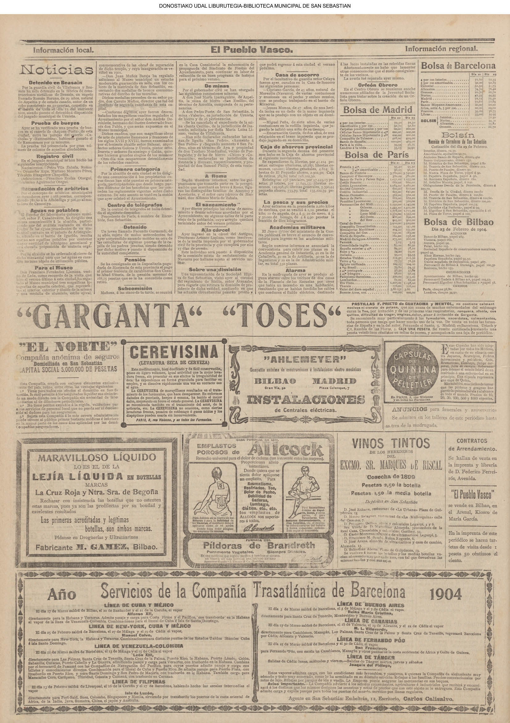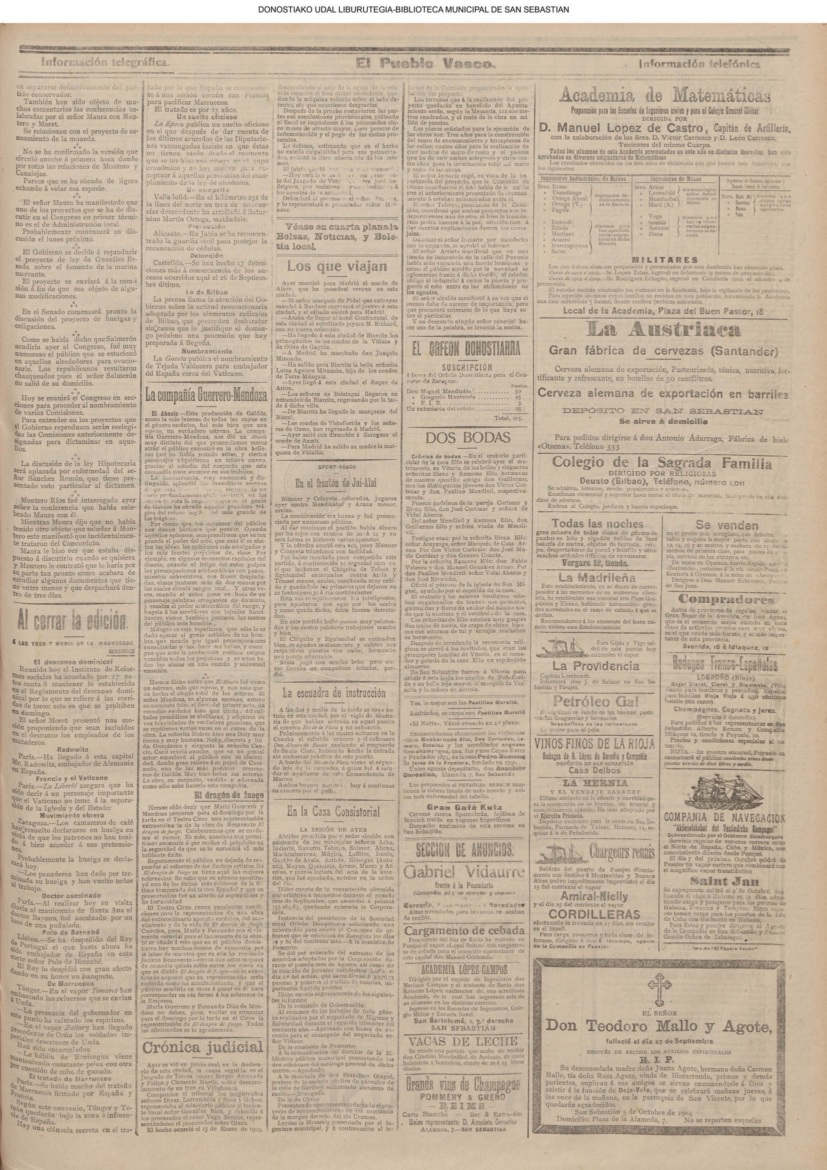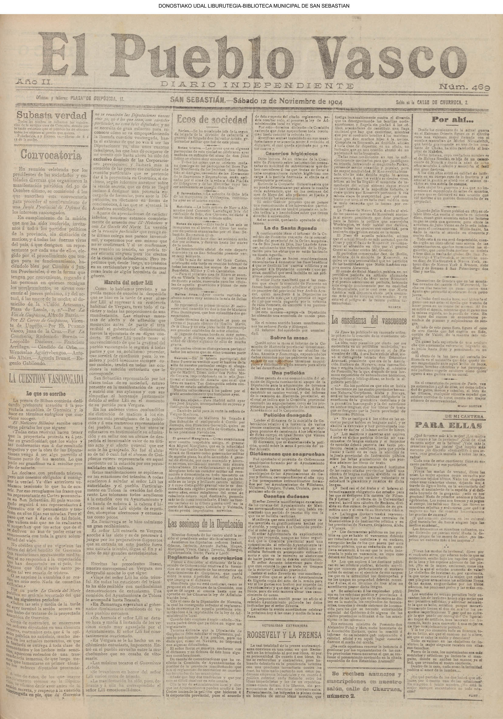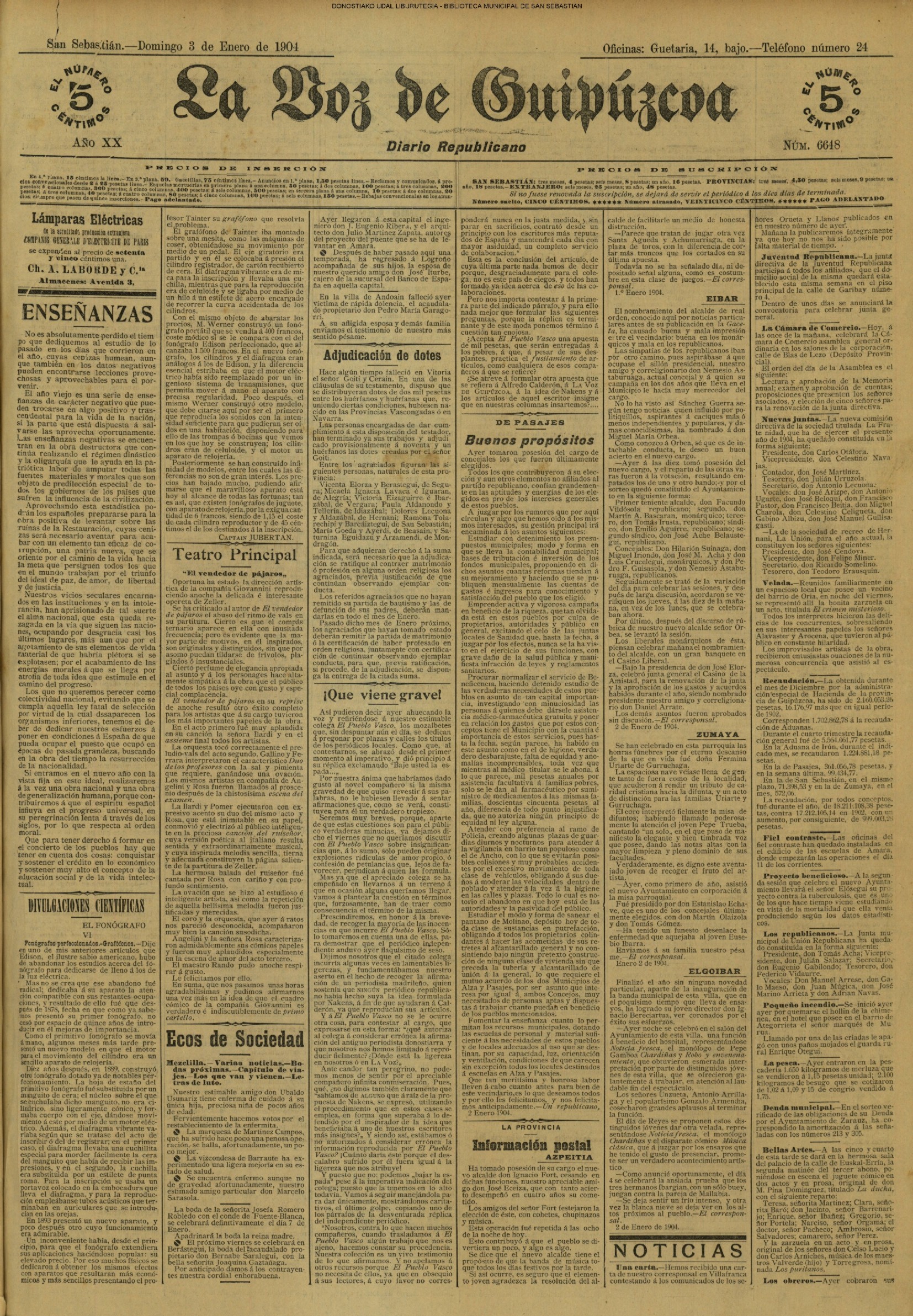 Subastas Guipúzcoa (Vergara).—El 6 de Julio, á las once horas de la mañana.—Obras de un edificio con destino á Sanatorio.—Presupuesto, 14.561,72 pesetas.—Fianza, 728 pesetas. La subasta s •: celebrará en el Ayuntamiento de Vergara, en cuya Secretaría se hallan de manifiesto las condiciones. Las proposiciones se presentarán en pliegos cerrados. (La Construcción moderna. 30/6/1904, n.º 12)(27)