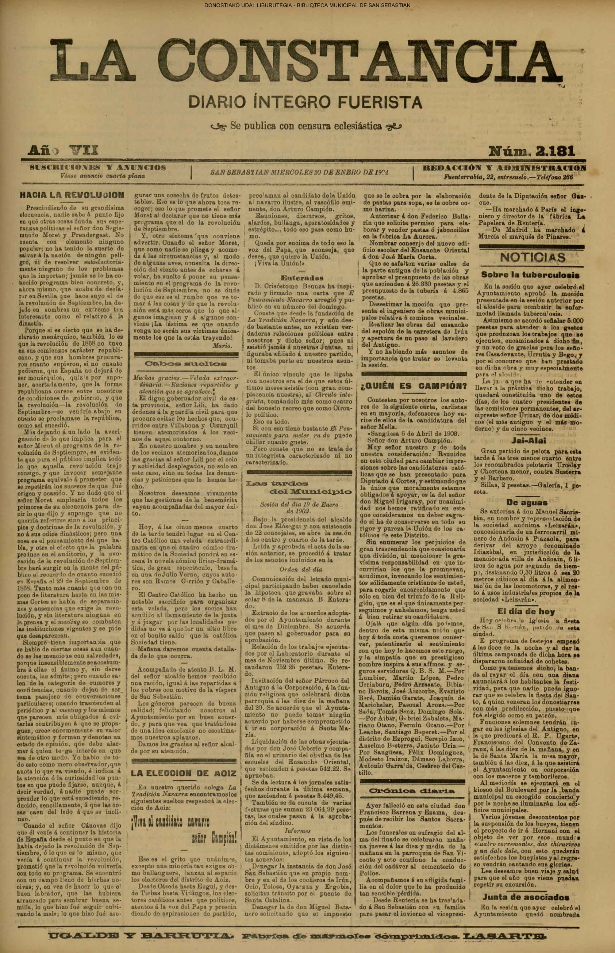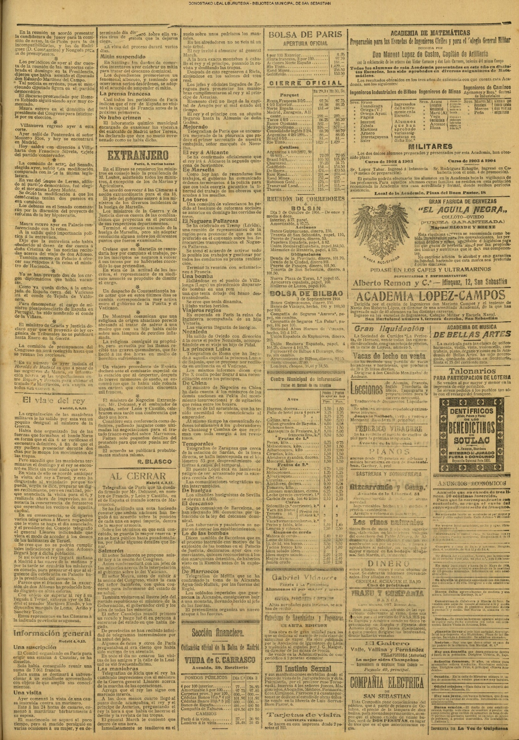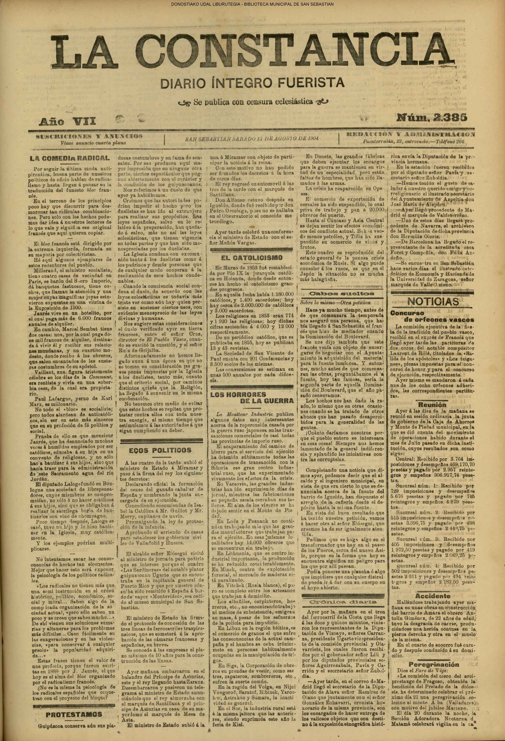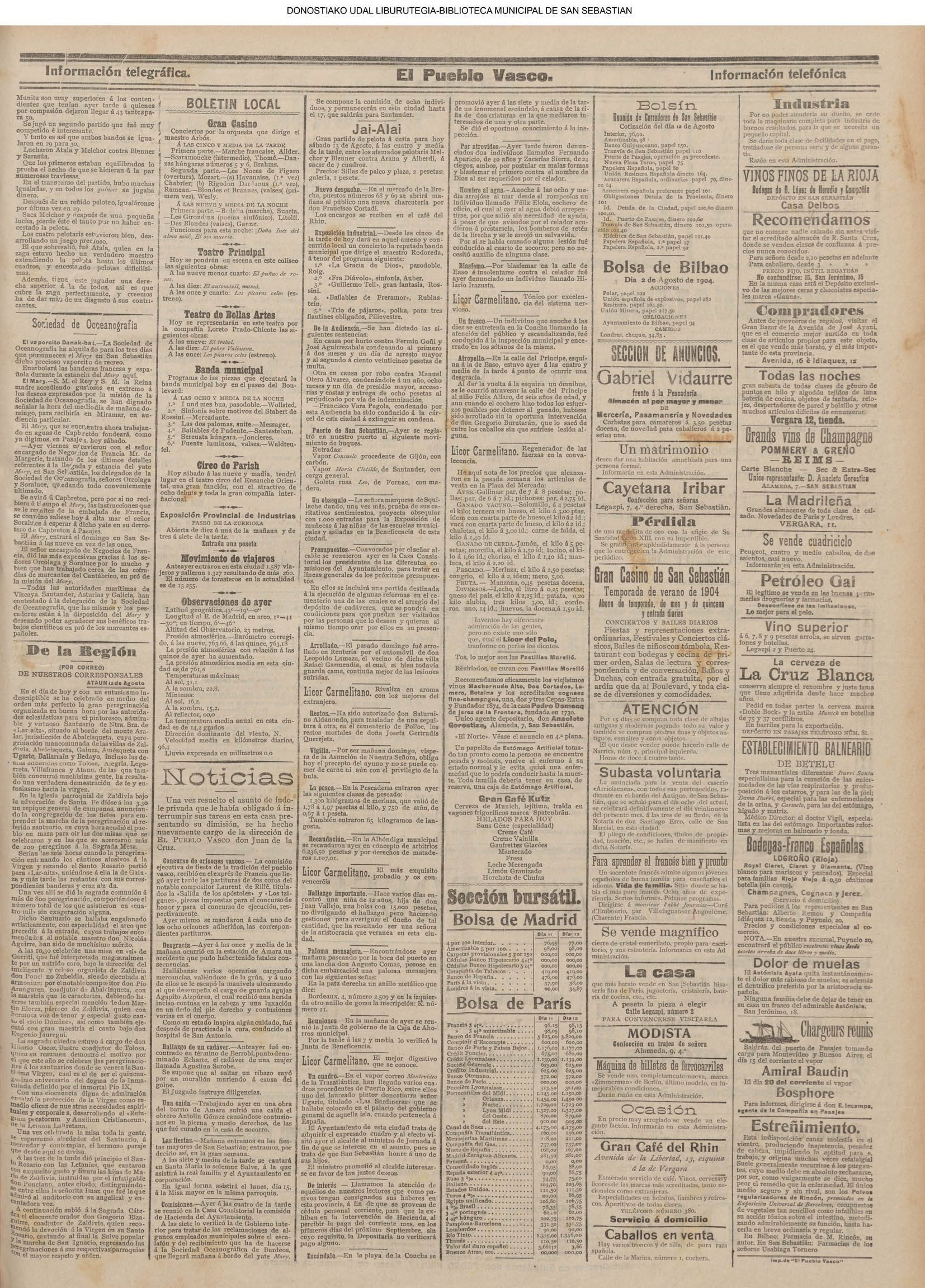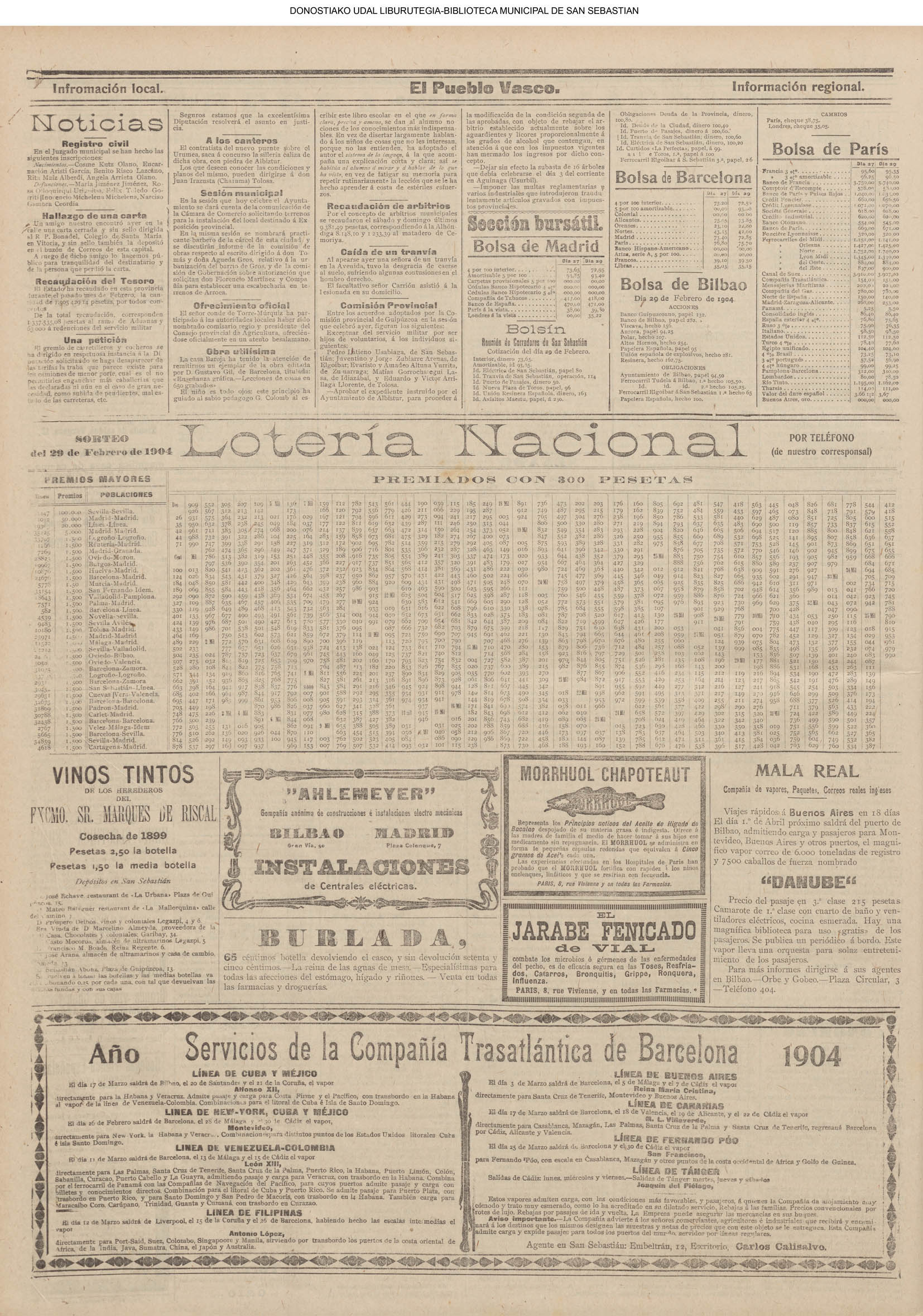 Subastas Guipúzcoa (Vergara).—El 6 de Julio, á las once horas de la mañana.—Obras de un edificio con destino á Sanatorio.—Presupuesto, 14.561,72 pesetas.—Fianza, 728 pesetas. La subasta s •: celebrará en el Ayuntamiento de Vergara, en cuya Secretaría se hallan de manifiesto las condiciones. Las proposiciones se presentarán en pliegos cerrados. (La Construcción moderna. 30/6/1904, n.º 12)(27)