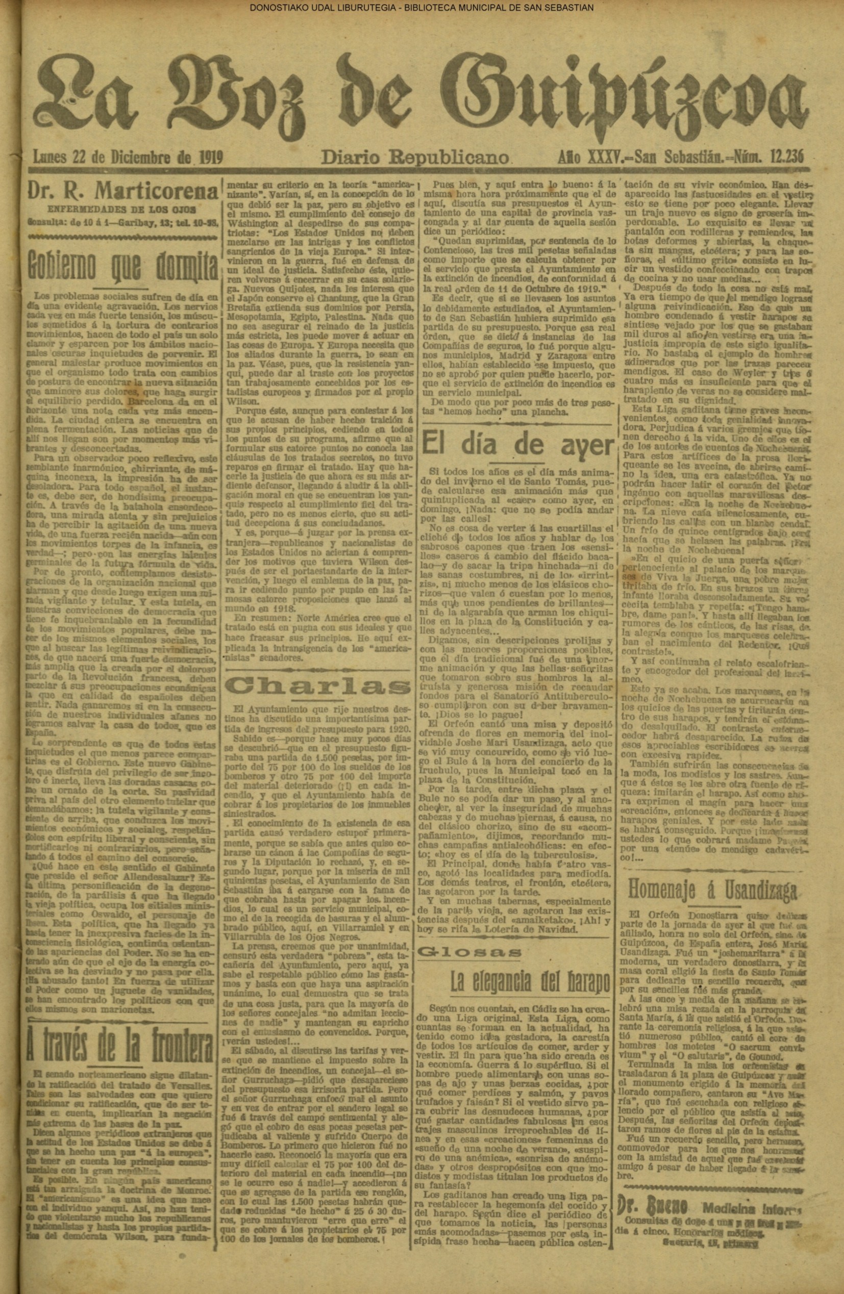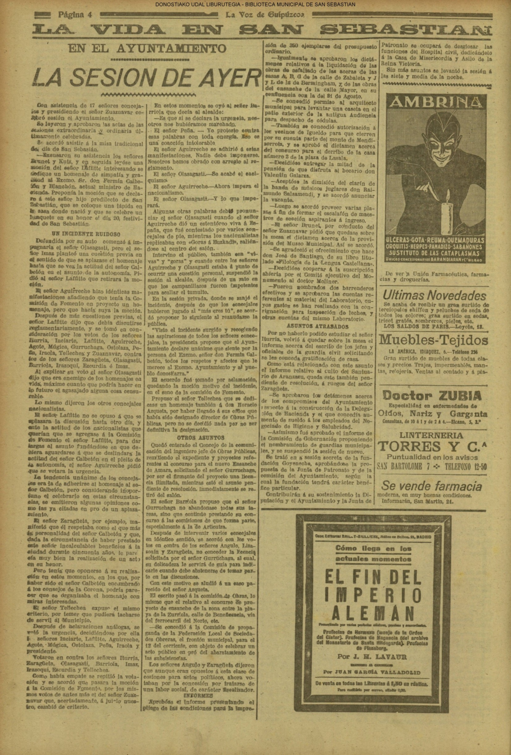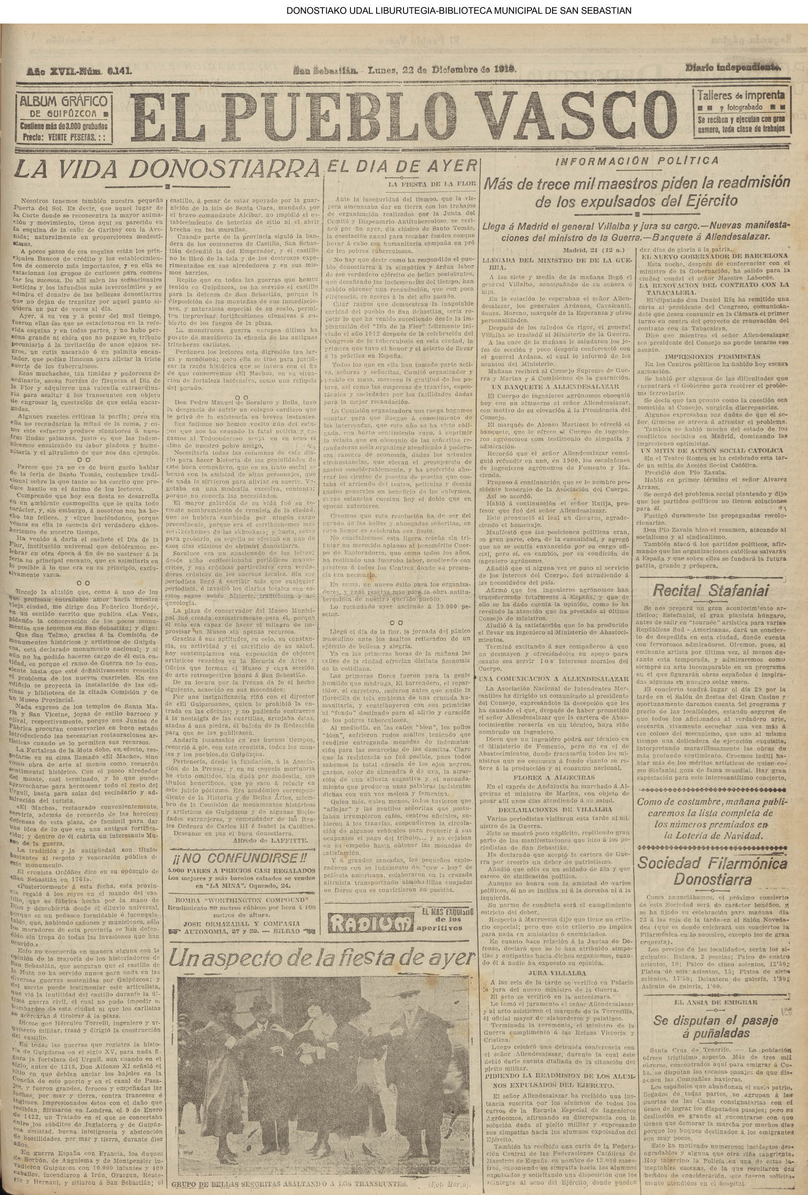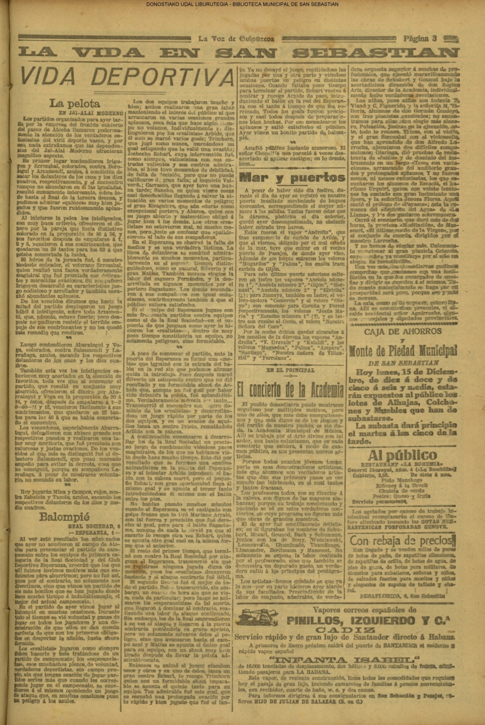 "Anoche, a las diez y media, se celebró en la plaza de toros el segundo concierto popular a cargo de la Sinfónica y del Orfeón. La plaza estaba abarrotada, calculándose en 12.000 el número de espectadores. En medio del mayor entusiasmo, el Orfeón cantó la jota "¡Viva Aragón!" y el "Gernikako Arbola", repitiéndose las ovaciones con vivas al Orfeón y a San Sebastián, a los que contestaban los donostiarras con vivas a Zaragoza." El éxito del Orfeón fue tan grande que la Unión Artesana convocó a los donostiarras para recibirle a su llegada a la estación. "En el tren correo regresó ayer de Zaragoza nuestro incomparable Orfeón, que tan alto ha puesto, como siempre, el nivel artístico de San Sebastián. A Tolosa salió a esperarle una comisión de la veterana "Unión Artesana". En la estación de San Sebastián esperaban el alcalde señor Zuaznavar, concejales señores Gurruchaga, Peña Vea, Murguía y bastante público. La "masa" estaba fuera, en la plazoleta exterior, donde había un par de millares de personas. El alcalde saludó y felicitó al presidente del Orfeón señor Peña y Goñi y el Orfeón, precedido de su estandarte, salió a la plazuela donde fue recibido con una salva de aplausos." |