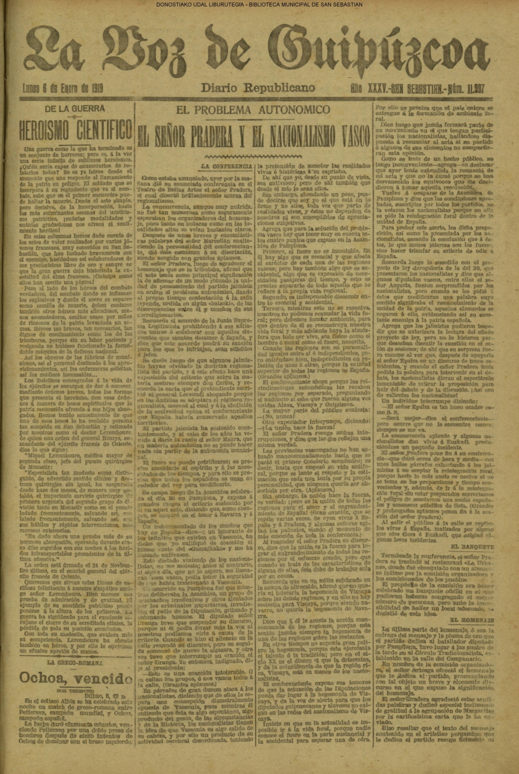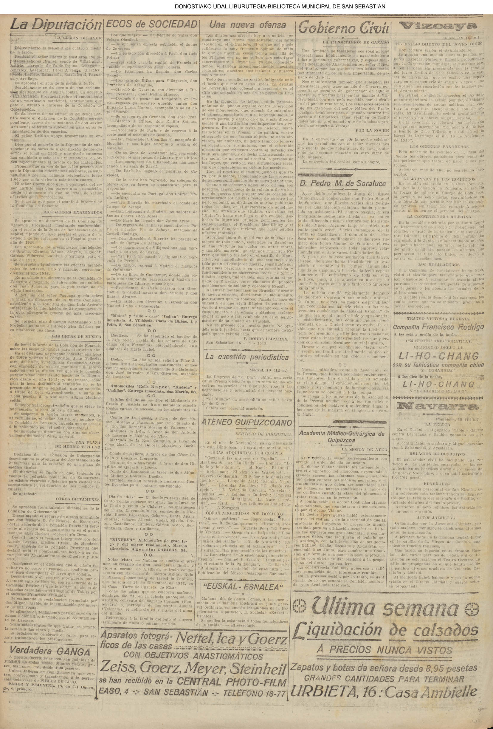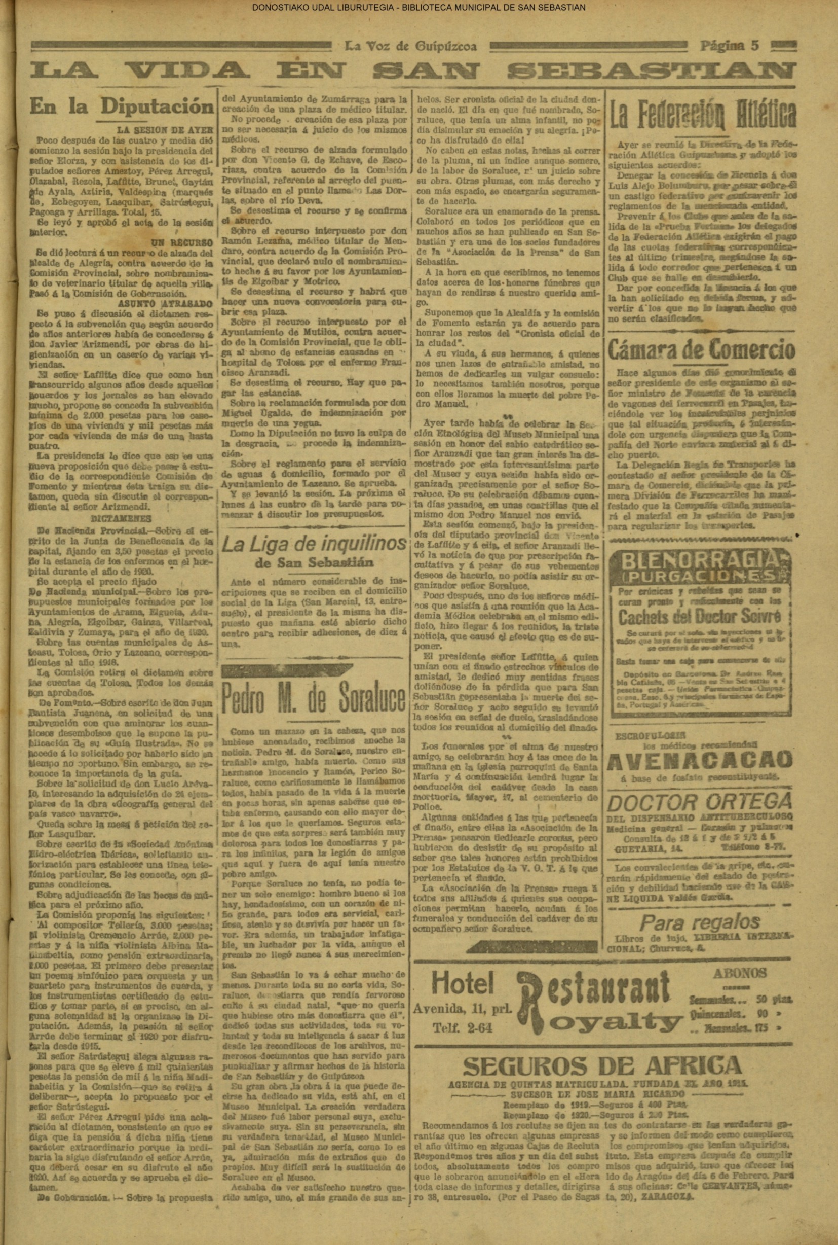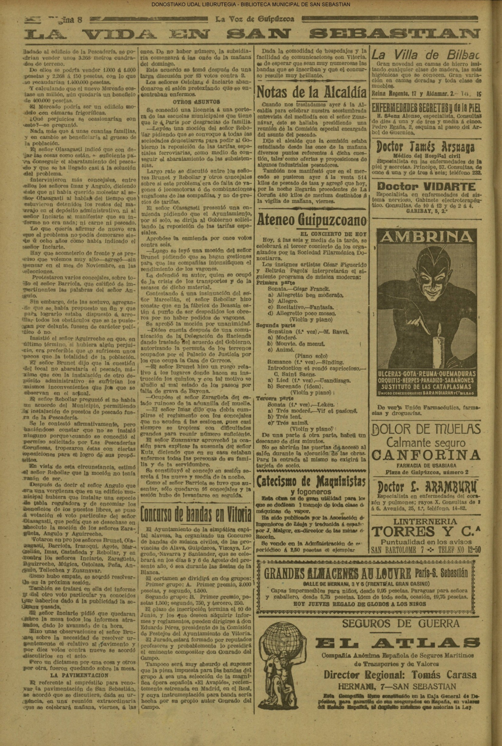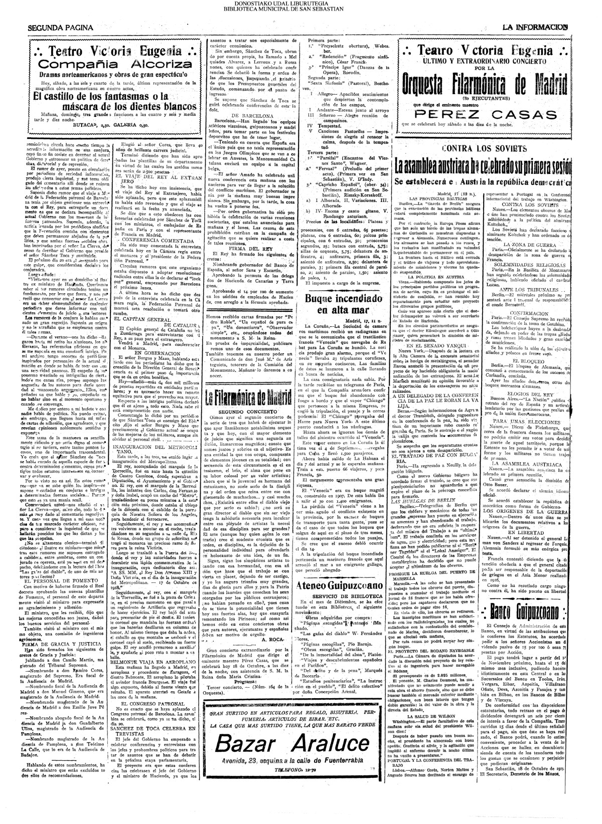"Anoche, a las diez y media, se celebró en la plaza de toros el segundo concierto popular a cargo de la Sinfónica y del Orfeón. La plaza estaba abarrotada, calculándose en 12.000 el número de espectadores. En medio del mayor entusiasmo, el Orfeón cantó la jota "¡Viva Aragón!" y el "Gernikako Arbola", repitiéndose las ovaciones con vivas al Orfeón y a San Sebastián, a los que contestaban los donostiarras con vivas a Zaragoza." El éxito del Orfeón fue tan grande que la Unión Artesana convocó a los donostiarras para recibirle a su llegada a la estación. "En el tren correo regresó ayer de Zaragoza nuestro incomparable Orfeón, que tan alto ha puesto, como siempre, el nivel artístico de San Sebastián. A Tolosa salió a esperarle una comisión de la veterana "Unión Artesana". En la estación de San Sebastián esperaban el alcalde señor Zuaznavar, concejales señores Gurruchaga, Peña Vea, Murguía y bastante público. La "masa" estaba fuera, en la plazoleta exterior, donde había un par de millares de personas. El alcalde saludó y felicitó al presidente del Orfeón señor Peña y Goñi y el Orfeón, precedido de su estandarte, salió a la plazuela donde fue recibido con una salva de aplausos." |