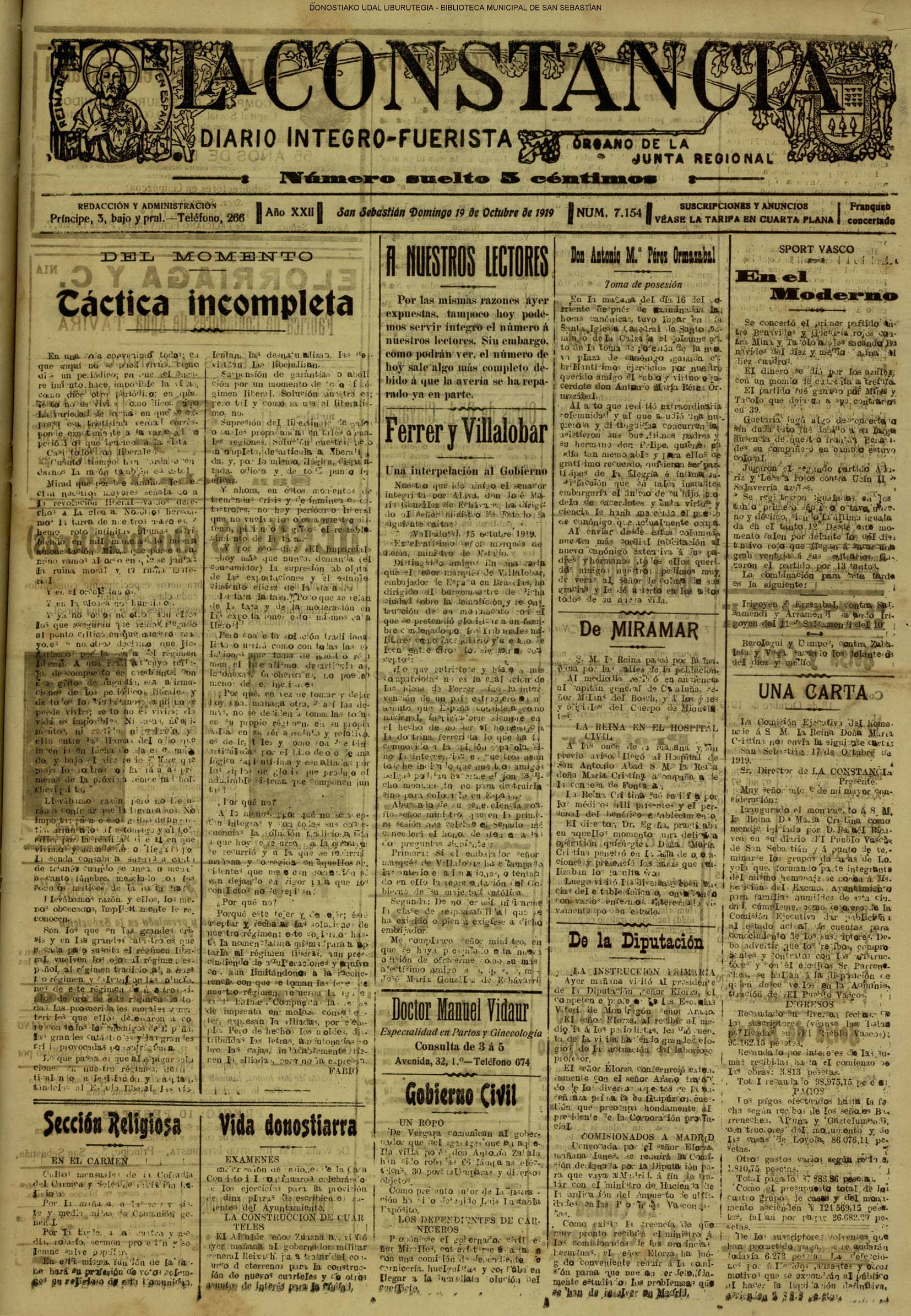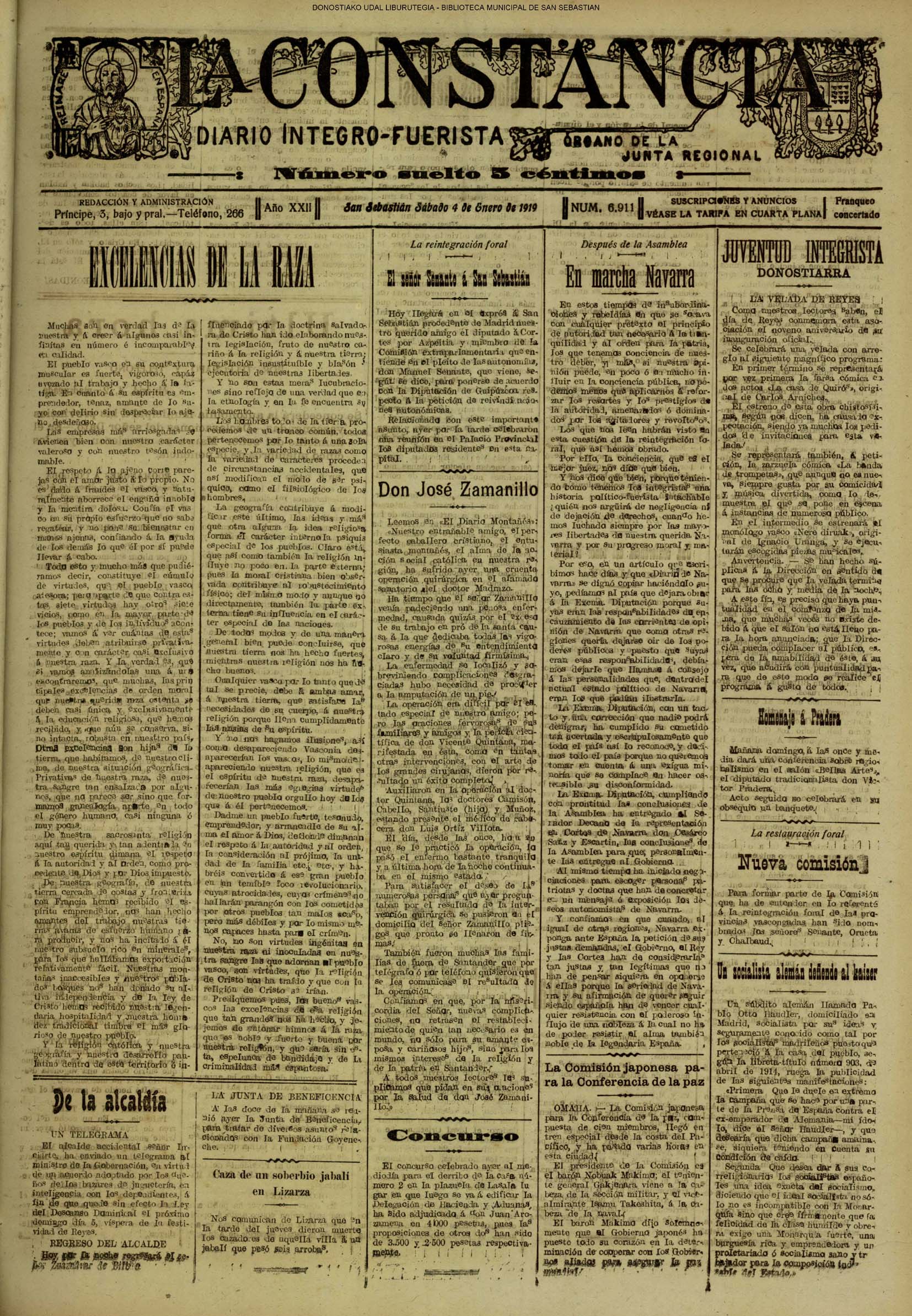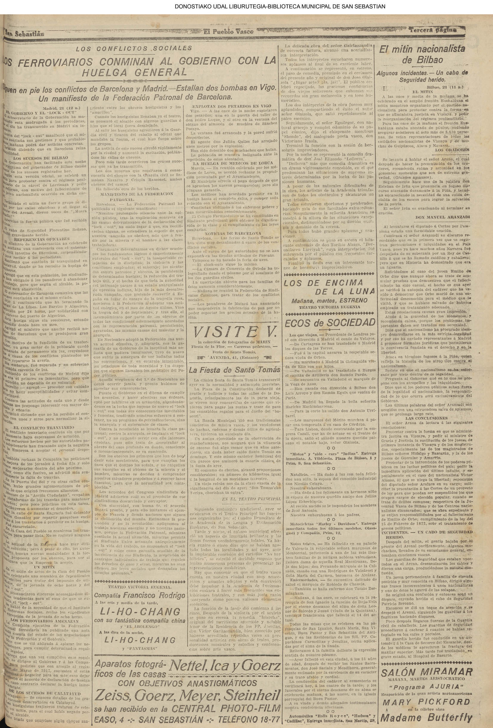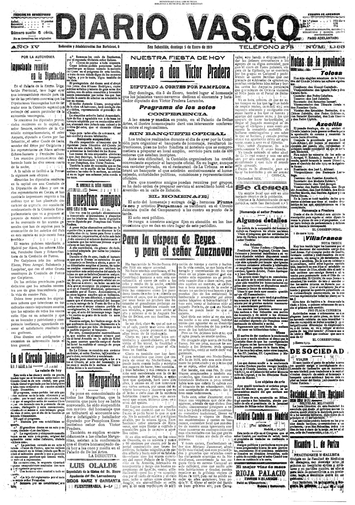 "Anoche, a las diez y media, se celebró en la plaza de toros el segundo concierto popular a cargo de la Sinfónica y del Orfeón. La plaza estaba abarrotada, calculándose en 12.000 el número de espectadores. En medio del mayor entusiasmo, el Orfeón cantó la jota "¡Viva Aragón!" y el "Gernikako Arbola", repitiéndose las ovaciones con vivas al Orfeón y a San Sebastián, a los que contestaban los donostiarras con vivas a Zaragoza." El éxito del Orfeón fue tan grande que la Unión Artesana convocó a los donostiarras para recibirle a su llegada a la estación. "En el tren correo regresó ayer de Zaragoza nuestro incomparable Orfeón, que tan alto ha puesto, como siempre, el nivel artístico de San Sebastián. A Tolosa salió a esperarle una comisión de la veterana "Unión Artesana". En la estación de San Sebastián esperaban el alcalde señor Zuaznavar, concejales señores Gurruchaga, Peña Vea, Murguía y bastante público. La "masa" estaba fuera, en la plazoleta exterior, donde había un par de millares de personas. El alcalde saludó y felicitó al presidente del Orfeón señor Peña y Goñi y el Orfeón, precedido de su estandarte, salió a la plazuela donde fue recibido con una salva de aplausos." |