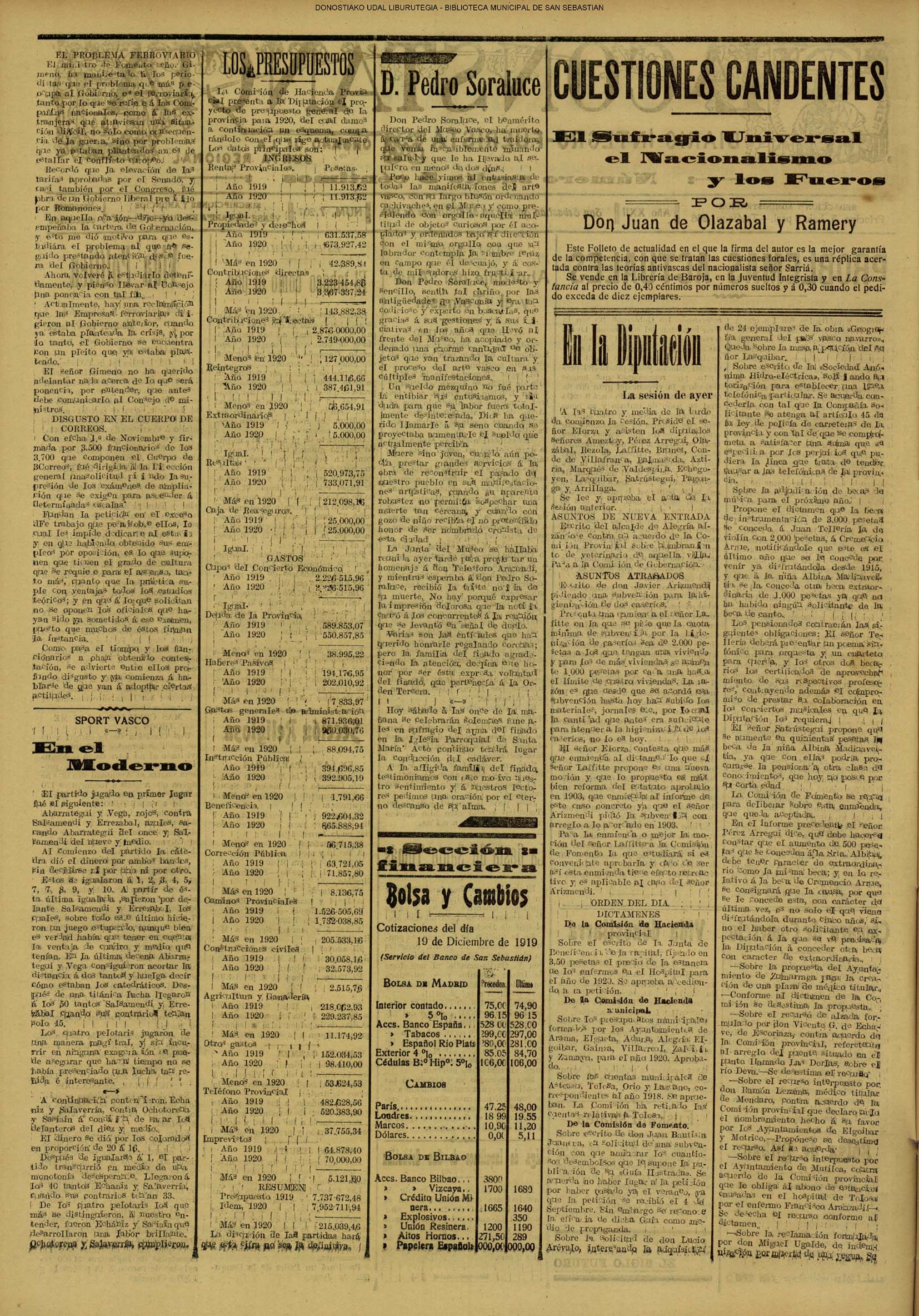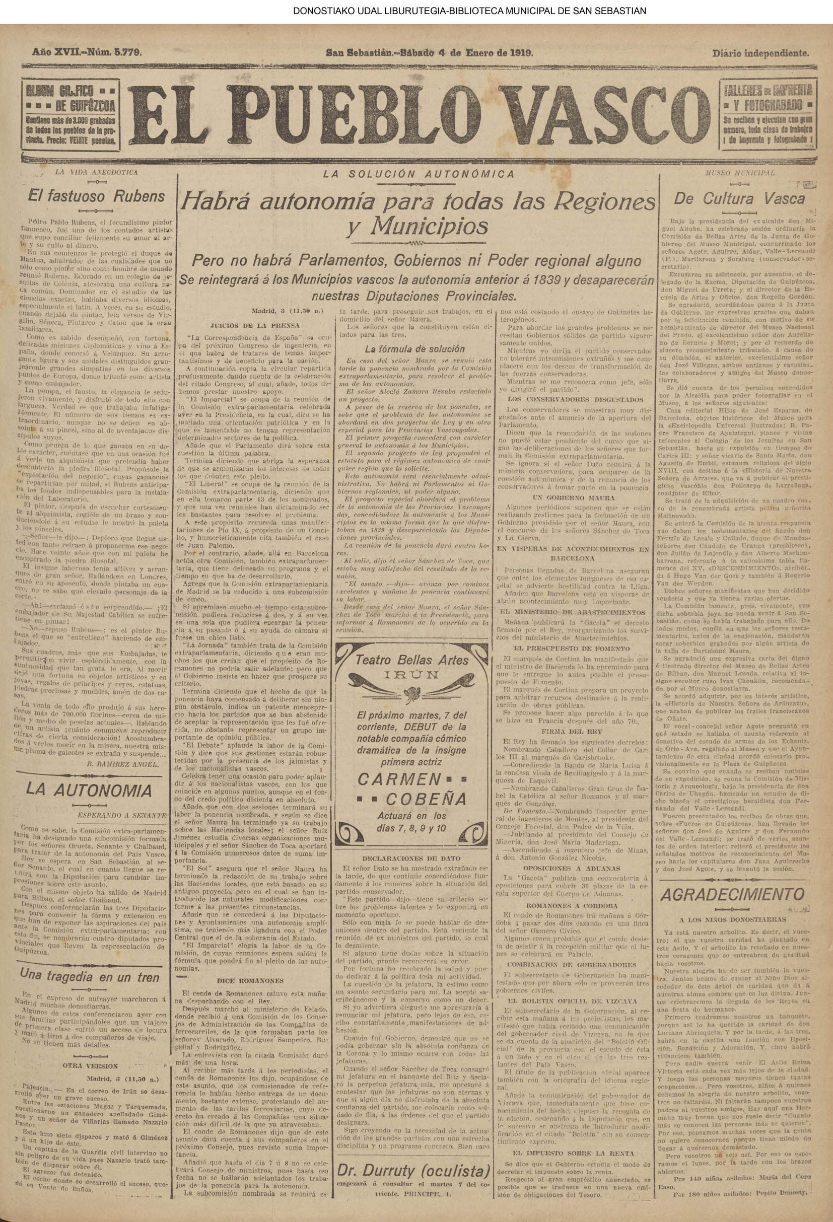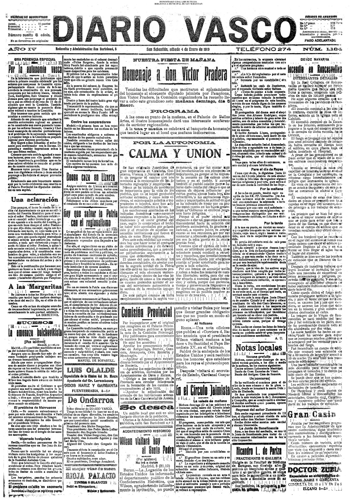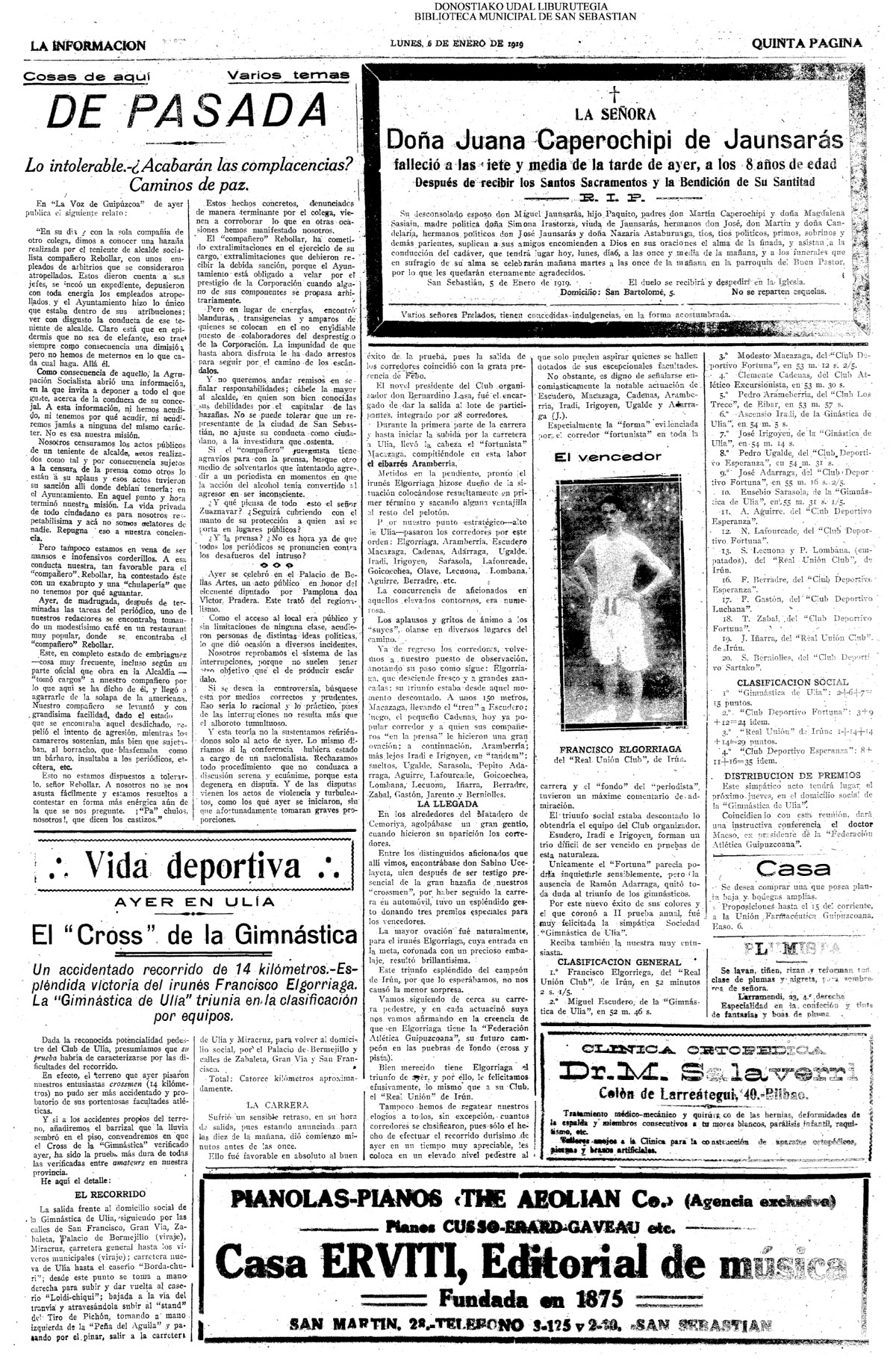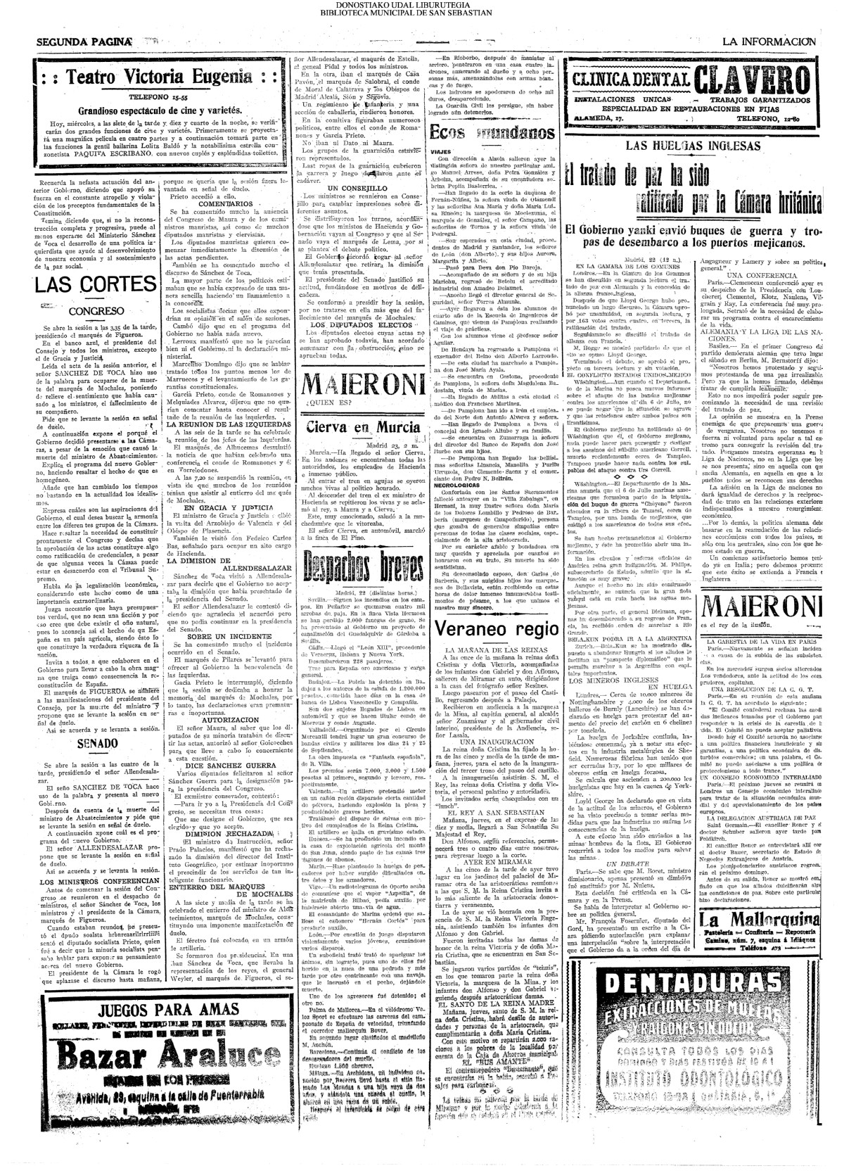 "Anoche, a las diez y media, se celebró en la plaza de toros el segundo concierto popular a cargo de la Sinfónica y del Orfeón. La plaza estaba abarrotada, calculándose en 12.000 el número de espectadores. En medio del mayor entusiasmo, el Orfeón cantó la jota "¡Viva Aragón!" y el "Gernikako Arbola", repitiéndose las ovaciones con vivas al Orfeón y a San Sebastián, a los que contestaban los donostiarras con vivas a Zaragoza." El éxito del Orfeón fue tan grande que la Unión Artesana convocó a los donostiarras para recibirle a su llegada a la estación. "En el tren correo regresó ayer de Zaragoza nuestro incomparable Orfeón, que tan alto ha puesto, como siempre, el nivel artístico de San Sebastián. A Tolosa salió a esperarle una comisión de la veterana "Unión Artesana". En la estación de San Sebastián esperaban el alcalde señor Zuaznavar, concejales señores Gurruchaga, Peña Vea, Murguía y bastante público. La "masa" estaba fuera, en la plazoleta exterior, donde había un par de millares de personas. El alcalde saludó y felicitó al presidente del Orfeón señor Peña y Goñi y el Orfeón, precedido de su estandarte, salió a la plazuela donde fue recibido con una salva de aplausos." |