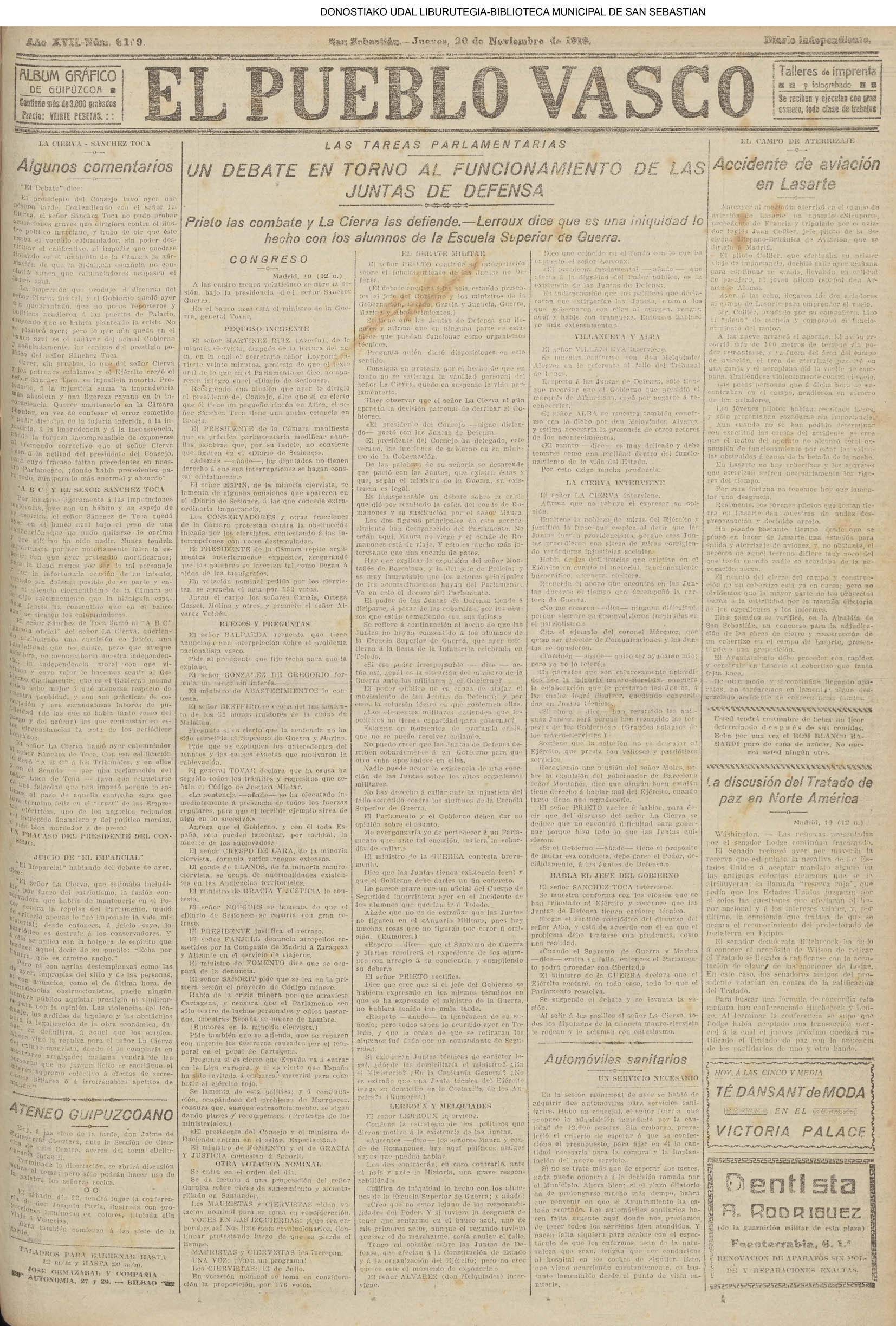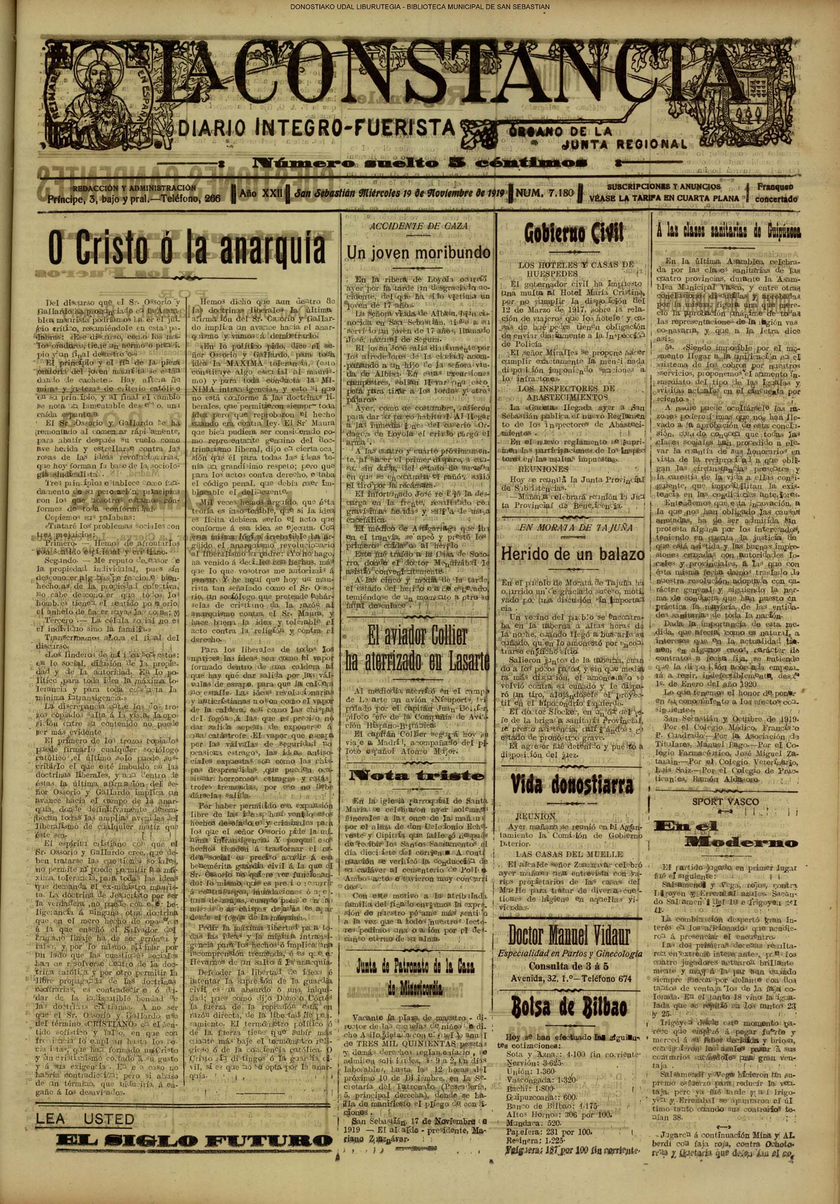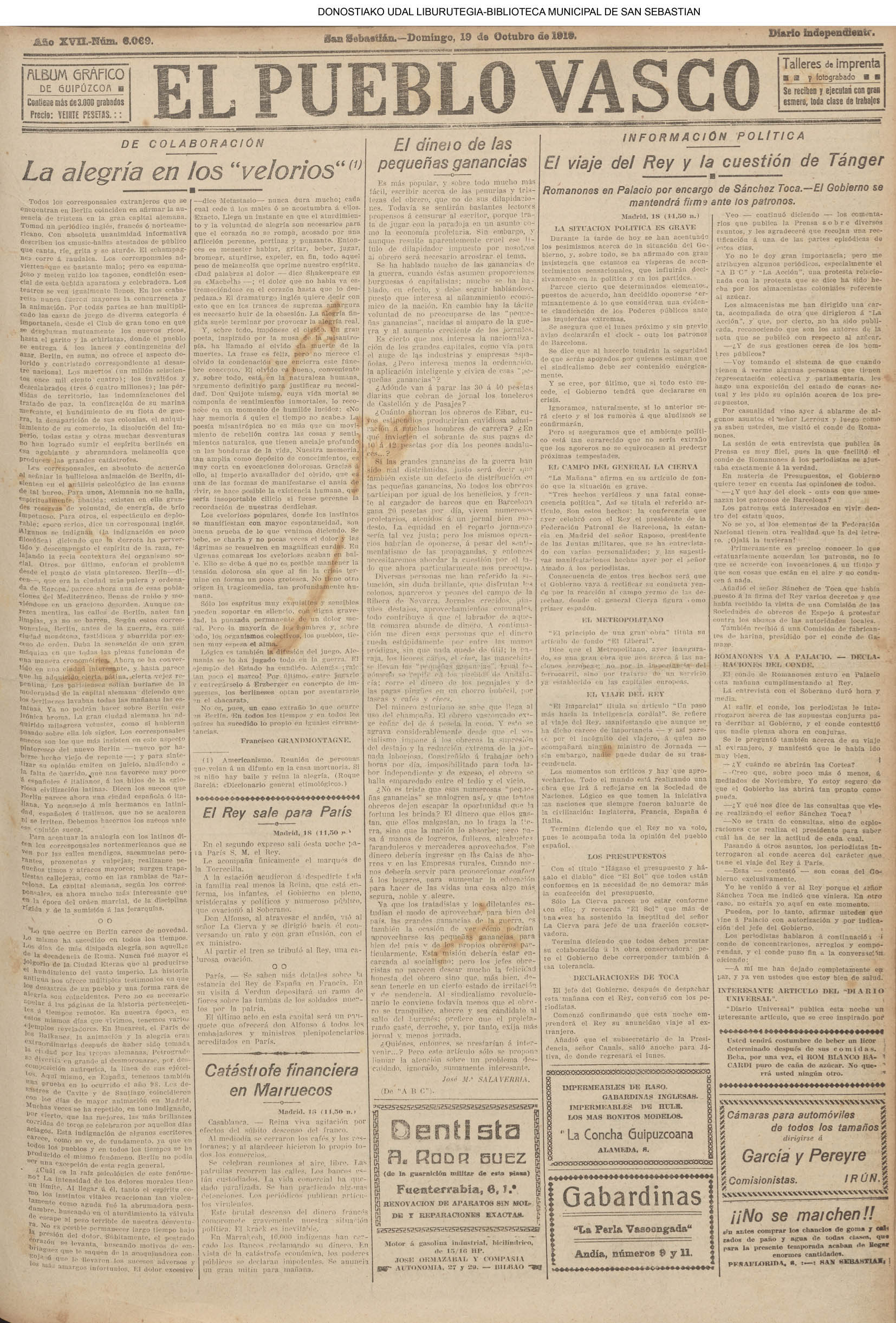 | El desarrollo de la tecnología relacionada con la aviación había realizado importantes avances en 1919. #Donostia #SanSebastián había presenciado, ya para ese momento, numerosas exhibiciones acrobáticas y a algún emprendedor de la época se le ocurrió que un vuelo por la bahía, podía ser un inmejorable atractivo turístico. El periodista de la Voz de Guipúzcoa lo relataba con mucha ironía. "Ya se habrán enterado nuestros lectores de que, mediante un estipendio de cuarenta pesetas, se podrá uno proporcionar el gusto de volar en un aeroplano, por encima de San Sebastián. Y, a propósito de vuelos, no resistimos a la comezón de contar un "sucedido", y, como tal rigurosamente exacto. En una capital cercana, un aviador convecino nuestro, realizó varios vuelos llevando pasajeros, y uno de ellos, a quien el repórter vio saltar del aparato un tanto pálido y otro tanto nervioso, le preguntó qué impresión le había producido el vuelo por encima de la población y sus alrededores. El primer cuarto de hora -contestó el héroe- es malo; se pasa miedo. Pero después se tranquiliza uno y todo el resto del viaje es precioso. ¡El vuelo había durado exactamente siete minutos!" (REVISTA SAN SEBASTIAN) |