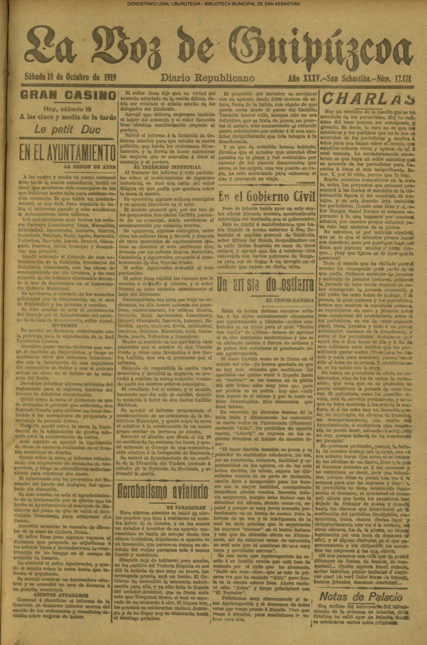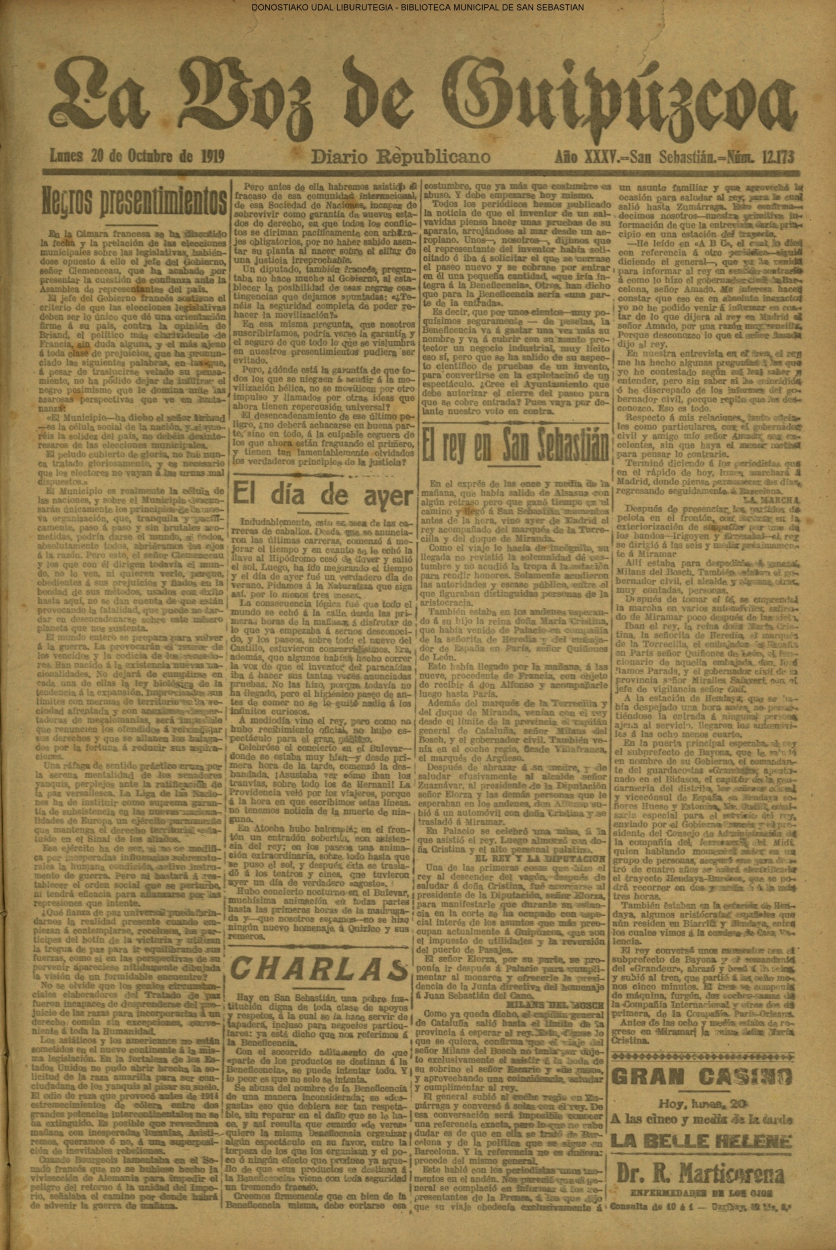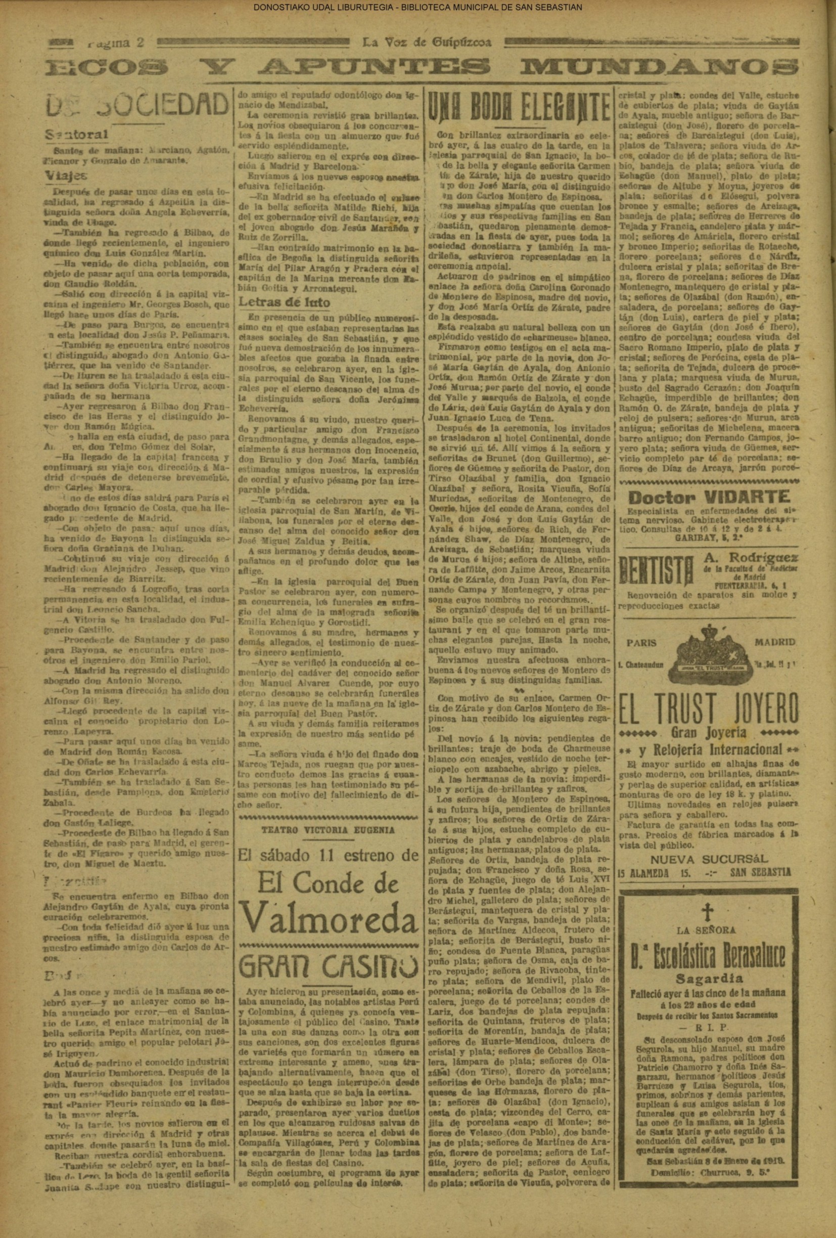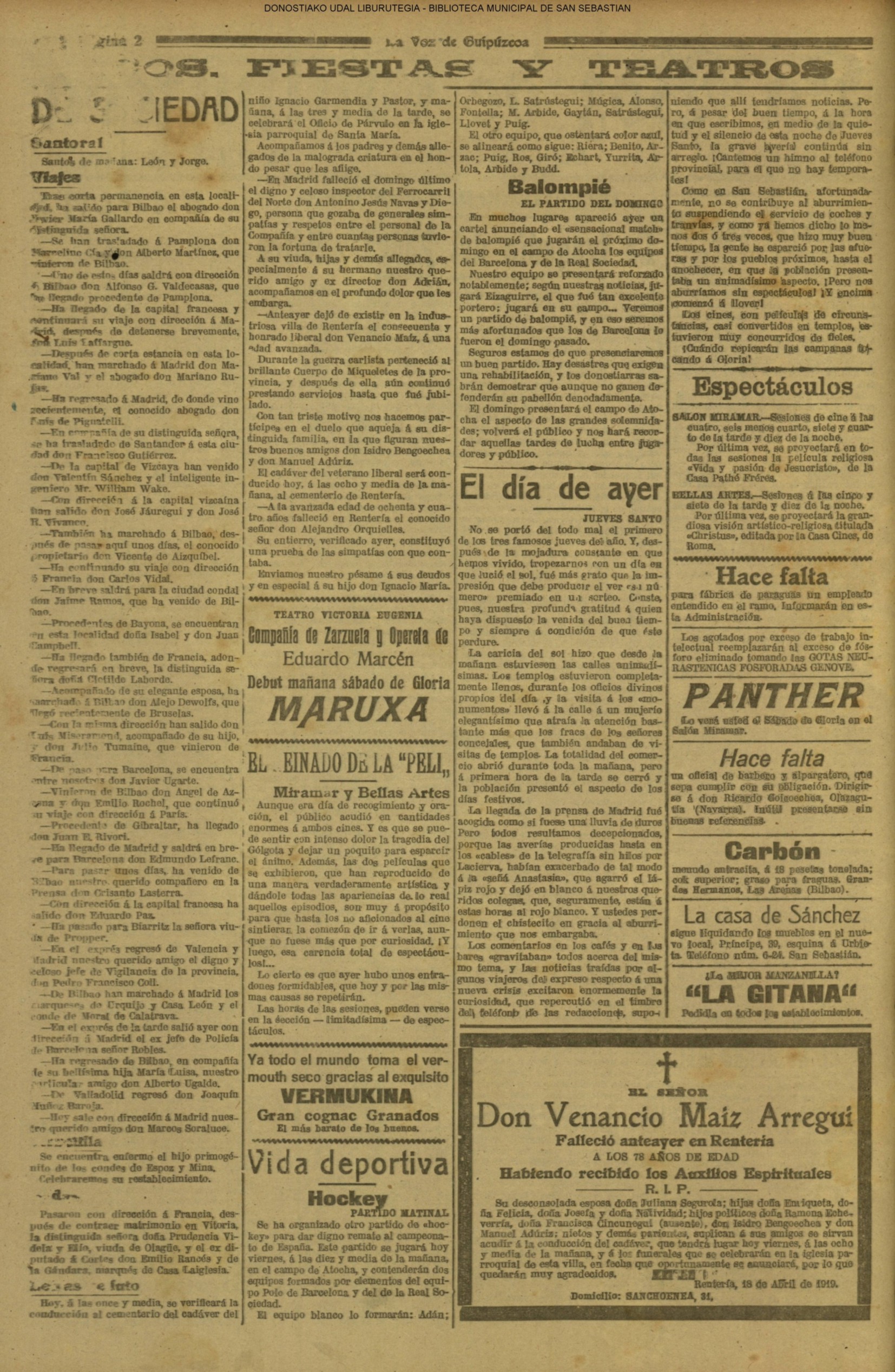 Zarzuela en el Victoria Eugenia, variedades y películas solas o combinadas en otras salas. Nos vamos de espectáculos hace un siglo, siguiendo la cartelera que publicaba 'La Voz de Guipúzcoa' el 1 de mayo de 1919, que se abría con ¡remonte!