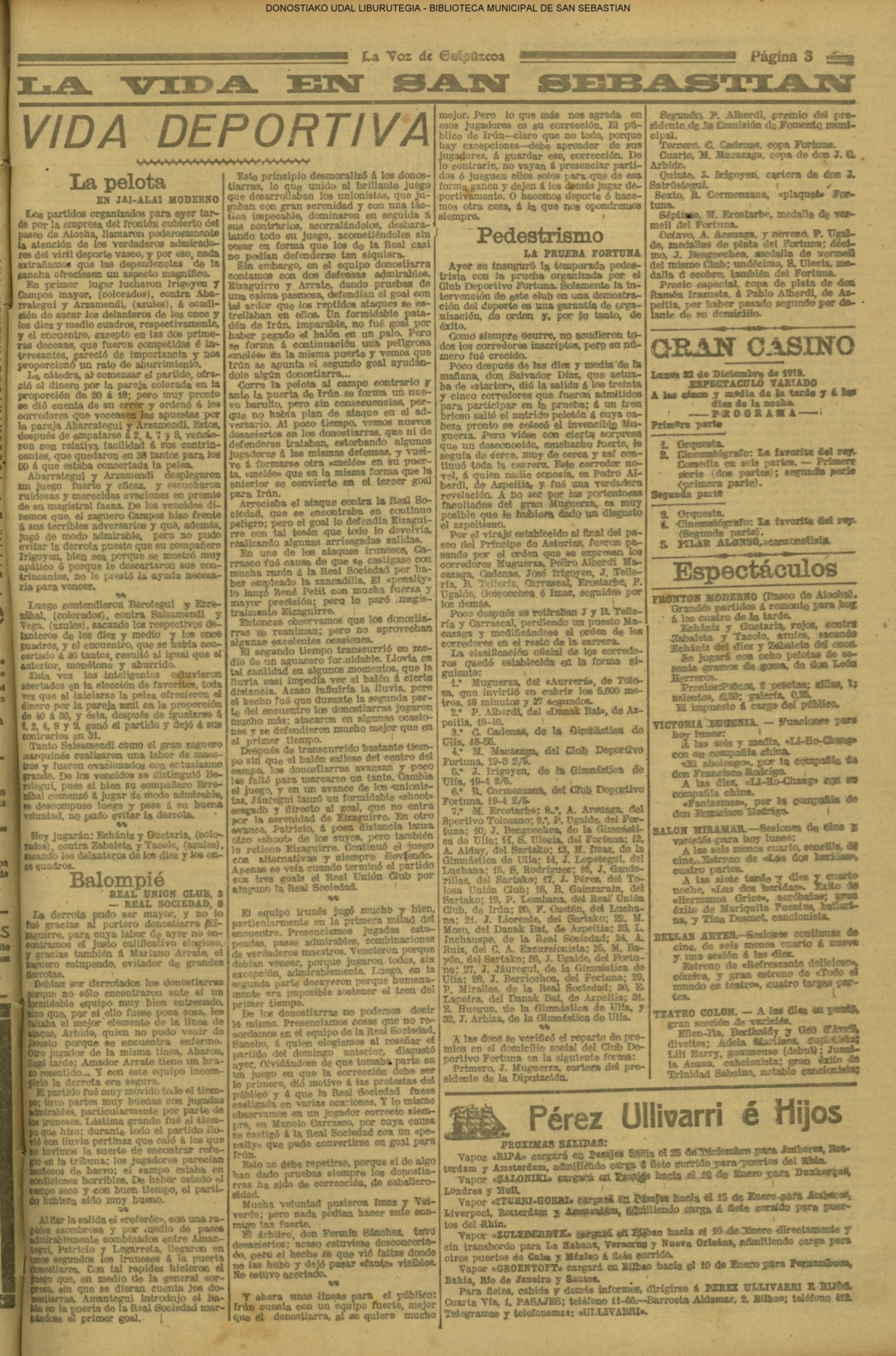 «FRONTÓN MODERNO (Paseo de Atocha): Grandes partidos a remonte para hoy, a las cuatro de la tarde. Beorlegui y Errezábal (rojos) contra Irigoyen y Lesaca (azules), sacando los delanteros del once. Se jugará con ocho pelotas de sesenta gramos de goma, de don León Herreros, San Sebastián. Precios: Palcos: 2 pesetas; sillas de cancha numeradas, 1,50; asientos, 1, y galería, 0,50».