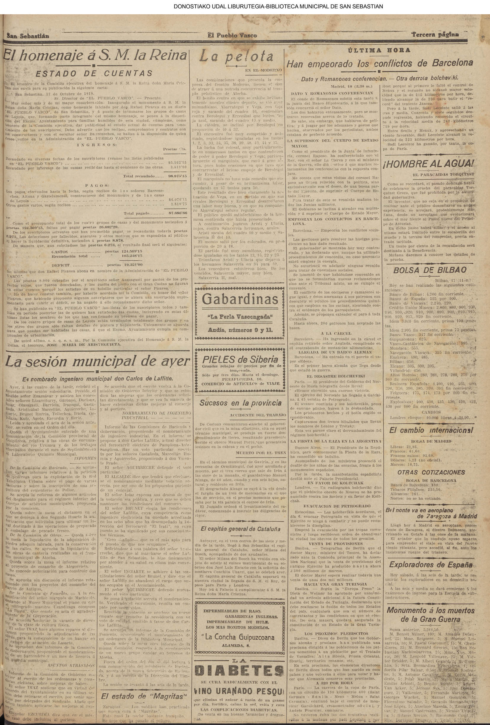 | El verano en el #Donostia #SanSebastián de hace un siglo era como la Navidad actual, que cada vez empieza antes. El periodista de La Voz de Guipúzcoa nos lo contaba a primeros de mayo de 1919. "¡Ea, ya nos hemos sacudido la morriña invernal! Hemos desentumecido los miembros, nos hemos arrancado el musgo que nos había brotado a causa de tanta humedad y estamos dispuestos a mirar cara a cara al verano que nos entra por las puertas con fuerza avasalladora. Ayer lucieron muchos sombreros de paja –de los que están abarrotados los escaparates de las sombrererías-, la gente tomó café en los veladores de las terrazas abandonando las mesas de los “interiores” de los cafés y salieron a las vías públicas las jardineras de los tranvías. Hubo “pasa” de aviones de los que toman parte en ese “raid” fracasado de Londres a Madrid, y decimos fracasado porque se está llevando a cabo con unas intermitencias y unos descansos que no son lo que nos habían contado. Pero todo quedó relegado a término secundario ante el buen tiempo.” (REVISTA SAN SEBASTIÁN) |