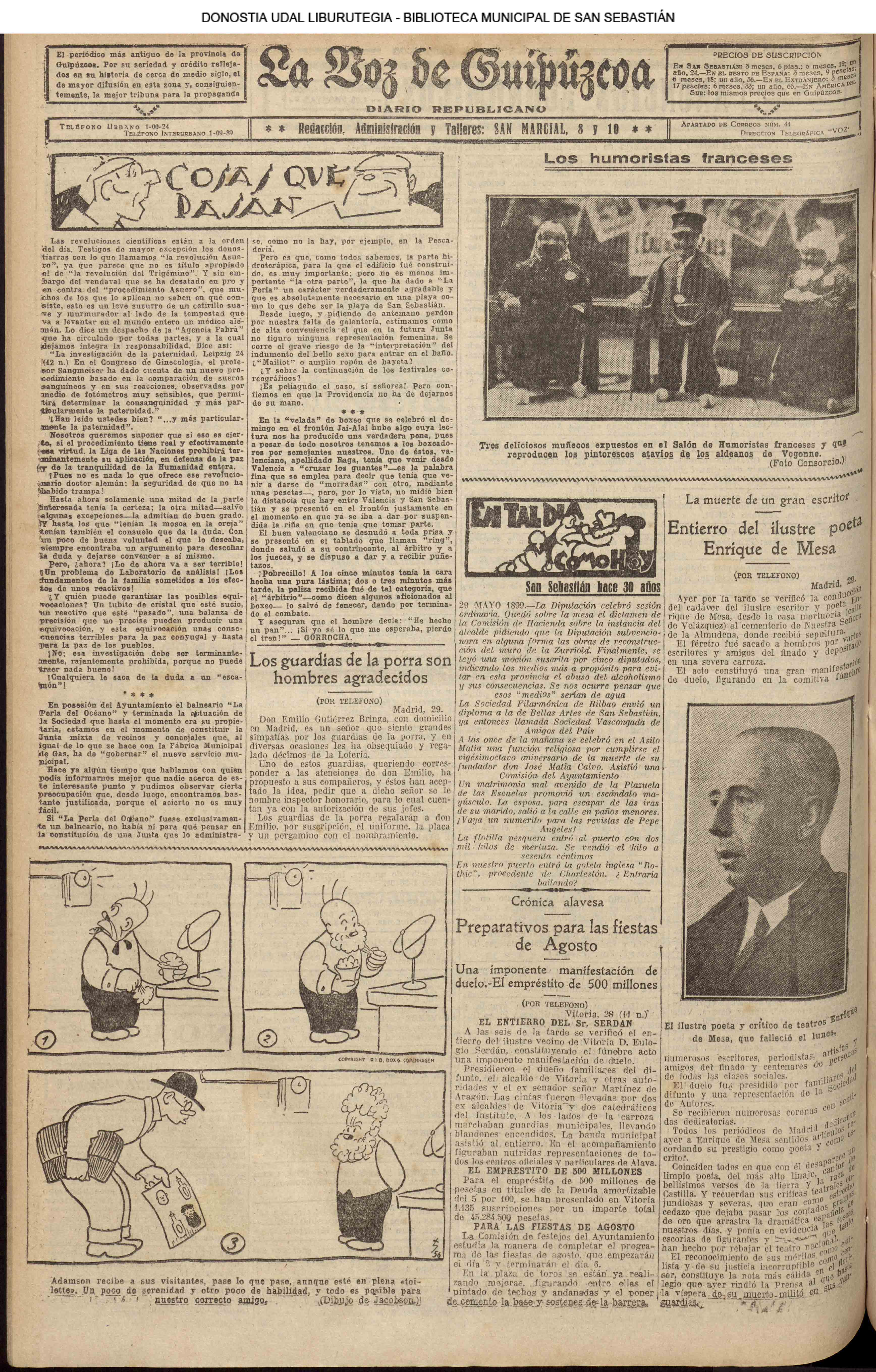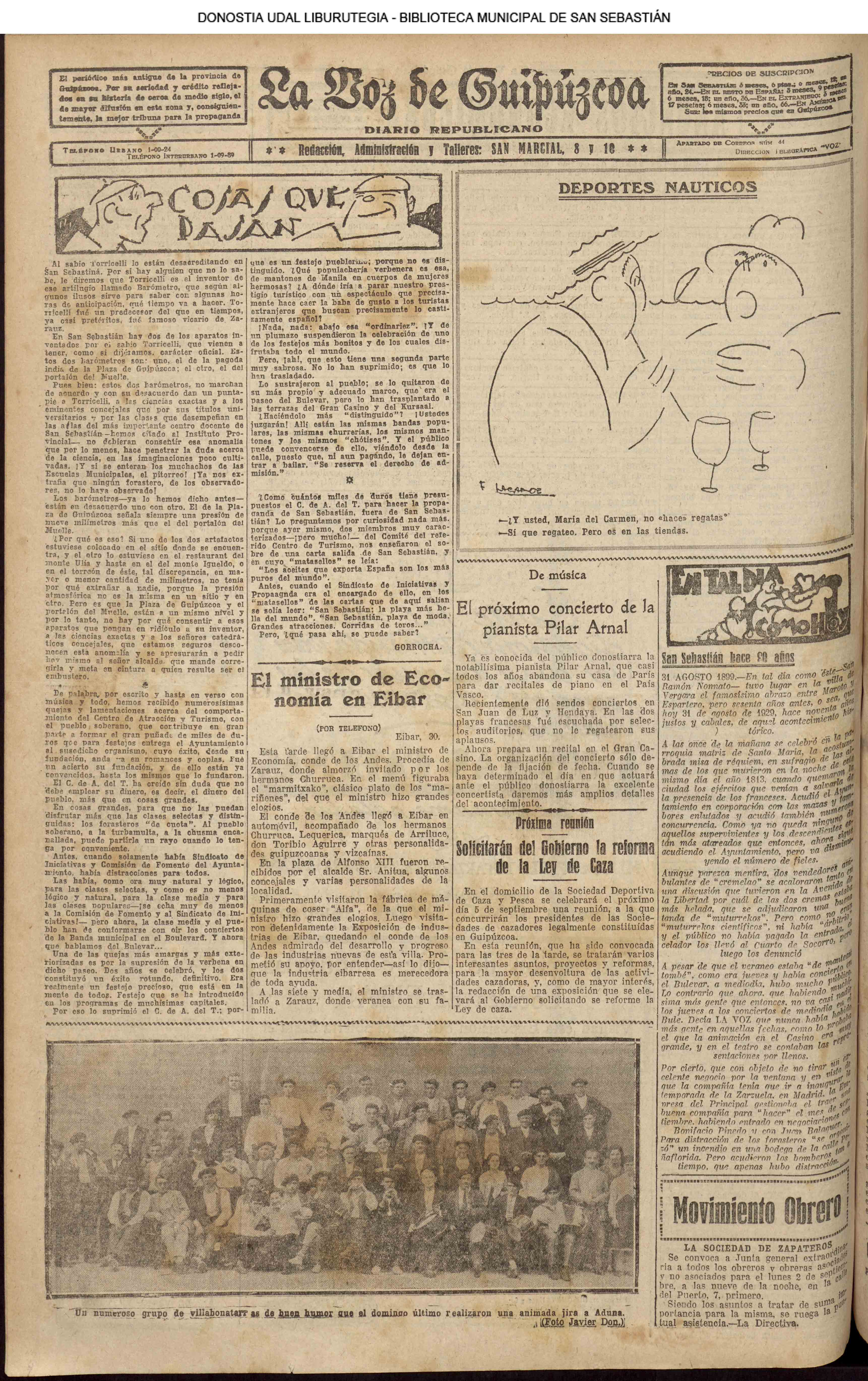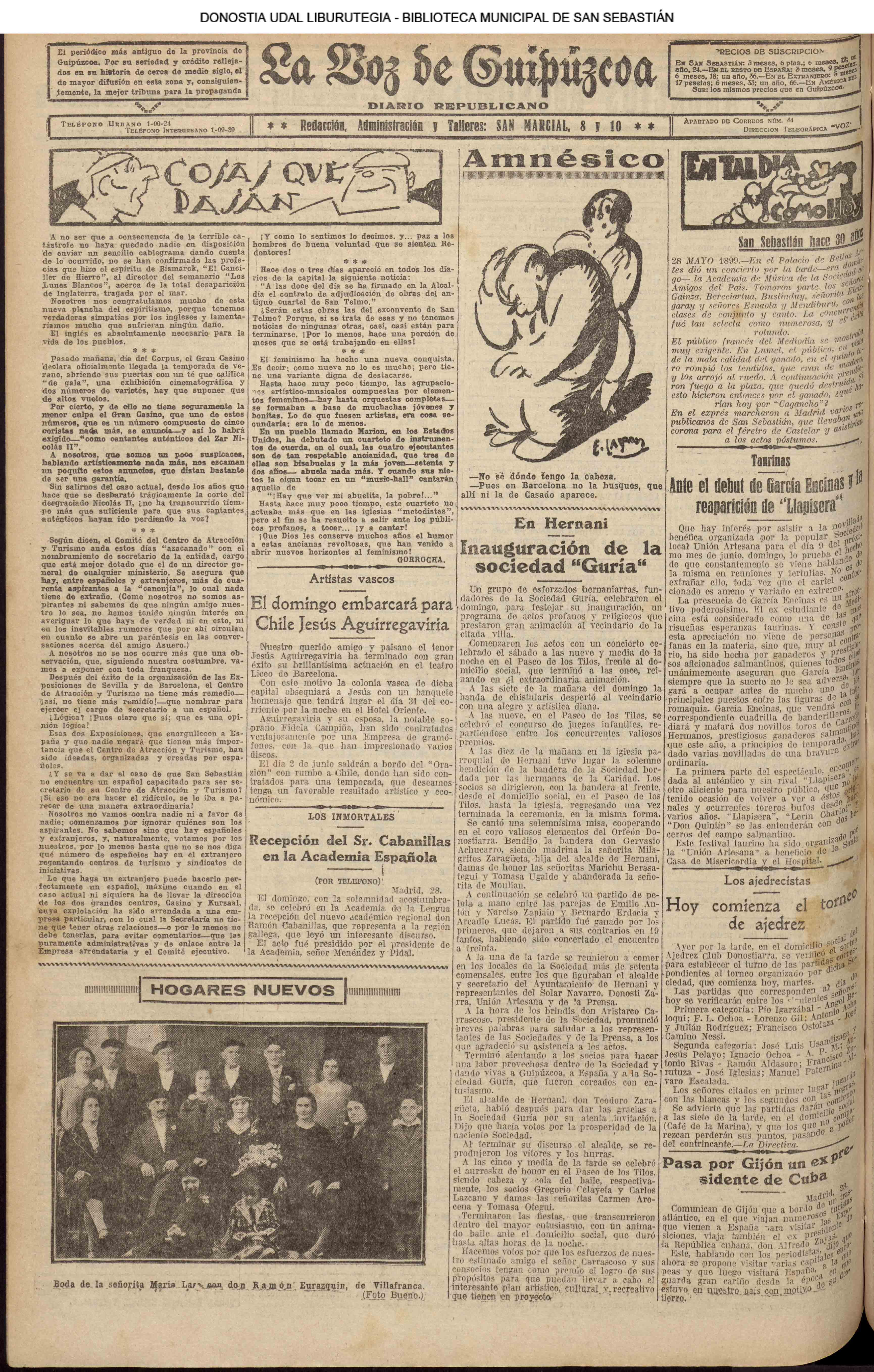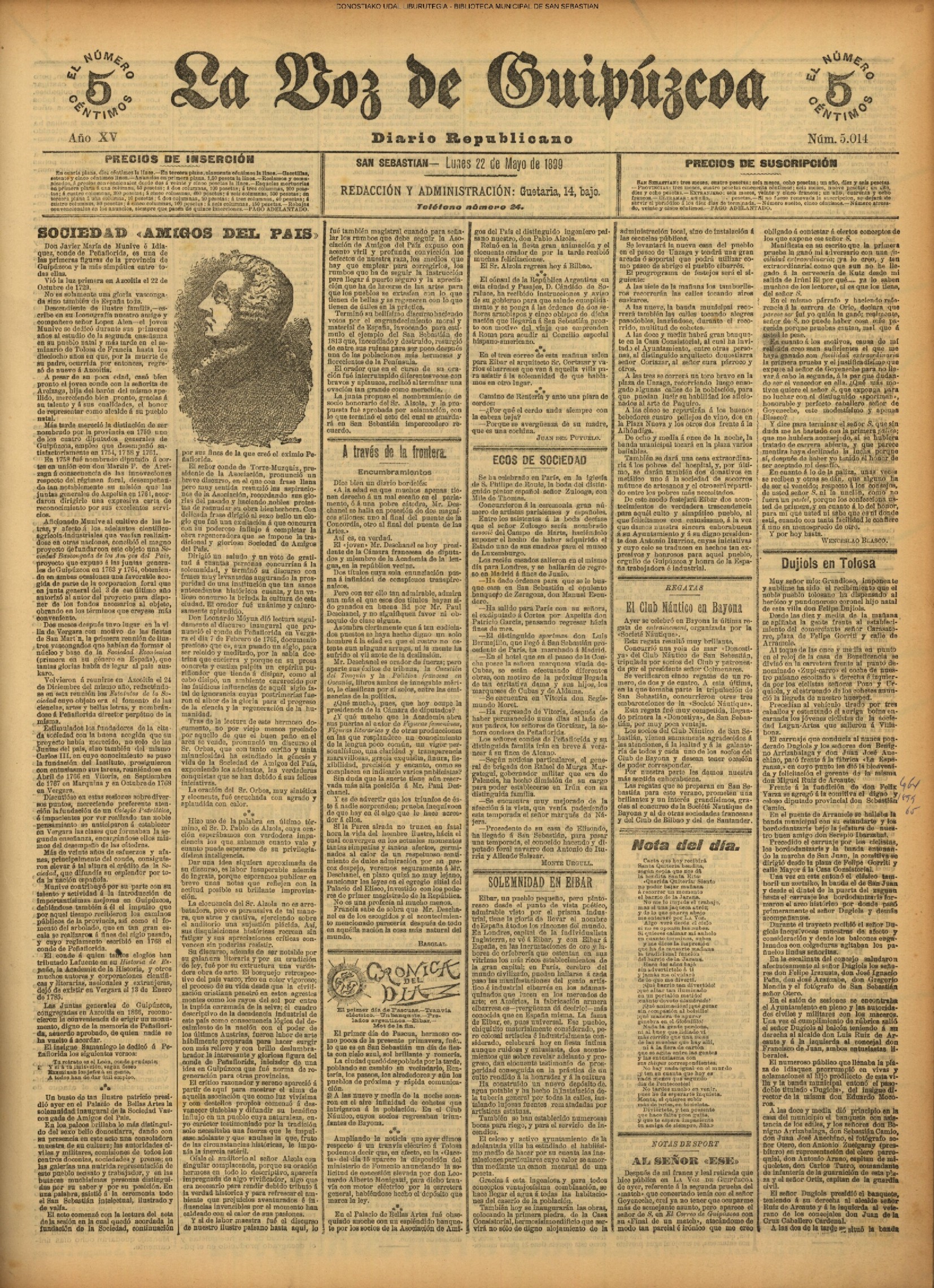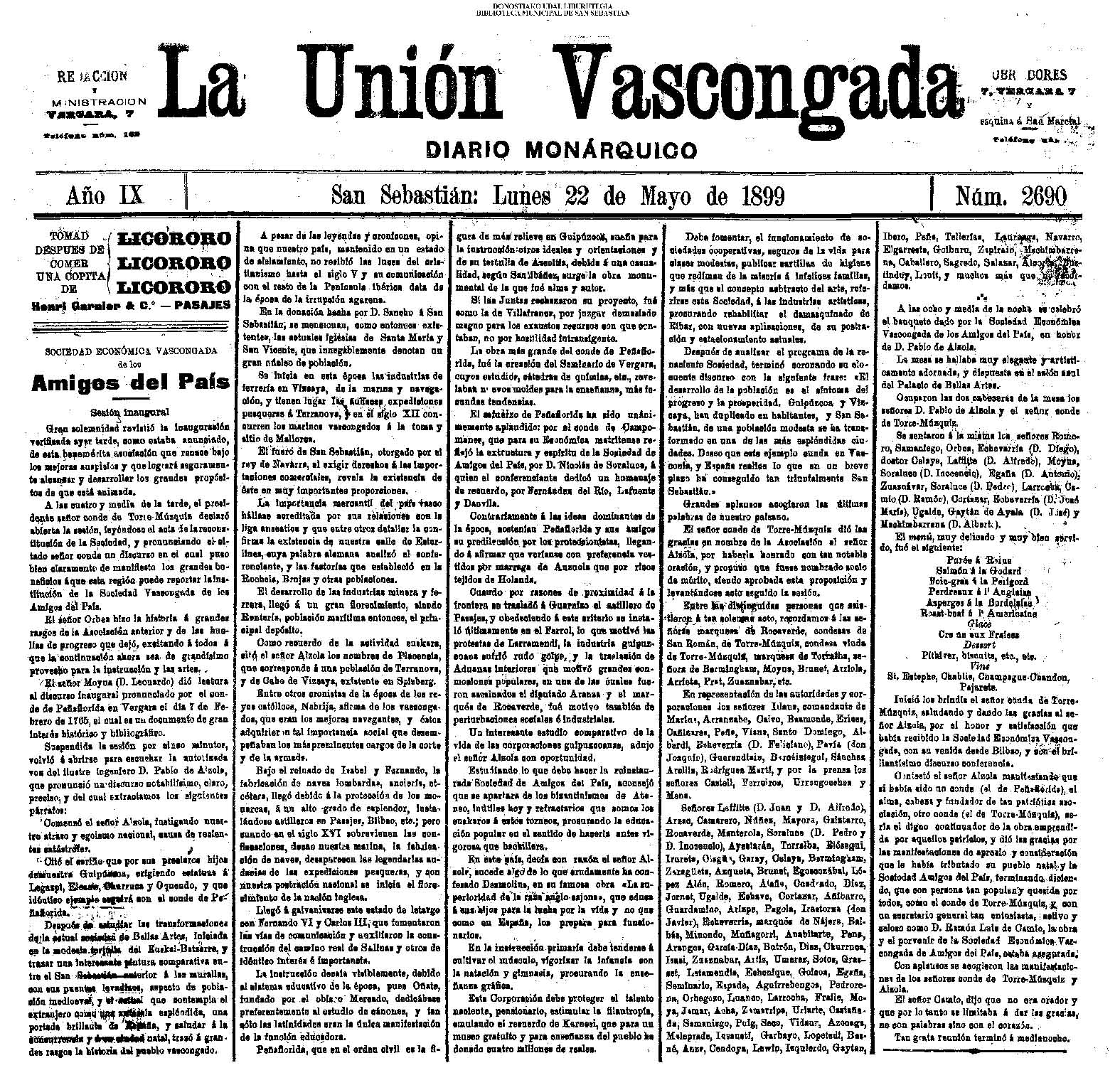 | La Sociedad de Bellas Artes, por iniciativa de Wenceslao Orbea, decide por unanimidad restaurar la Real Sociedad Bascongada de los Amigos del País, "de gloriosa tradición e Historia en la cultura nacional", señalan