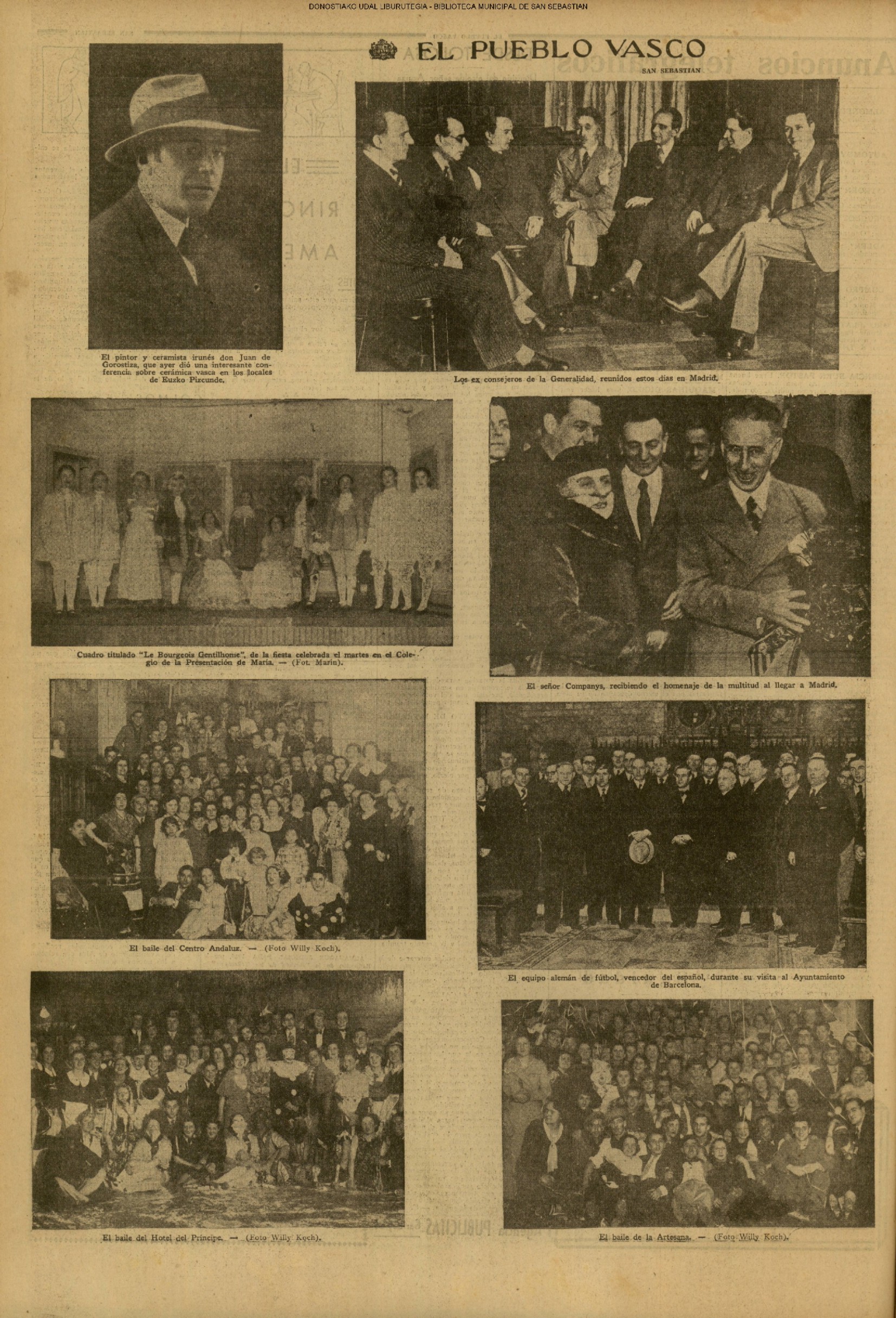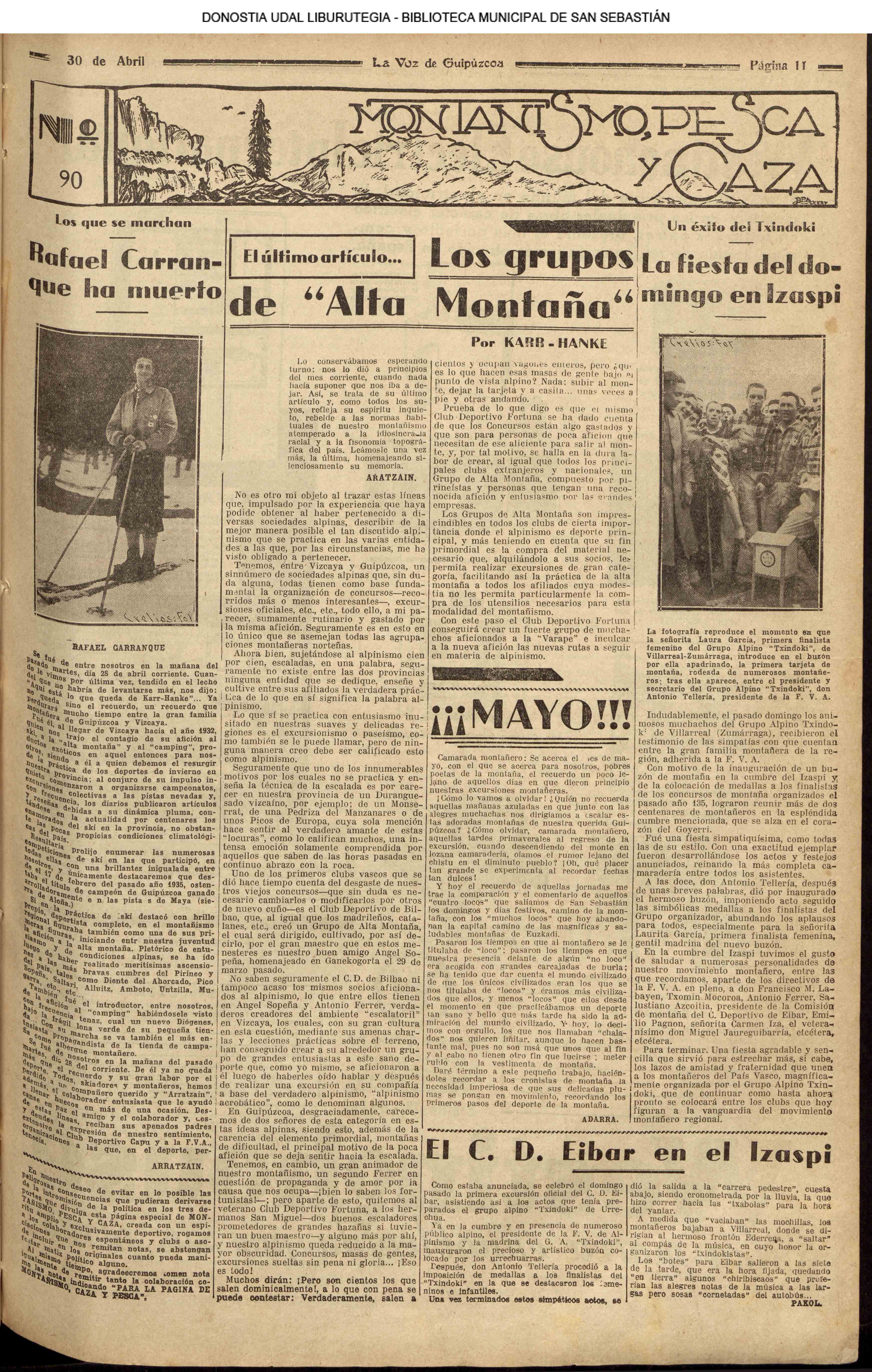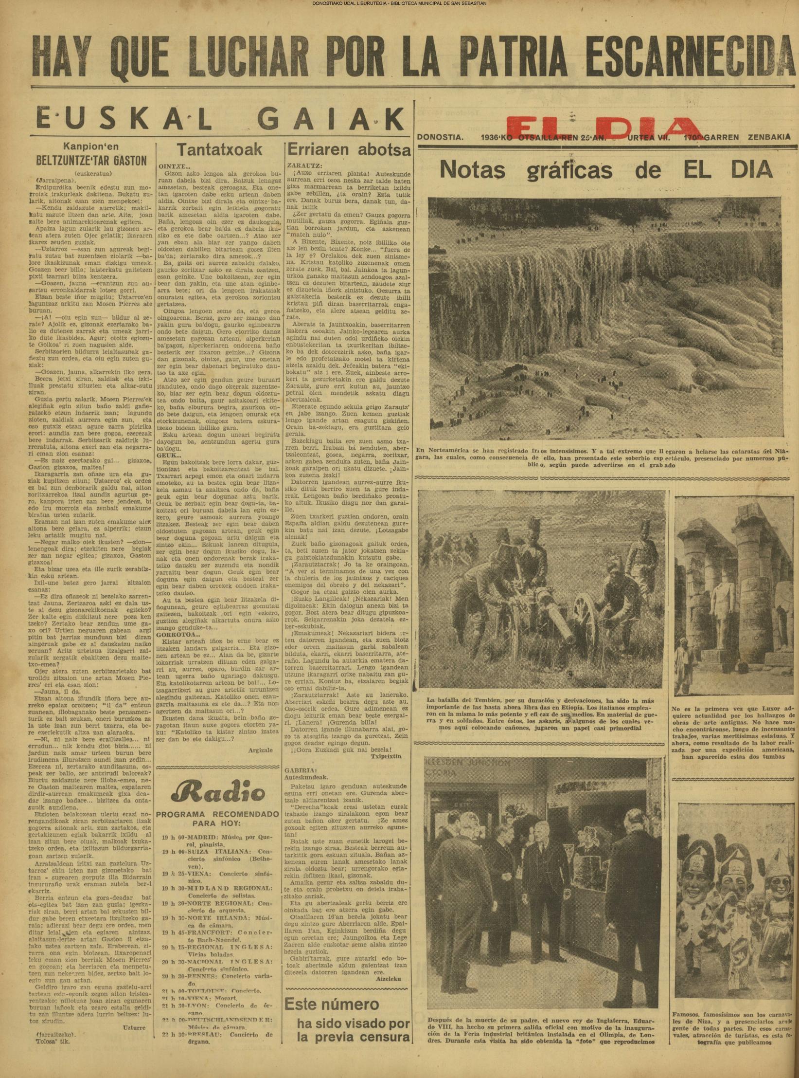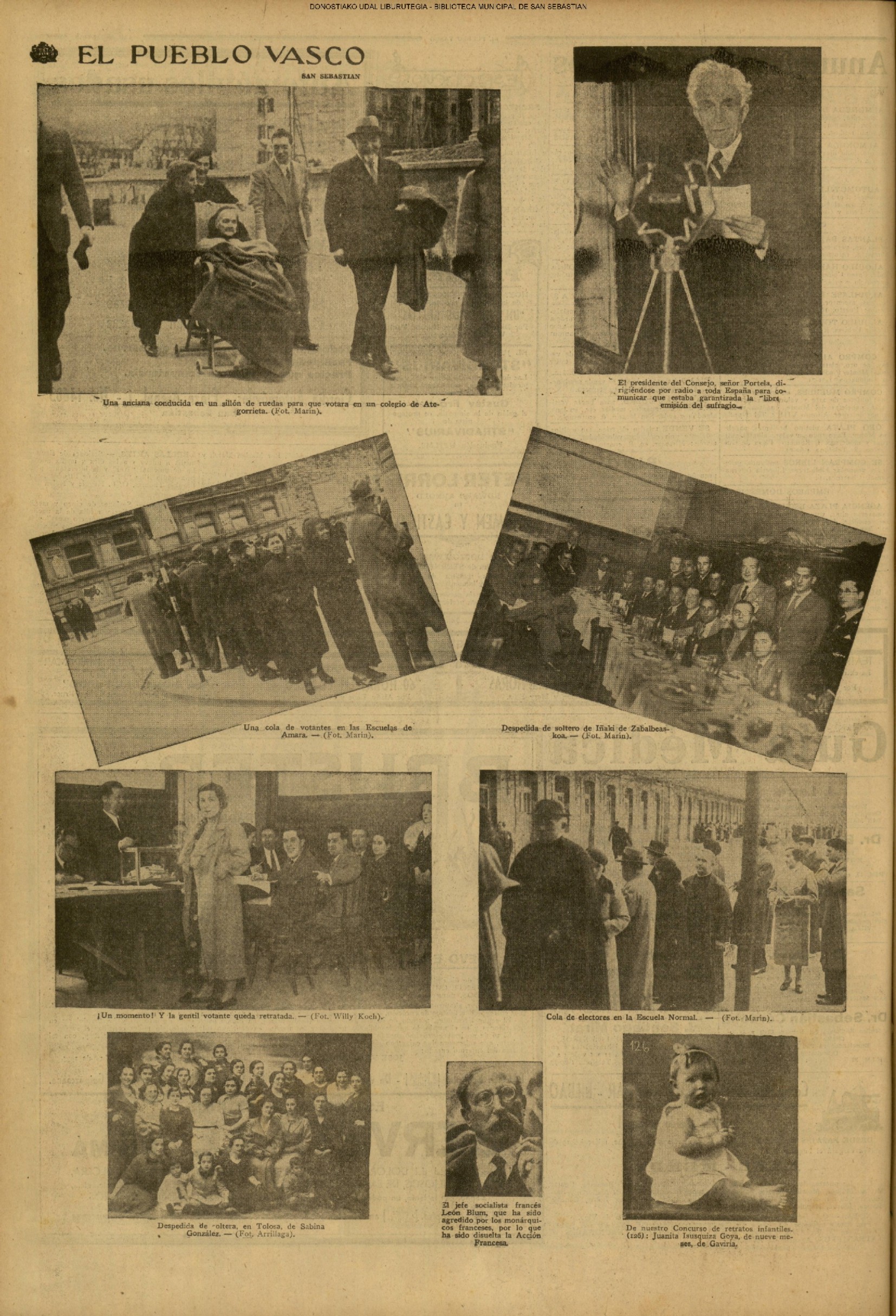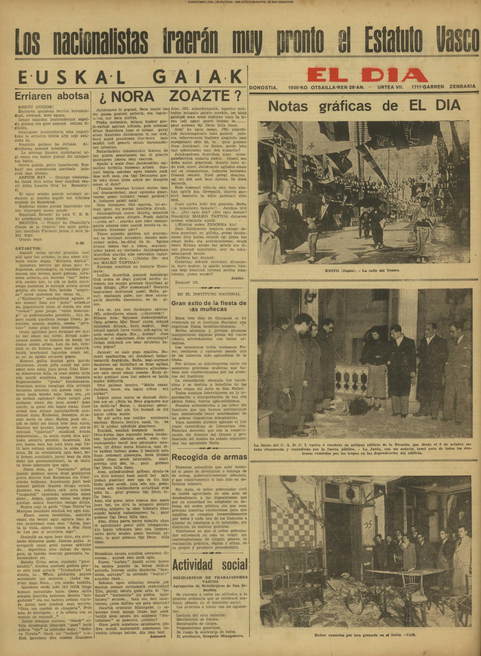 | 14 (DOMINGO) (*) .- En Azpeitia se celebró brillantemente el III Día del Nekazari. (*).- HOMENAJE A LA VEJEZ DEL MARINO. En la Delegación Marítima tuvo lugar el reparto de libretas a los ancianos arrantzales de Guipúzcoa. (*).- En el frontón Urumea, brillantísimo final del Campeonato de pelota de Euzkadi. | |||||||
