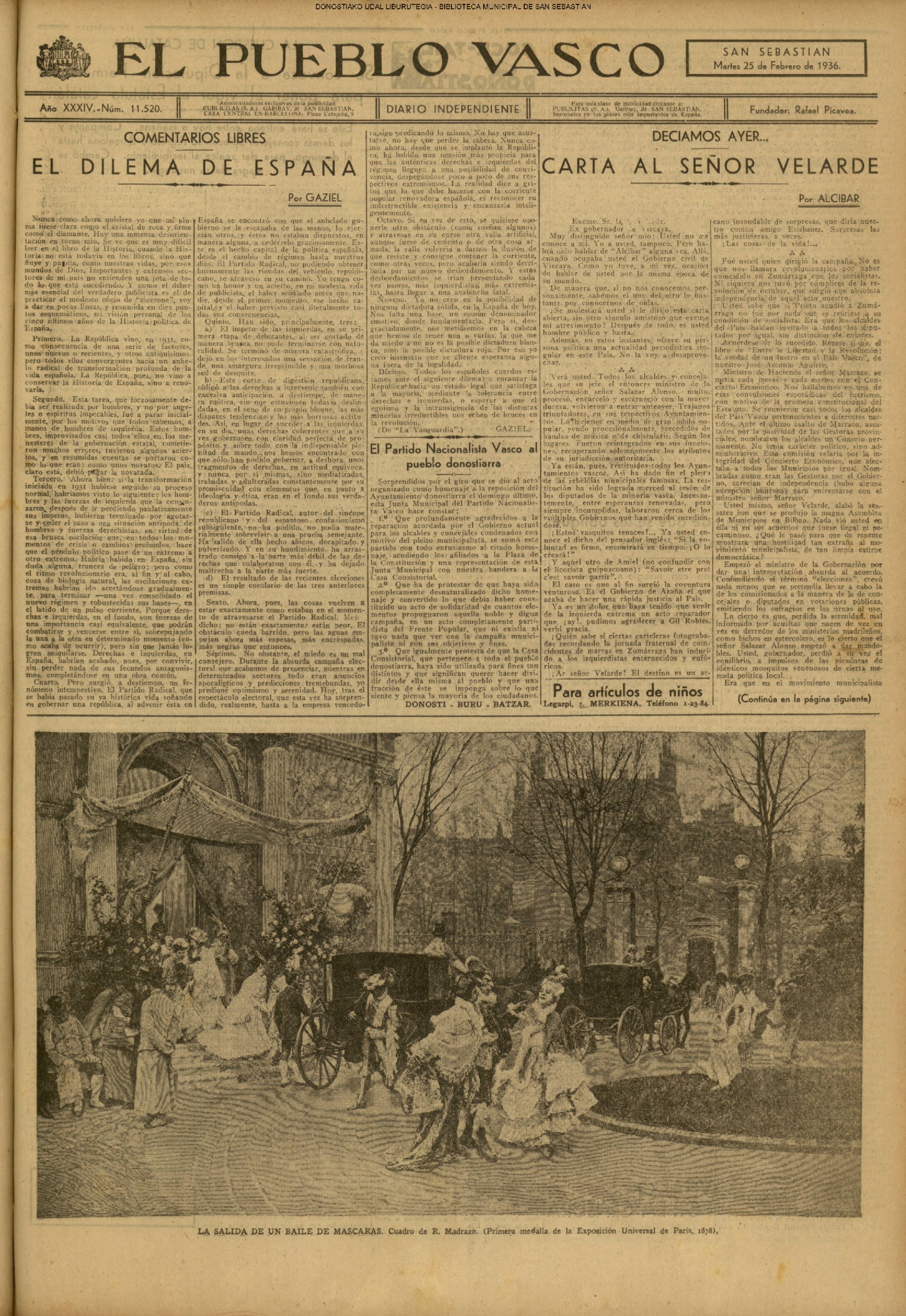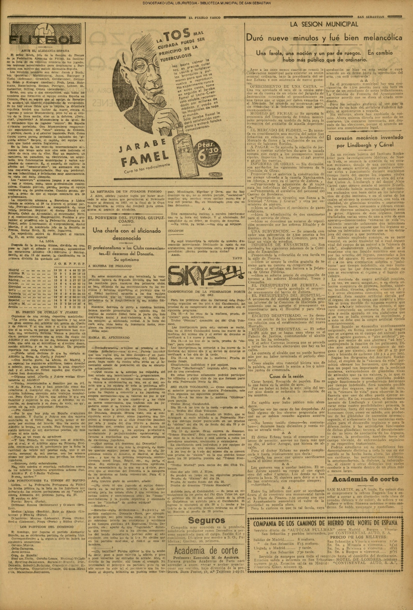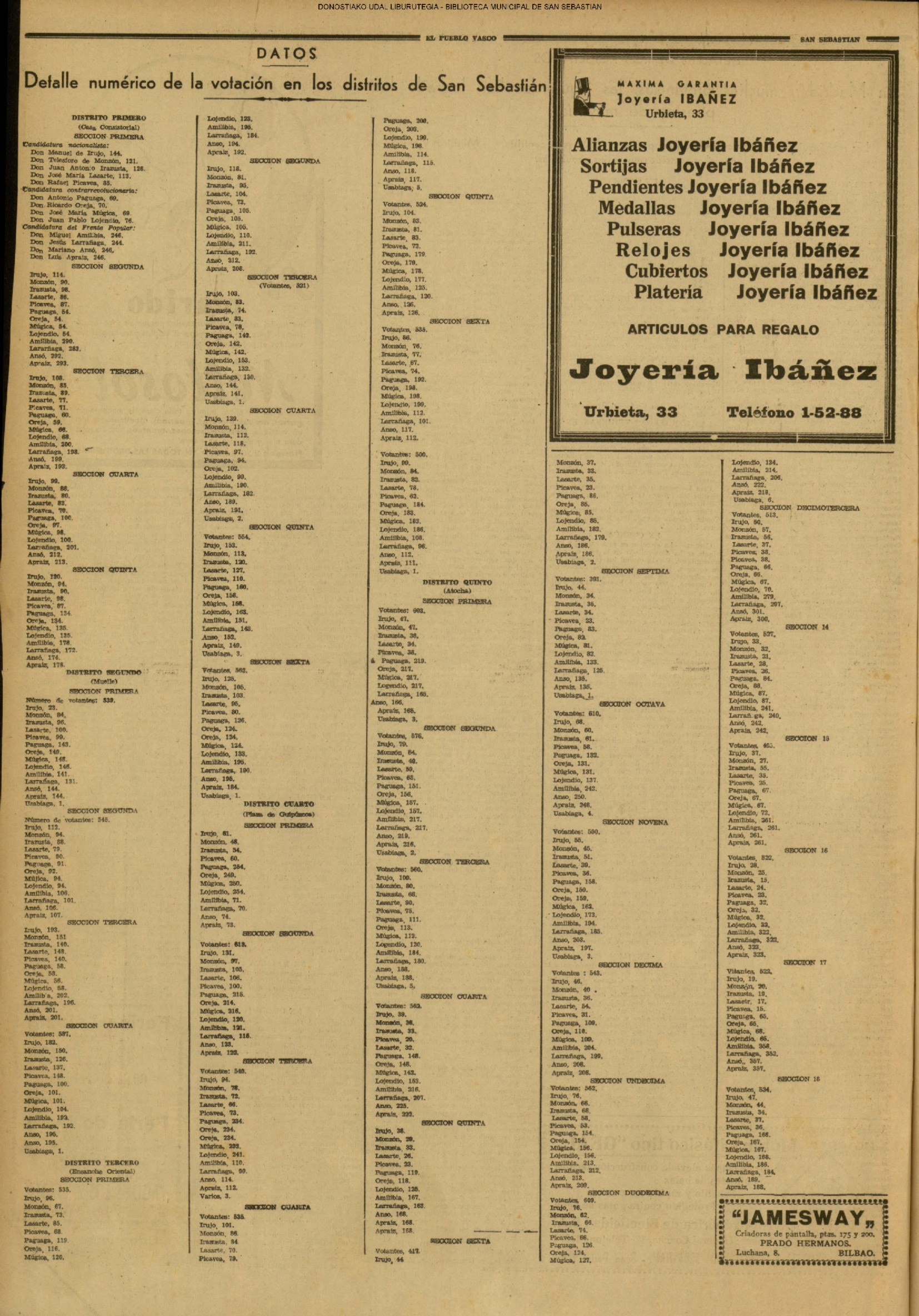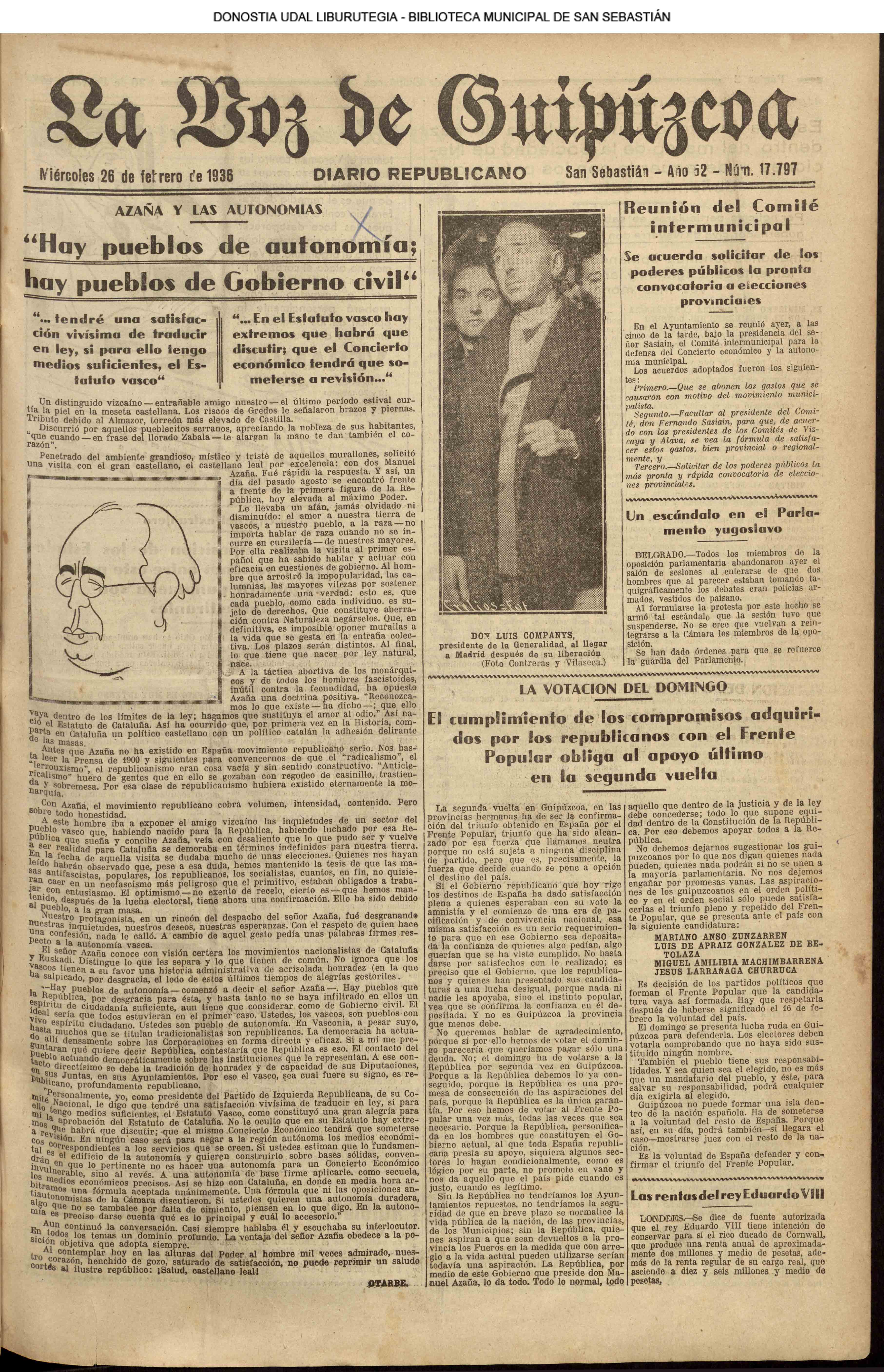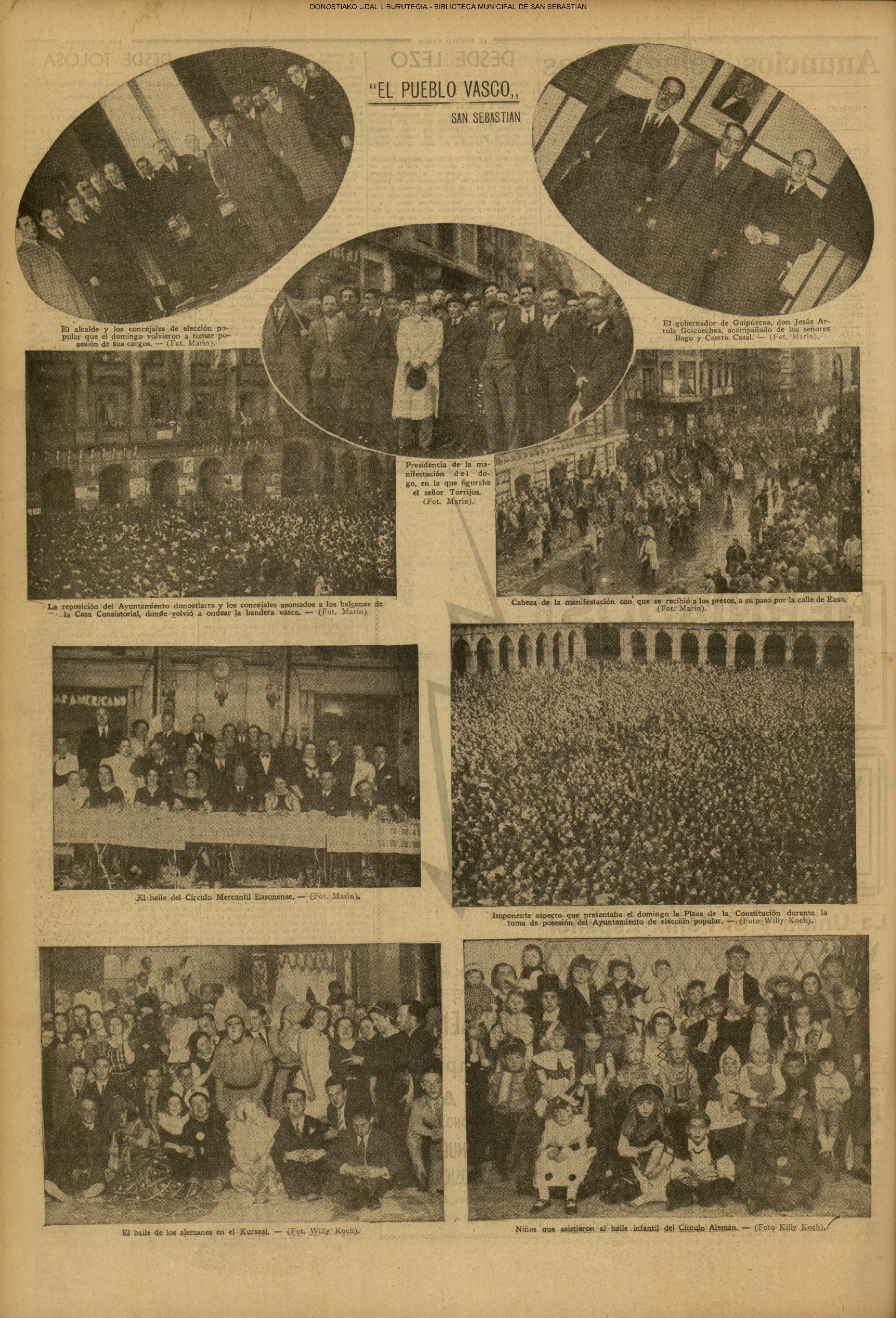 | 14 (DOMINGO) (*) .- En Azpeitia se celebró brillantemente el III Día del Nekazari. (*).- HOMENAJE A LA VEJEZ DEL MARINO. En la Delegación Marítima tuvo lugar el reparto de libretas a los ancianos arrantzales de Guipúzcoa. (*).- En el frontón Urumea, brillantísimo final del Campeonato de pelota de Euzkadi. | |||||||