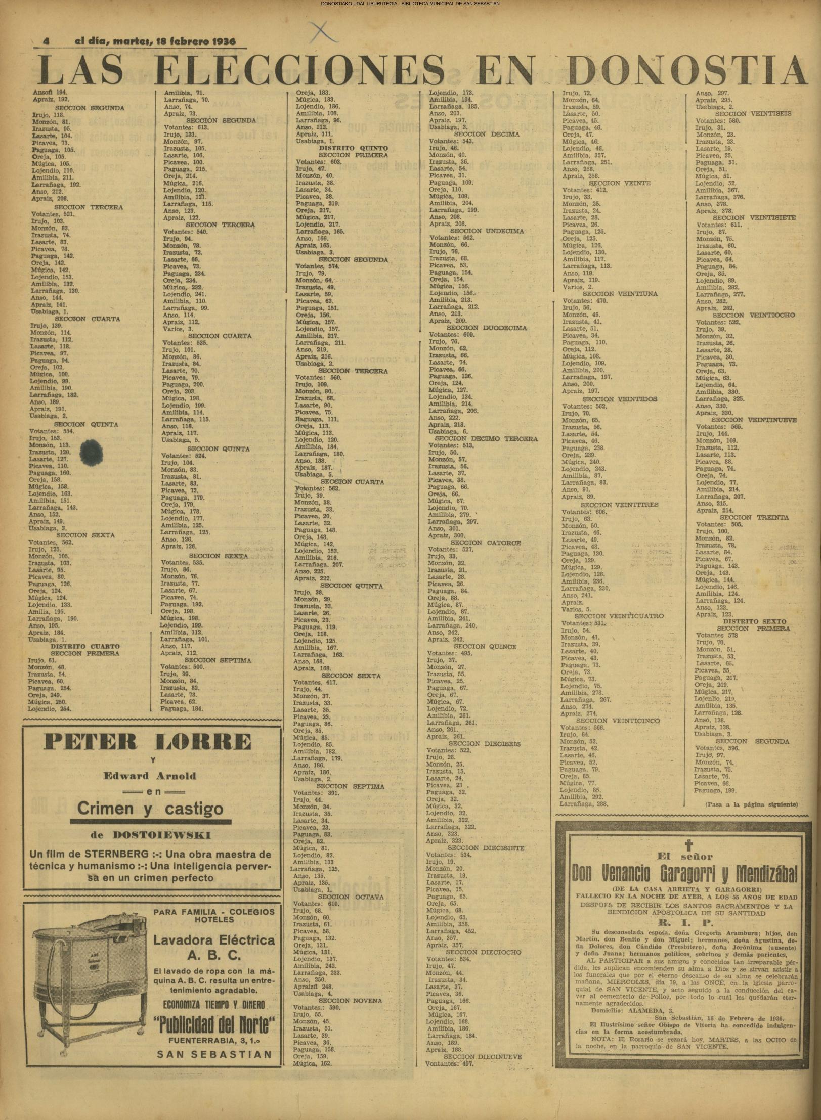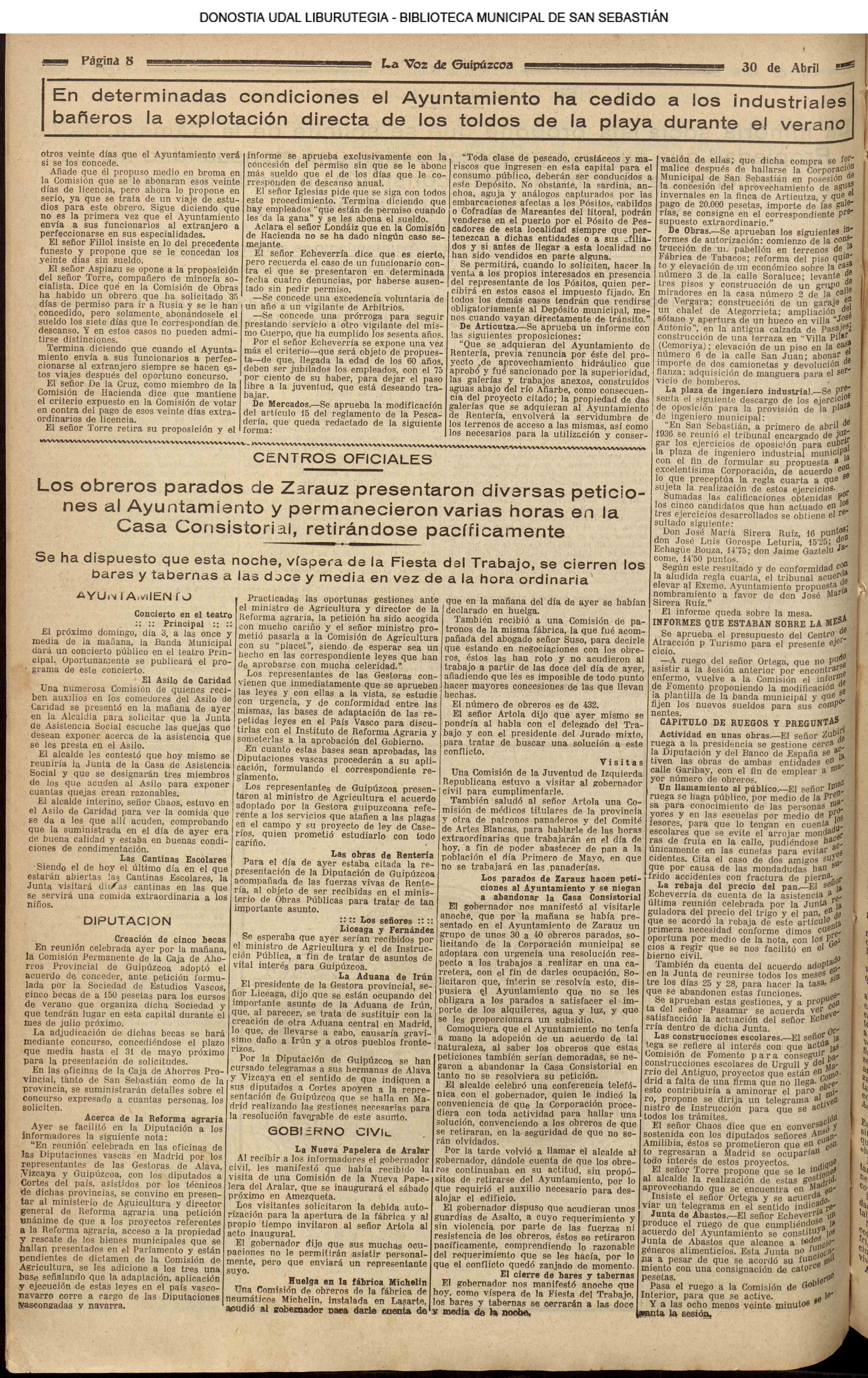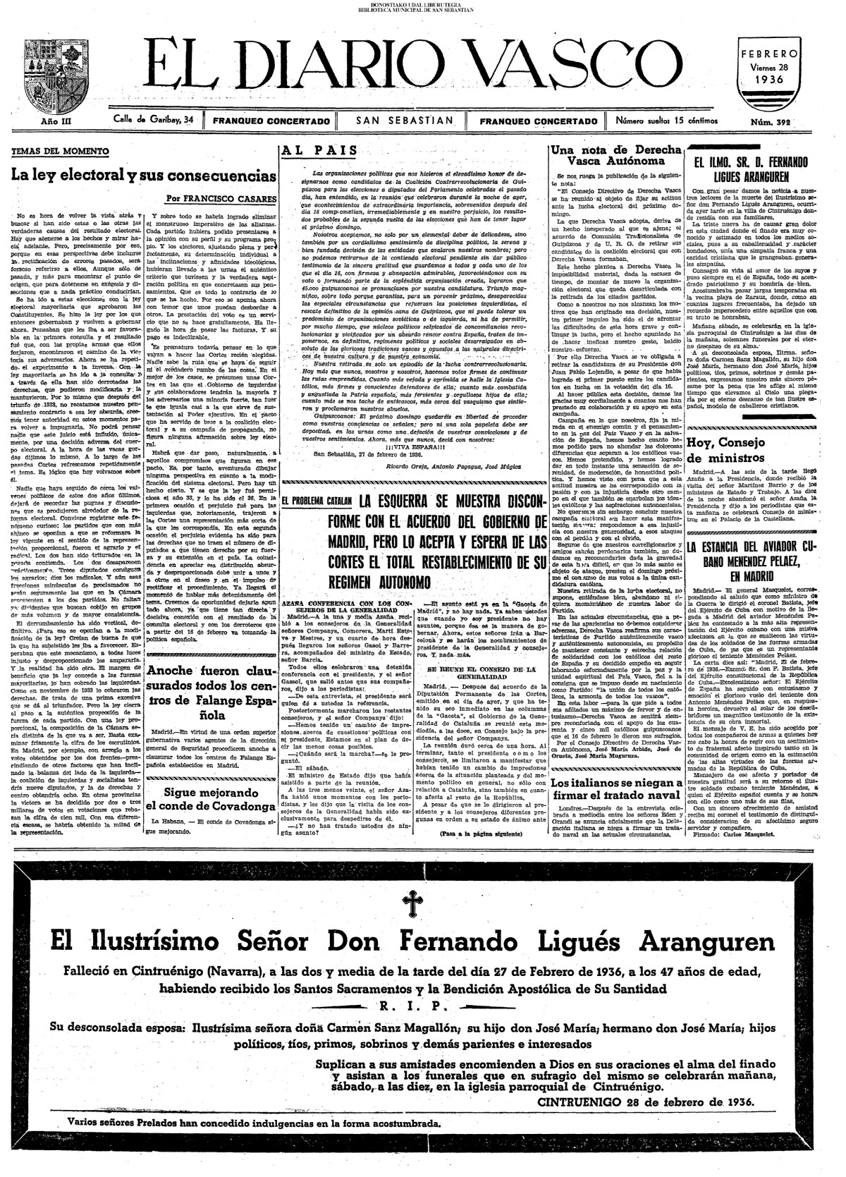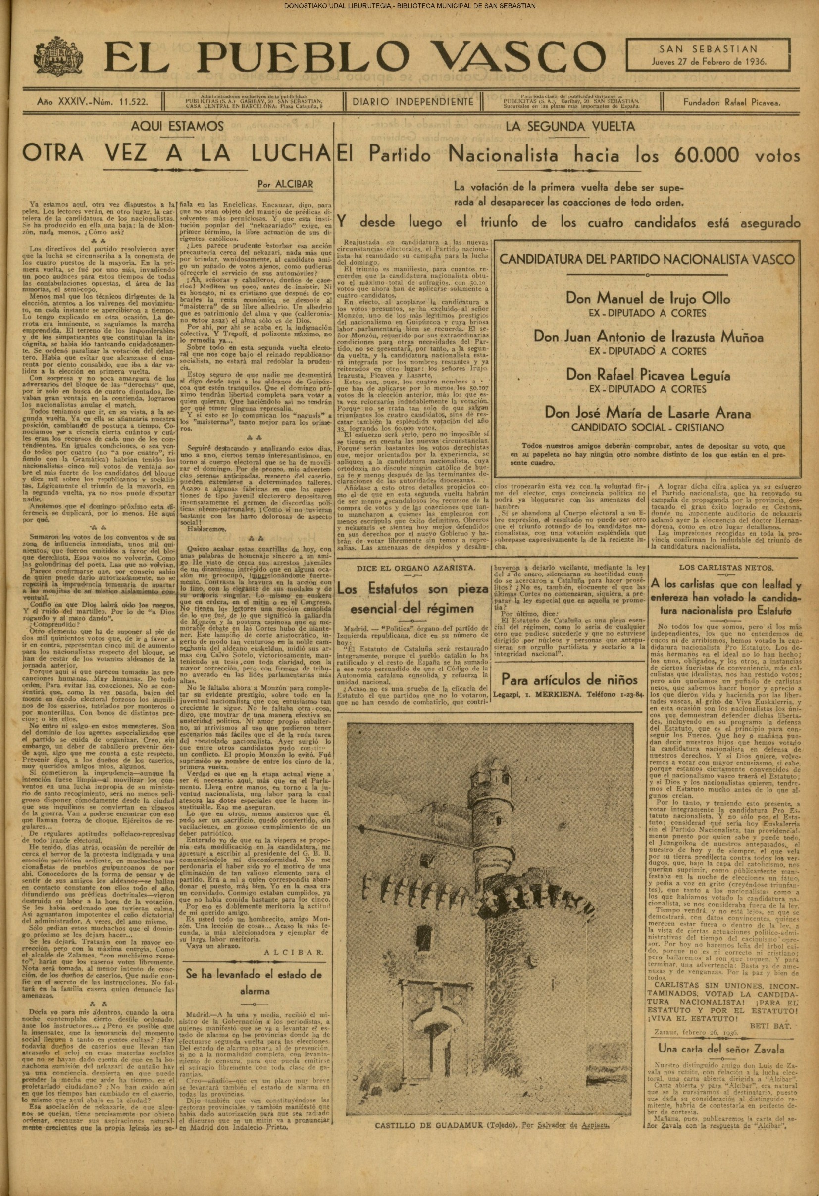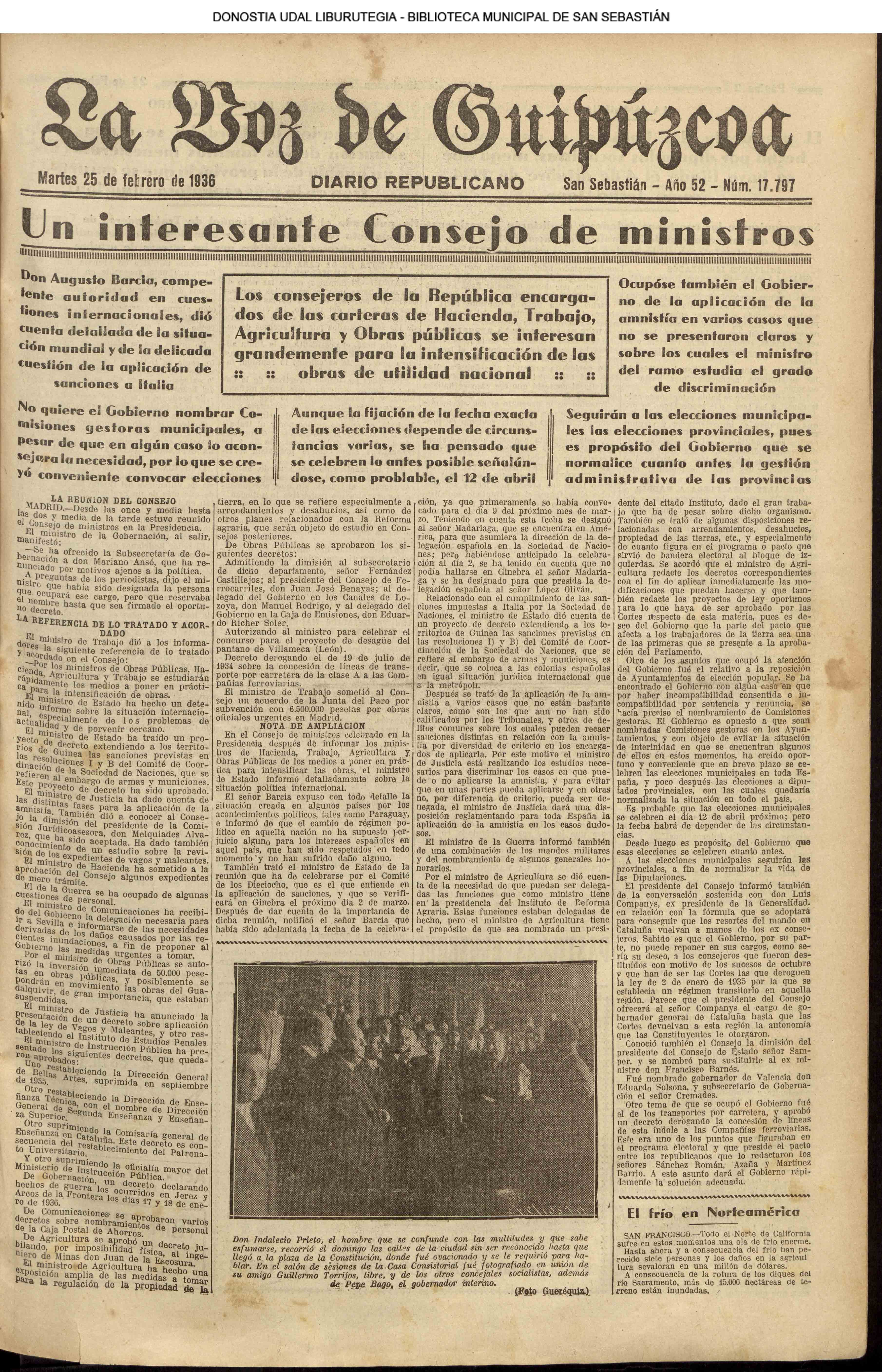 | 14 (DOMINGO) (*) .- En Azpeitia se celebró brillantemente el III Día del Nekazari. (*).- HOMENAJE A LA VEJEZ DEL MARINO. En la Delegación Marítima tuvo lugar el reparto de libretas a los ancianos arrantzales de Guipúzcoa. (*).- En el frontón Urumea, brillantísimo final del Campeonato de pelota de Euzkadi. | |||||||