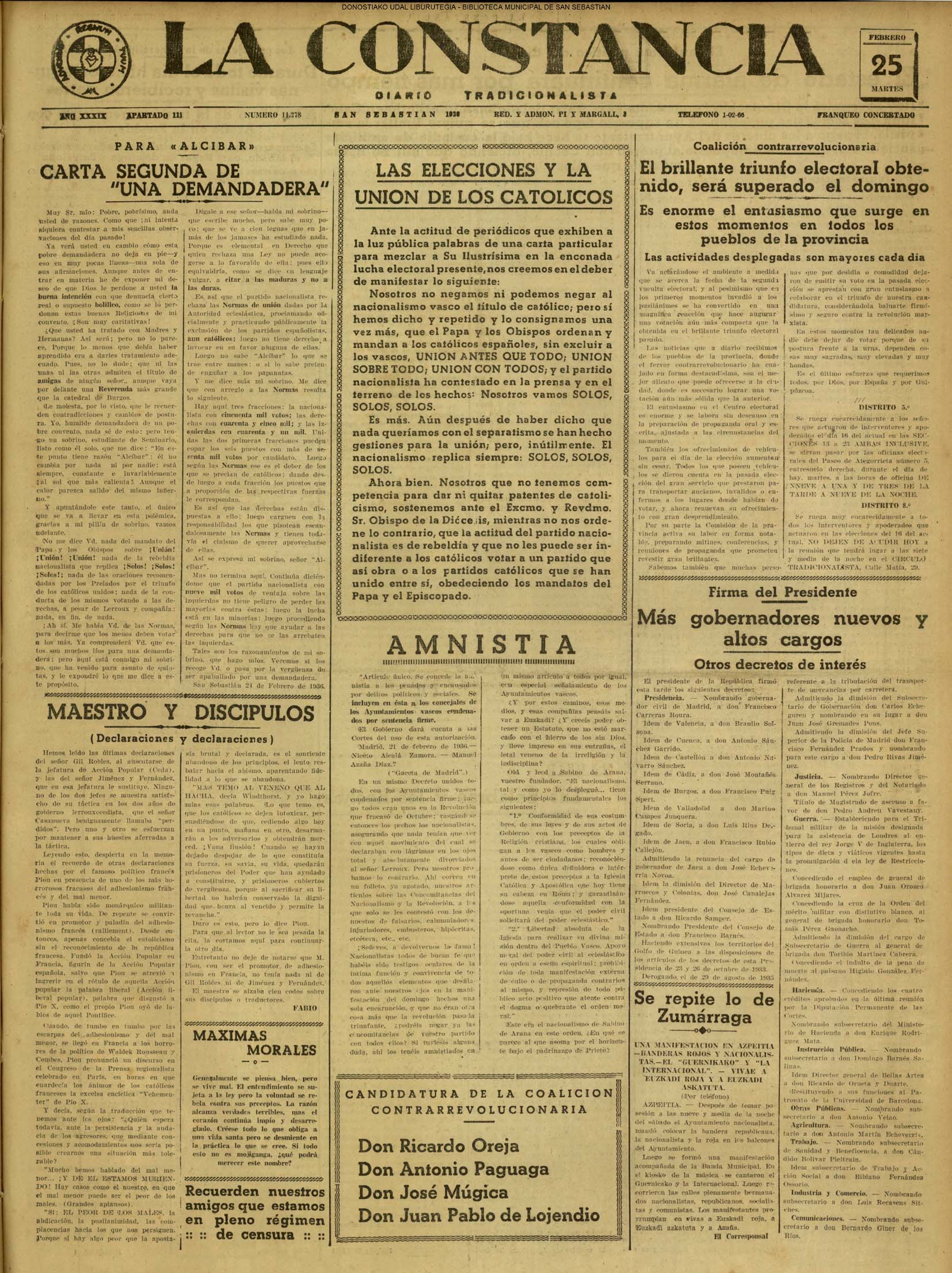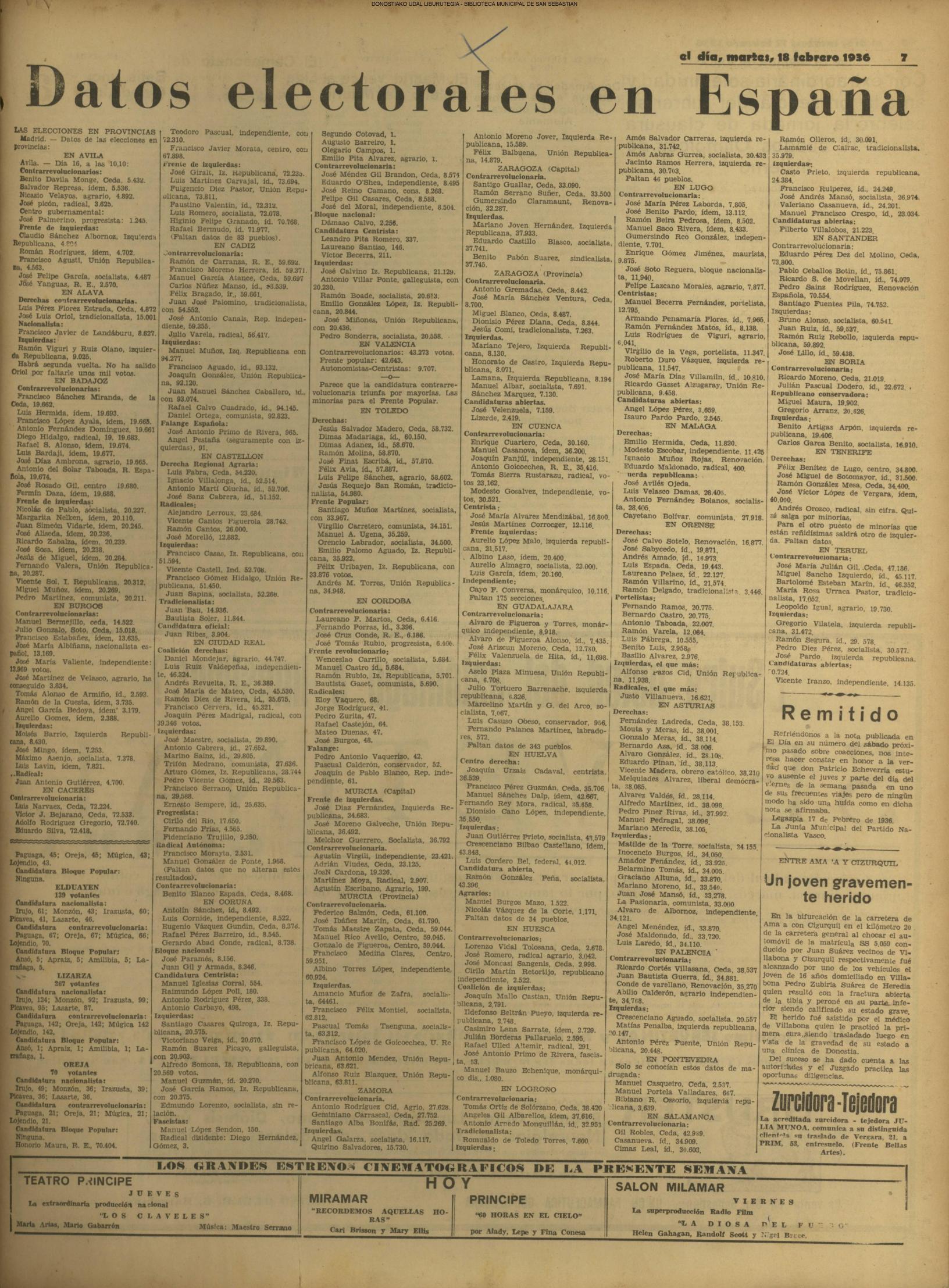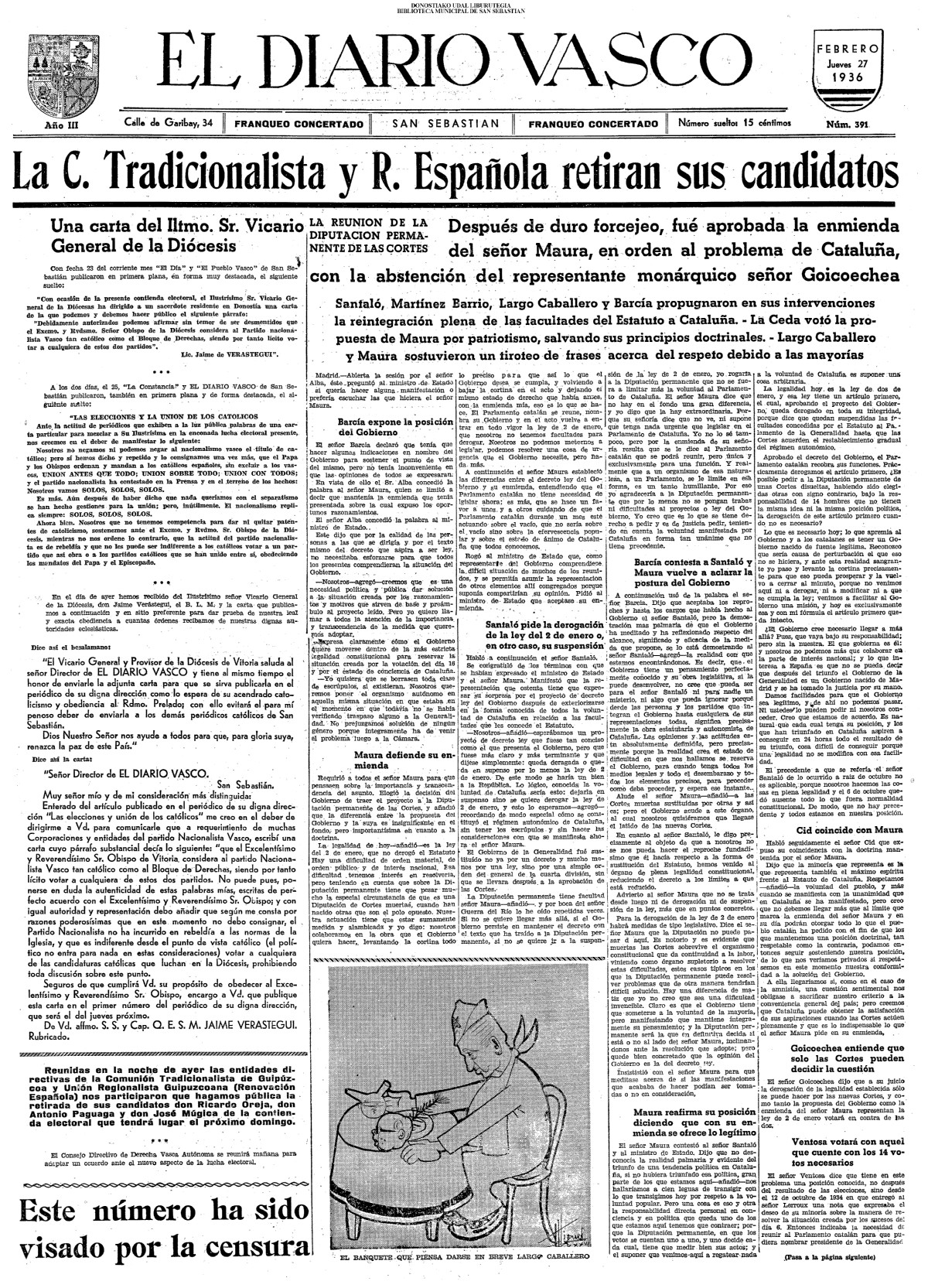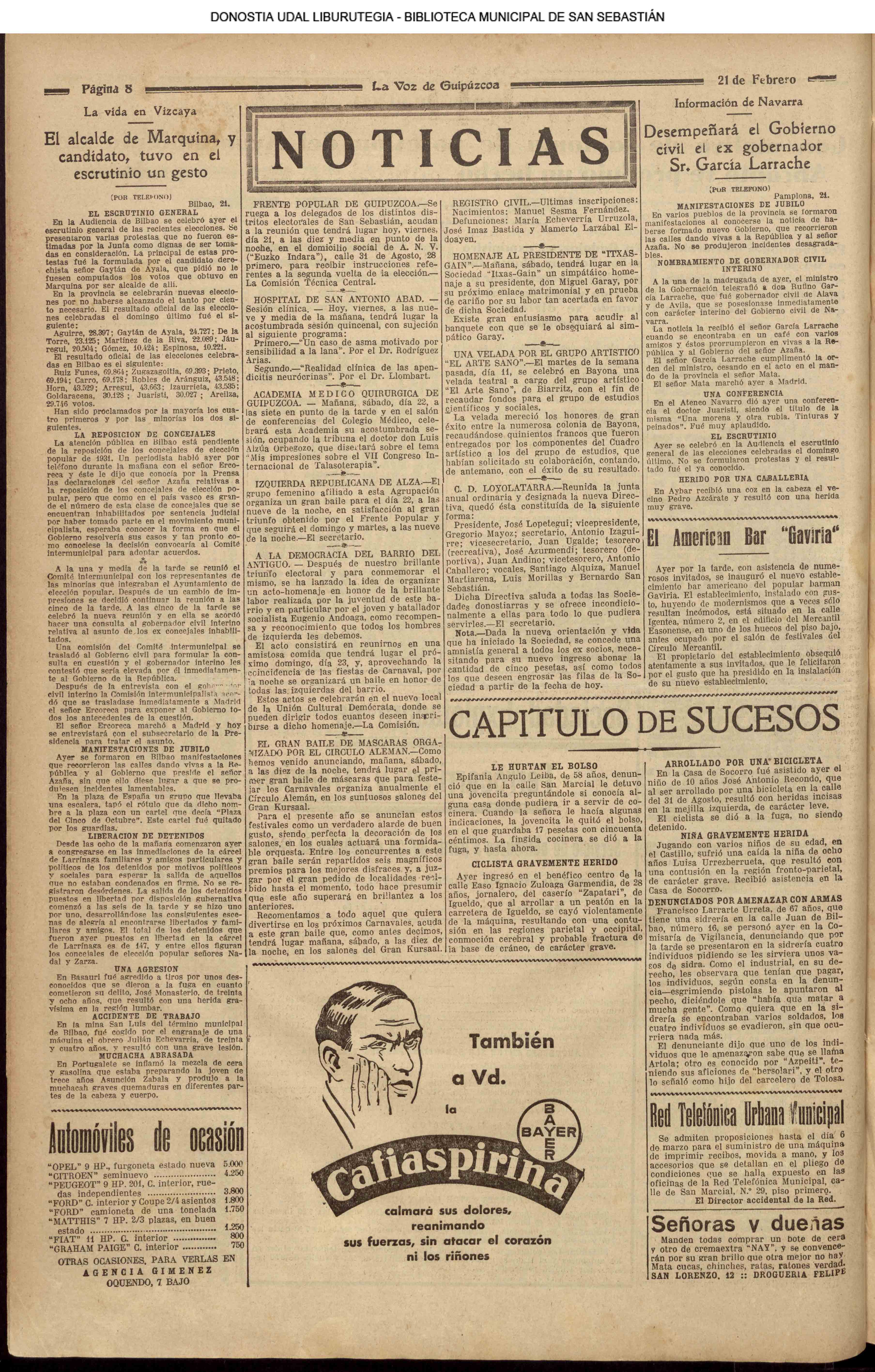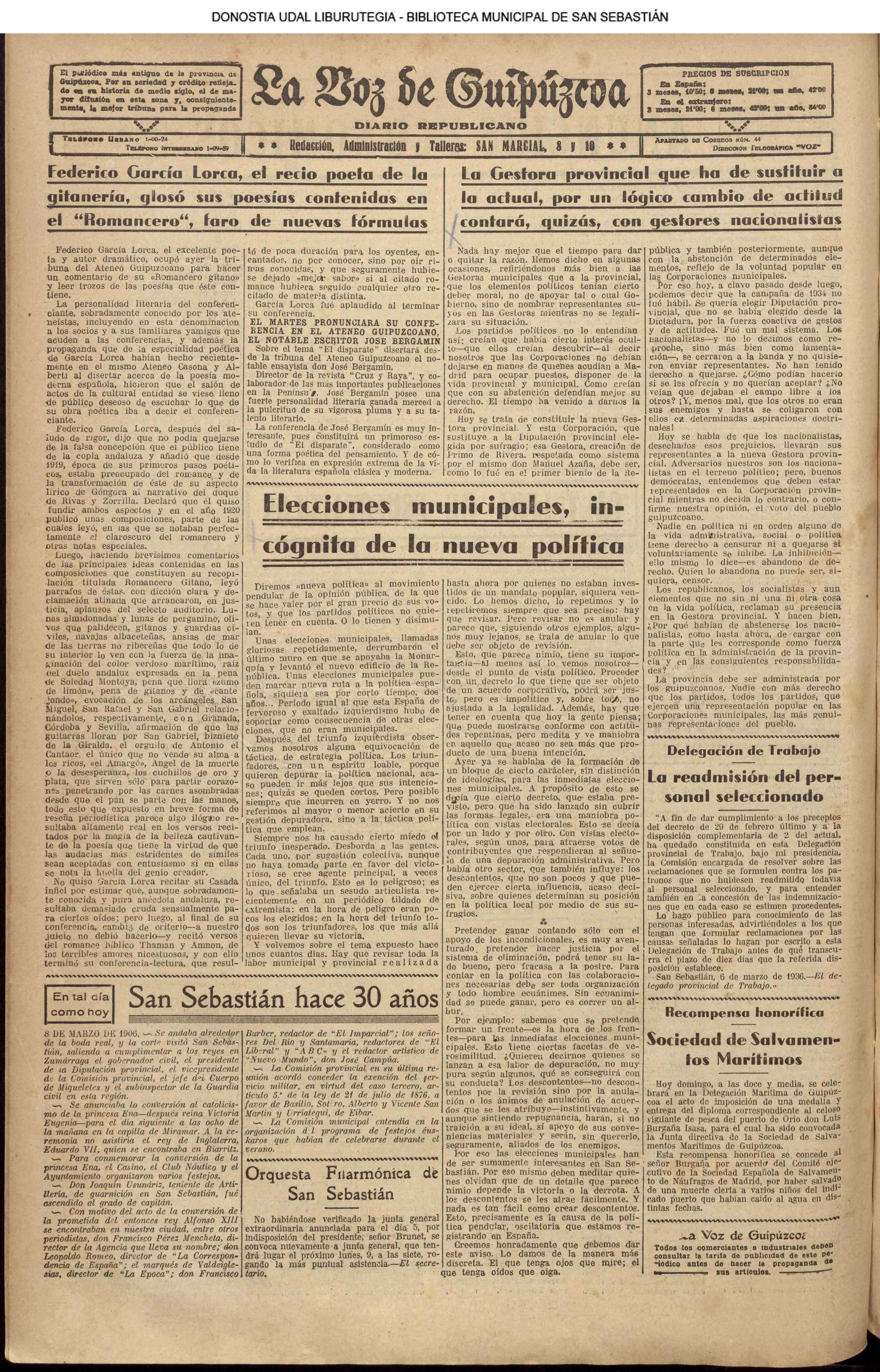 | 14 (DOMINGO) (*) .- En Azpeitia se celebró brillantemente el III Día del Nekazari. (*).- HOMENAJE A LA VEJEZ DEL MARINO. En la Delegación Marítima tuvo lugar el reparto de libretas a los ancianos arrantzales de Guipúzcoa. (*).- En el frontón Urumea, brillantísimo final del Campeonato de pelota de Euzkadi. | |||||||