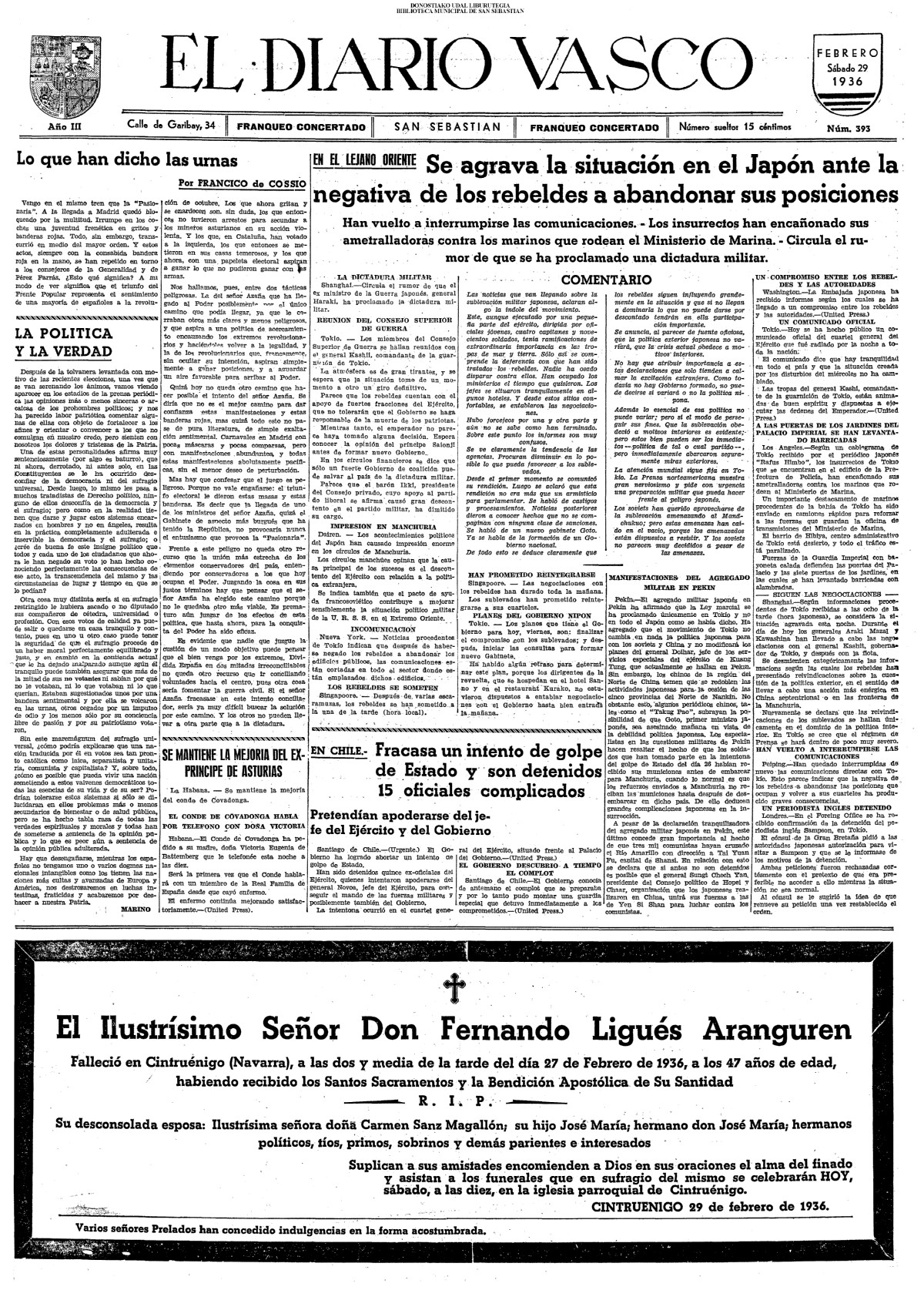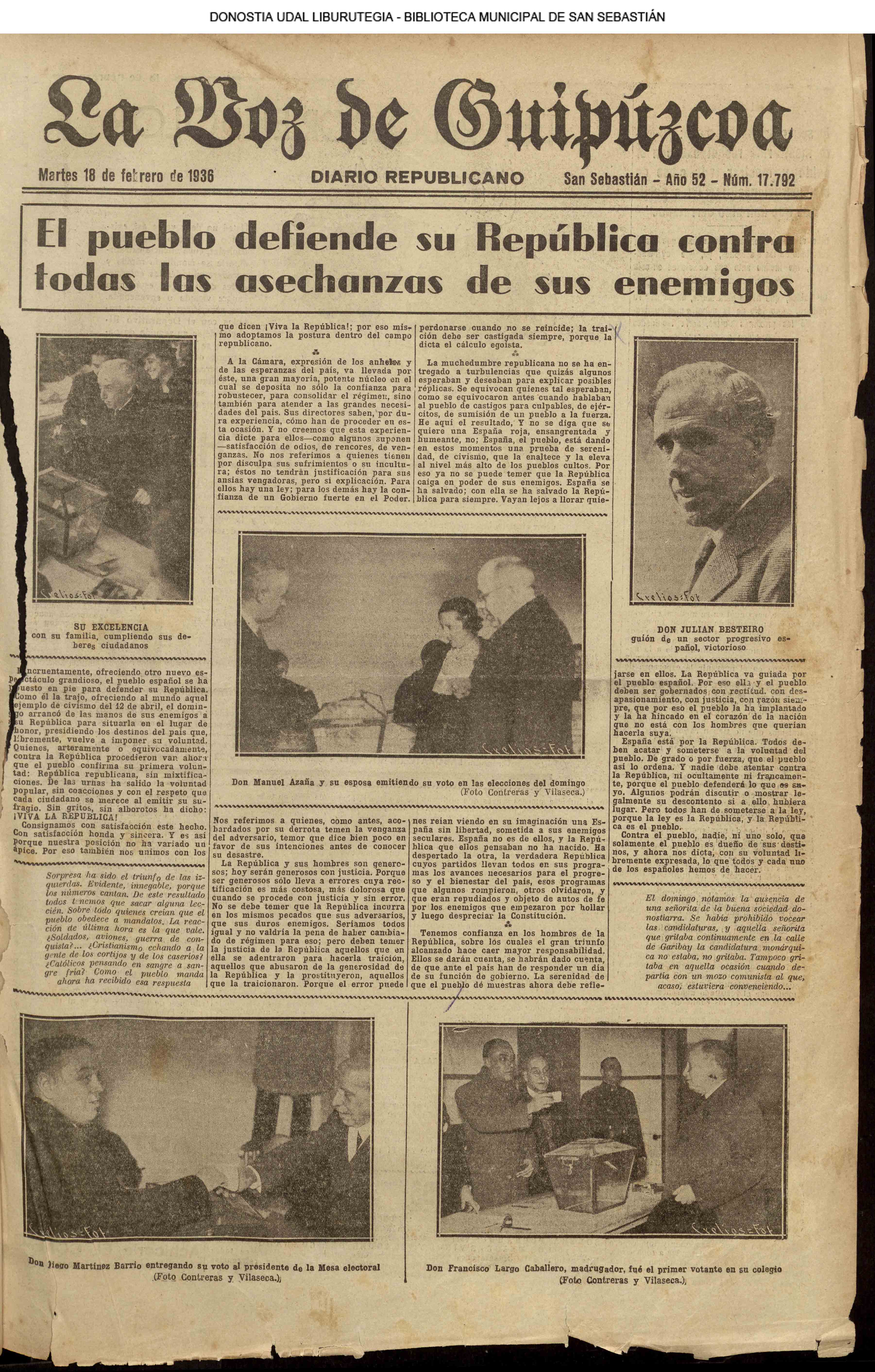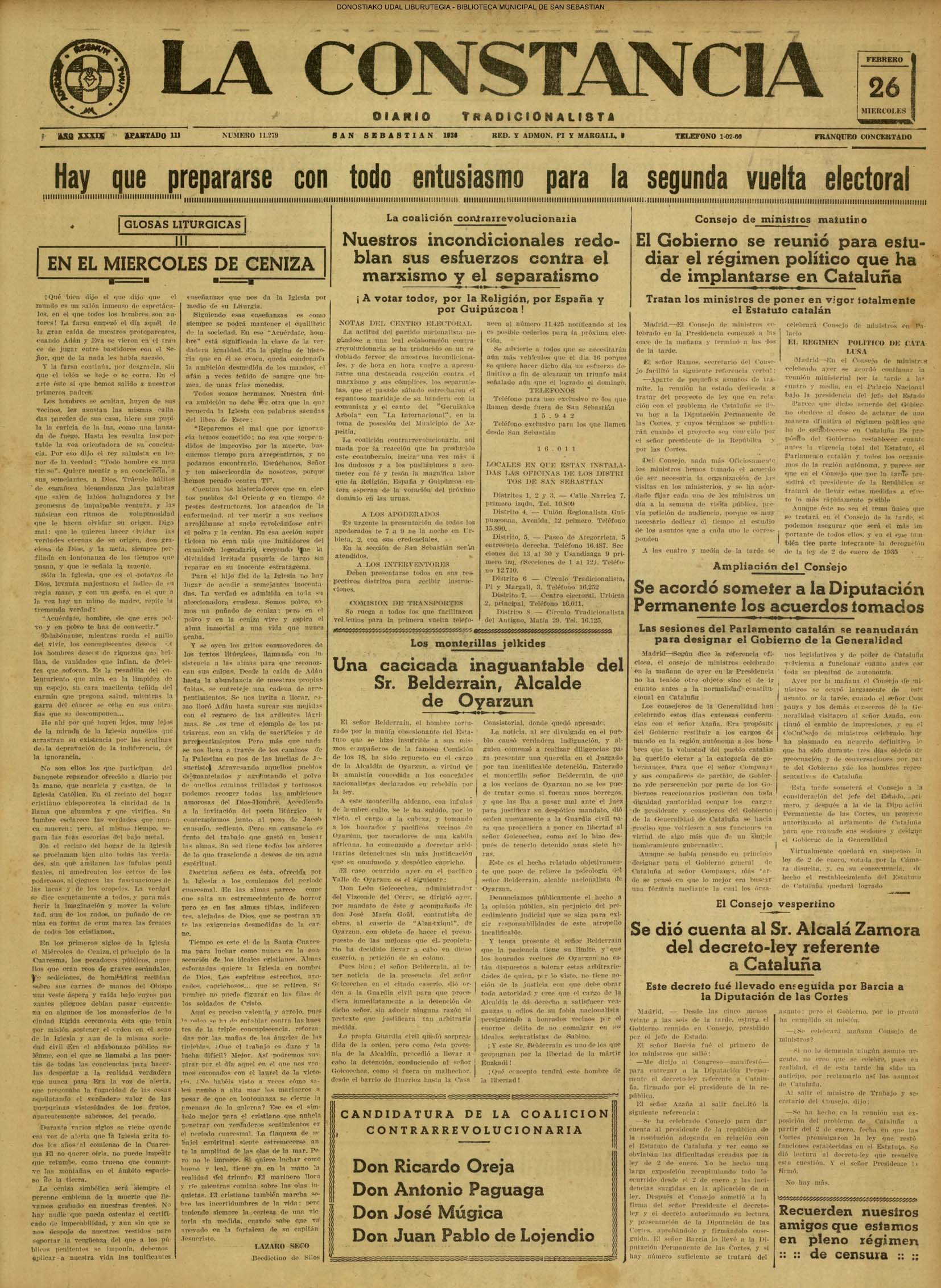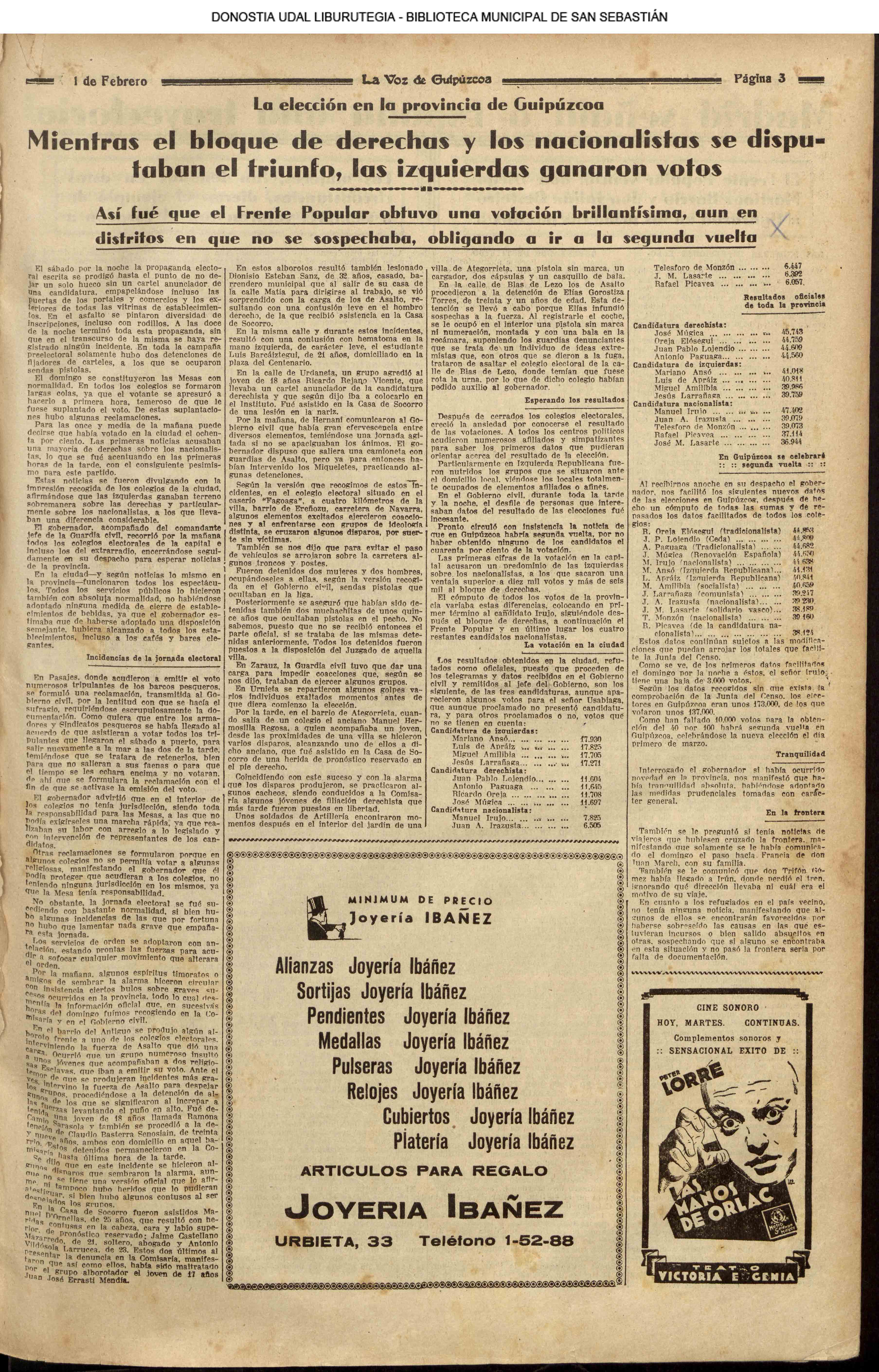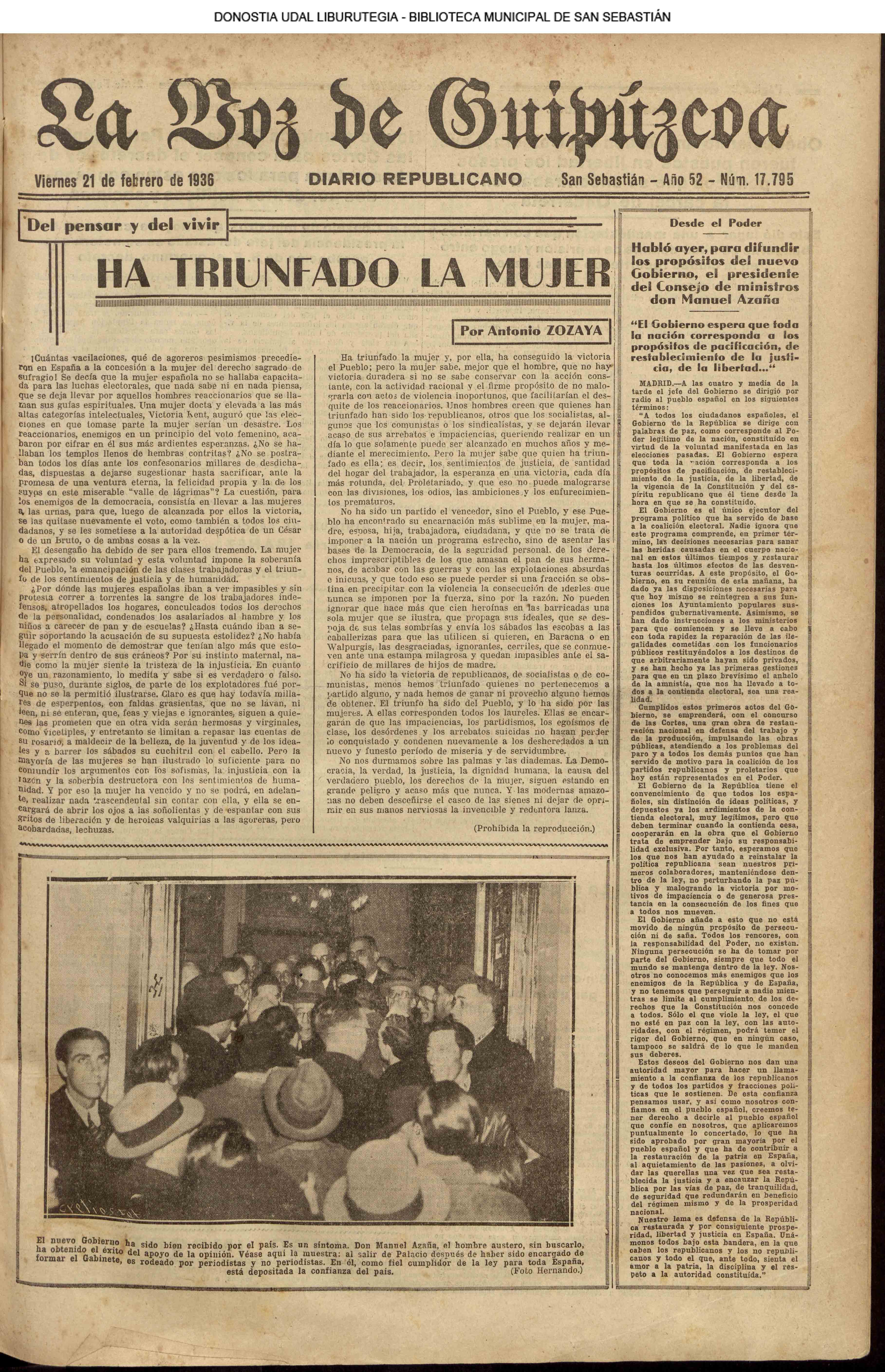 | 14 (DOMINGO) (*) .- En Azpeitia se celebró brillantemente el III Día del Nekazari. (*).- HOMENAJE A LA VEJEZ DEL MARINO. En la Delegación Marítima tuvo lugar el reparto de libretas a los ancianos arrantzales de Guipúzcoa. (*).- En el frontón Urumea, brillantísimo final del Campeonato de pelota de Euzkadi. | |||||||
