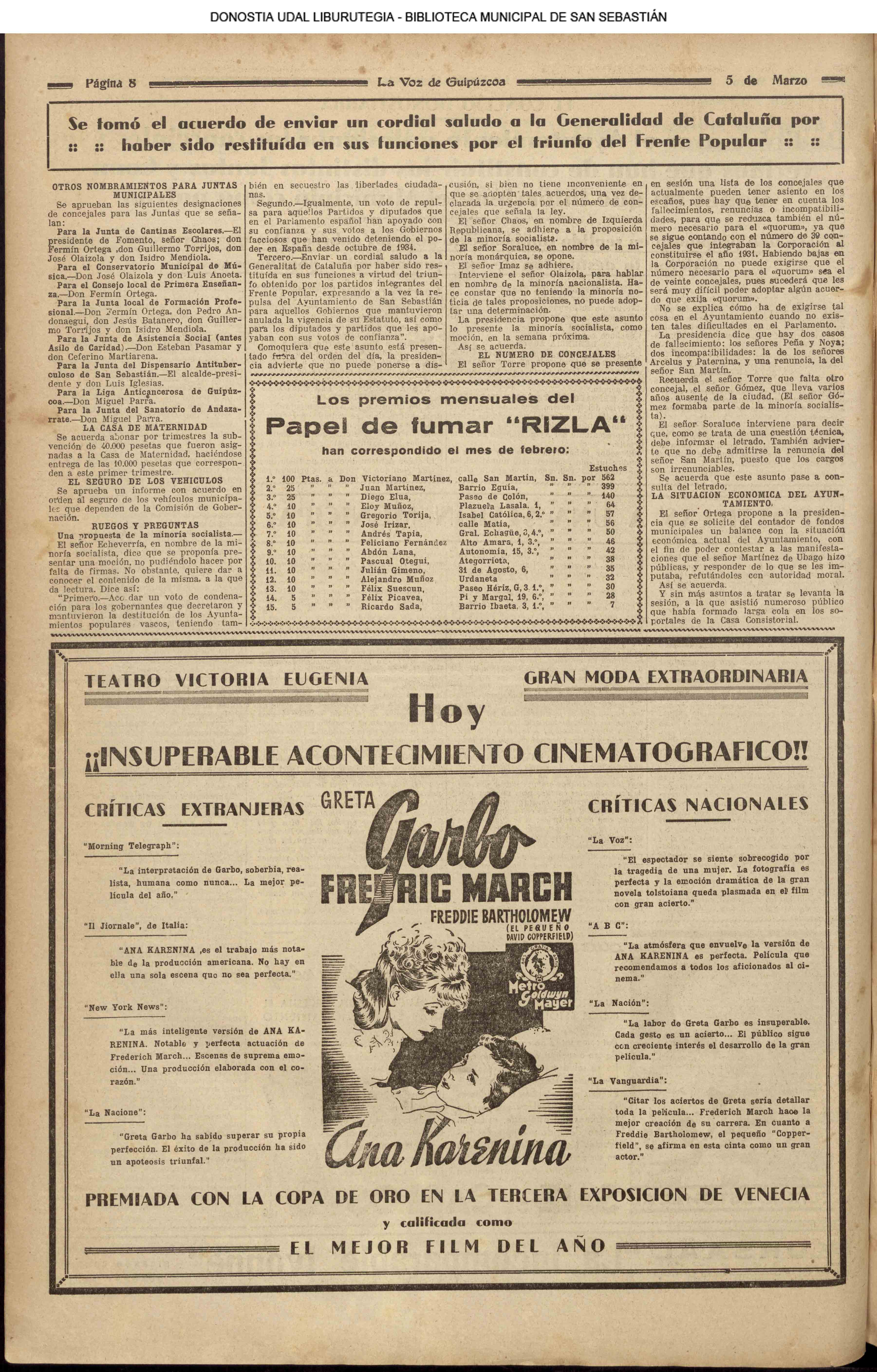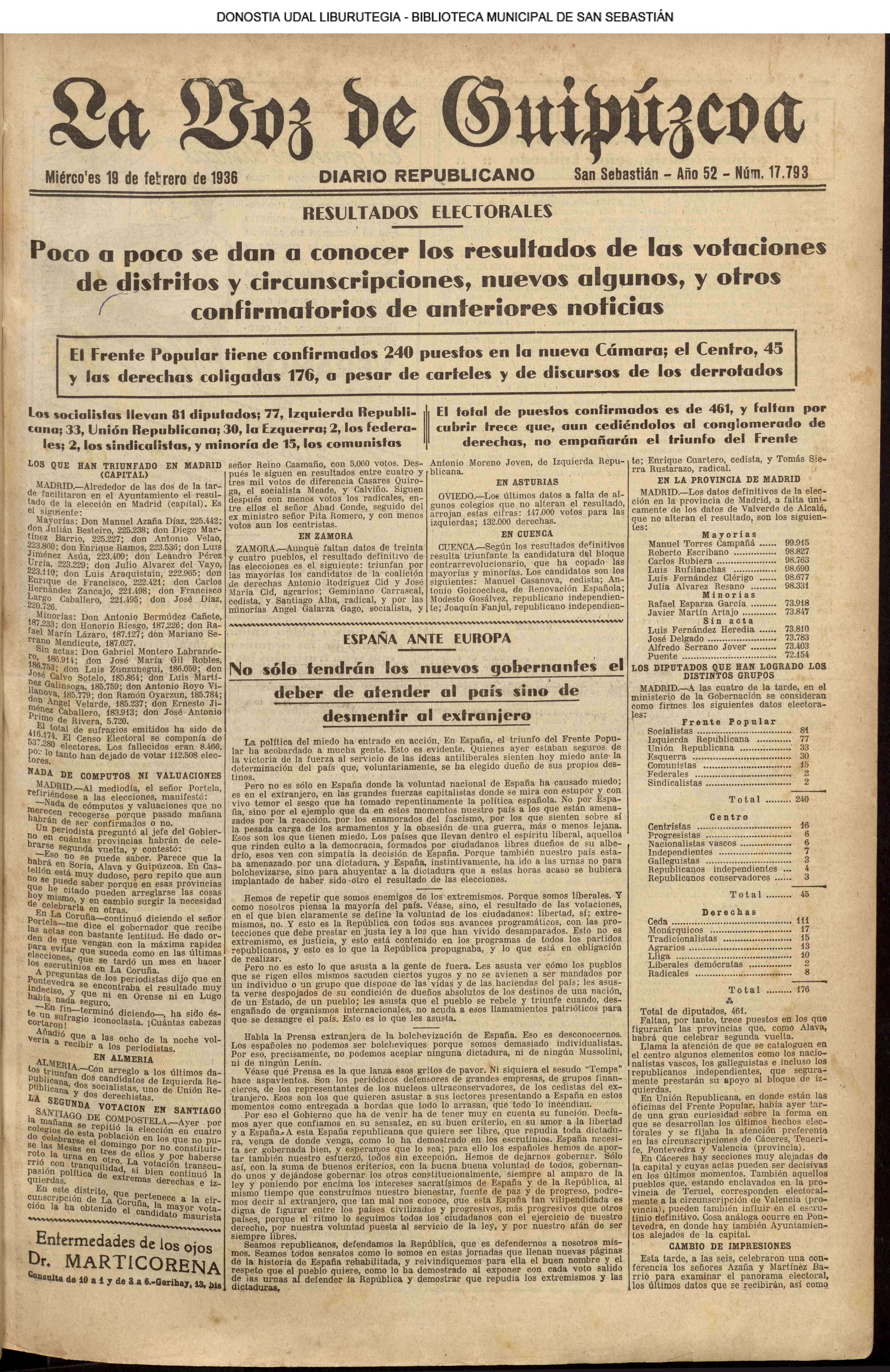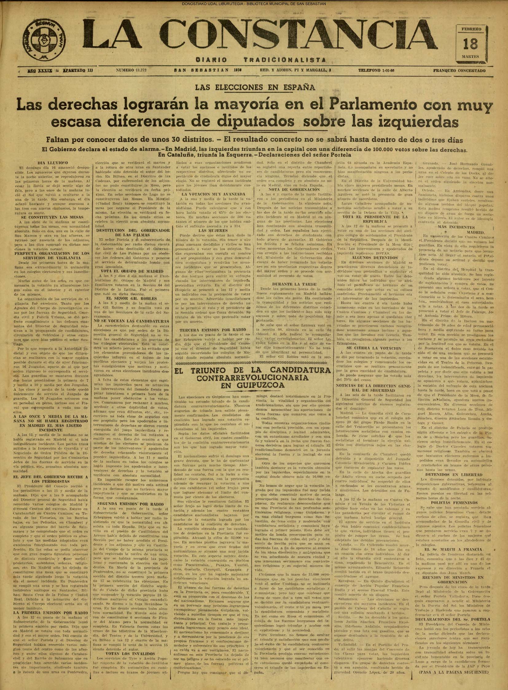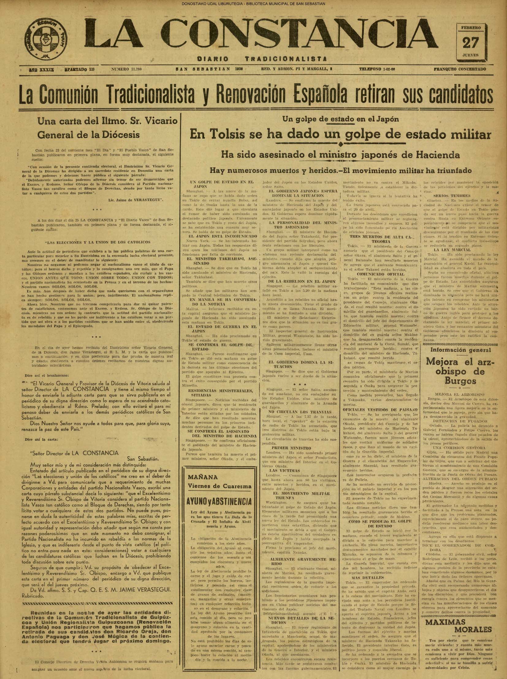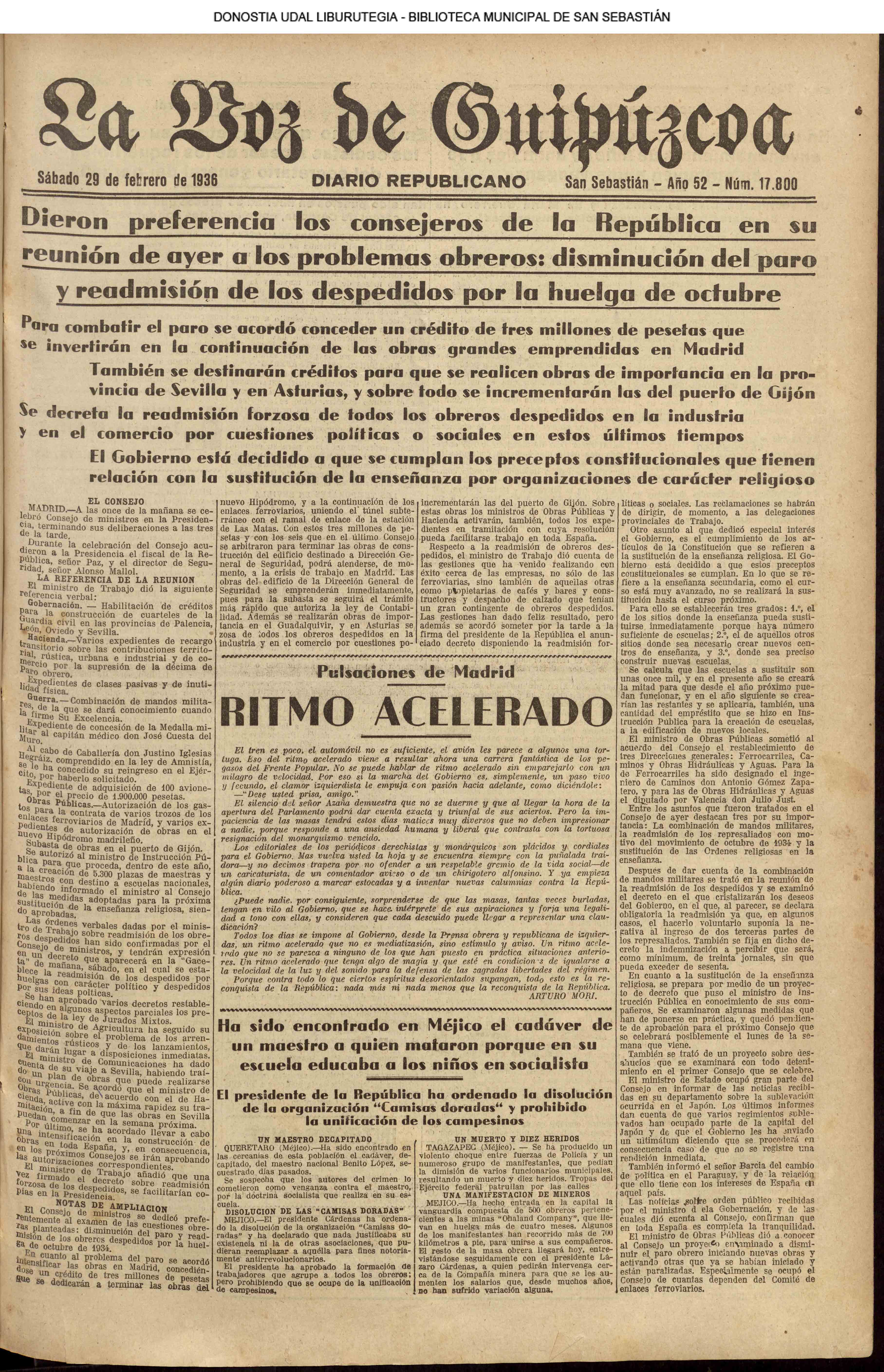 | 14 (DOMINGO) (*) .- En Azpeitia se celebró brillantemente el III Día del Nekazari. (*).- HOMENAJE A LA VEJEZ DEL MARINO. En la Delegación Marítima tuvo lugar el reparto de libretas a los ancianos arrantzales de Guipúzcoa. (*).- En el frontón Urumea, brillantísimo final del Campeonato de pelota de Euzkadi. | |||||||