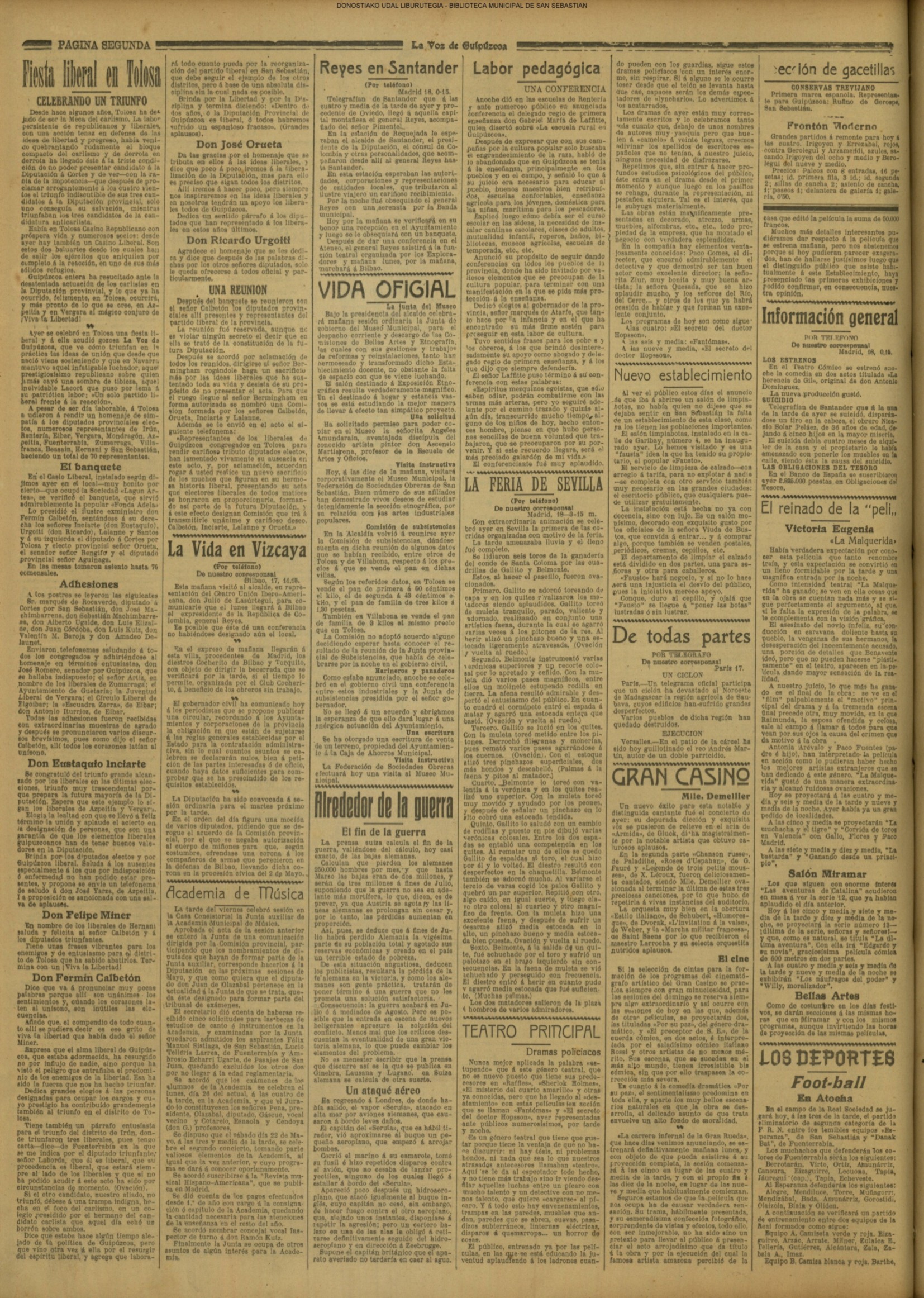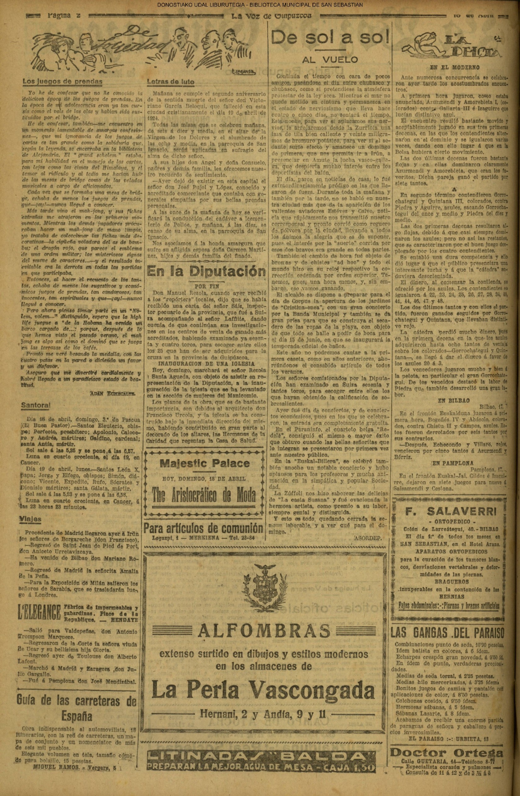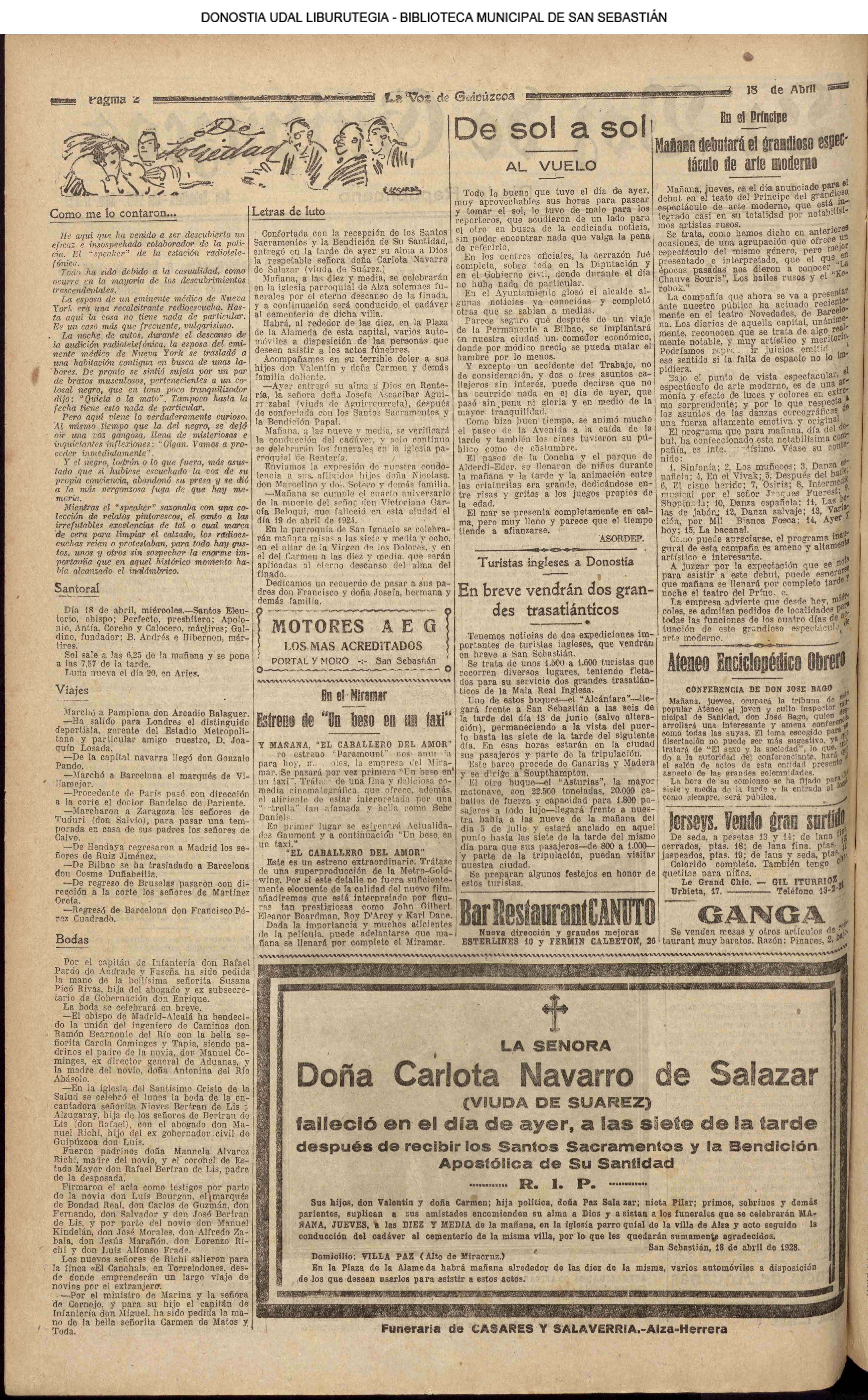 (1912) La Ciudad —fué miércoles— estuvo aquel día la mar de entretenida con un eclipse de sol y los vuelos del primer hidroavión —pilotado por el francés Paulhan— que los donostiarras veíamos. Con tales motivos, nuestras calles se vieron animadísimas.