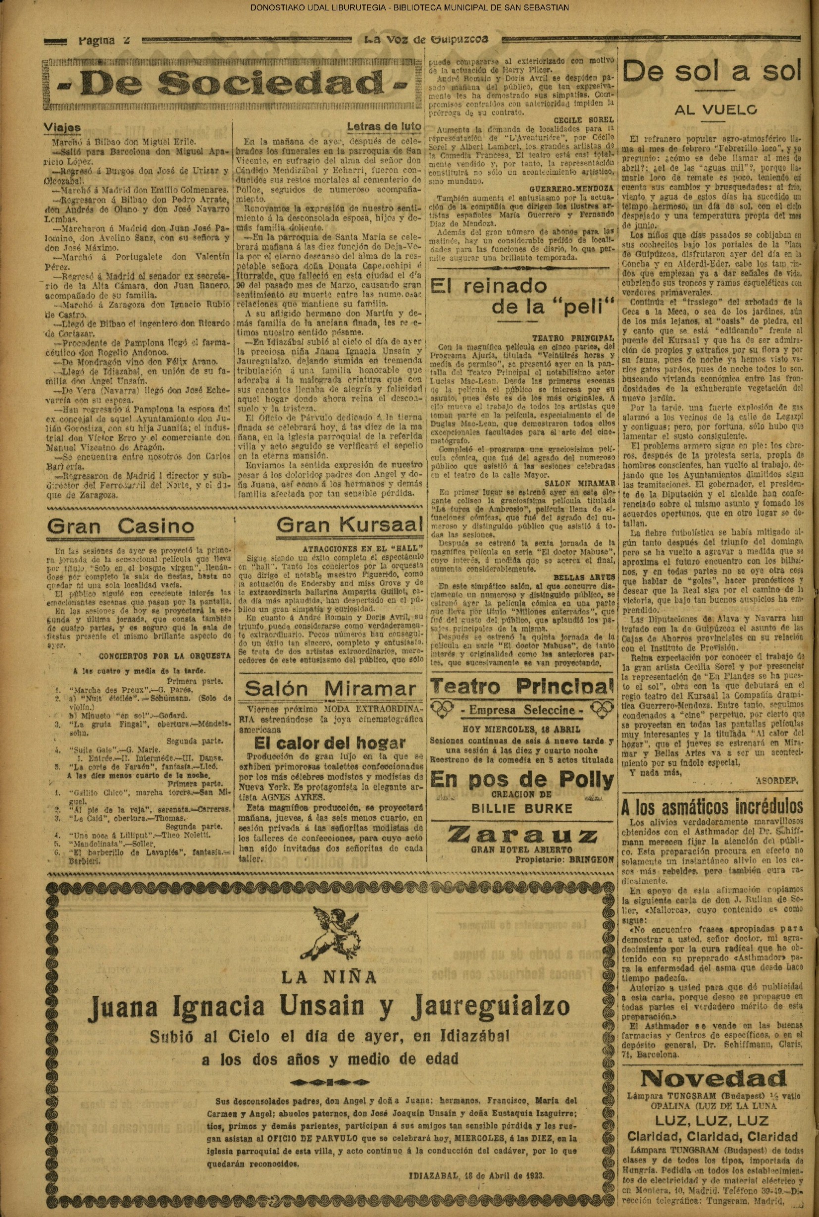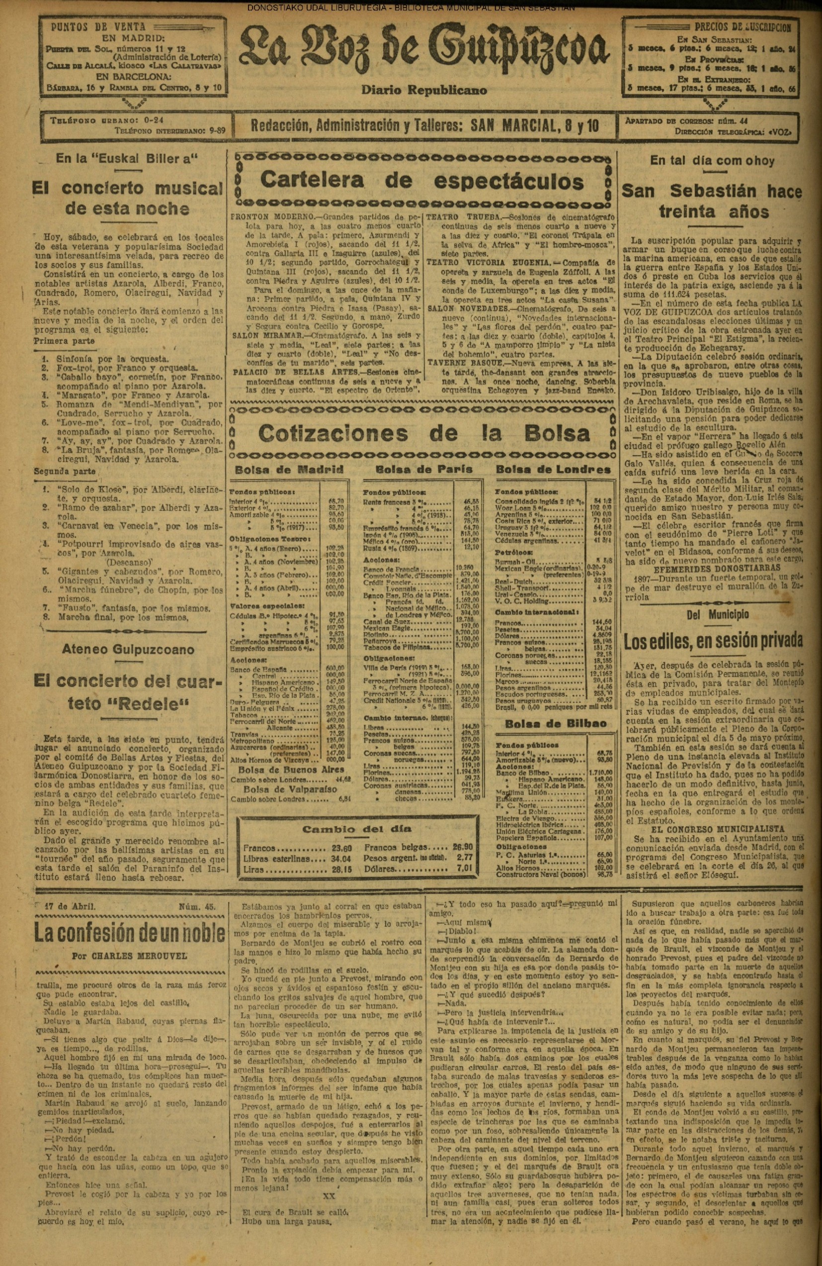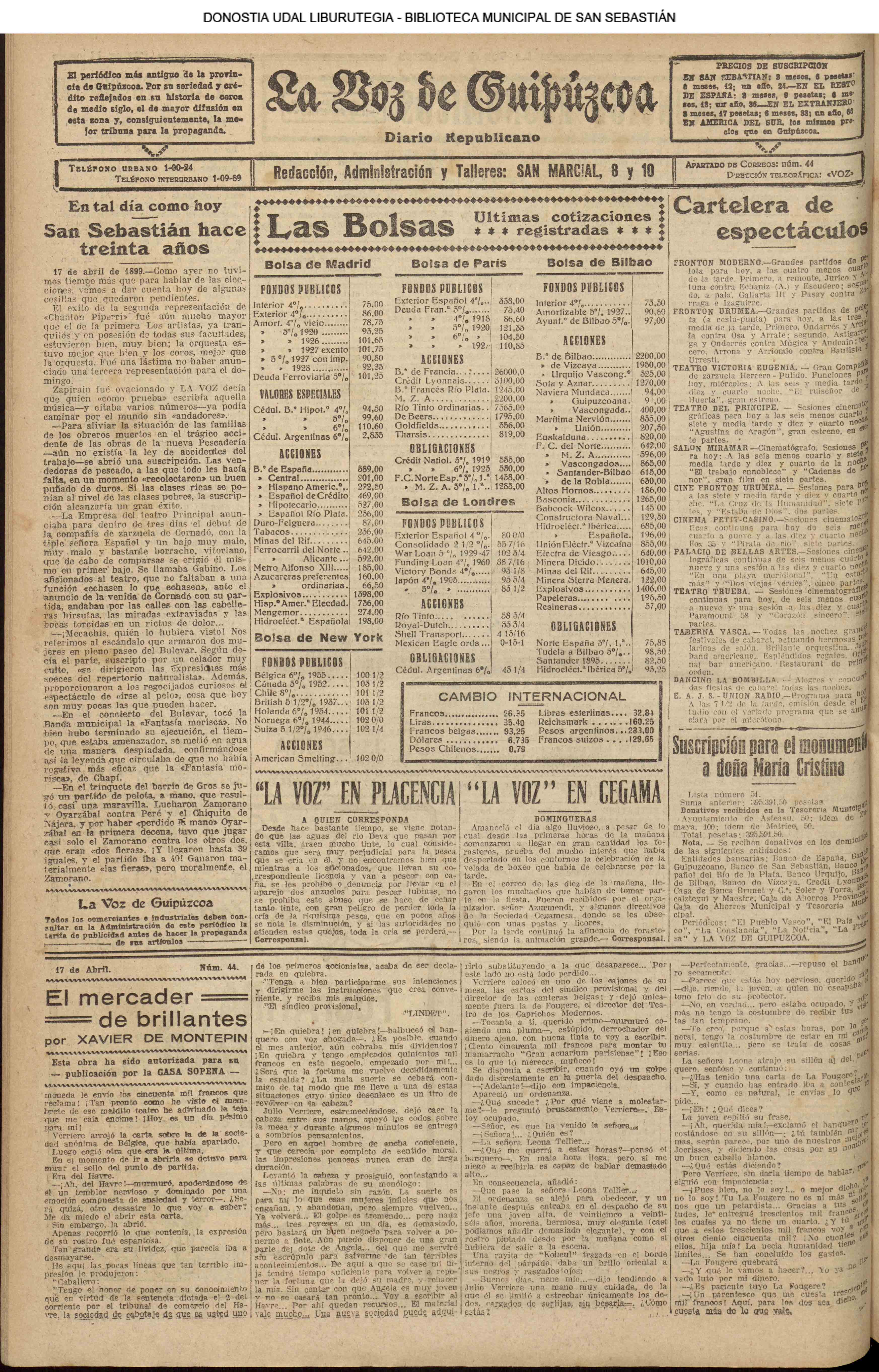 (1912) La Ciudad —fué miércoles— estuvo aquel día la mar de entretenida con un eclipse de sol y los vuelos del primer hidroavión —pilotado por el francés Paulhan— que los donostiarras veíamos. Con tales motivos, nuestras calles se vieron animadísimas.