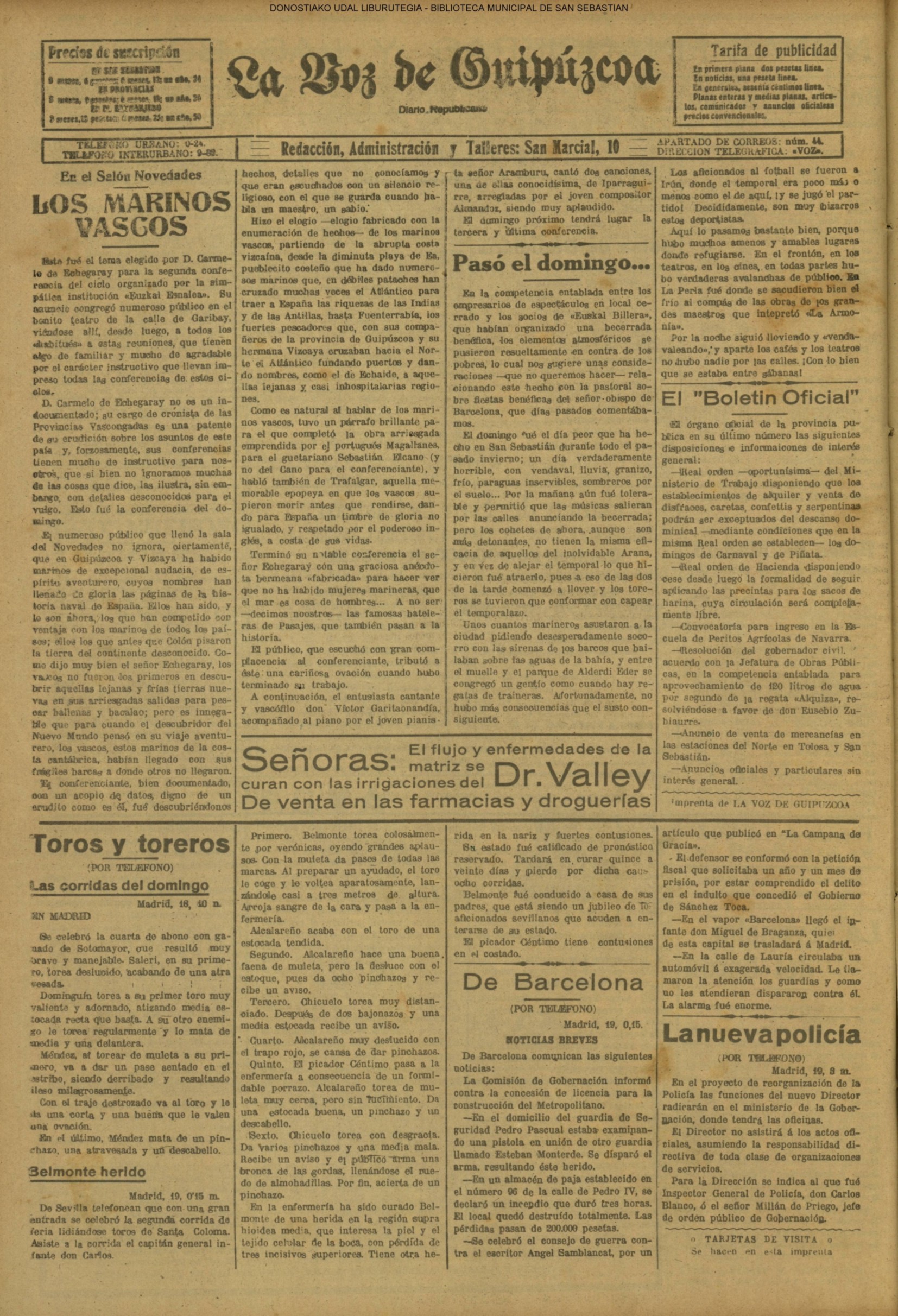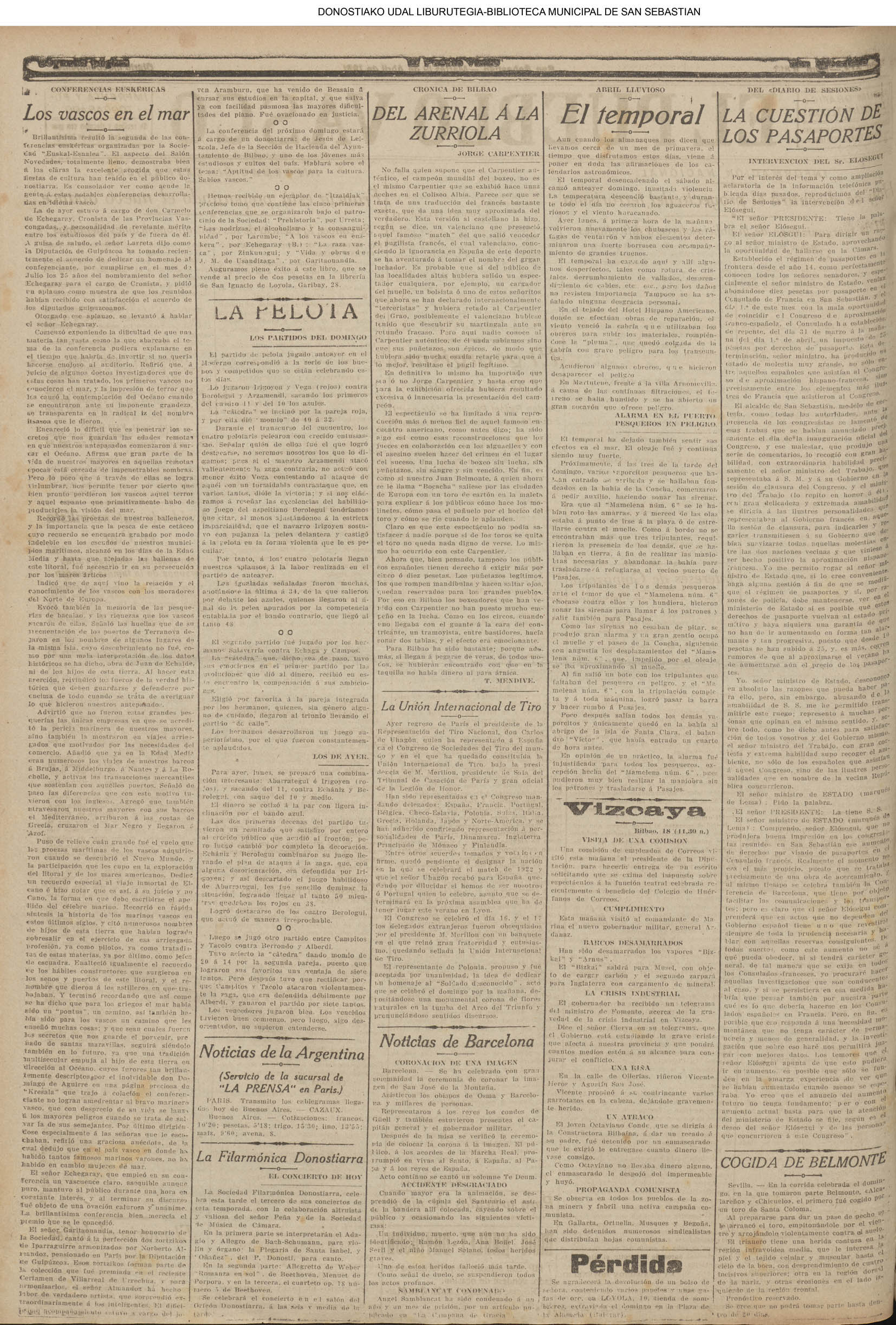 (1921) Organizada por la institución «Euskal-Esnalea», D. Carmelo de Echegaray pronunció en el Salón Novedades una interesante conferencia acerca de «Los marinos vascos».(La Voz de Guipúzcoa)(El Pueblo Vasco)(La Constancia)