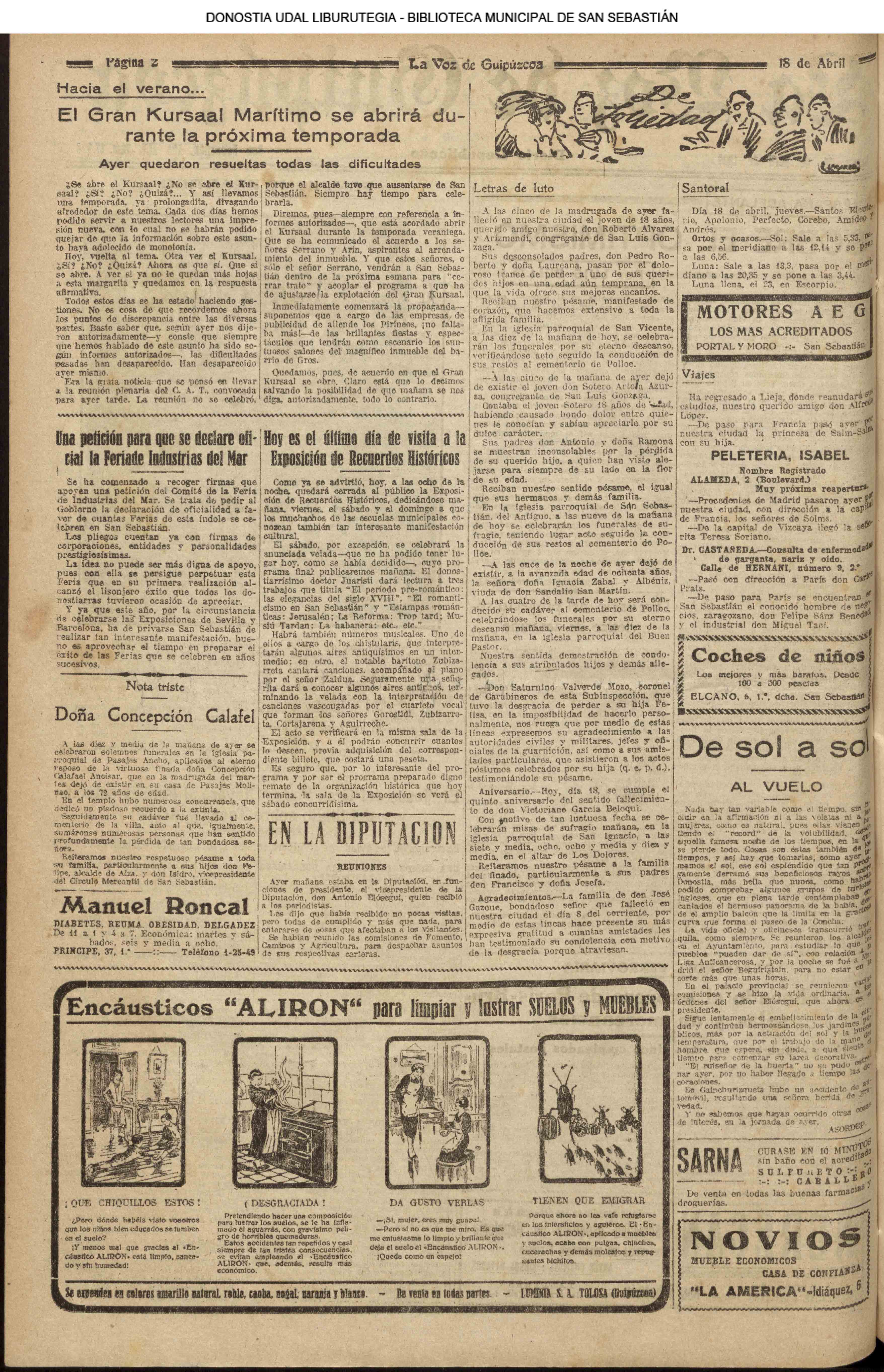 (1912) Sin Sebastián vio por primera vez volar un hidroplano: el del aviador francés Paulhan, que vino por la mañana, muy temprano, procedente de Hendaya, aterrizando en Ondarreta.Evolucionó sobre la Concha y alta mar, y durante la tarde voló con él don Felipe Azcona, a la sazón presidente del Aero Club y años más tarde Alcalde de la Ciudad.