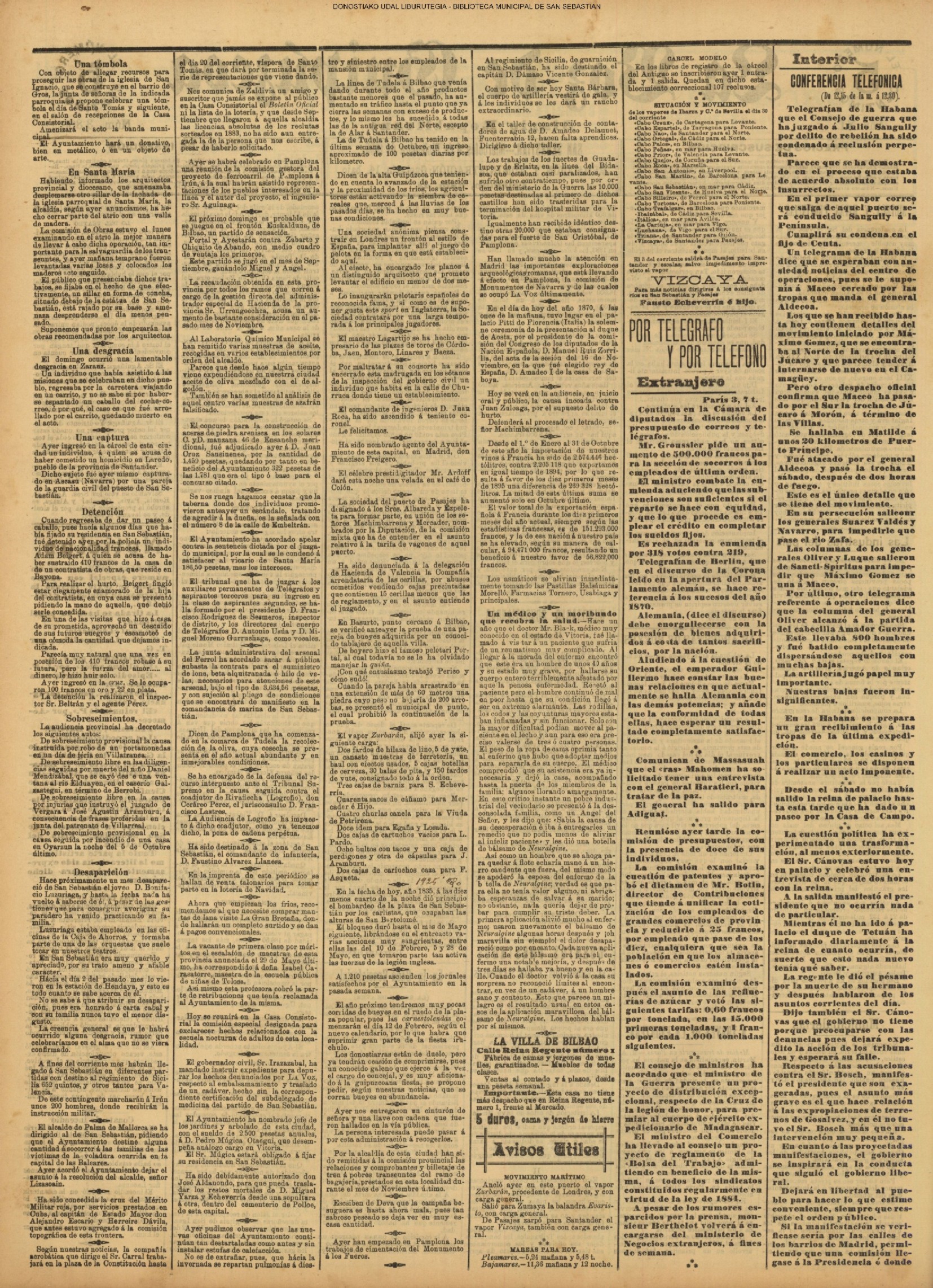 22 de Diciembre El Ayuntamiento recibe avisos confidenciales de los días 20 y 21. Se preparan cuatro cañones en Irún, para traerlos delante de esa Plaza, e impedir la entrada de buques en su puerto. Cuentan los facciosos con los cañones que han de tomar en Guetaria y Lequeitio, para atacar de firme a San Sebastián. Ayer había un Batallón en Irún, uno en Hernani y tres en Tolosa. En Pasajes han estrechado las comunicaciones de los habitantes con los buques franceses, con mucho rigor. El Ayuntamiento toma en seria consideración estas noticias y ha observado que hace días no se presenta ninguno de los Vapores, cuando su cooperación es más necesaria que nunca. Que el Gobernador va a despachar una lancha con pliegos a Santander; que se envíen notas con el verdadero estado de las cosas. |