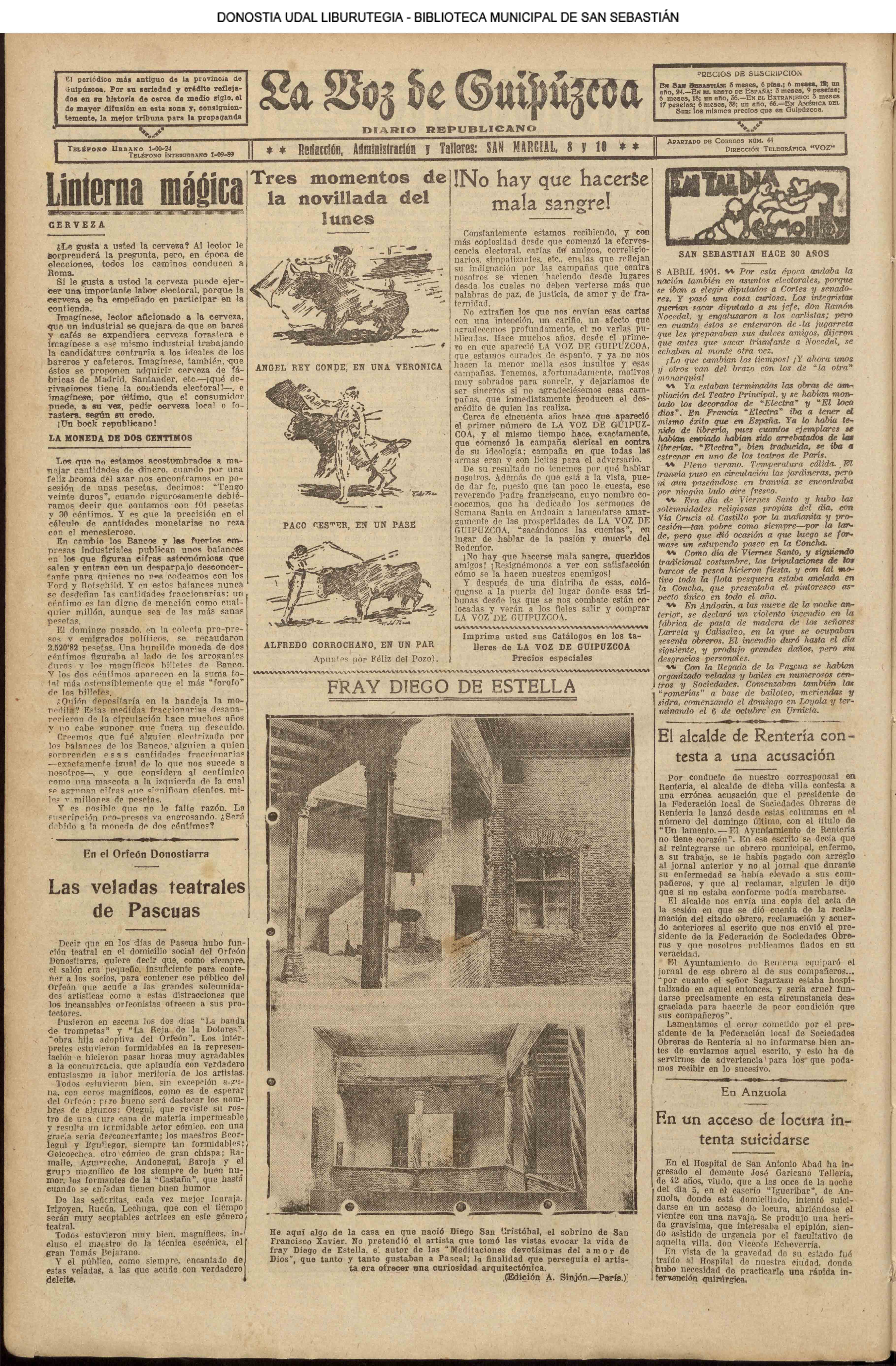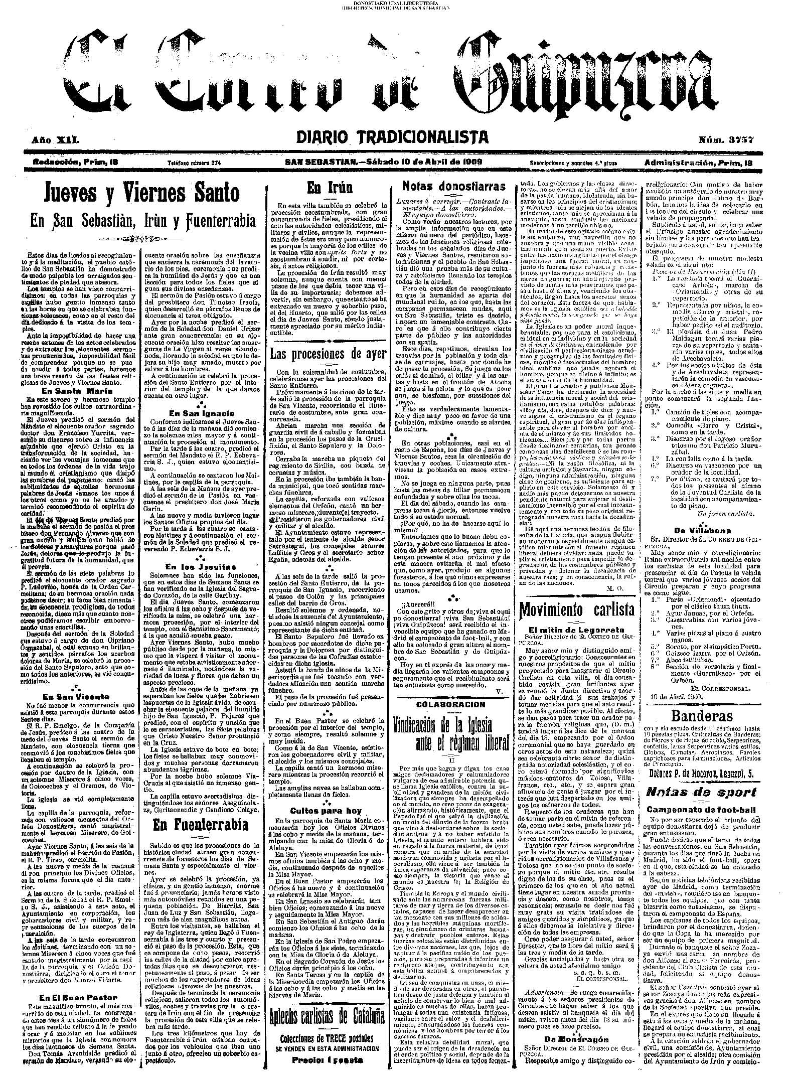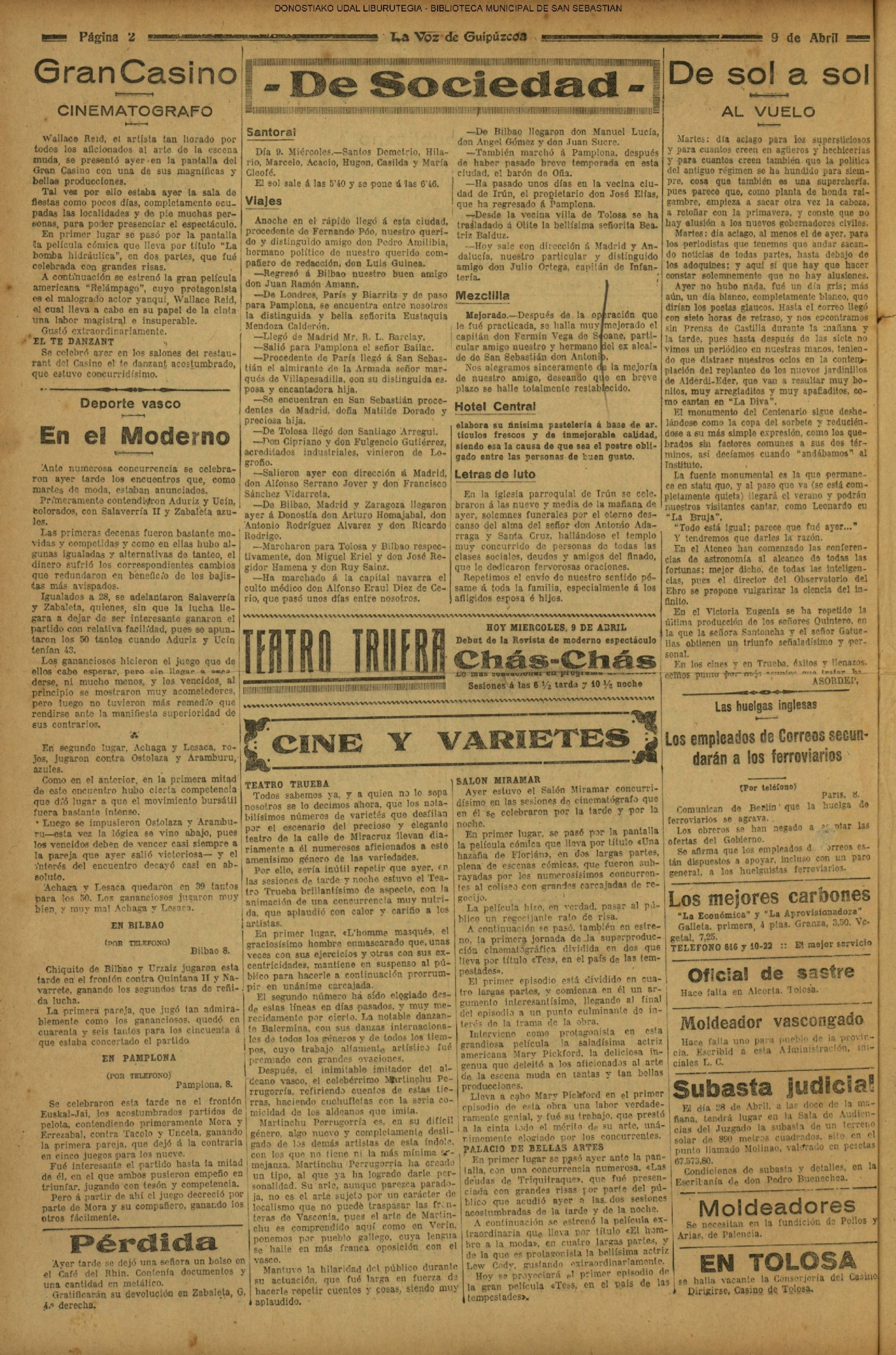 (1906) TAL DÍA COMO HOY (1909) El «C. Ciclista» donostiarra, antecesor de nuestra Real Sociedad, vence (3-1) al Español, de Madrid, proclamándose campeón de España de fútbol.(El Pueblo Vasco)(El Correo de Guipúzcoa) (1920) En la parroquia del Buen Pastor se efectúa la ceremonia nupcial de D. Mauricio Laborde y Luisa Arizmendi.(La Voz de Guipúzcoa) (1920) Boda: Miguel Escudero, notable corredor pedestre, y Prudencia Olaso (S. Ignacio). (1930) El famoso Dr. Asuero sale para Lisboa,donde había de embarcar, -rumbo a la Argentina, en el 'Cap. Ancona". Le acompañaban su esposa y el doctor Sampayo. El Alcalde, D. Juan José Prado, le había entregado un mensaje y un bastón simbólico para su colega bonaerense.(La Voz de Guipúzcoa)