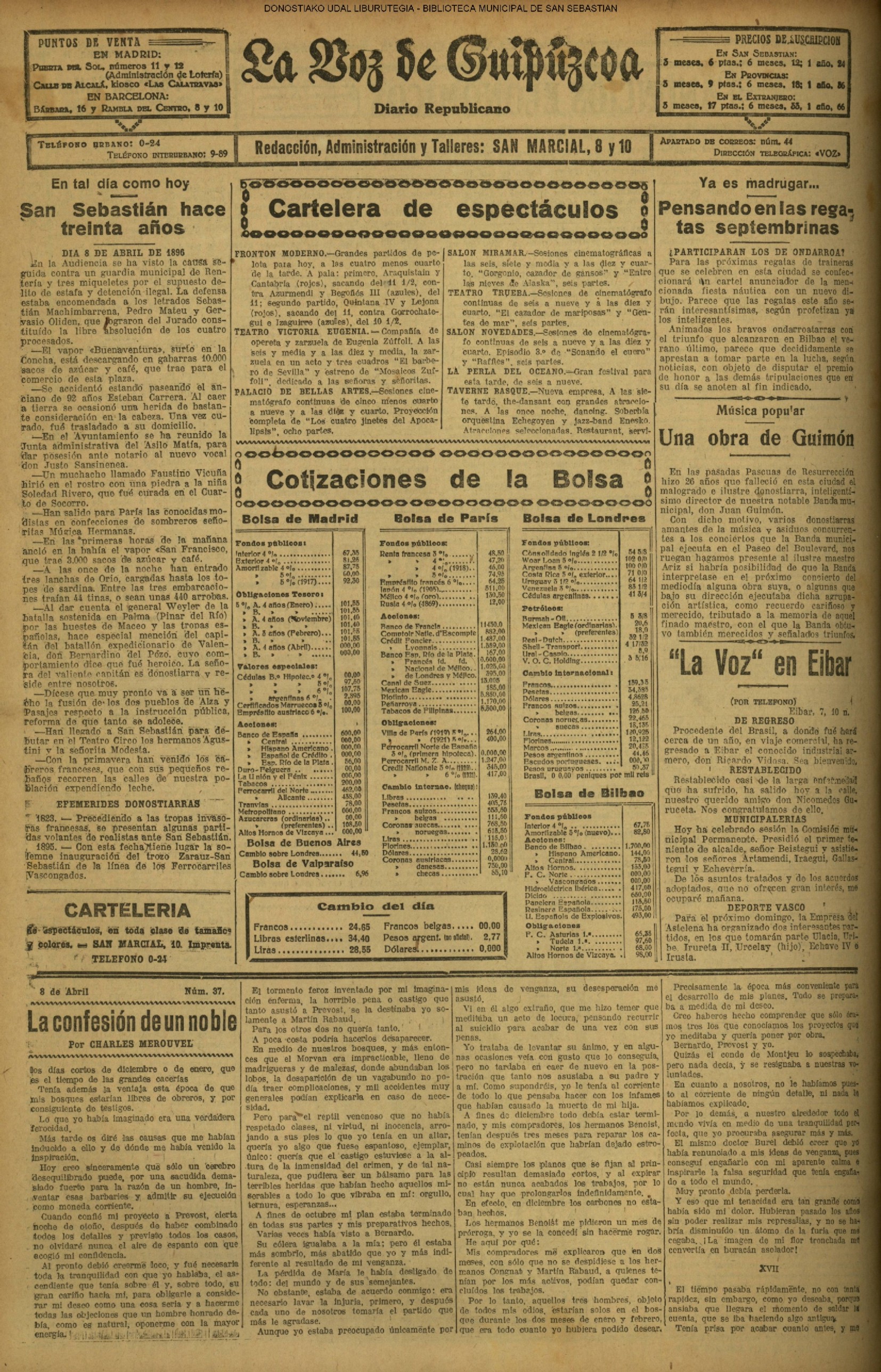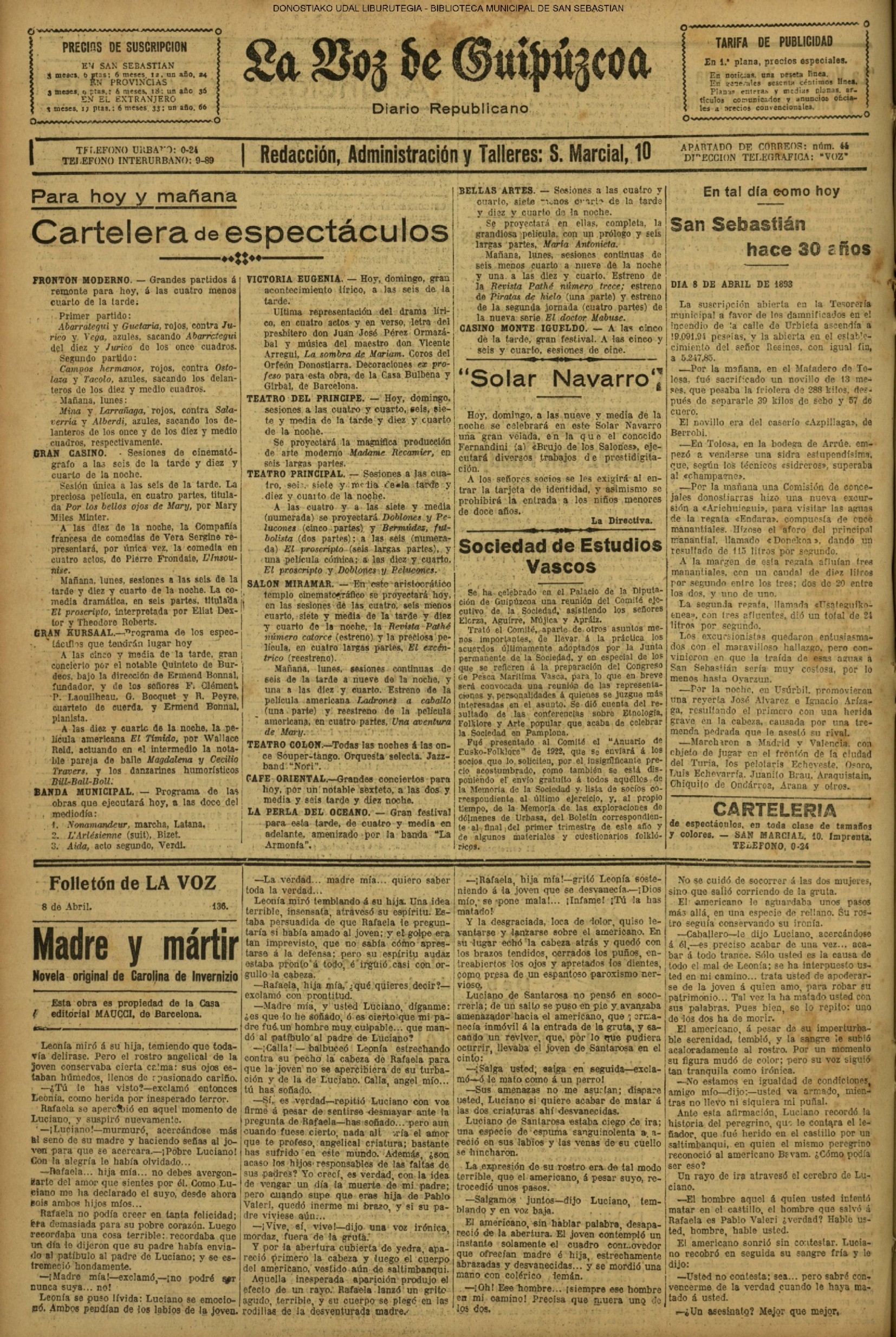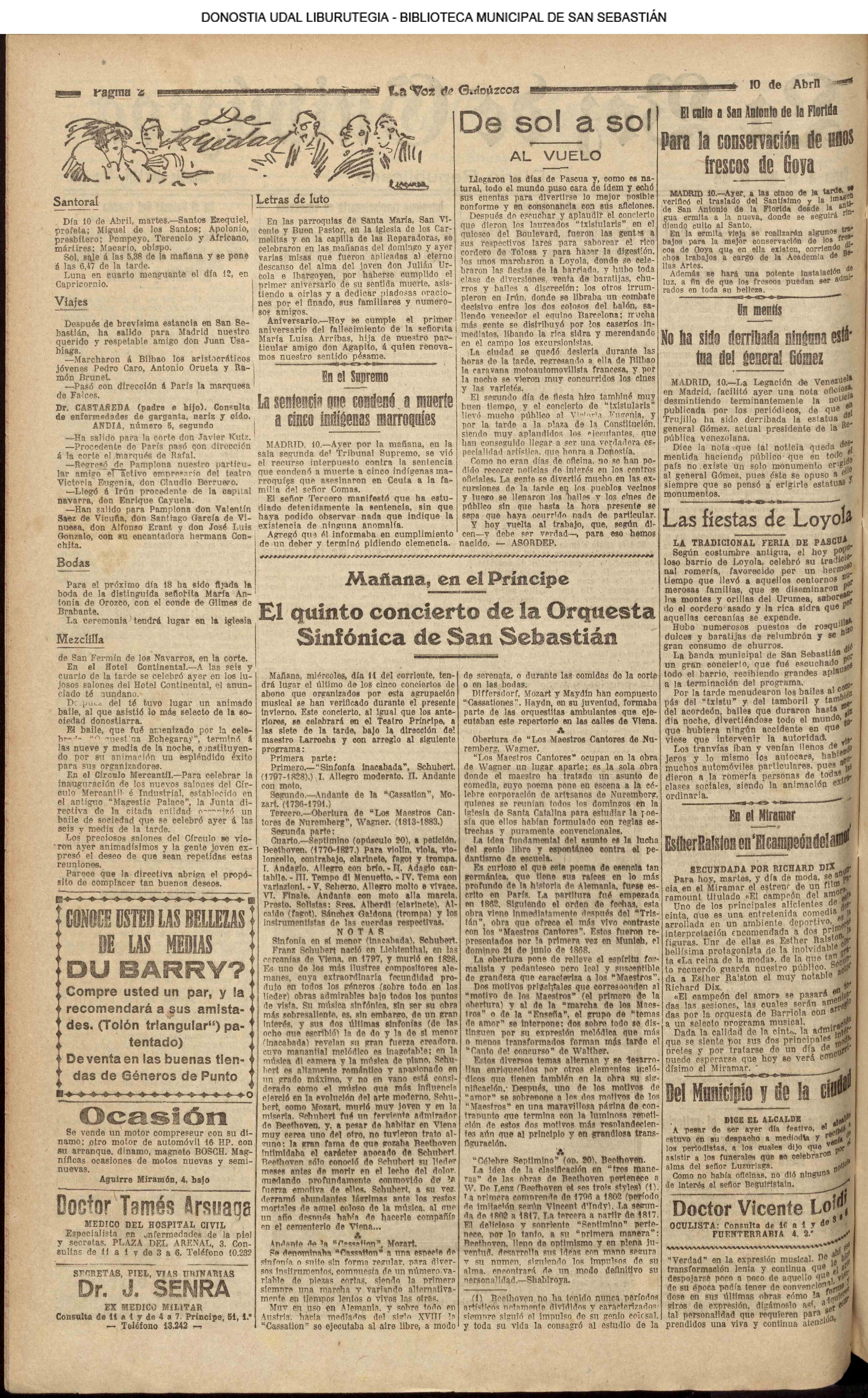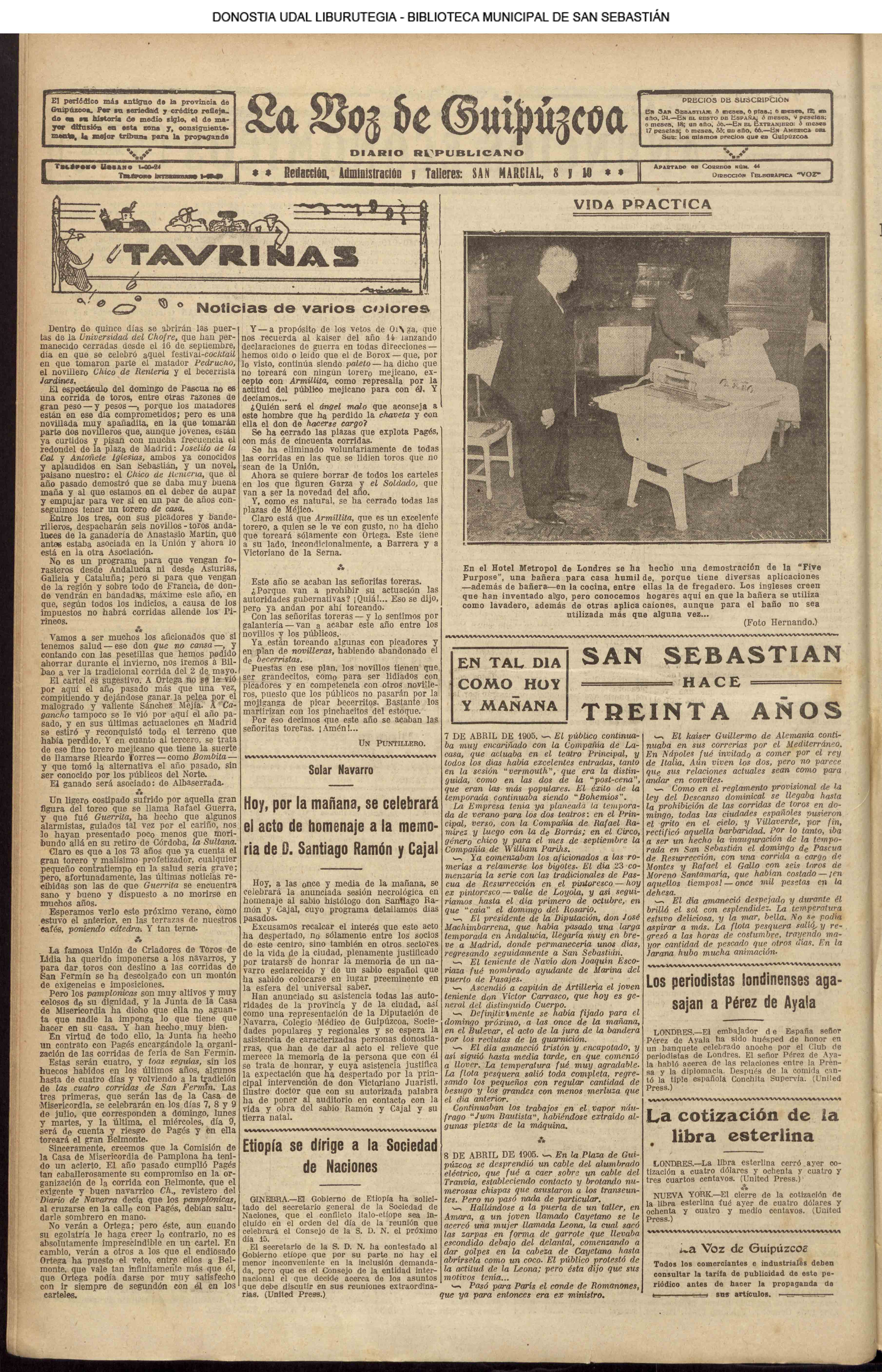 (1906) TAL DÍA COMO HOY (1909) El «C. Ciclista» donostiarra, antecesor de nuestra Real Sociedad, vence (3-1) al Español, de Madrid, proclamándose campeón de España de fútbol.(El Pueblo Vasco)(El Correo de Guipúzcoa) (1920) En la parroquia del Buen Pastor se efectúa la ceremonia nupcial de D. Mauricio Laborde y Luisa Arizmendi.(La Voz de Guipúzcoa) (1920) Boda: Miguel Escudero, notable corredor pedestre, y Prudencia Olaso (S. Ignacio). (1930) El famoso Dr. Asuero sale para Lisboa,donde había de embarcar, -rumbo a la Argentina, en el 'Cap. Ancona". Le acompañaban su esposa y el doctor Sampayo. El Alcalde, D. Juan José Prado, le había entregado un mensaje y un bastón simbólico para su colega bonaerense.(La Voz de Guipúzcoa)
