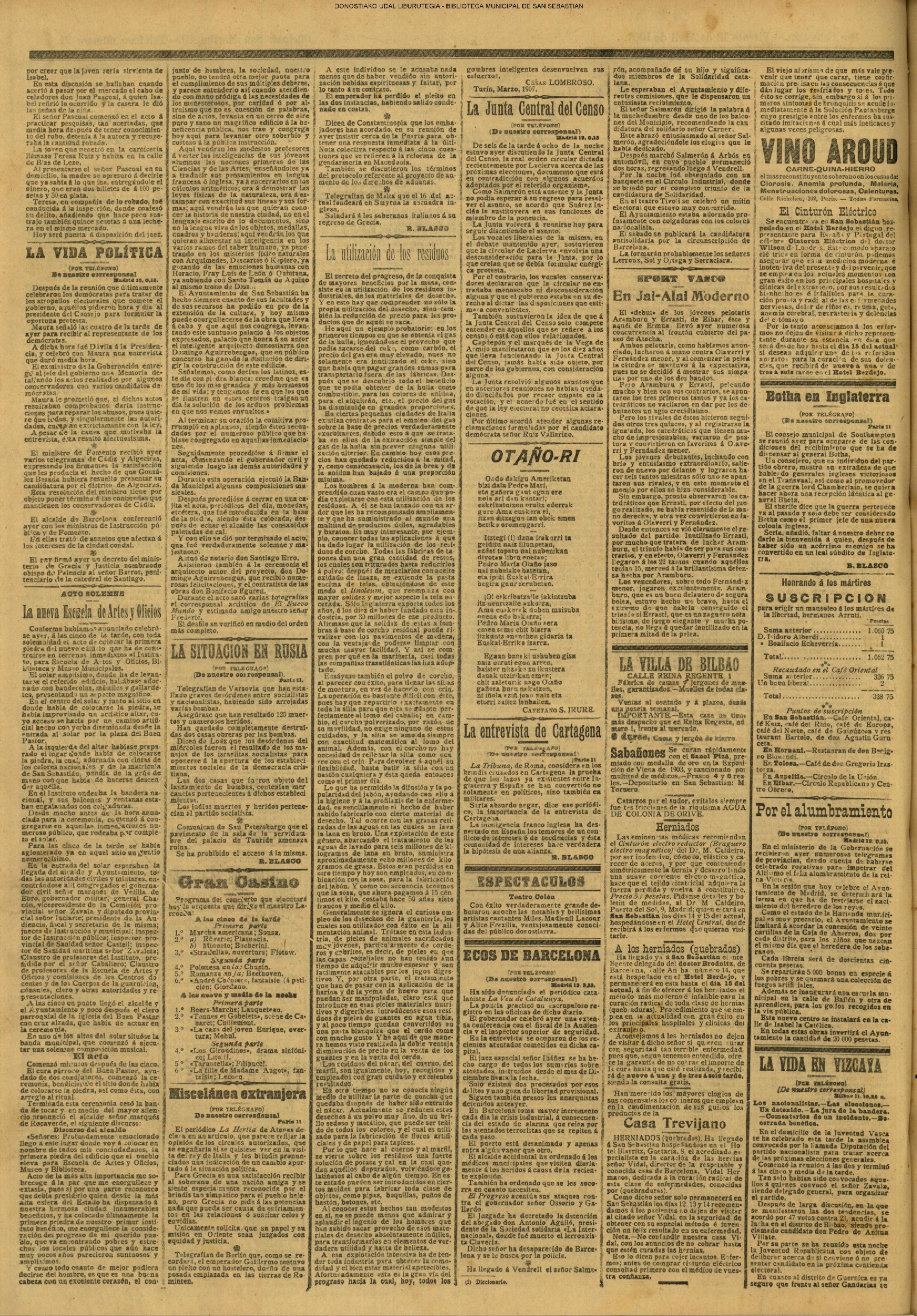 (1907) Con esta fecha tiene lugar solemnemente la colocación de la primera piedra del edificio de la Escuela de Artes y Oficios de San Sebastián