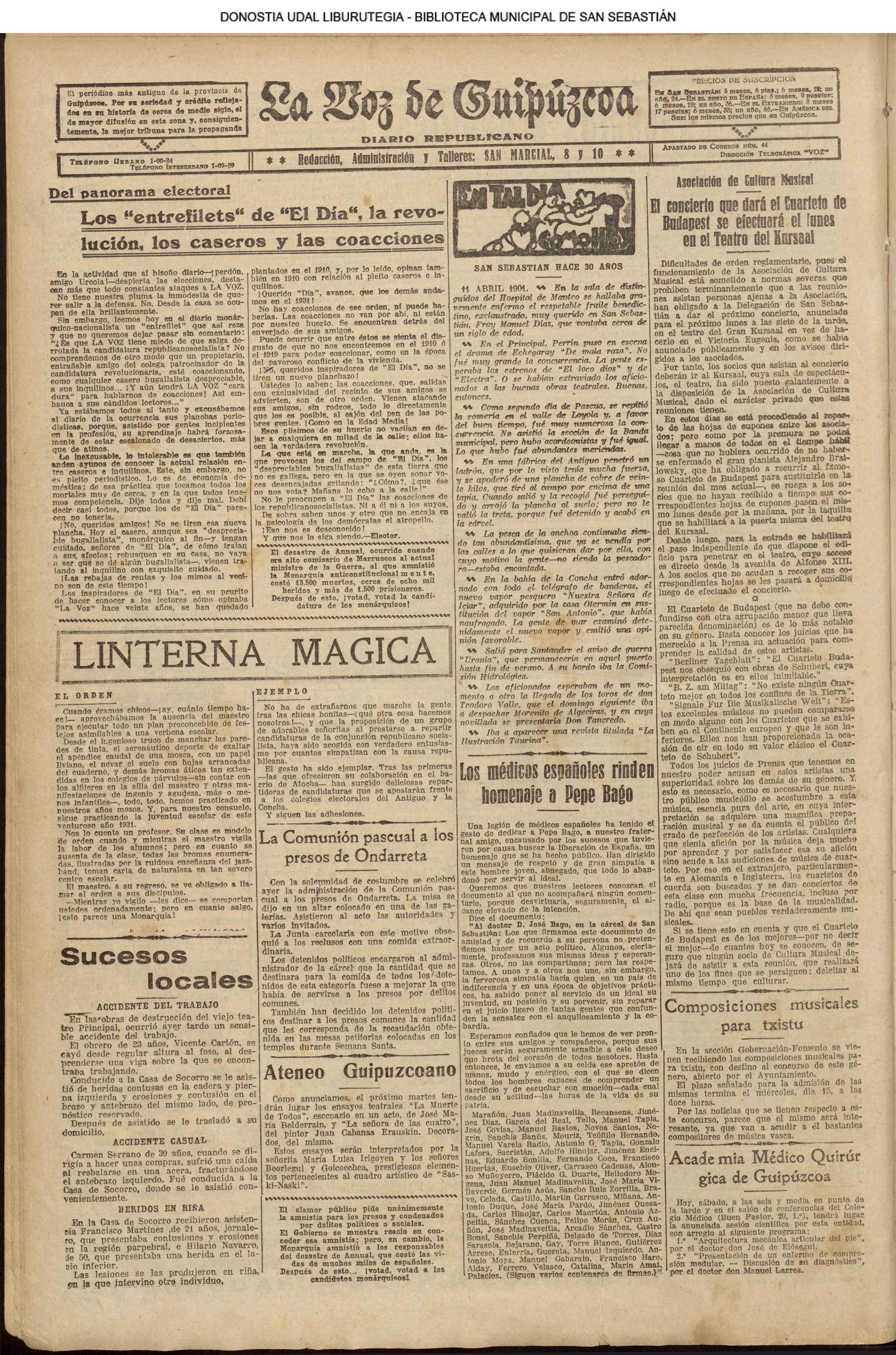(1912) D. Bernardo de Gabiola dimite la dirección de la Banda Municipal; dimisión que en sesión del 17 le fué admitida, aunque con el natural sentimiento,porque era un gran músico.