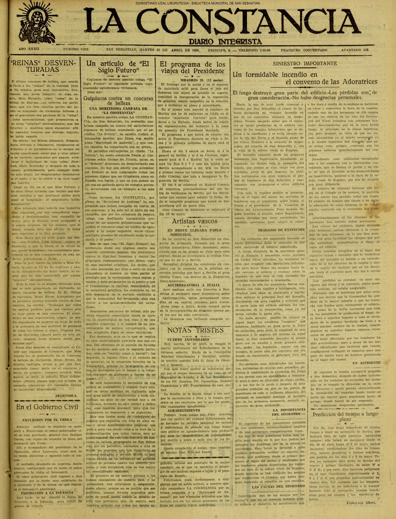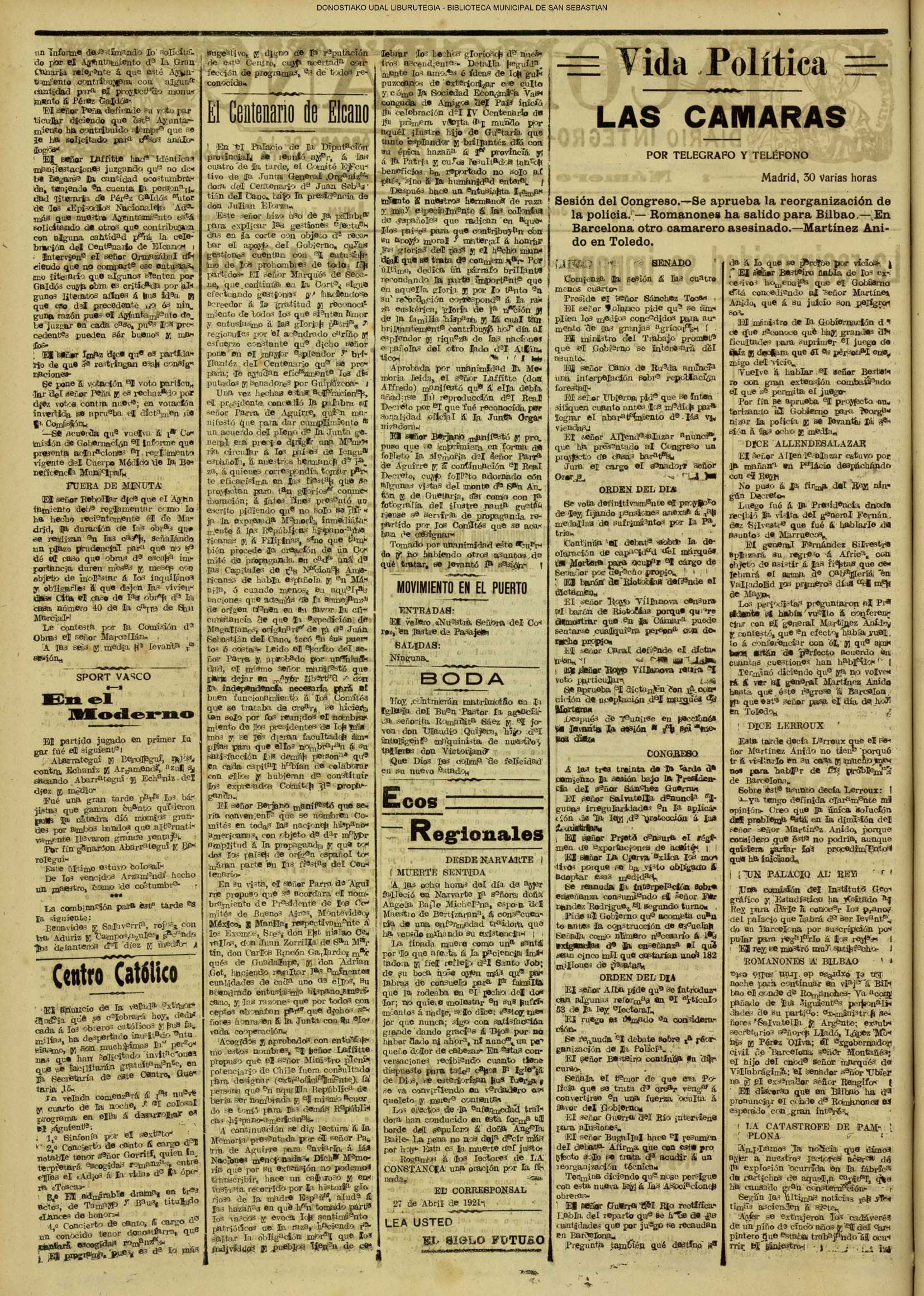 (1906) TAL DÍA COMO HOY (1908) AYUNTAMIENTO PLENO.- ACTA nº (1909) (1919) (1921) AYUNTAMIENTO PLENO.- ACTA nº El Ayuntamiento —18 concejales, presididos por el Alcalde accidental, señor Iturria — acuerda, por 10 votos contra 9, no contribuir a la suscripción nacional abierta para erigir en Gran Canaria un monumento al insigne escritor D. Benito Pérez Galdós. Contra el informe de la Comisión de Fomento, que se aprobó, el señor Laffitte (D. Alfredo) defendió un voto particular, favorable a la consignación de 250 pesetas para aquella finalidad.(La Voz de Guipúzcoa)(El Pueblo Vasco)(La Constancia/cont.) (1929) INCENDIO.- Una villa-colegio de religiosas fue casi destruído por el fuego (La Voz de Guipúzcoa)(El Pueblo Vasco)(El Pais Vasco)(La Constancia) (1931) AYUNTAMIENTO PLENO.- ACTA nº (1939) SÁBADO - (EL DIARIO VASCO)(LA VOZ DE ESPAÑA)(UNIDAD) (1949) (1951) Perece, víctima de un choque dé tranvías, registrado a las cuatro de la tarde en la esquina de las calles de Garibay y Andía, el popu lar industrial y ex-futbolista Juanito Zabala.(EL DIARIO VASCO)(LA VOZ DE ESPAÑA) (1959) (1969) MARTES - ADJUDICADAS LAS OBRAS DE LA PRESA DEL AÑARBE EN 270 MILLONES DE PESETAS (LA VOZ DE ESPAÑA.30.04) (1979) (1989) (1999) |
