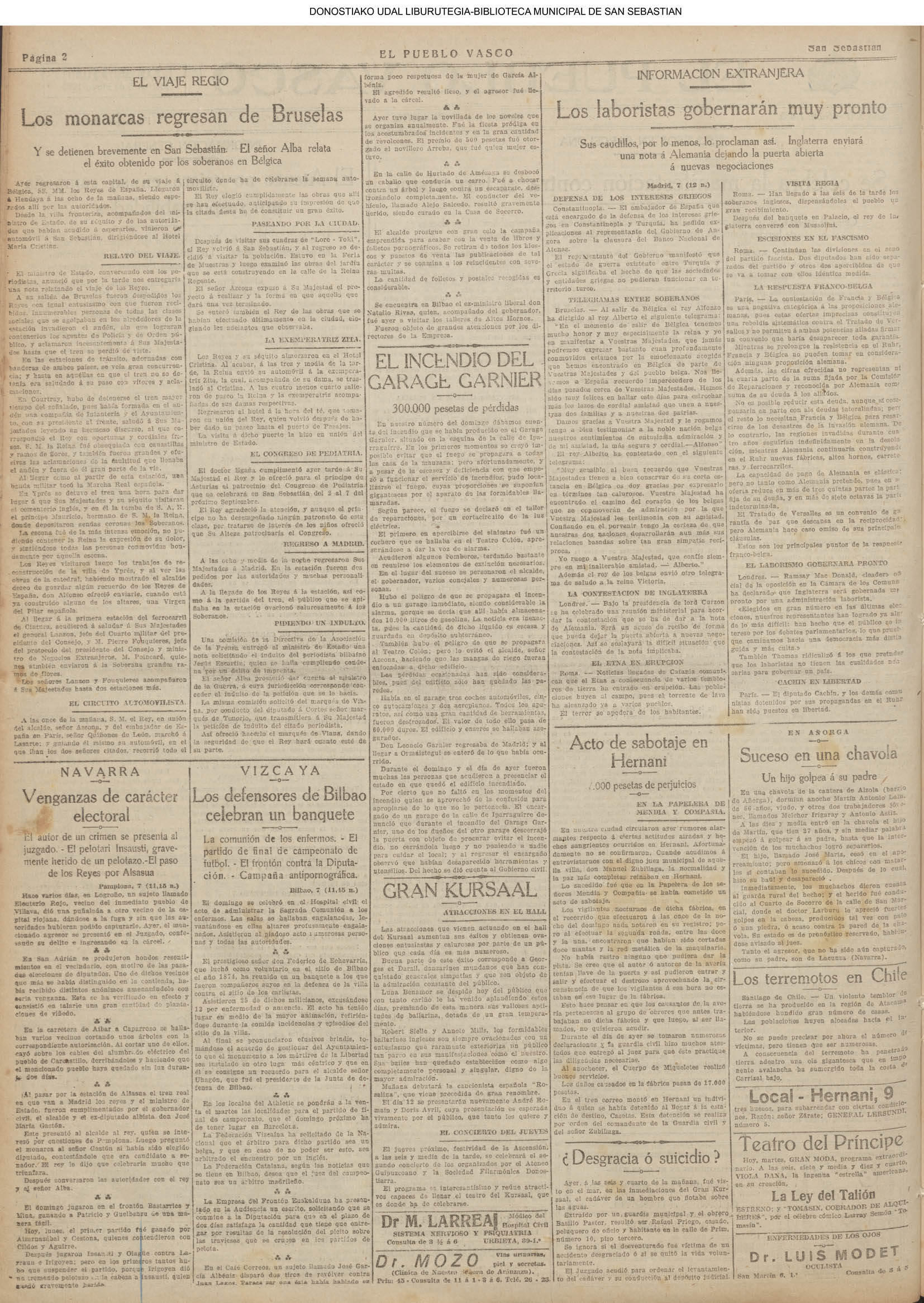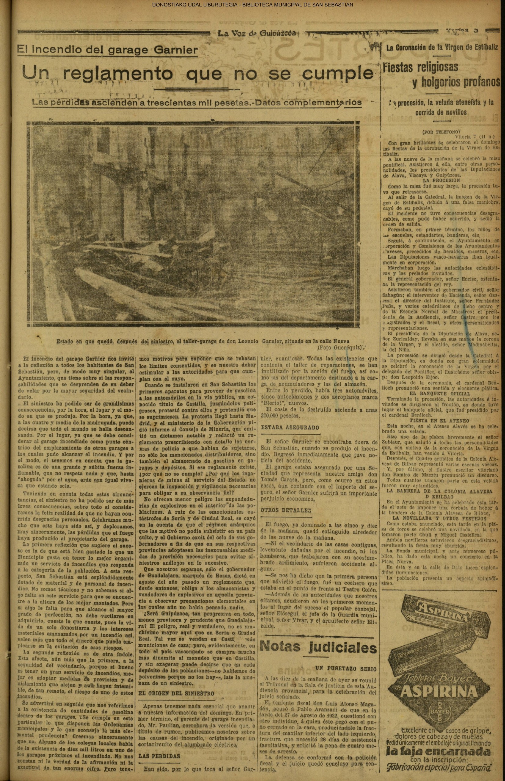 (1923).Un fuerte incendio destruye esta madrugada, seguramente a causa de un cortocircuito, el Garage Garnier (Leoncio), sito en la calle Nueva. Las llamas se propagaron al inmediato teatro Colón.(La Voz de Guipuzcoa)(El Pueblo Vasco)
