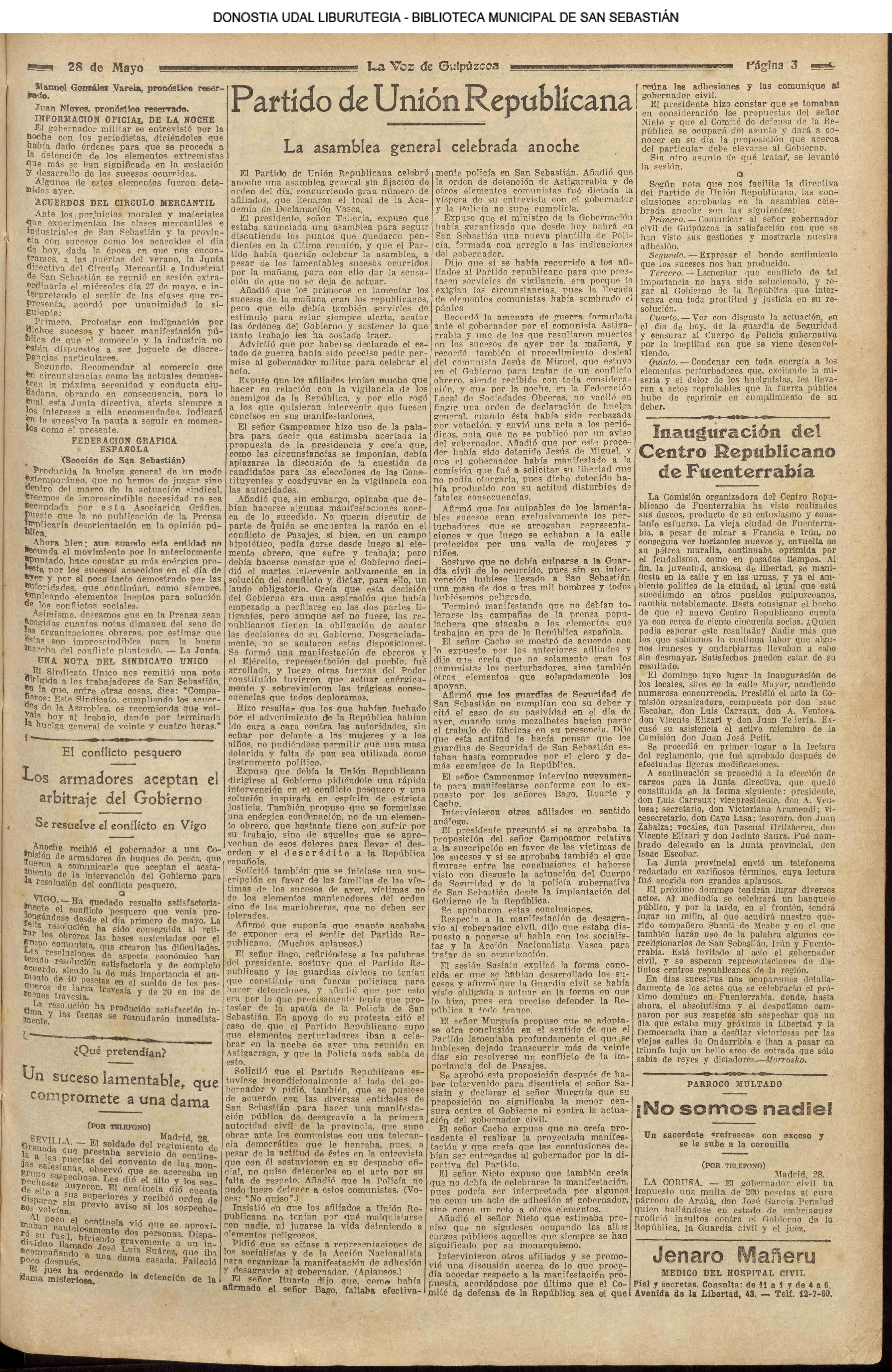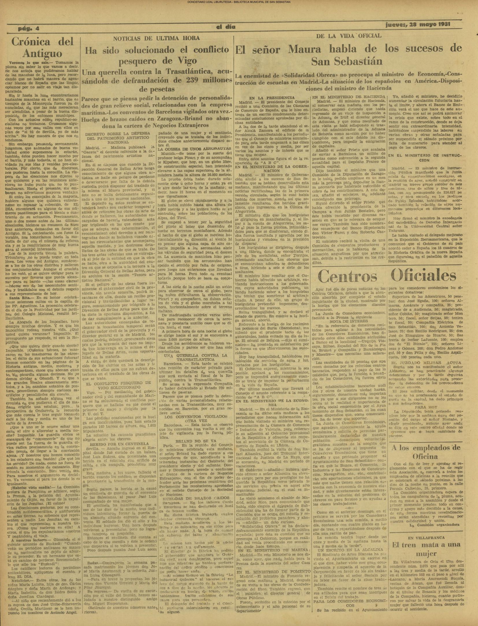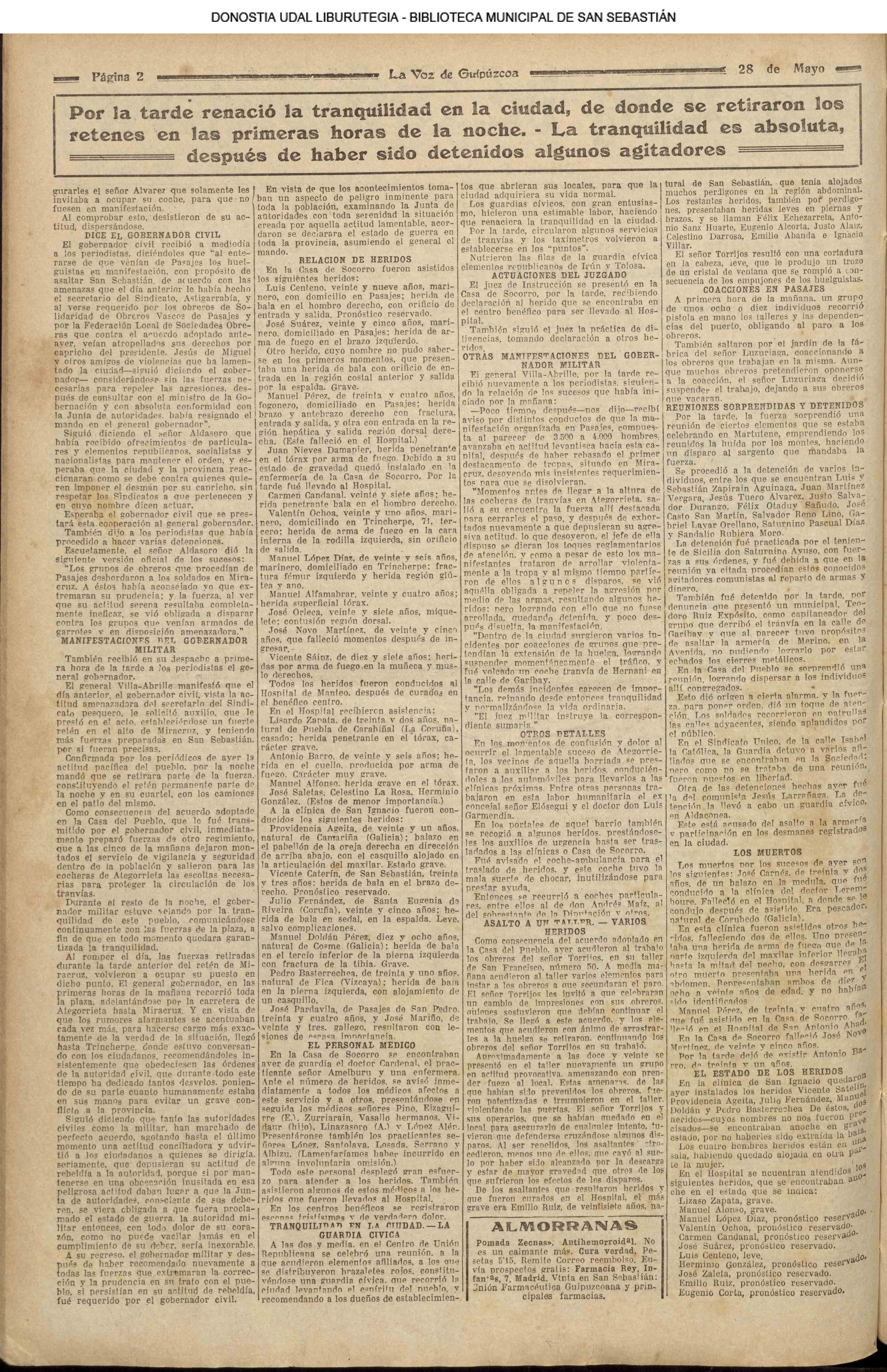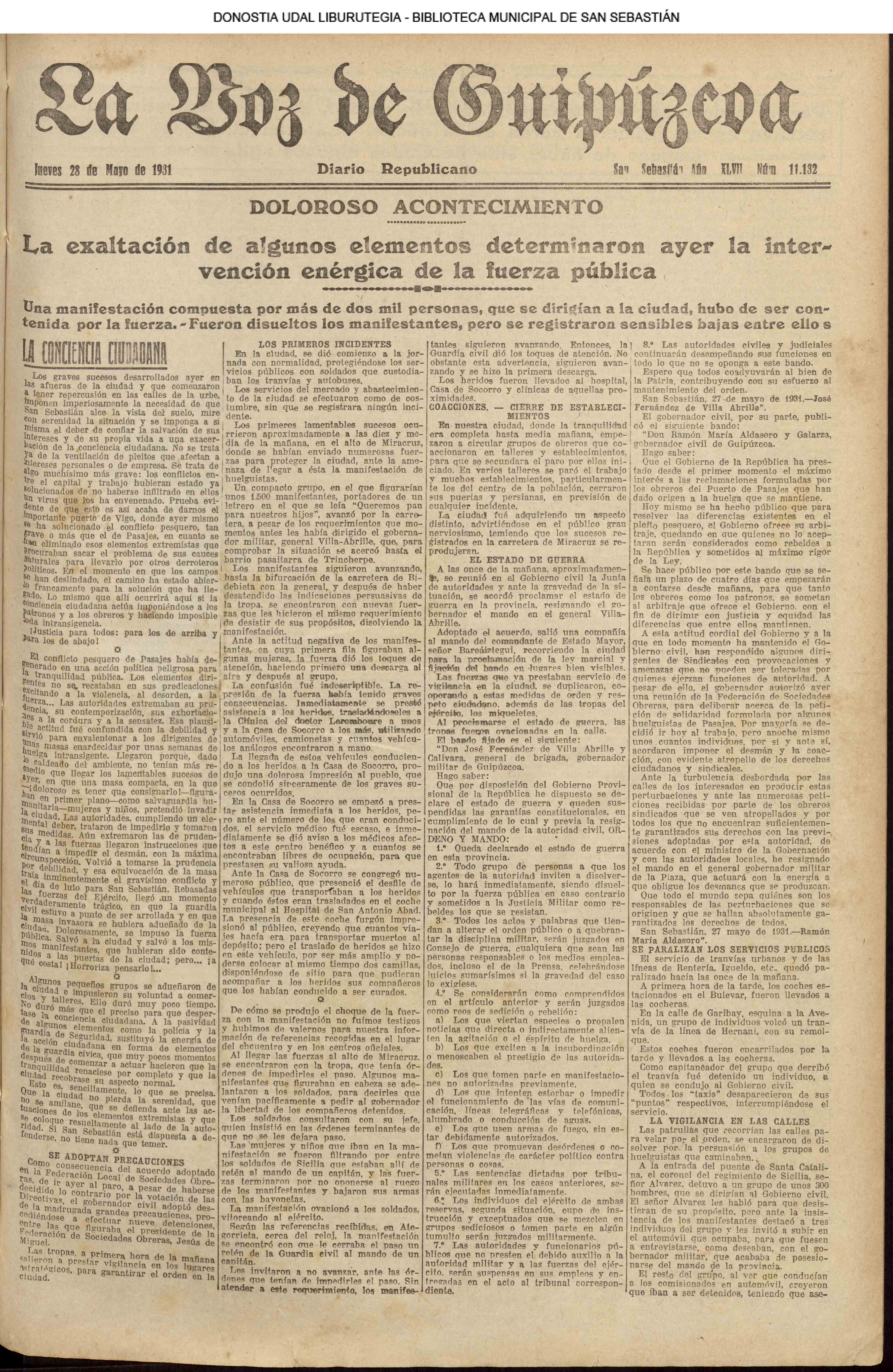 (1931) Día luctuoso para San Sebastián. La exaltación de algunos elementos determina la intervención enérgica de la fuerza pública, resultando seis muertos y más de veinte heridos. El Alto de Miracruz fué el escenario del lamentable suceso.