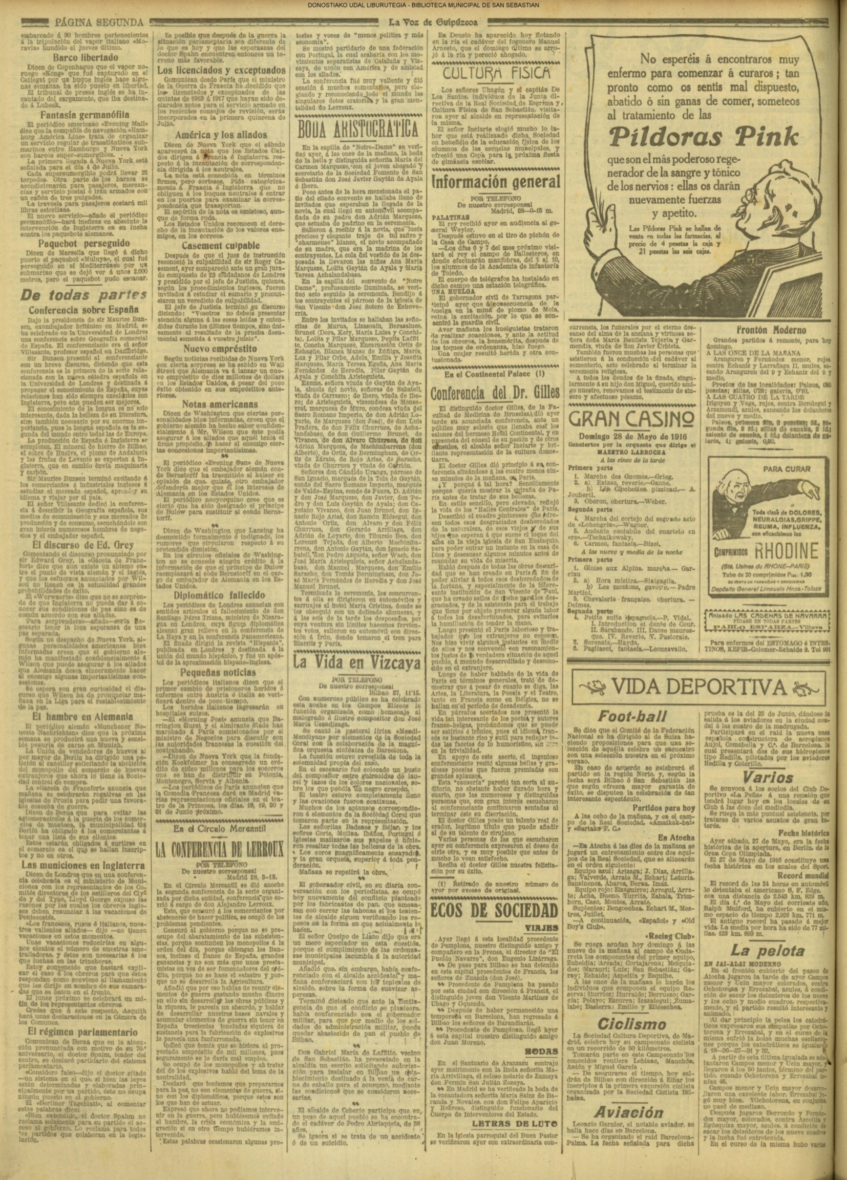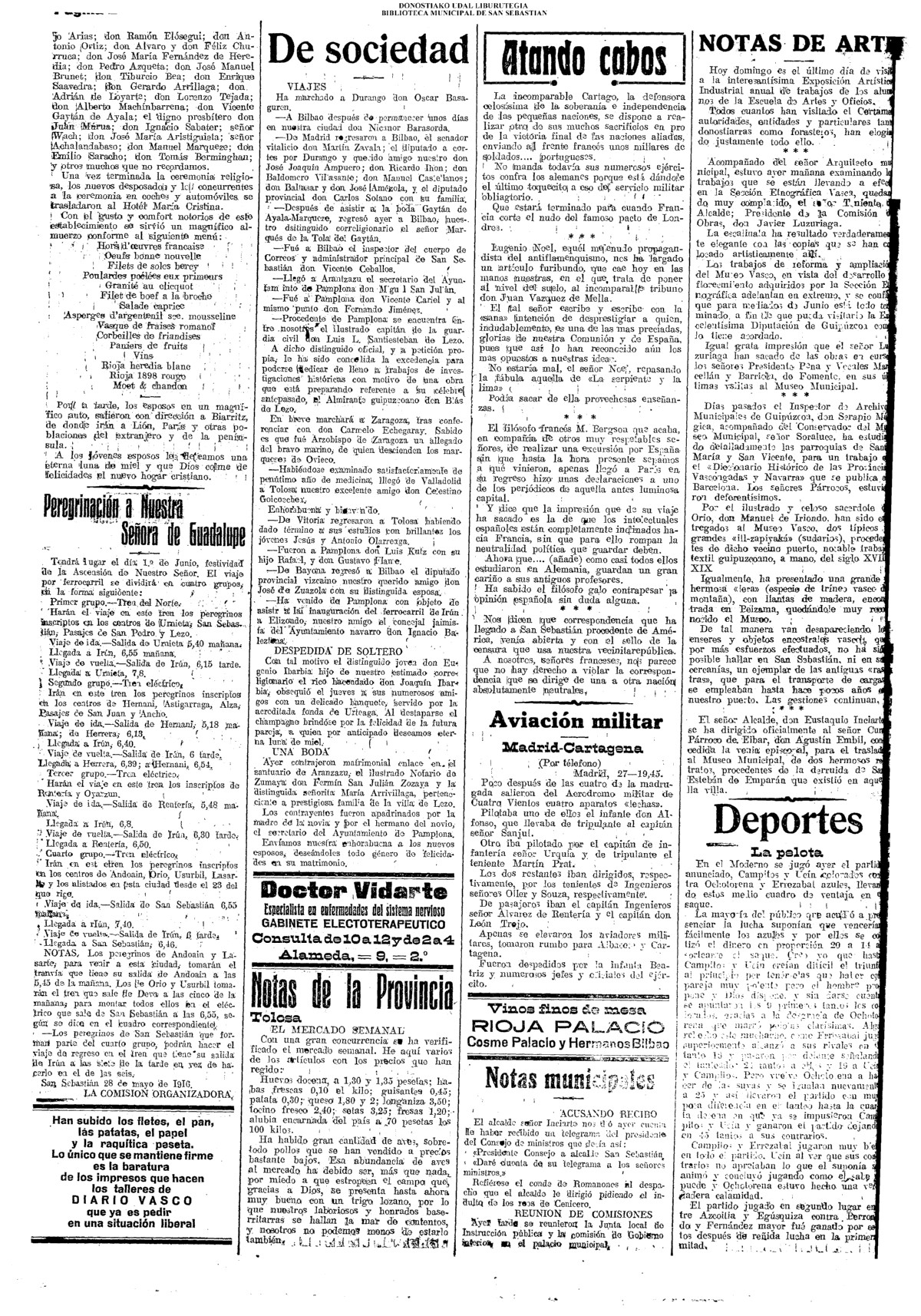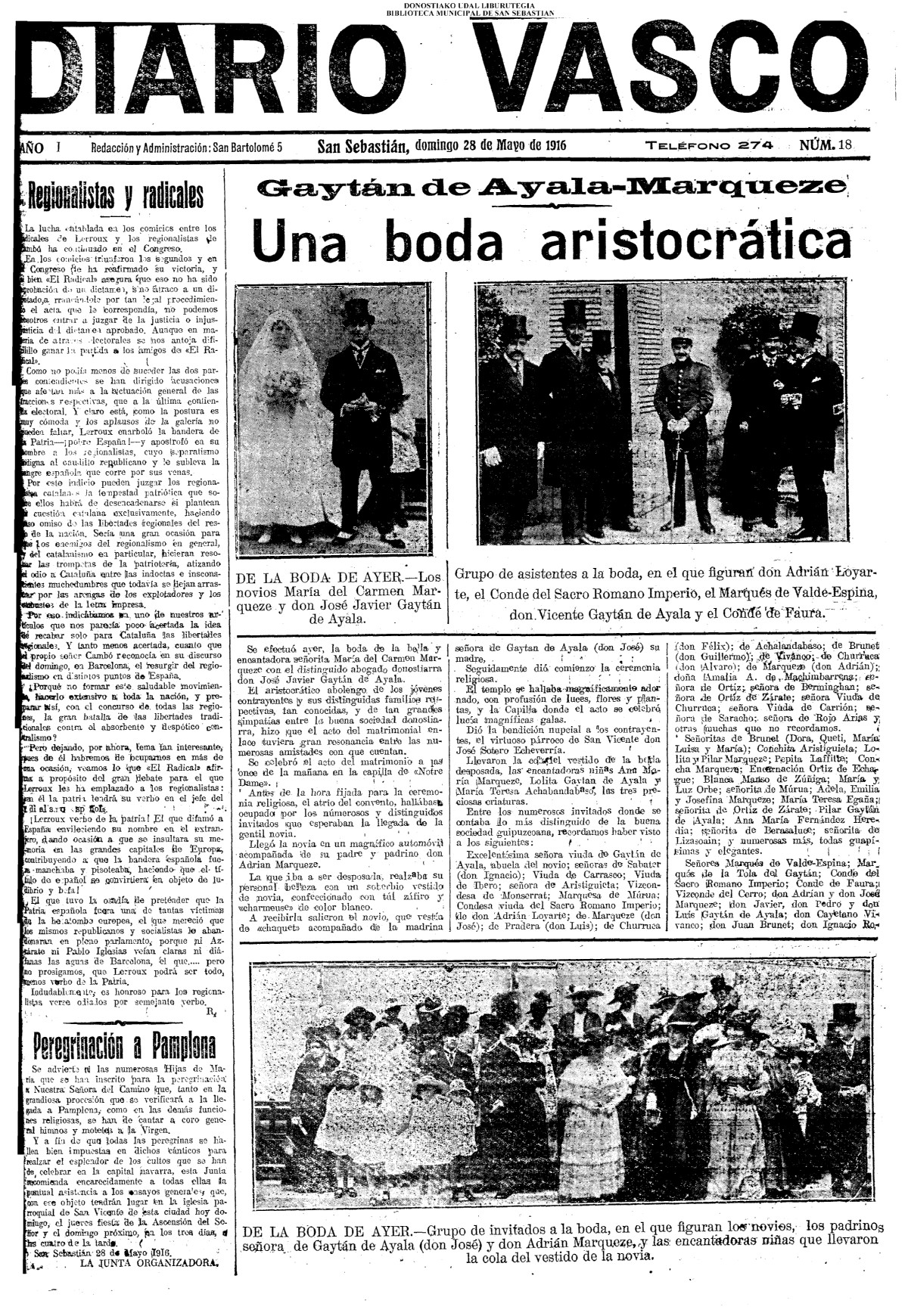 (1916) UNA BODA ARISTOCRÁTICA.- Matrimonial enlace del joven abogado y secretario de la Sociedad «Fomento de San Sebastián, don José Javier Gaytán de Ayala e Ibero con la señorita María del Carmen Marqueze.(Notre Dame).(El Pueblo Vasco)(La Voz de Guipúzcoa) (Diario Vasco / cont)