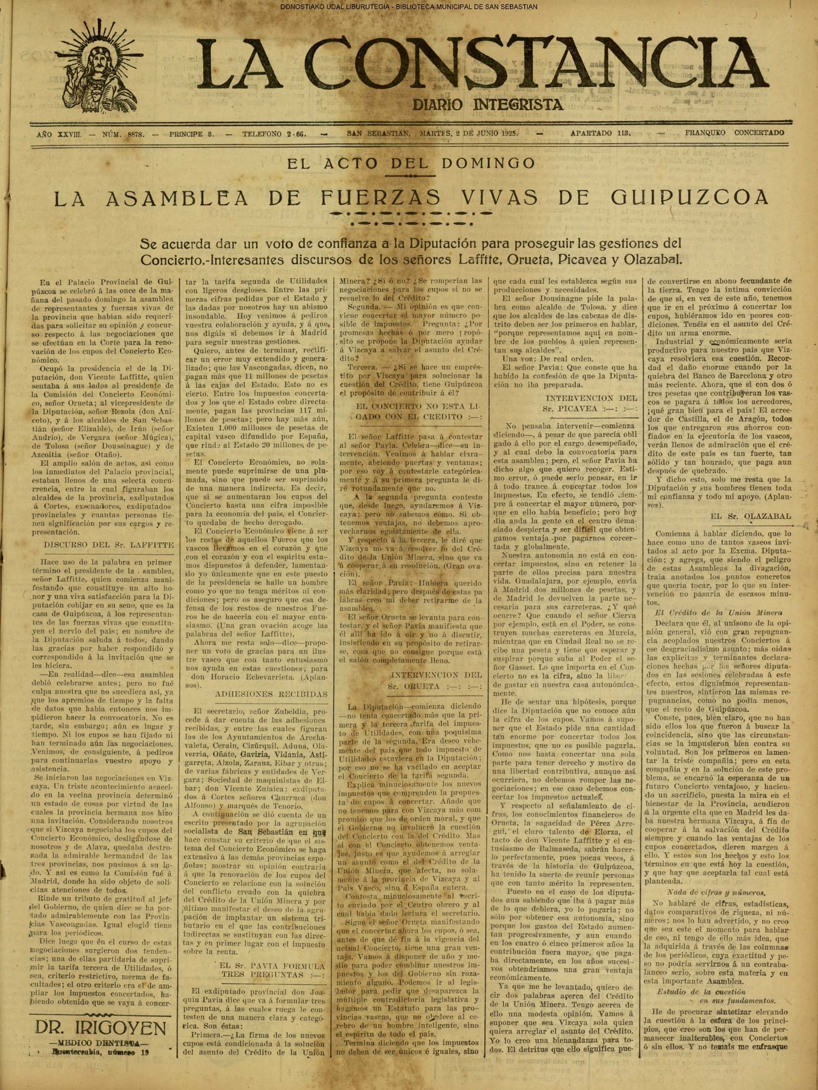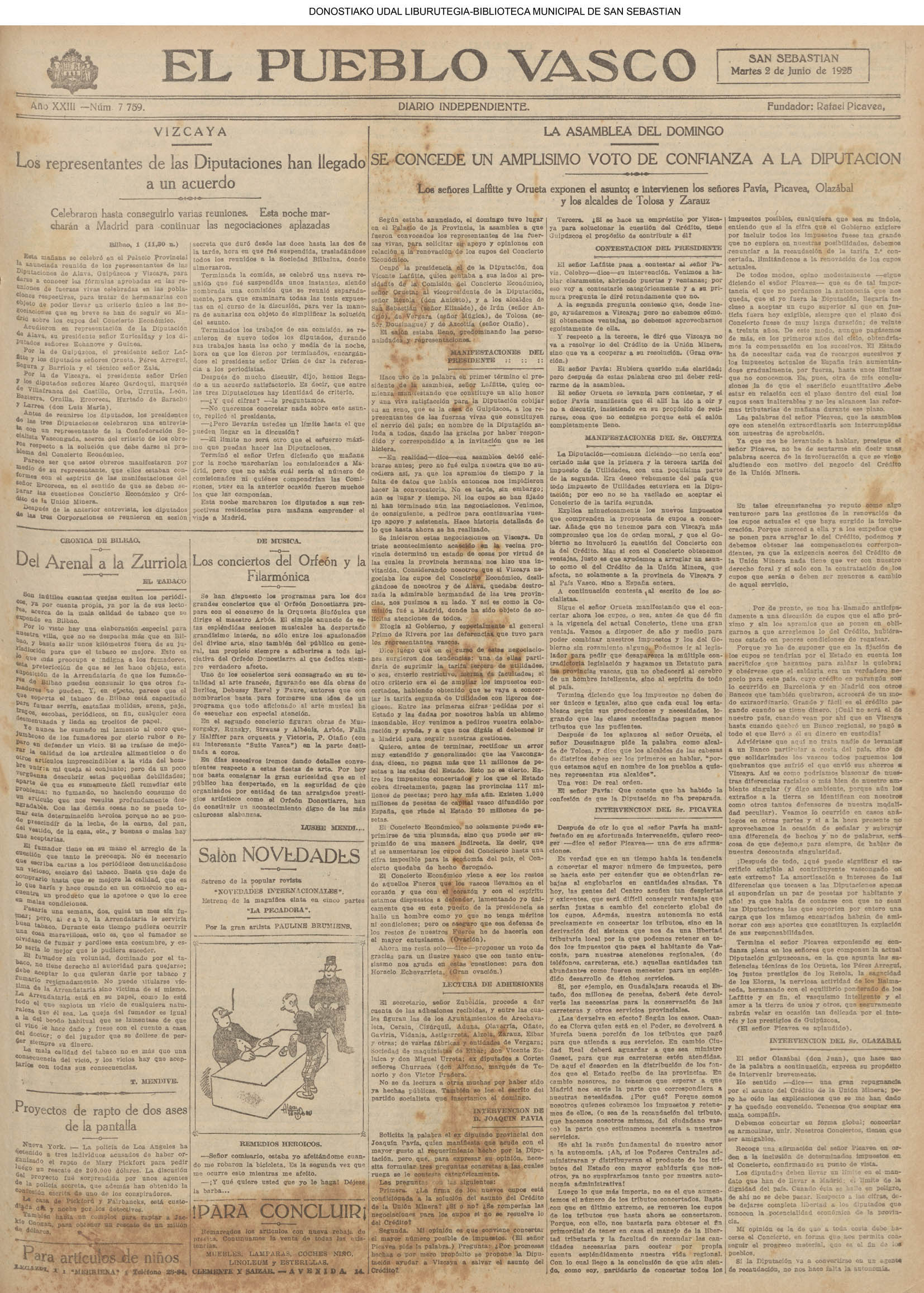 Por lo dispuesto en varias cédulas reales y siguiendo una práctica centenaria, todos los años, <<eldía de San Juan, de junio». elAyuntamiento de San Sebastián designaba entre las personas «de más relieve de su vecindad, a las dos que se encargaban de recibir por inventario los ornamentos, alhajas y bienes de todas clases de cada iglesia.y de cuidarlos con gran esmero, a la vez que de regir y gobernar todo cuanto se recibía y gastaba durante el periodo de su mayordomía perteneciente a la parroquia respectiva». En el archivo episcopal de Pamplona, en los documentos sobre le pleito en el Tribunal Eclesiástico de la citada ciudad, entre el fiscal del Obispado y la ciudad de San Sebastián como Patrona de sus dos iglesias parroquiales de Santa María y San Vicente sobre el cumplimiento por parte del Concejo donostiarra de ciertos mandatos episcopales hechos en una visita pastoral, se detalla un nombramiento de interés para la pequeña historia de nuestra capital. Vea el lector: El 24 de junio de 1581, el Concejo donostiarra nombró al capitán don Miguel de Oquendo para que llevase la adminsitración de los bienes de la parroquia de Santa María por el tiempo de un año, hasta junio de 1582. Al tomar posesión del cargo de mayordomo se hizo un inventario de todos los bienes de la parroquia por el escribano D. Marcos de Garay, documento que fue firmado por los alcaldes licenciado Lazón y D. Antonio de Luscando, el regidor D. Sebastián de Valerdi y los señores Juanes de Michelena, Sebastián de Novillas y Pedro de Guarnizo, además del propio Miguel de Oquendo El histórico documento es una detallada relación de los veintiocho cálices que entonces poseía la parrroquia, ornamentos diversos, con capas y casullas preciosas, entre éstas una hechaa en Inglaterra, dos navios que solían colgarse delante del altar de Nuestra Señora, y legaios con cuentas v la historia de la parroquia de Santa María. Al llegar a la fecha del 24 de junio del año siguiente, en que terminaba lala mayor mayordomía de Oquendo, «no pudo éste dar personalmente las cuentas de la misma por hallarse entonces embarcado en la escuadra que mandaba el marqués de Sant Cruz, tomando parte en una de sus memorables intervenciones que tanta gloria y dieron a España y honor al insigne hijo de San Sebastián» En vista de ello, quien rindió cuentas fue su hermano político, el licenciado Zandategui, ante los señores alcaldes y jurados. En aquella ocasión se retrasó esta rendición de cuentas, y en lugar de ser el 24 de junio de 1582 fue el 2 de agosto de aquel año. |