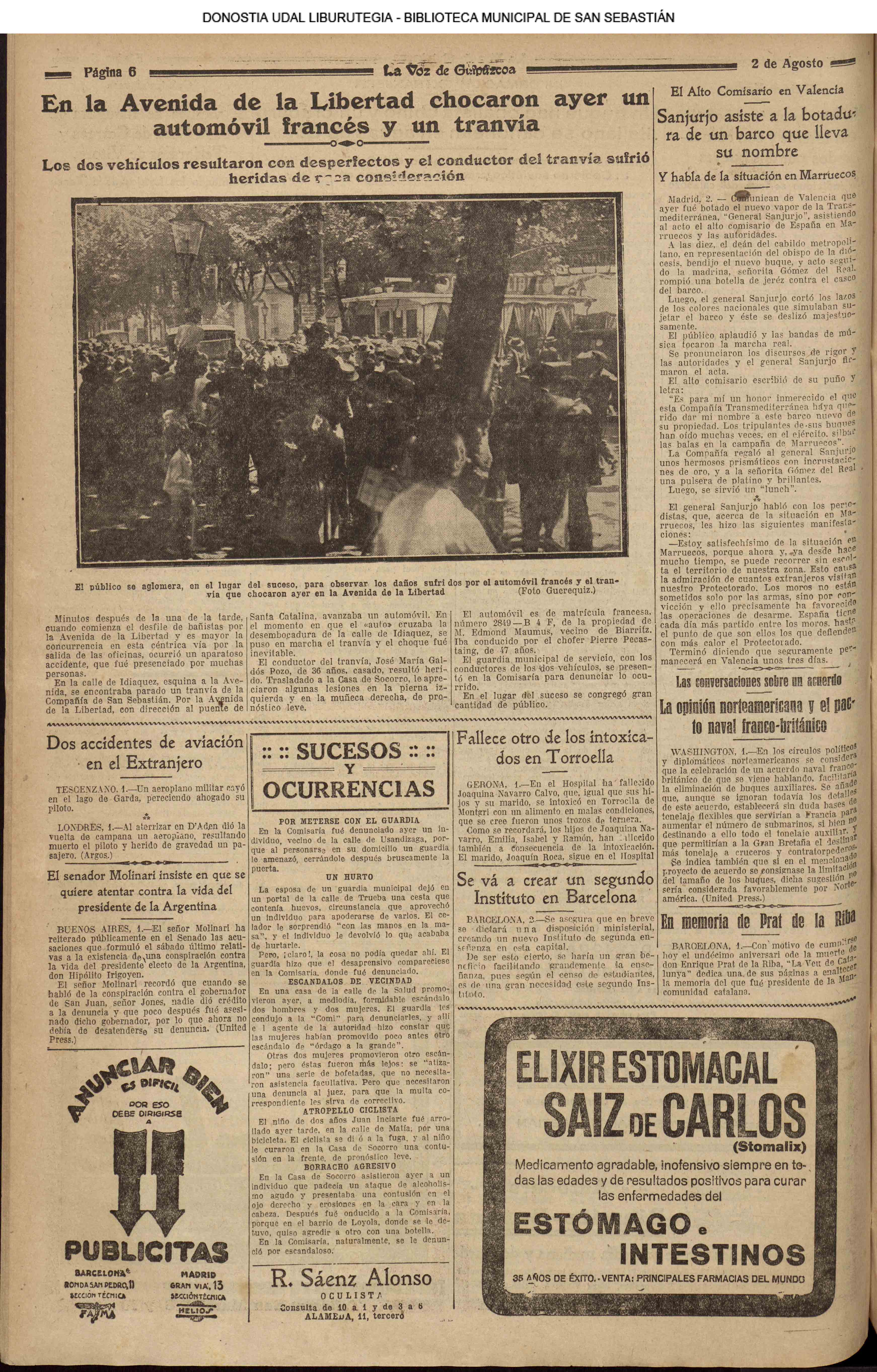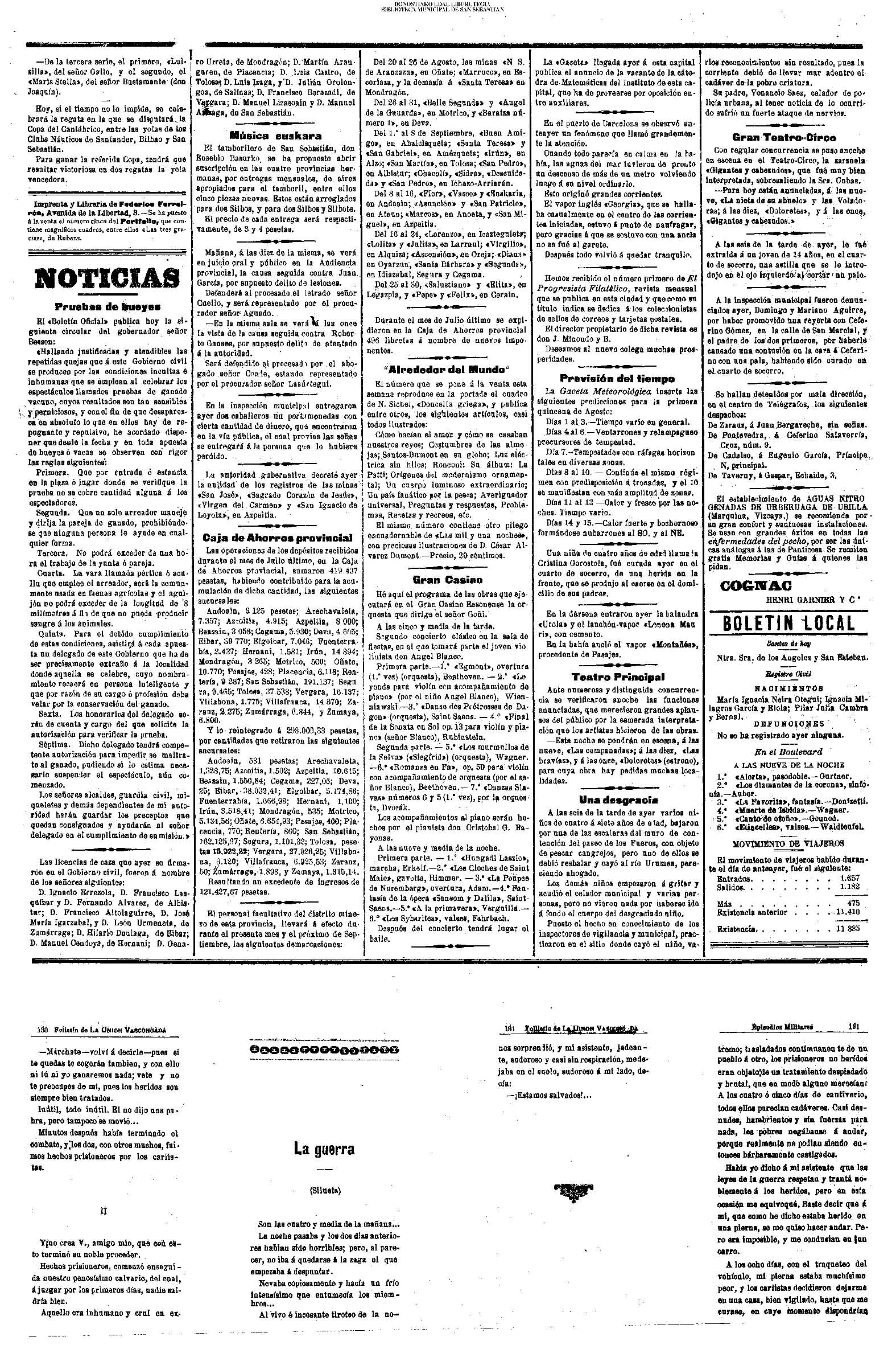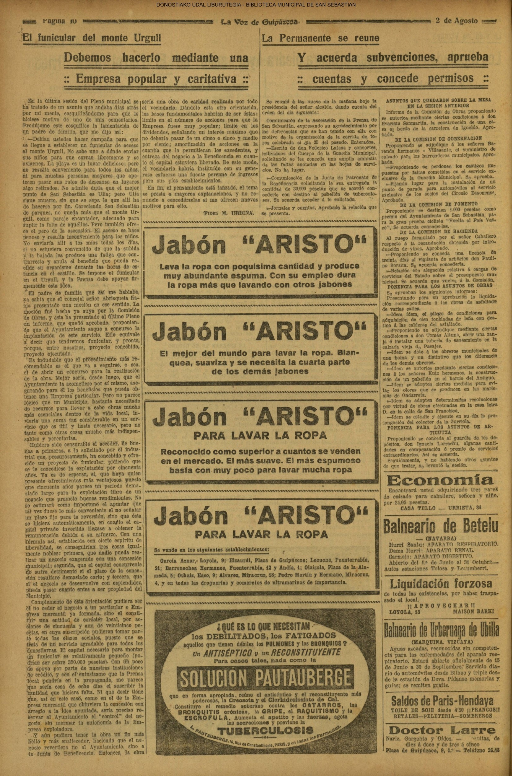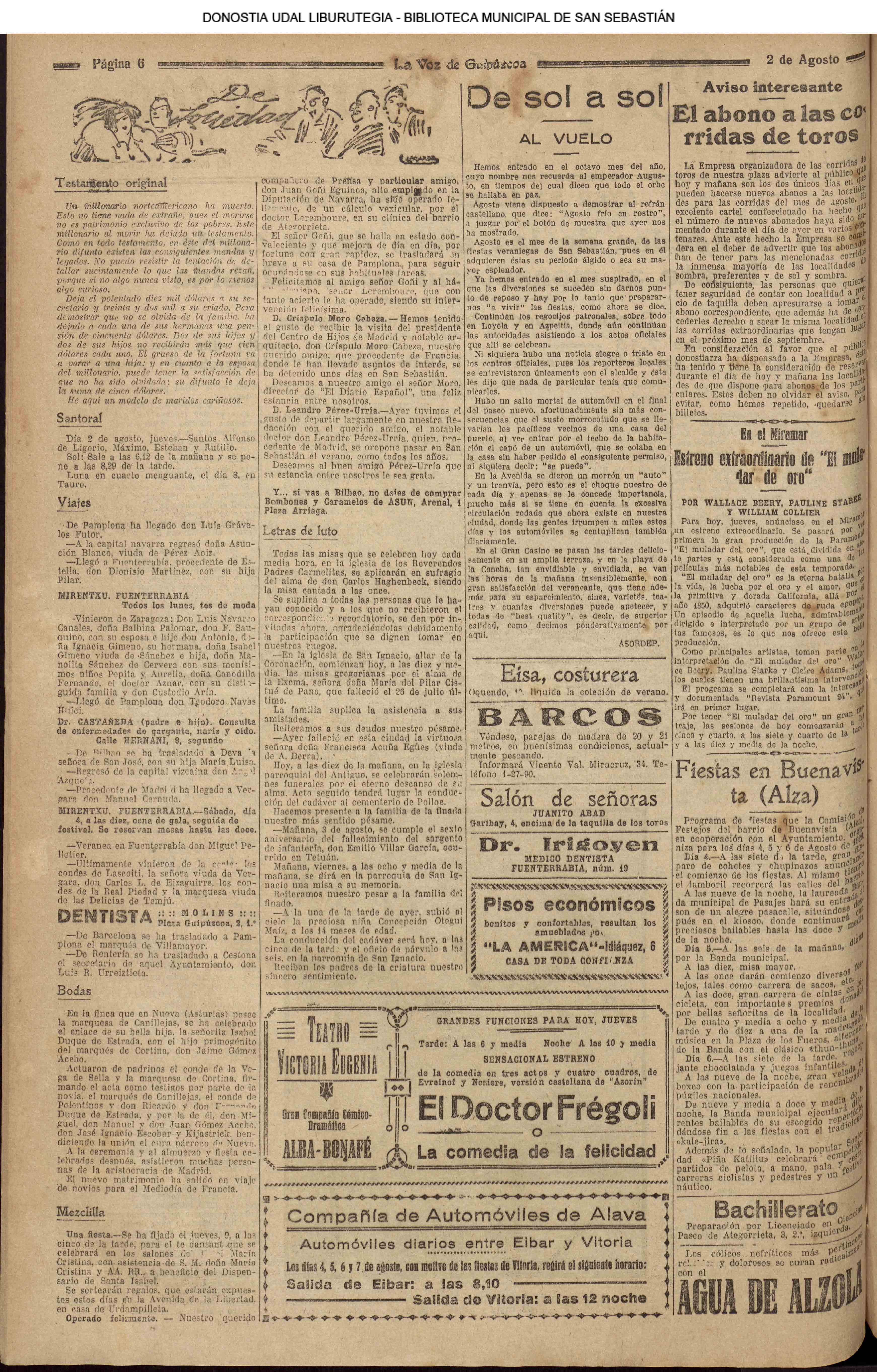 | 1928 - DE SOL A SOL (MIÉRCOLES) - Hemos entrado en el octavo mes del año, cuyo nombre nos recuerda al emperador Augusto, en tiempos del cual dicen que todo el orbe se hallaba en paz. Agosto viene dispuesto a demostrar al refrán castellano que dice: “Agosto frío en rostro”, a juzgar por el botón de muestra que hoy nos ha mostrado. Agosto es el mes de la semana grande, de las fiestas veraniegas de San Sebastián, pues en él adquieren éstas sul periodo álgido o sea su mayor esplendor (....) |