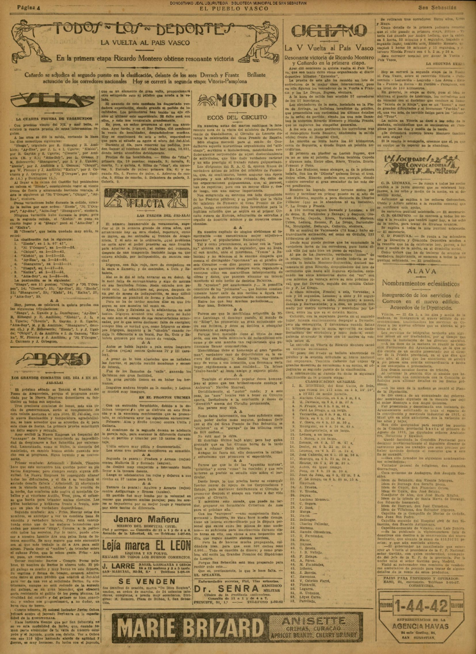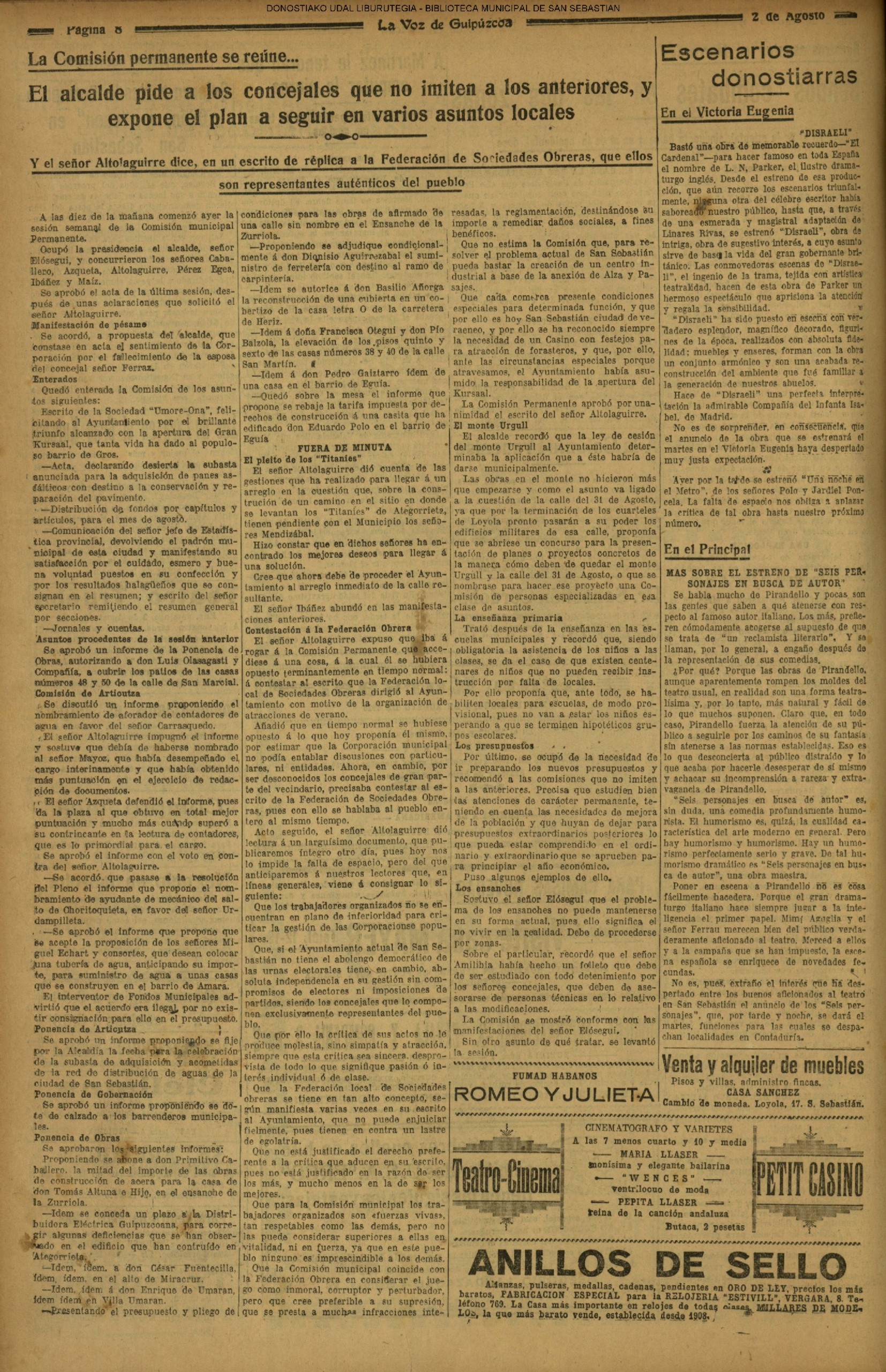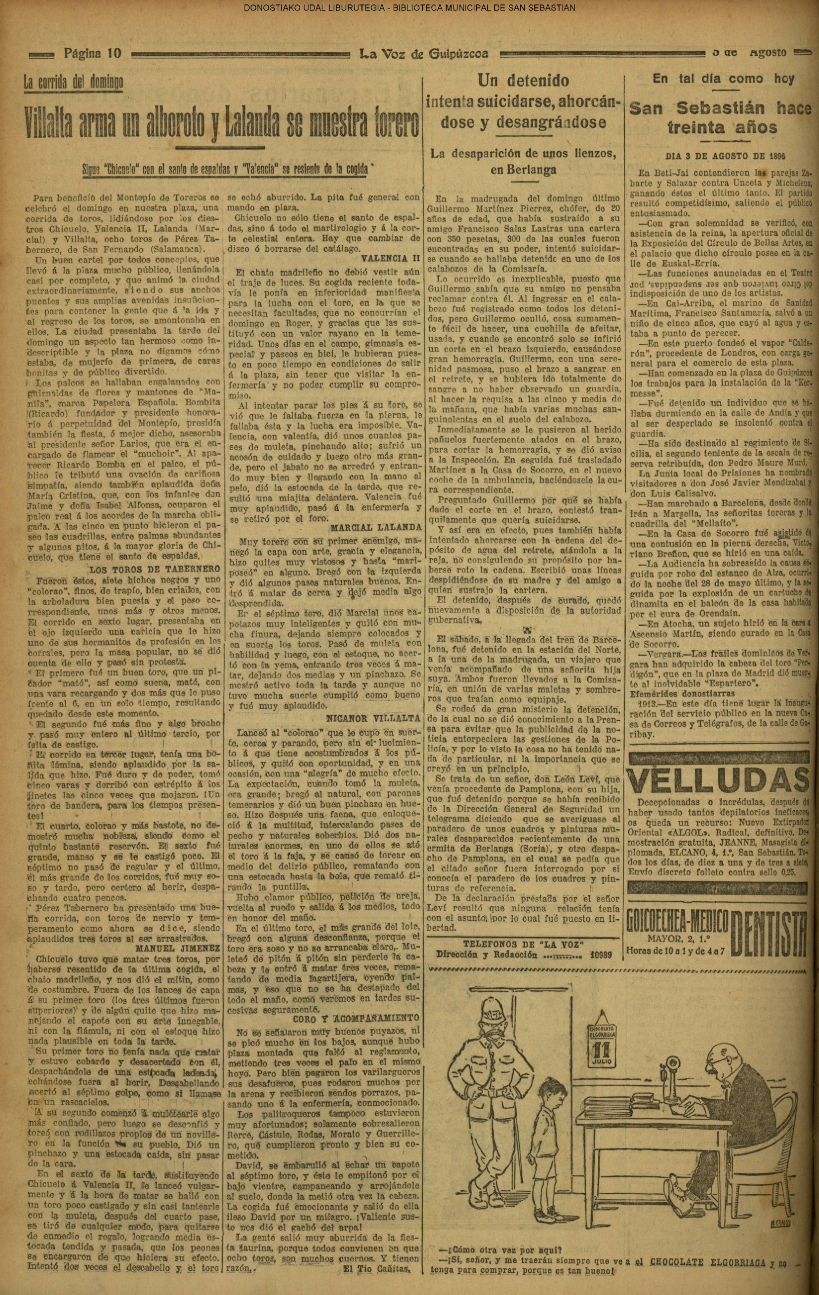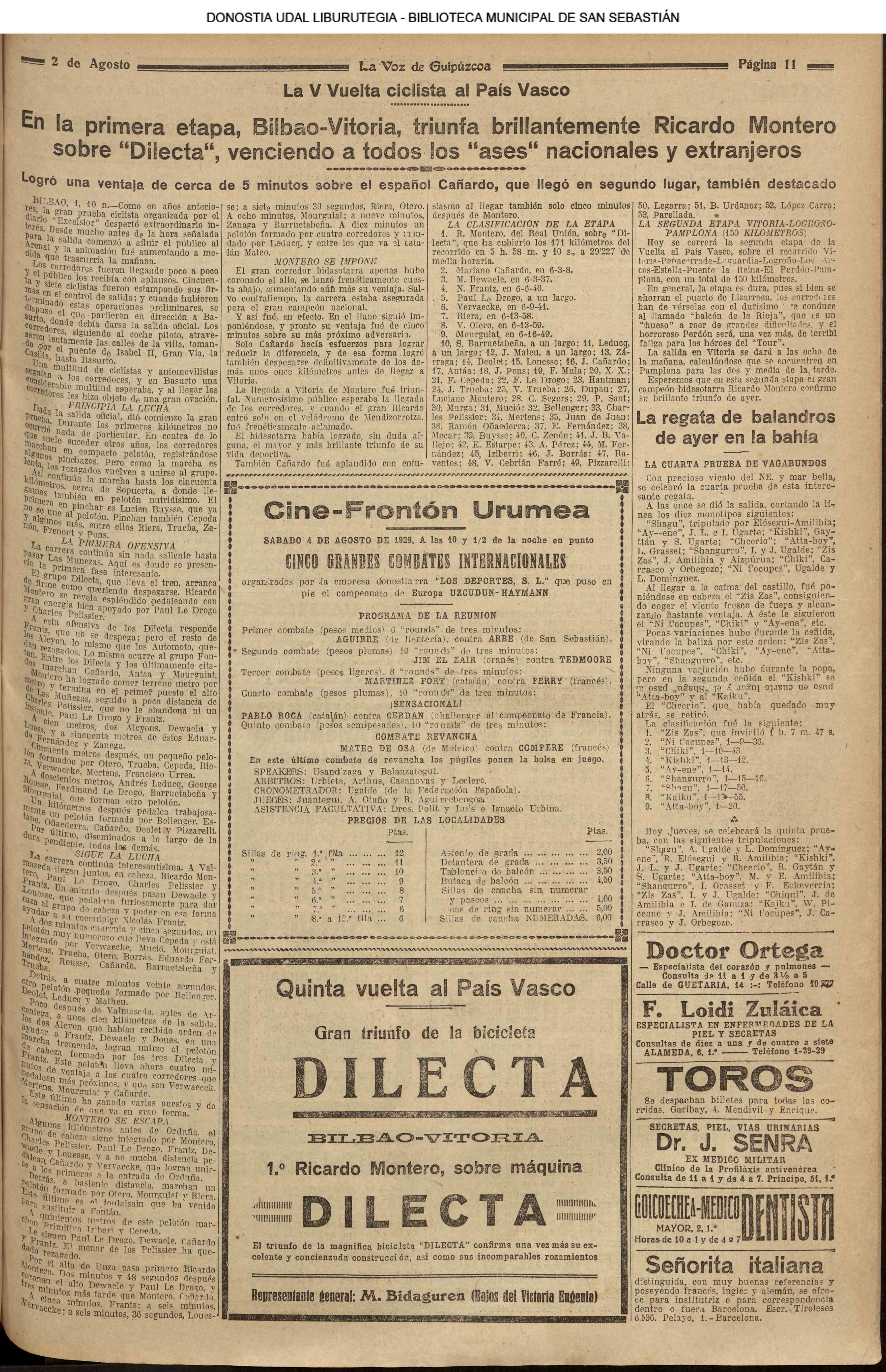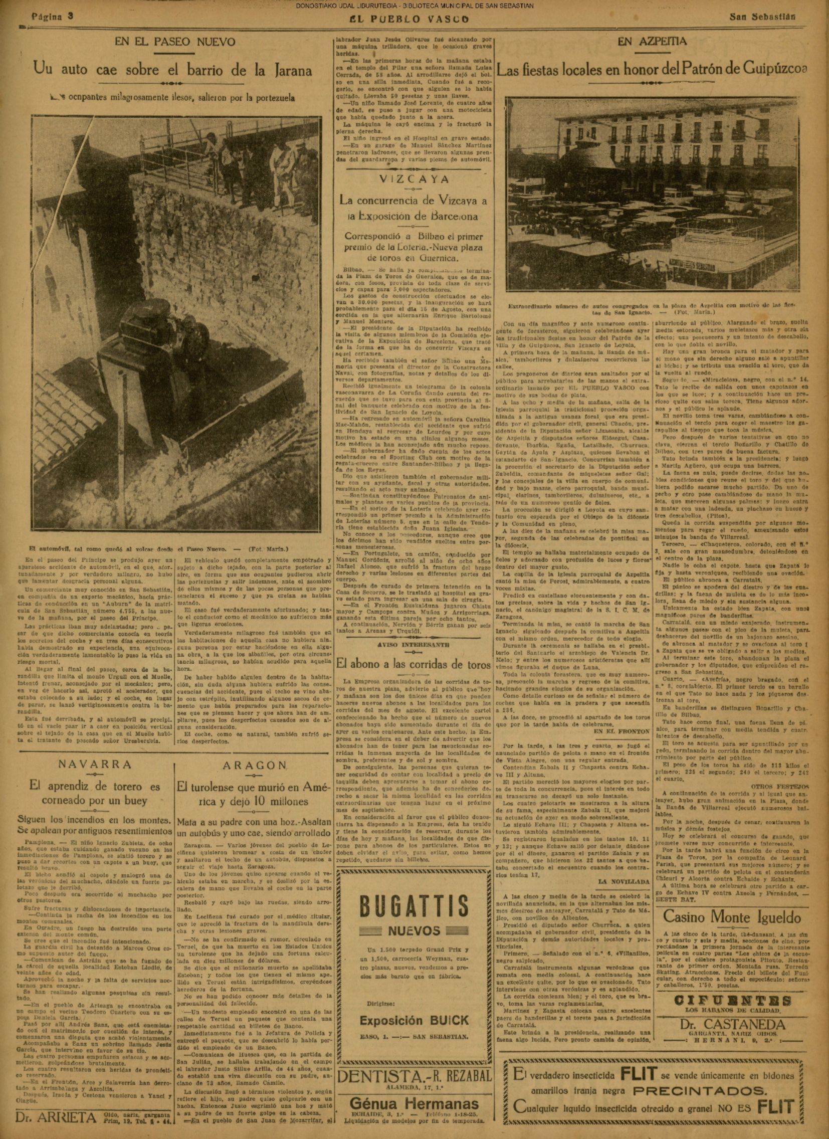 | 1928 - DE SOL A SOL (MIÉRCOLES) - Hemos entrado en el octavo mes del año, cuyo nombre nos recuerda al emperador Augusto, en tiempos del cual dicen que todo el orbe se hallaba en paz. Agosto viene dispuesto a demostrar al refrán castellano que dice: “Agosto frío en rostro”, a juzgar por el botón de muestra que hoy nos ha mostrado. Agosto es el mes de la semana grande, de las fiestas veraniegas de San Sebastián, pues en él adquieren éstas sul periodo álgido o sea su mayor esplendor (....) |