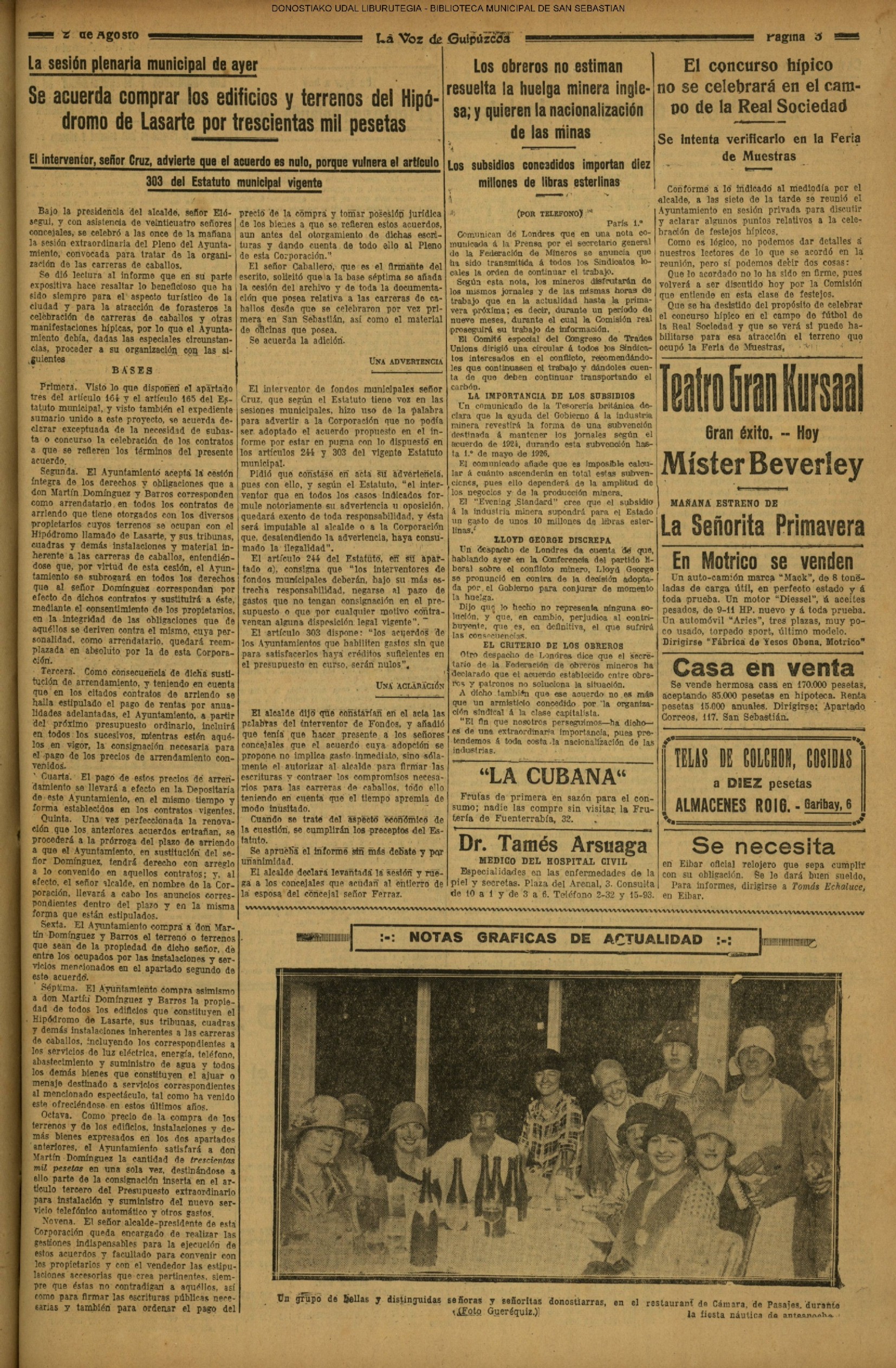 (1925) SESIÓN PLENARIA - Se acuerda comprar los edificios y terrenos del Hipódromo de Lasarte por trescientas mil pesetas